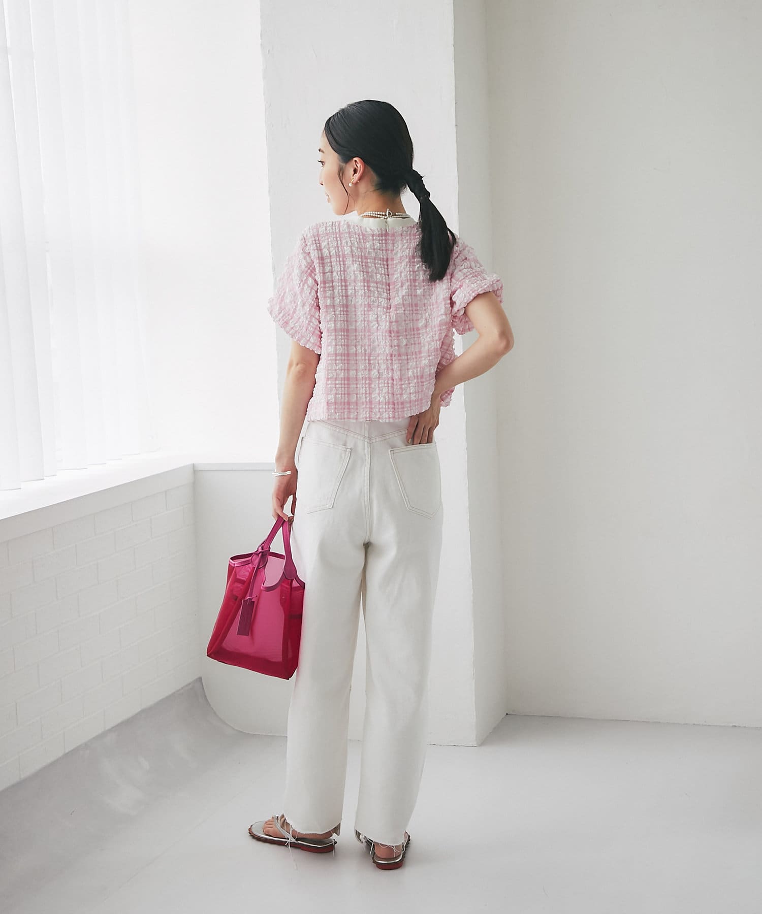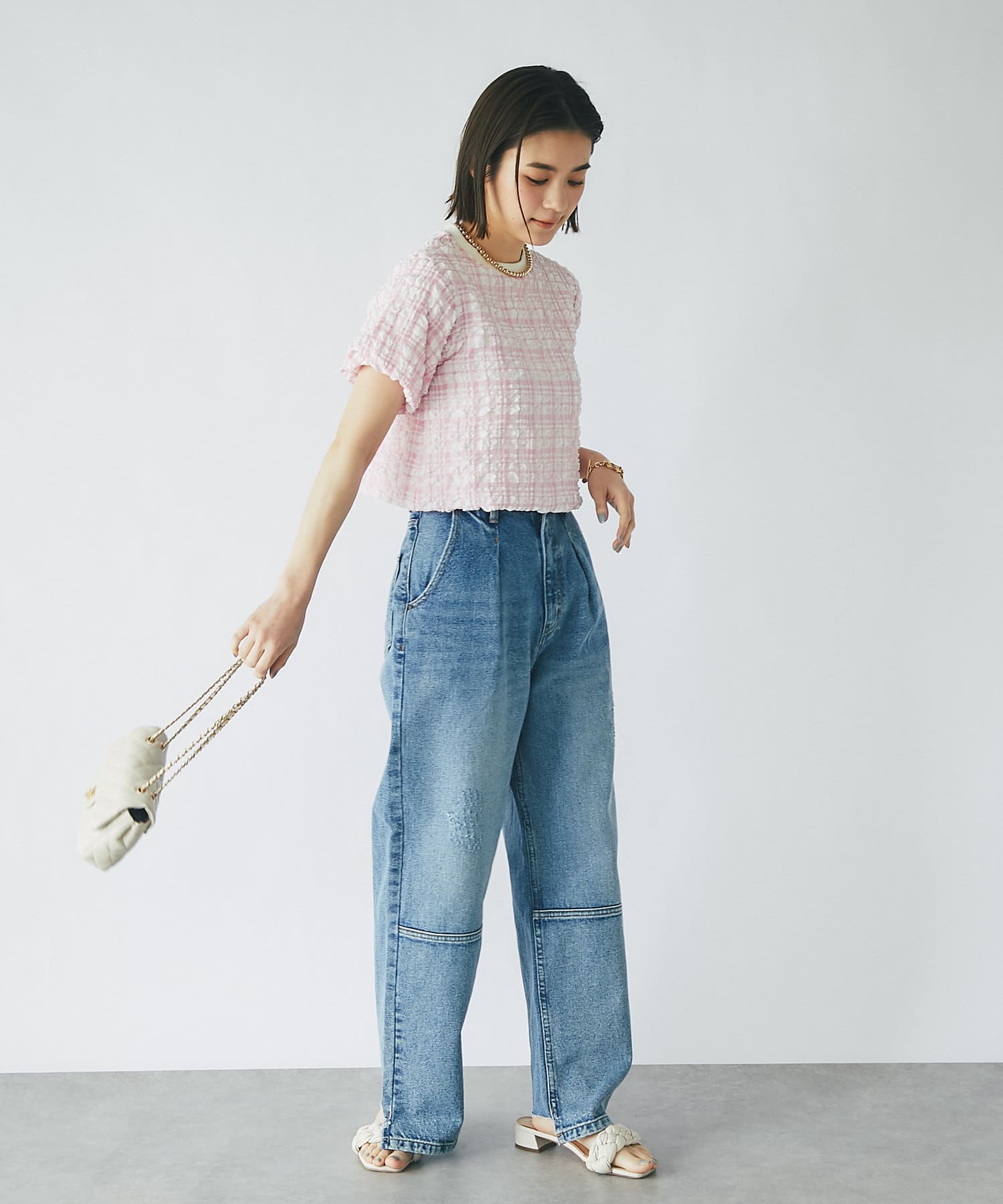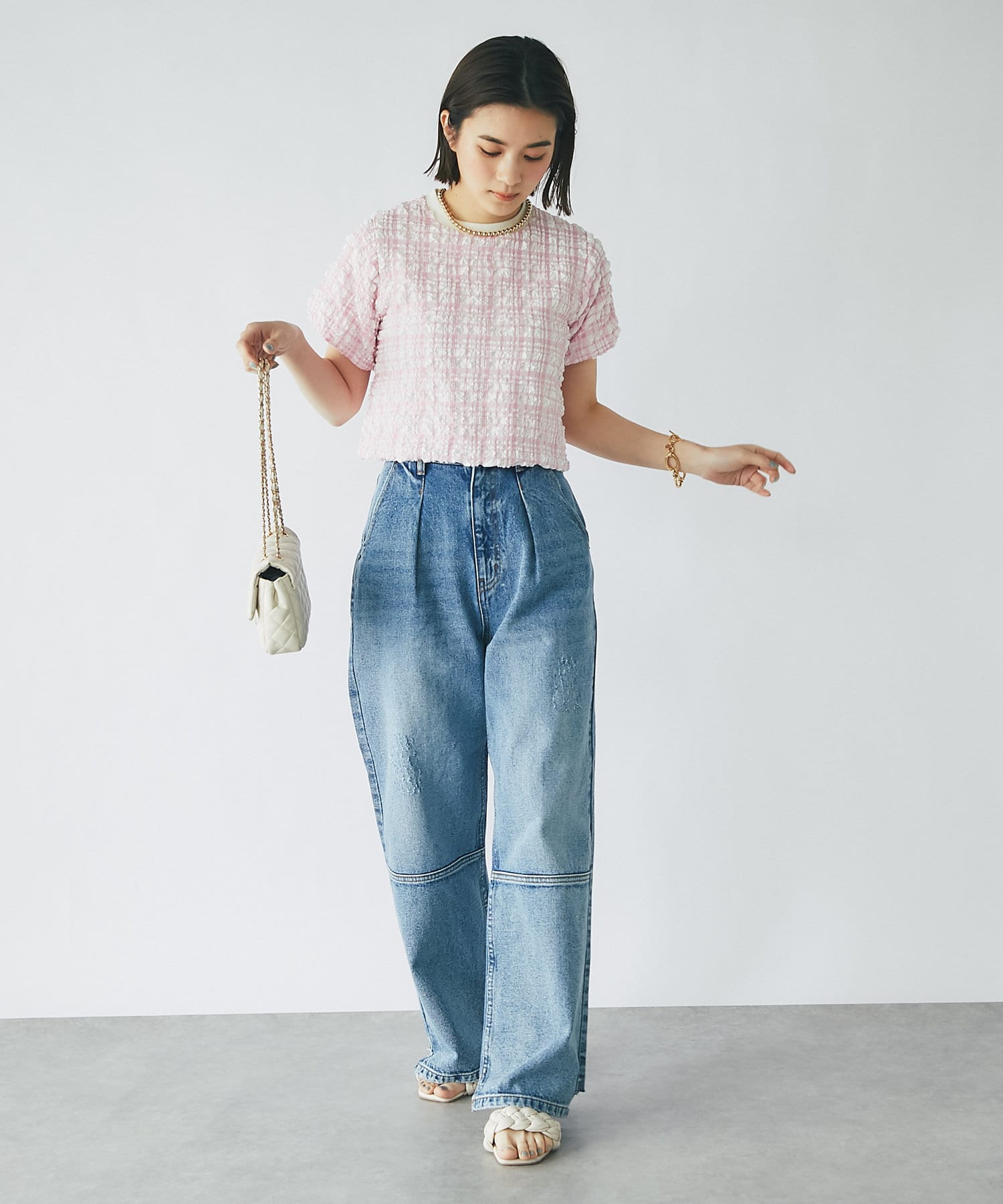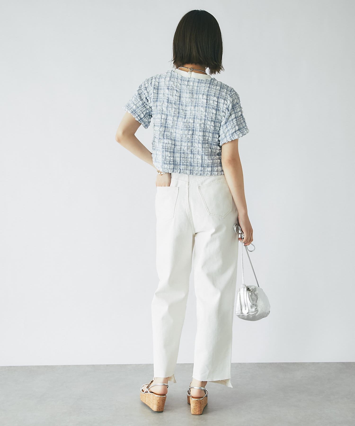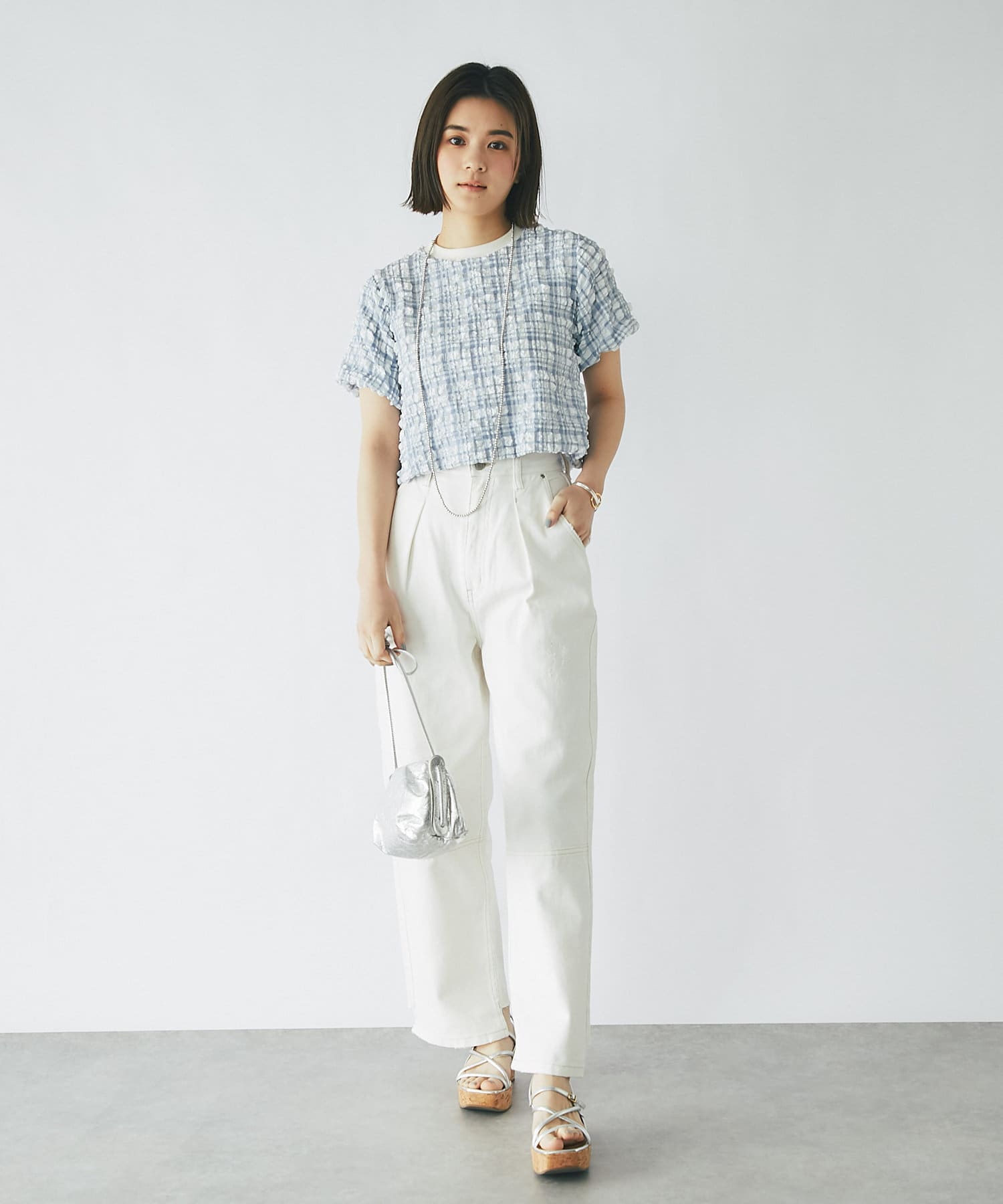 トレンドのクロップド丈で、ハイウエストのボトムと合わせることで脚長効果にも期待できます。