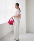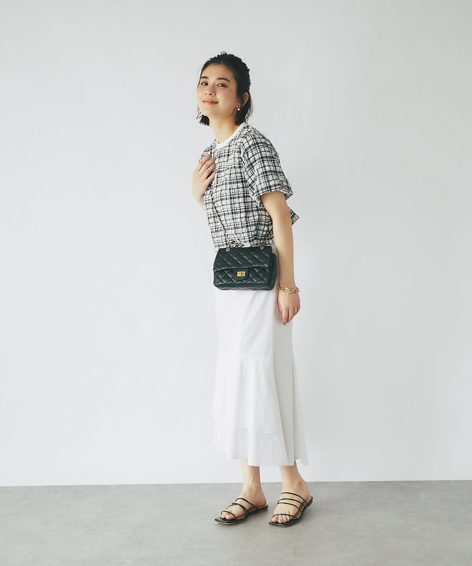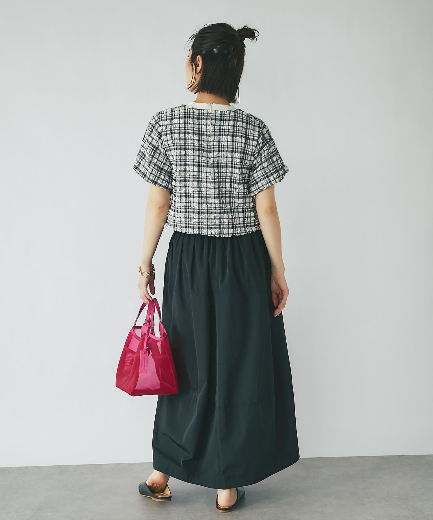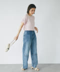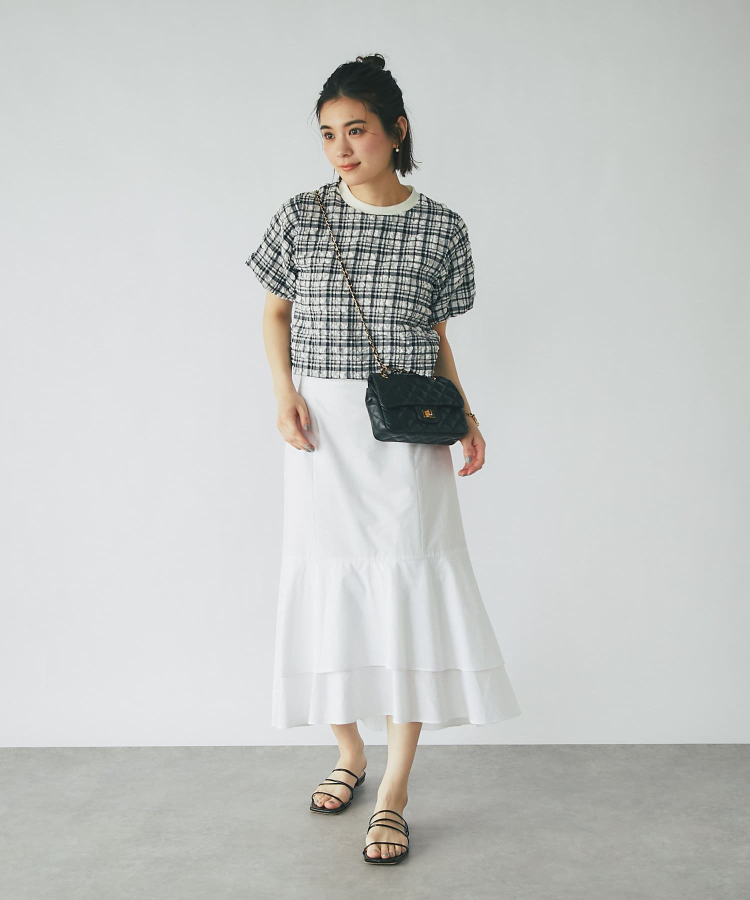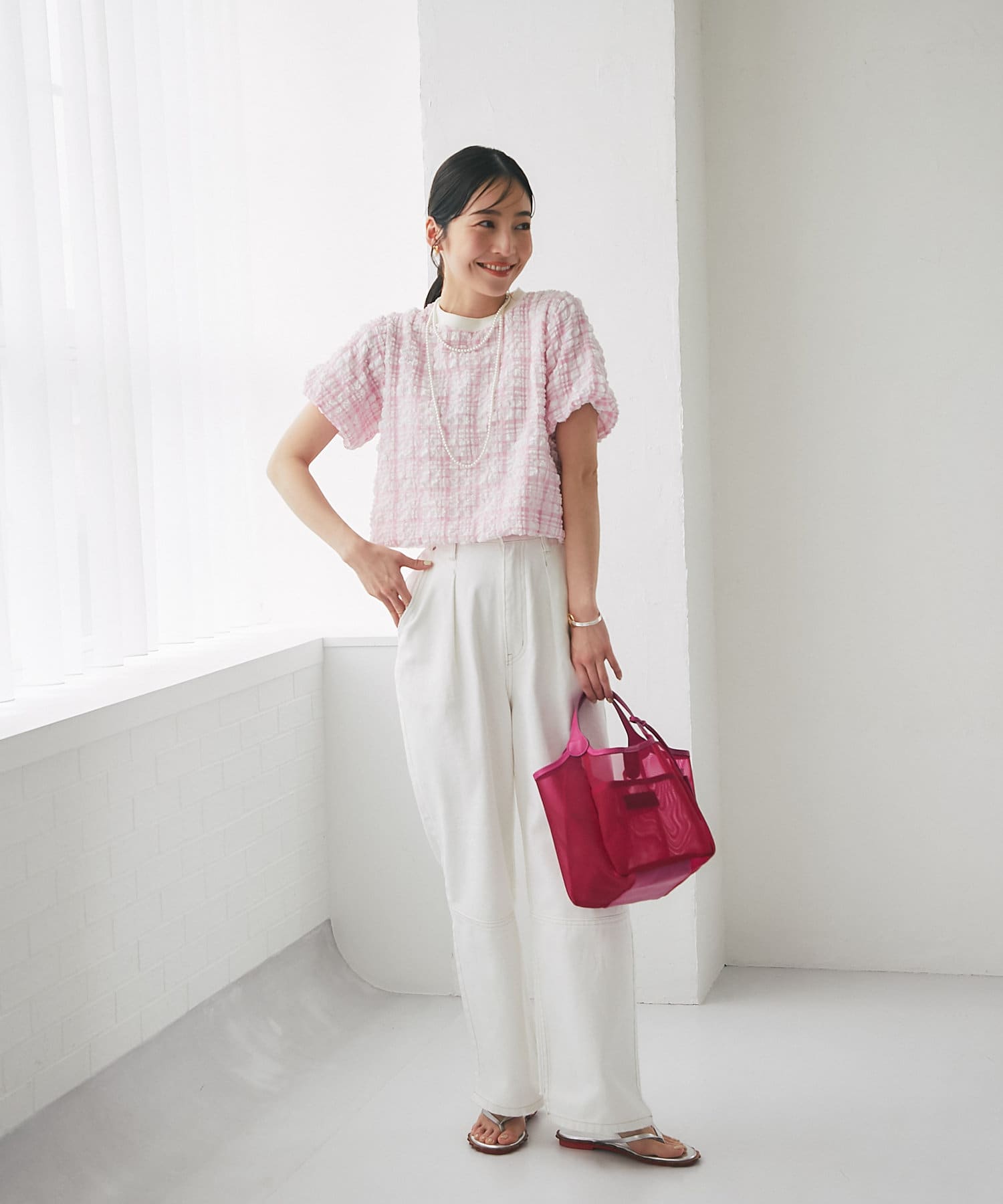 トレンドのクロップド丈で、ハイウエストのボトムと合わせることで脚長効果にも期待できます。