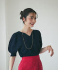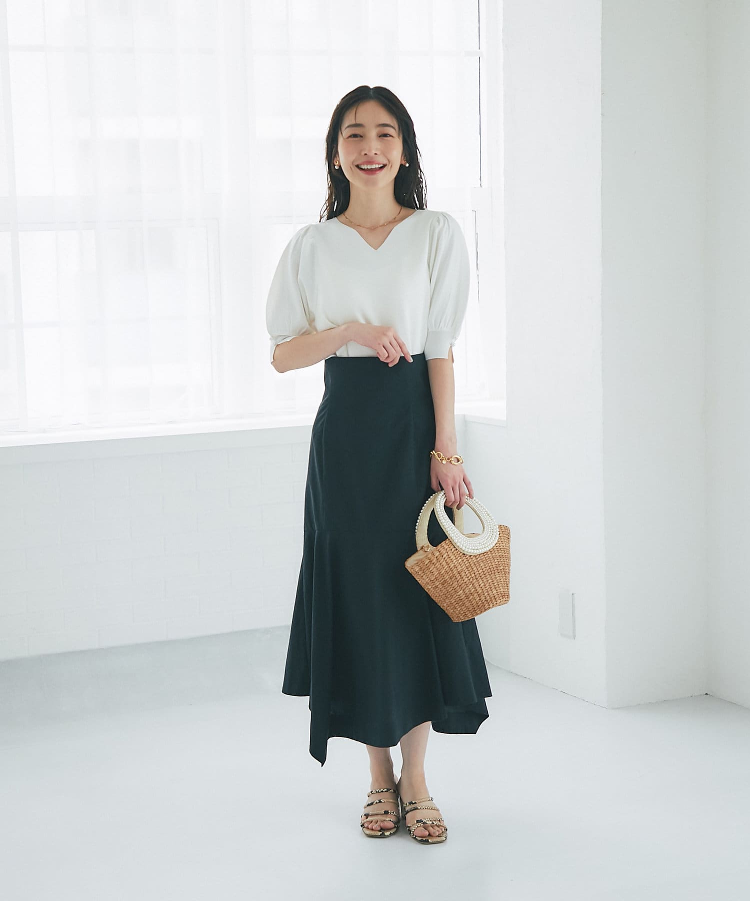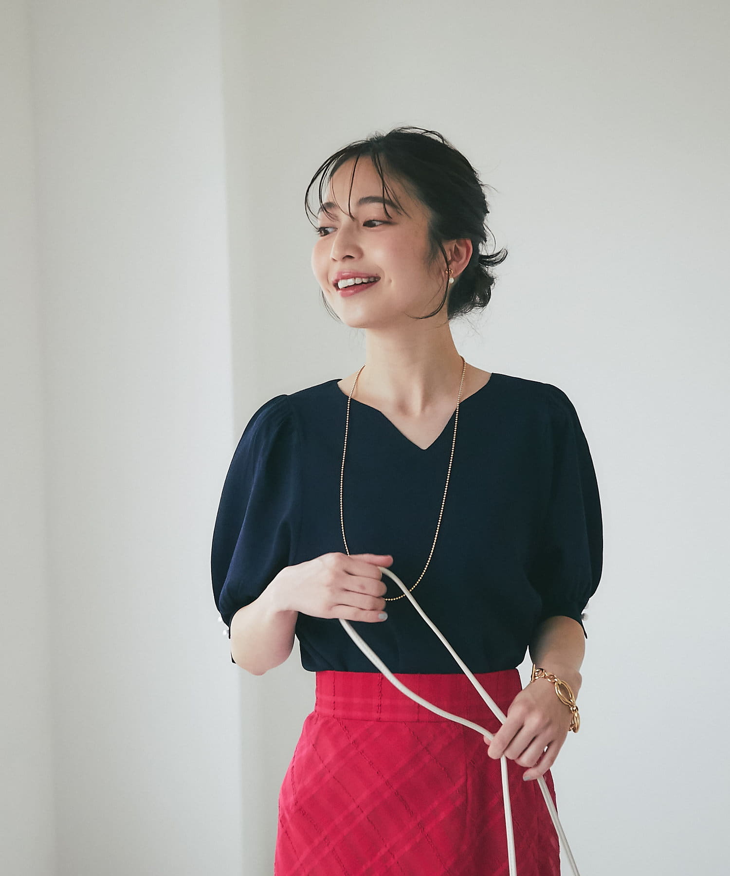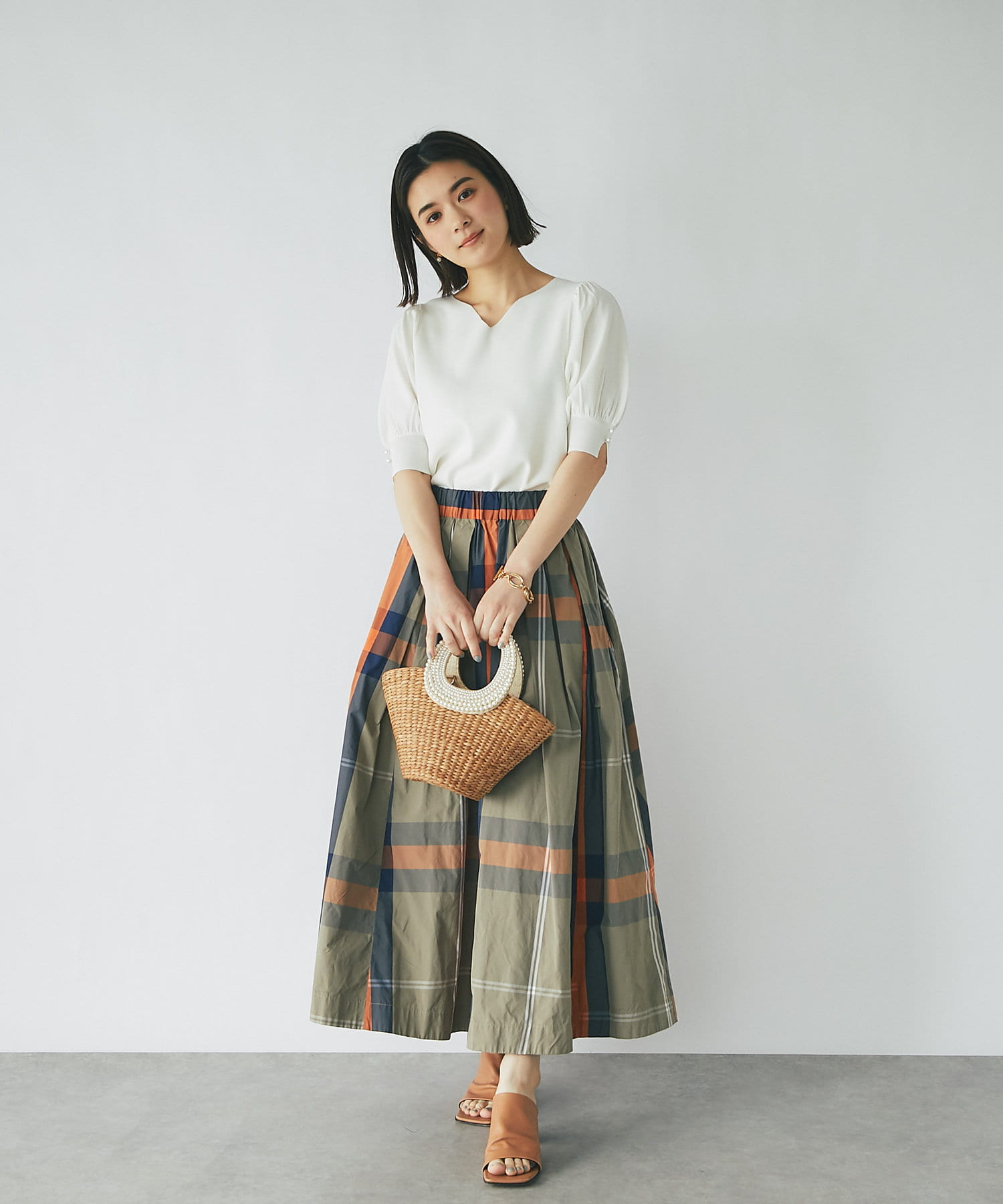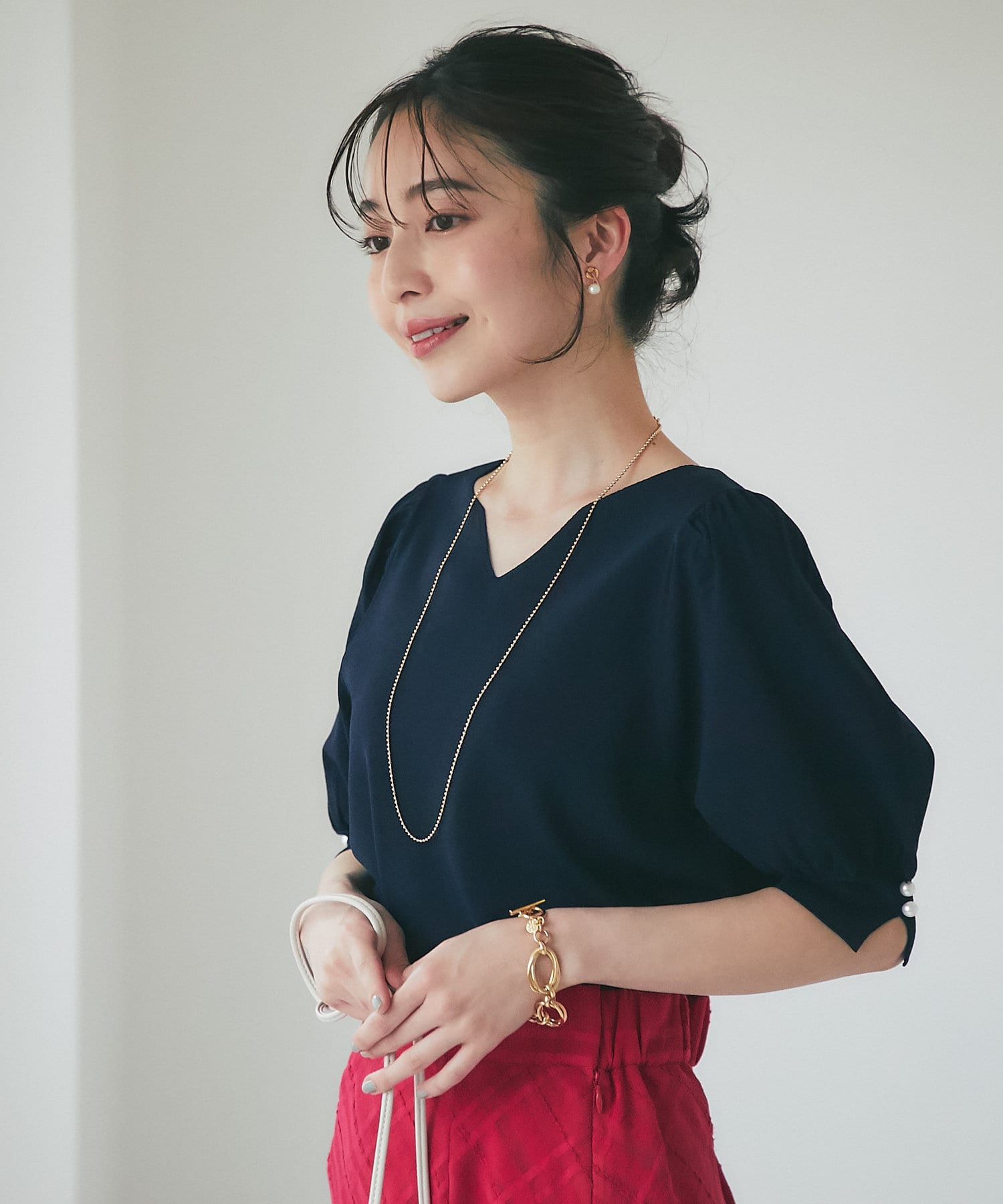柄スカートなど華やかなボトムの合わせに使いやすいアイテムです。