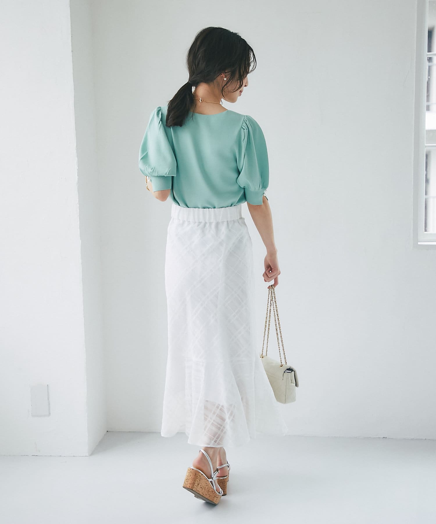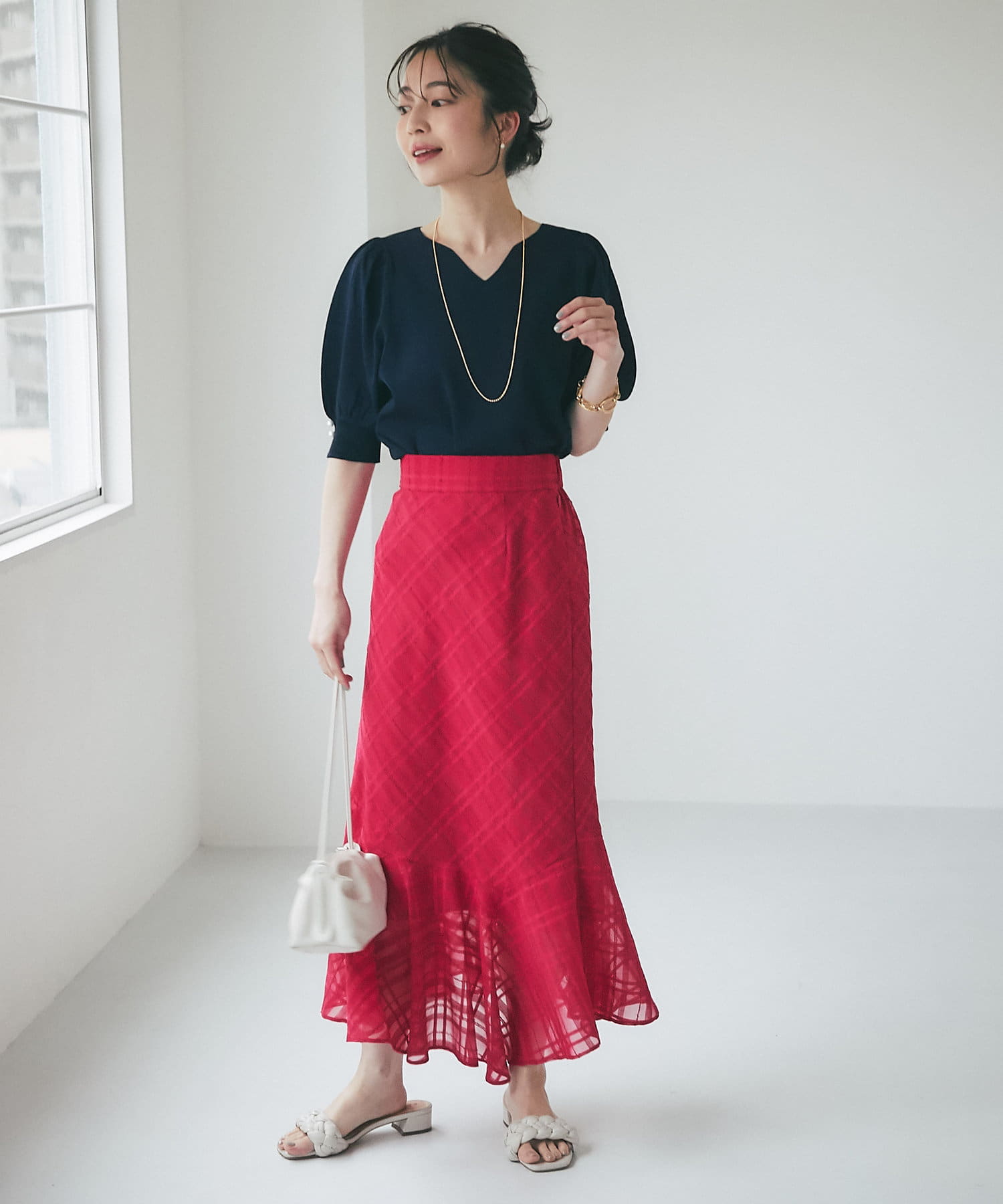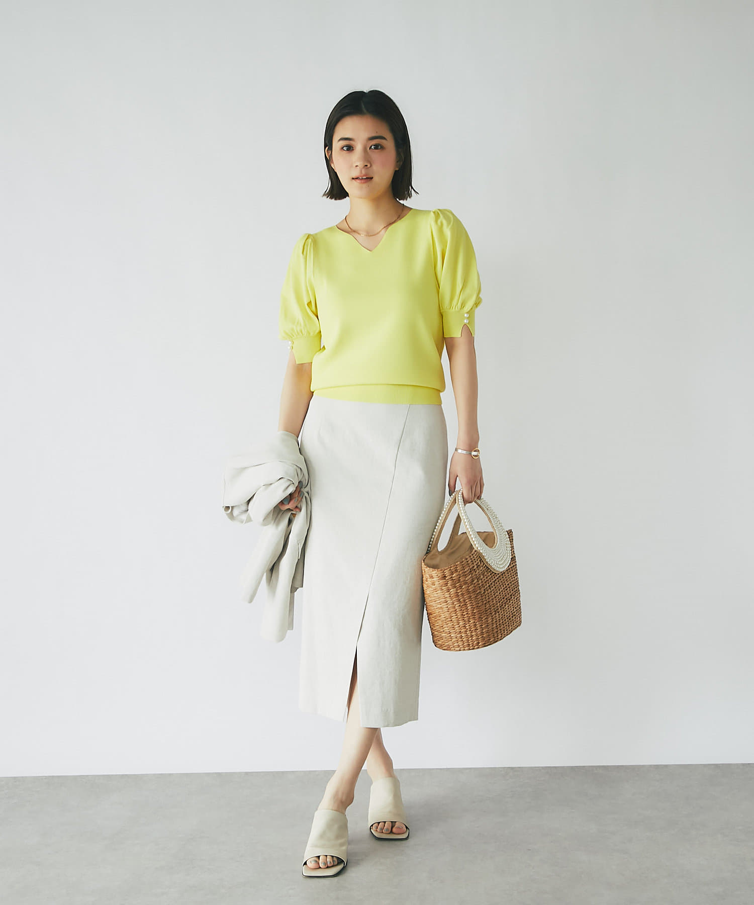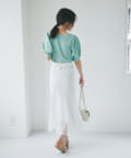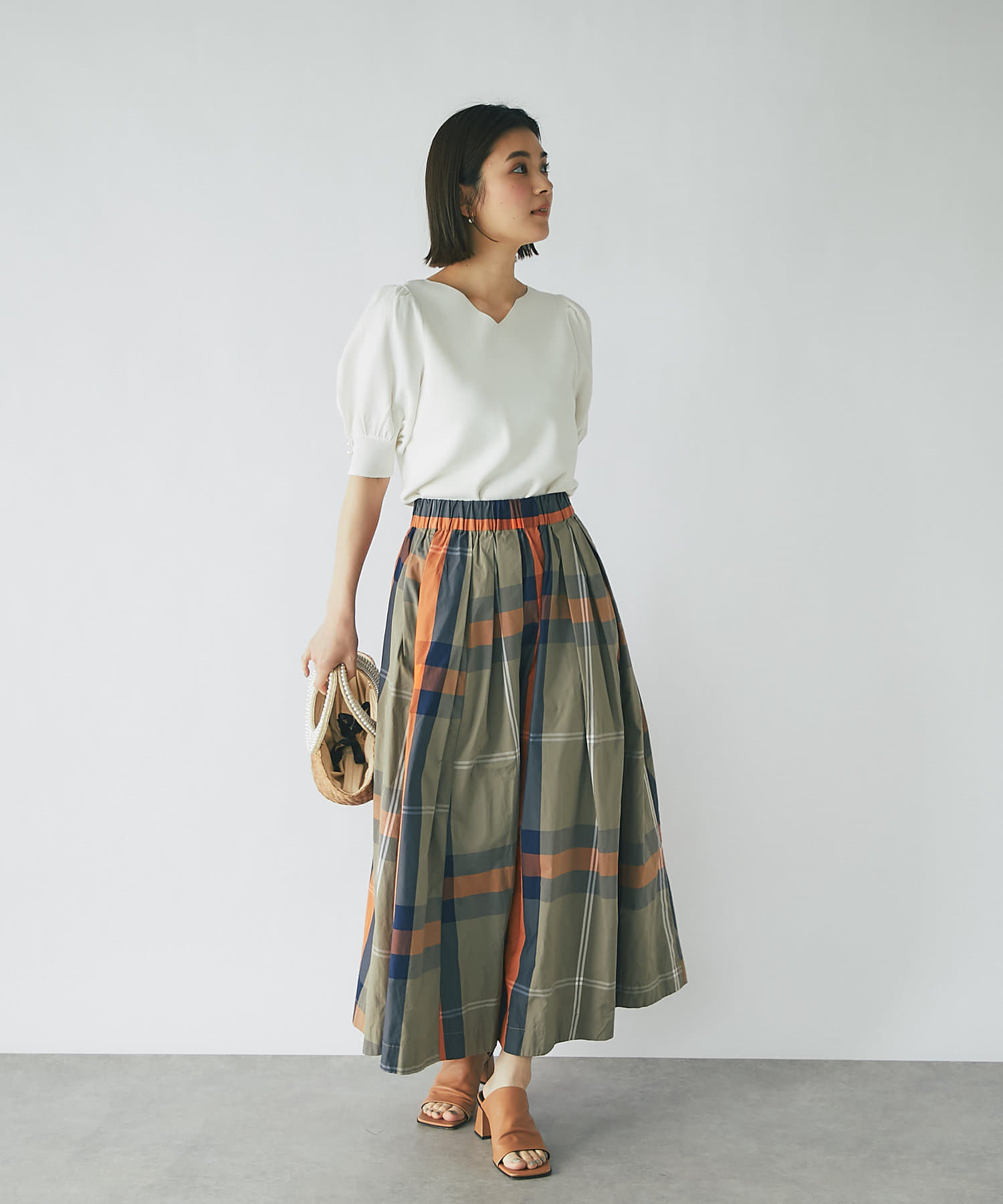 柄スカートなど華やかなボトムの合わせに使いやすいアイテムです。