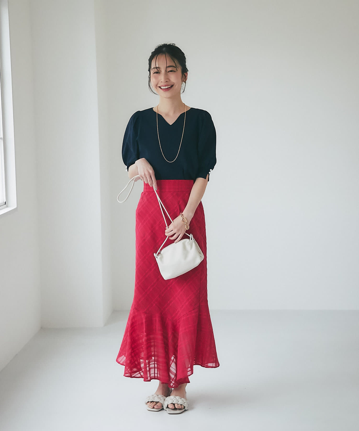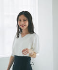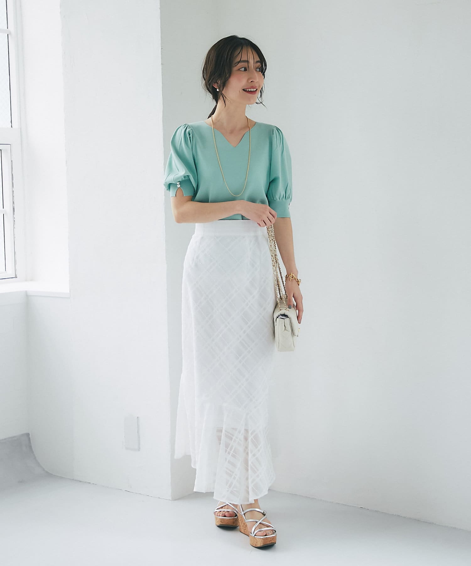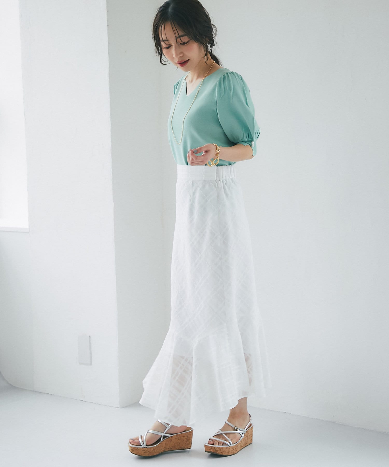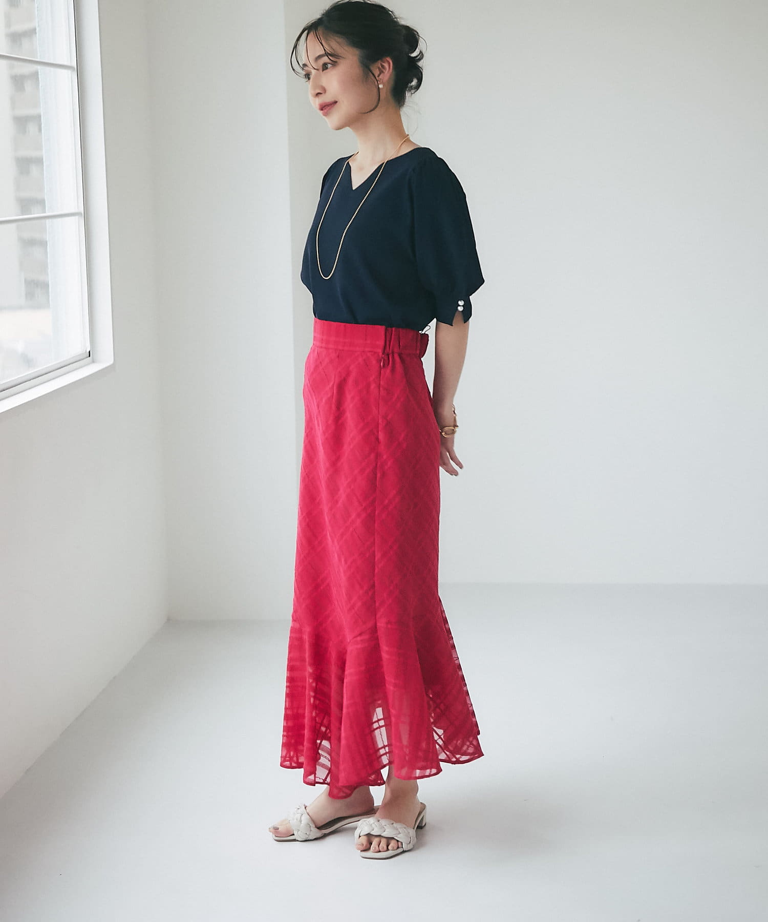 柄スカートなど華やかなボトムの合わせに使いやすいアイテムです。