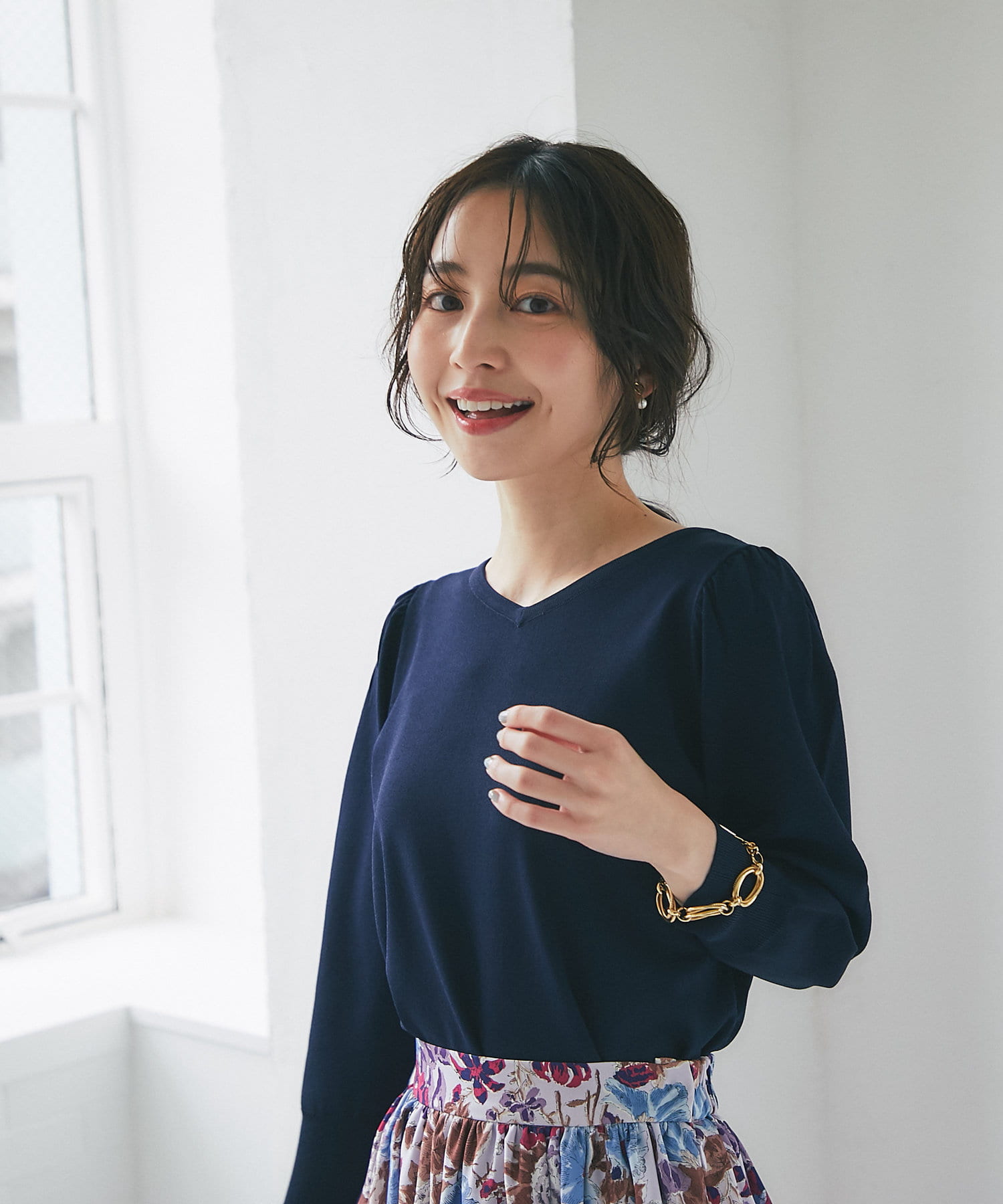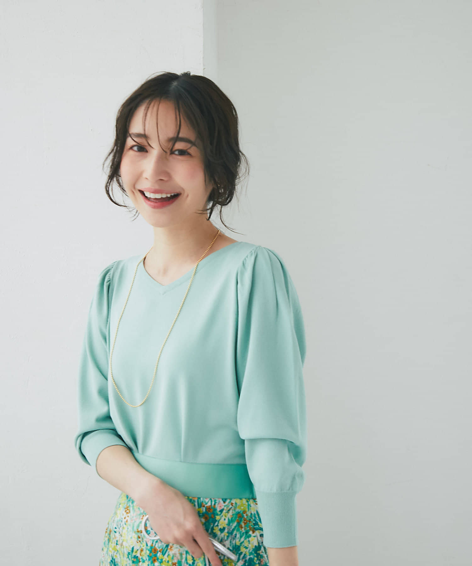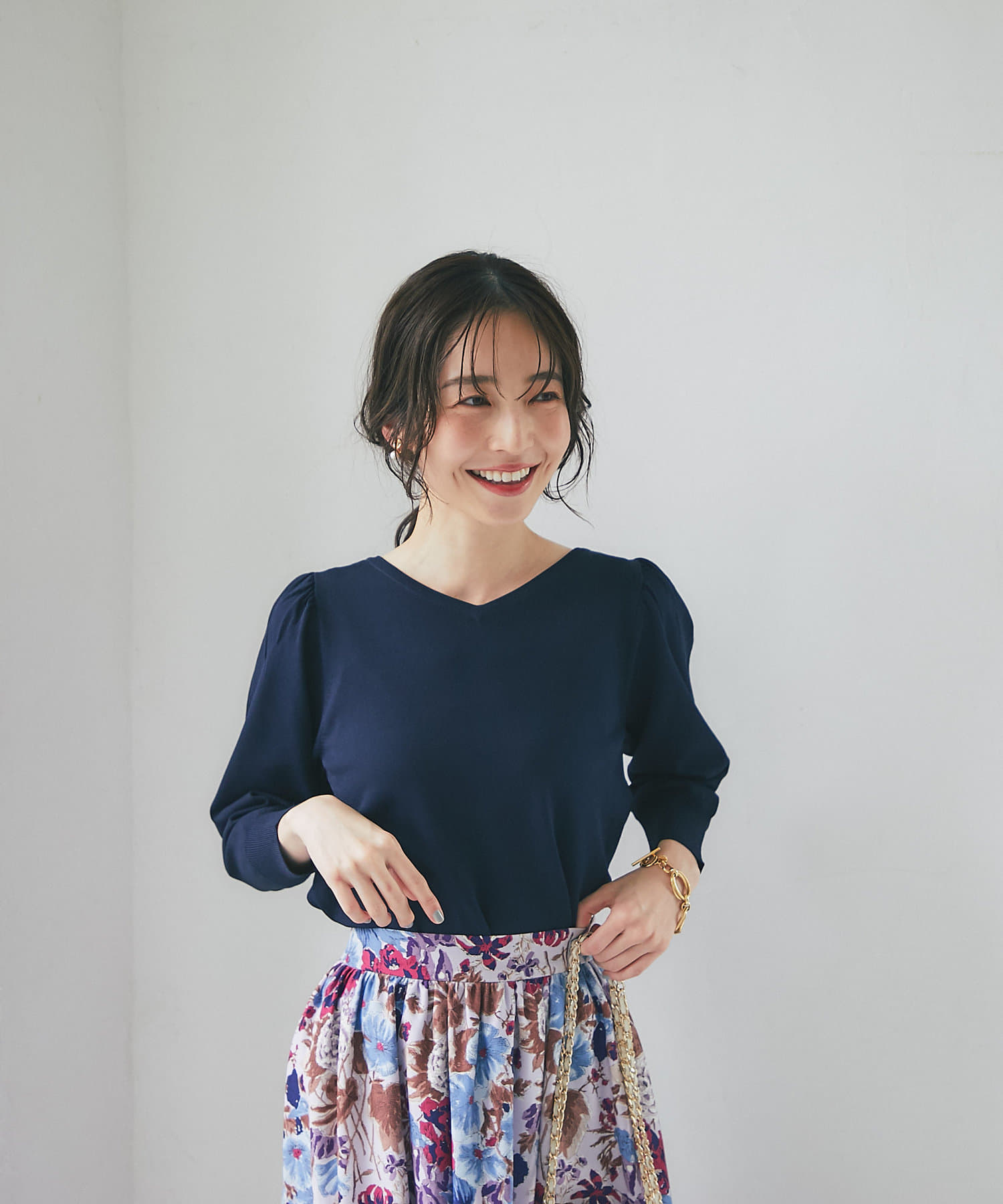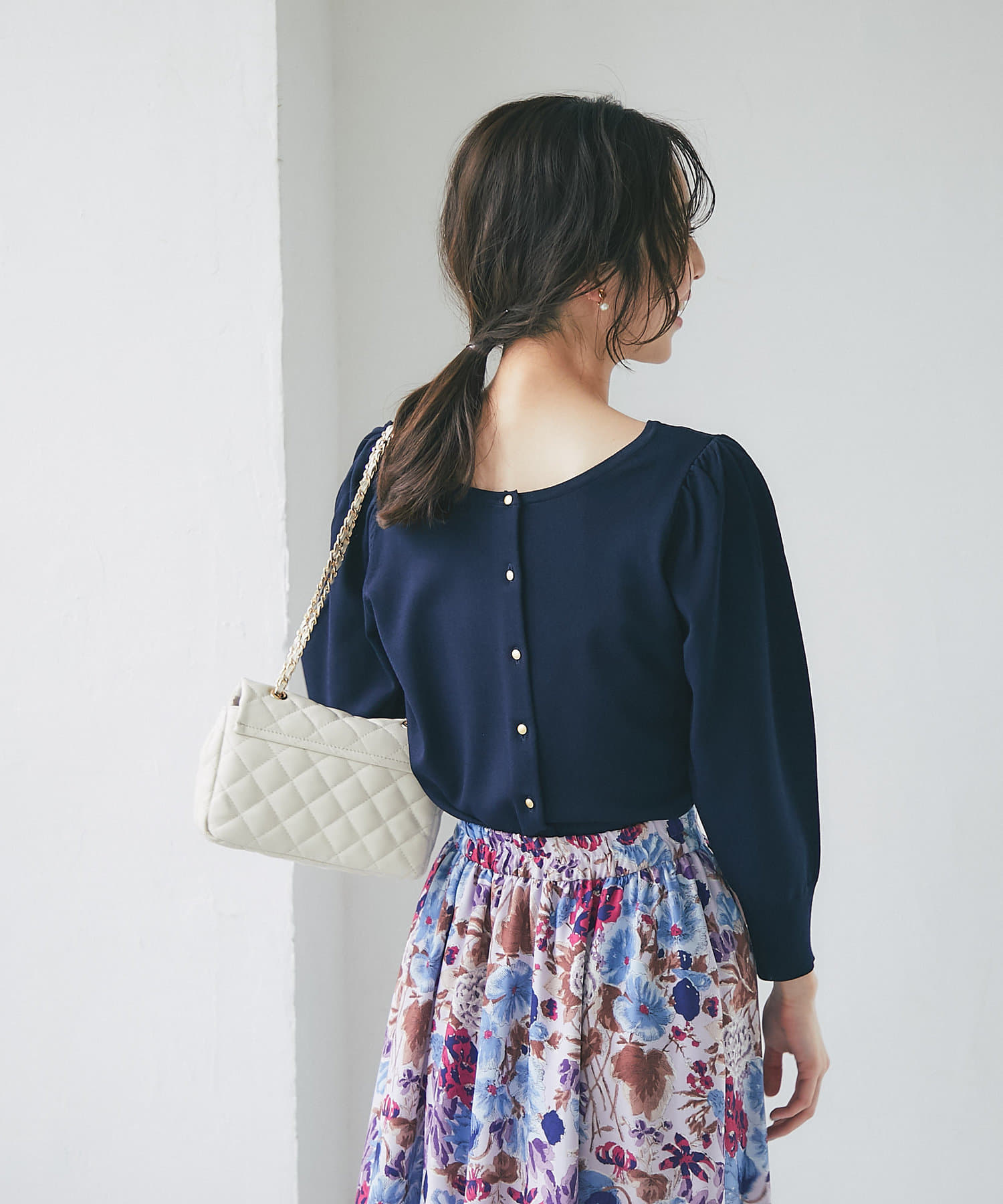 柄スカートなど華やかなボトムの合わせに使いやすいアイテムです。