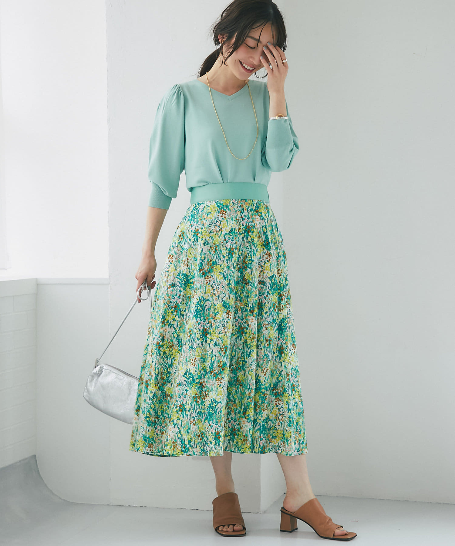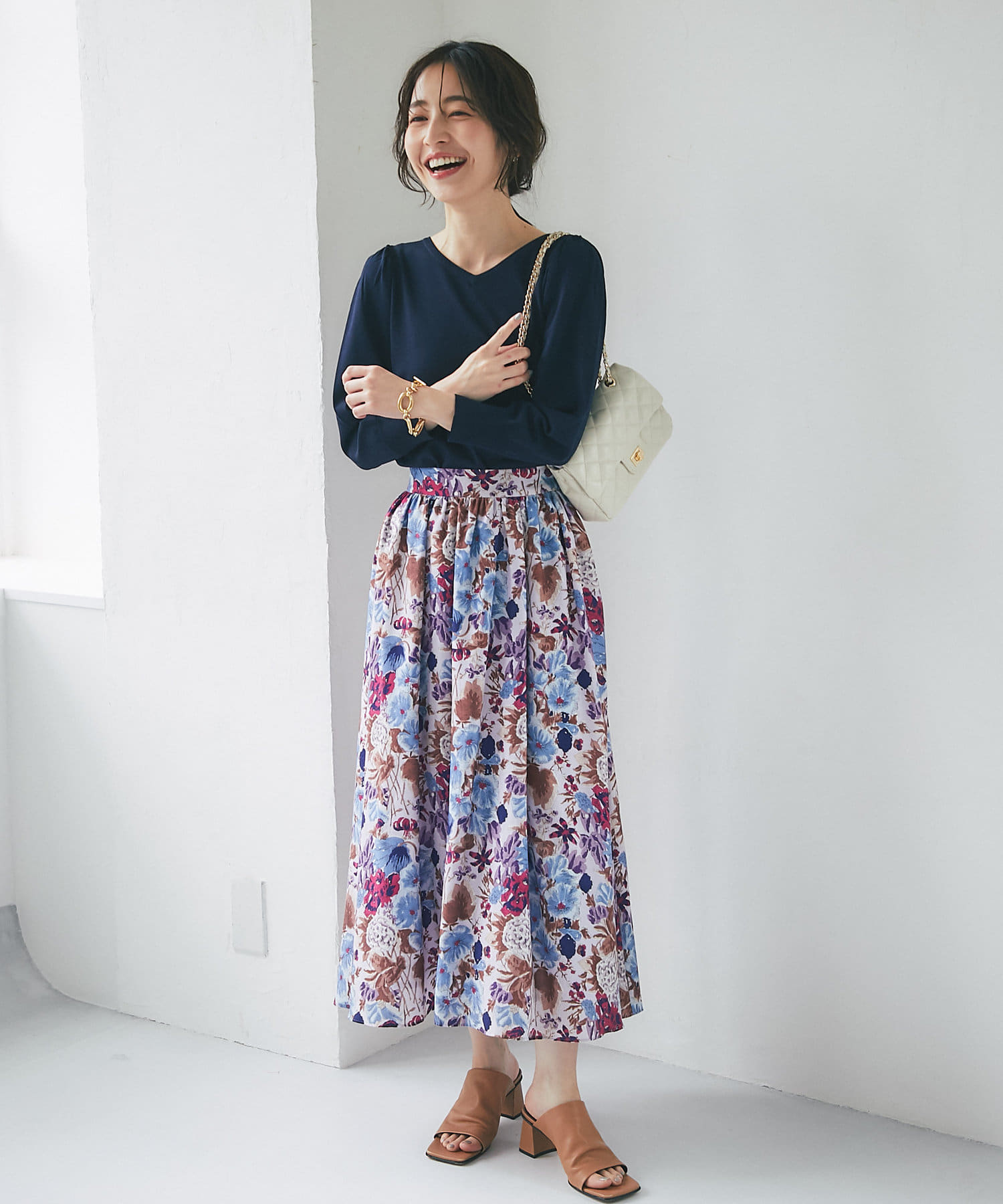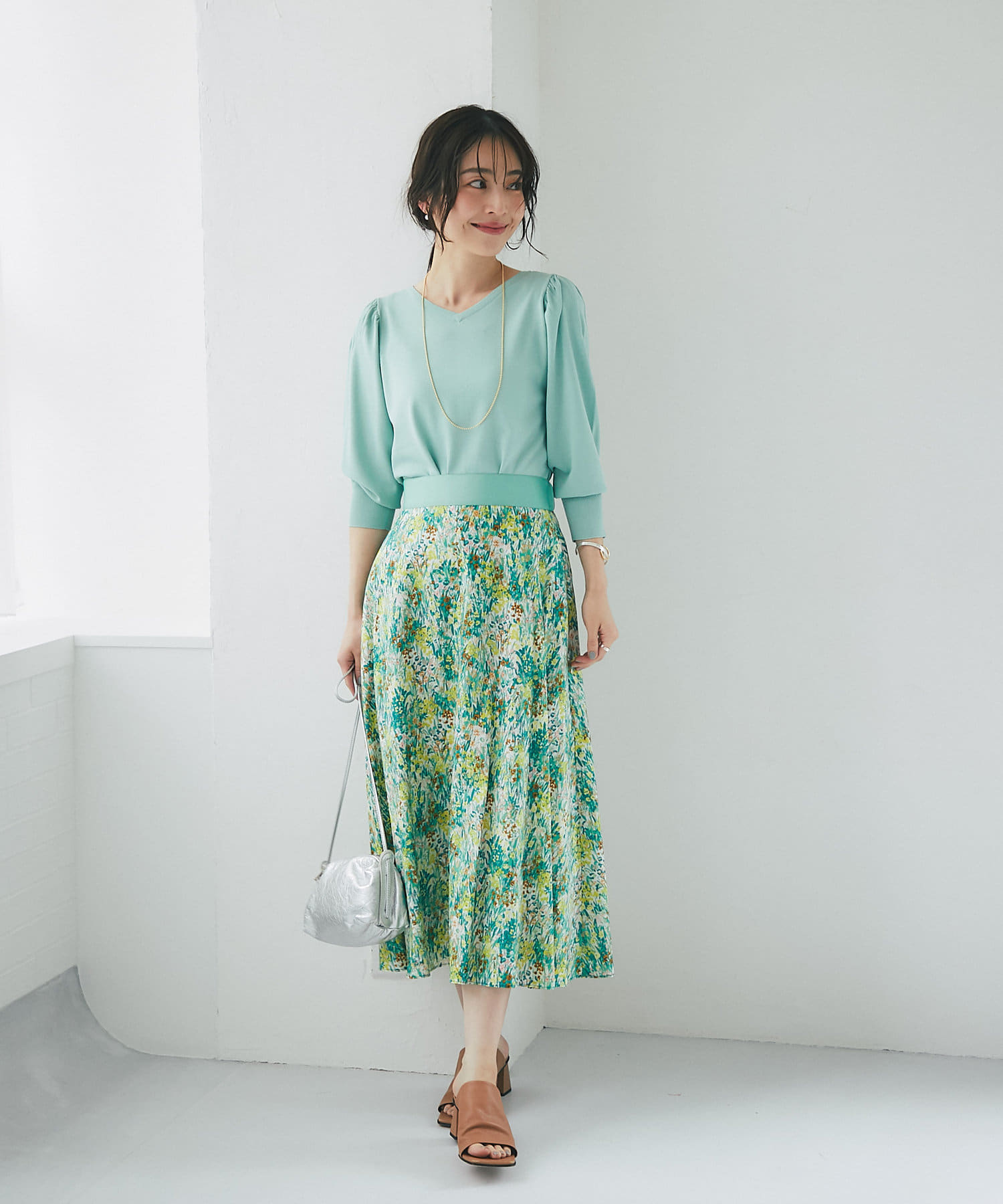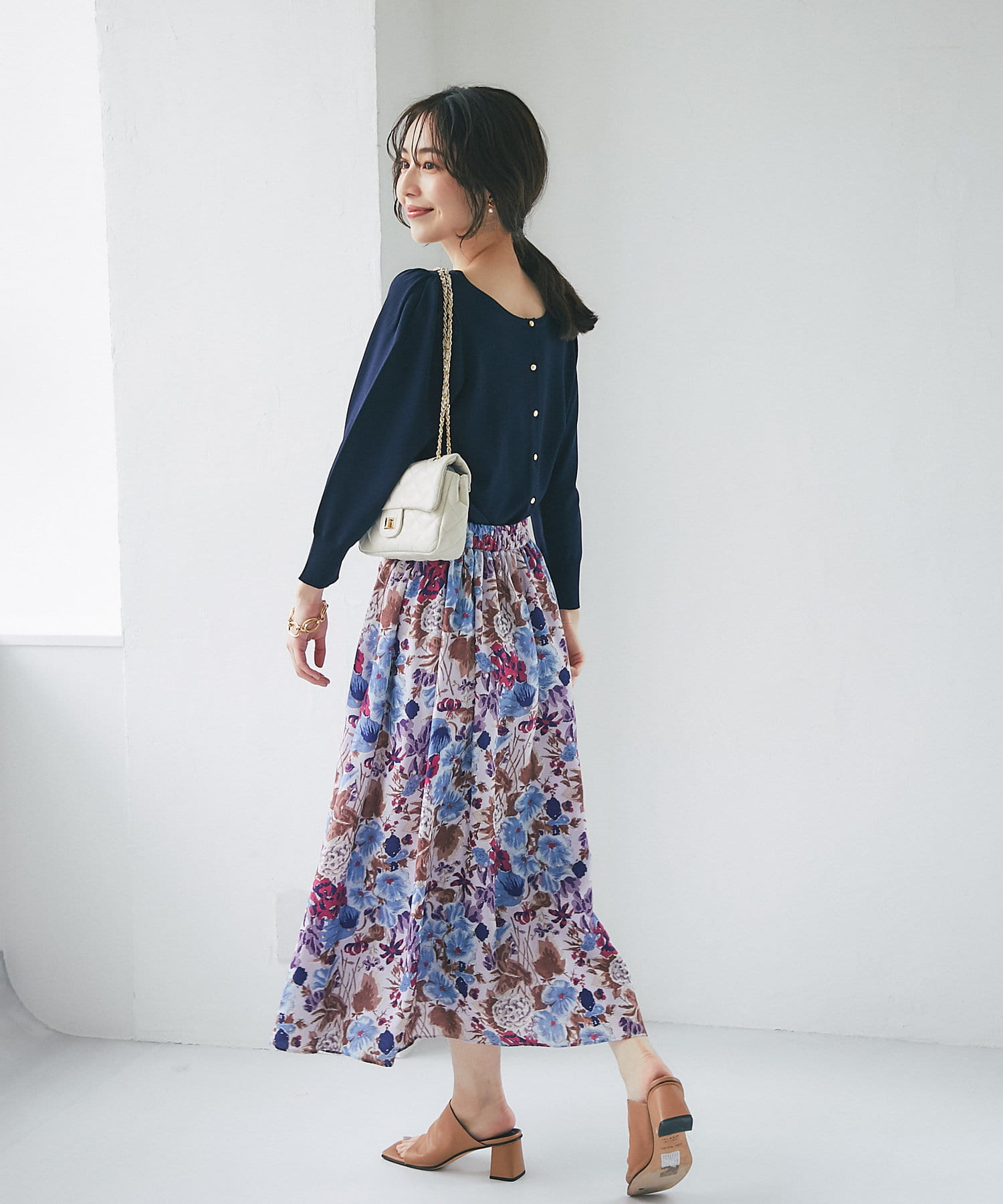 柄スカートなど華やかなボトムの合わせに使いやすいアイテムです。
