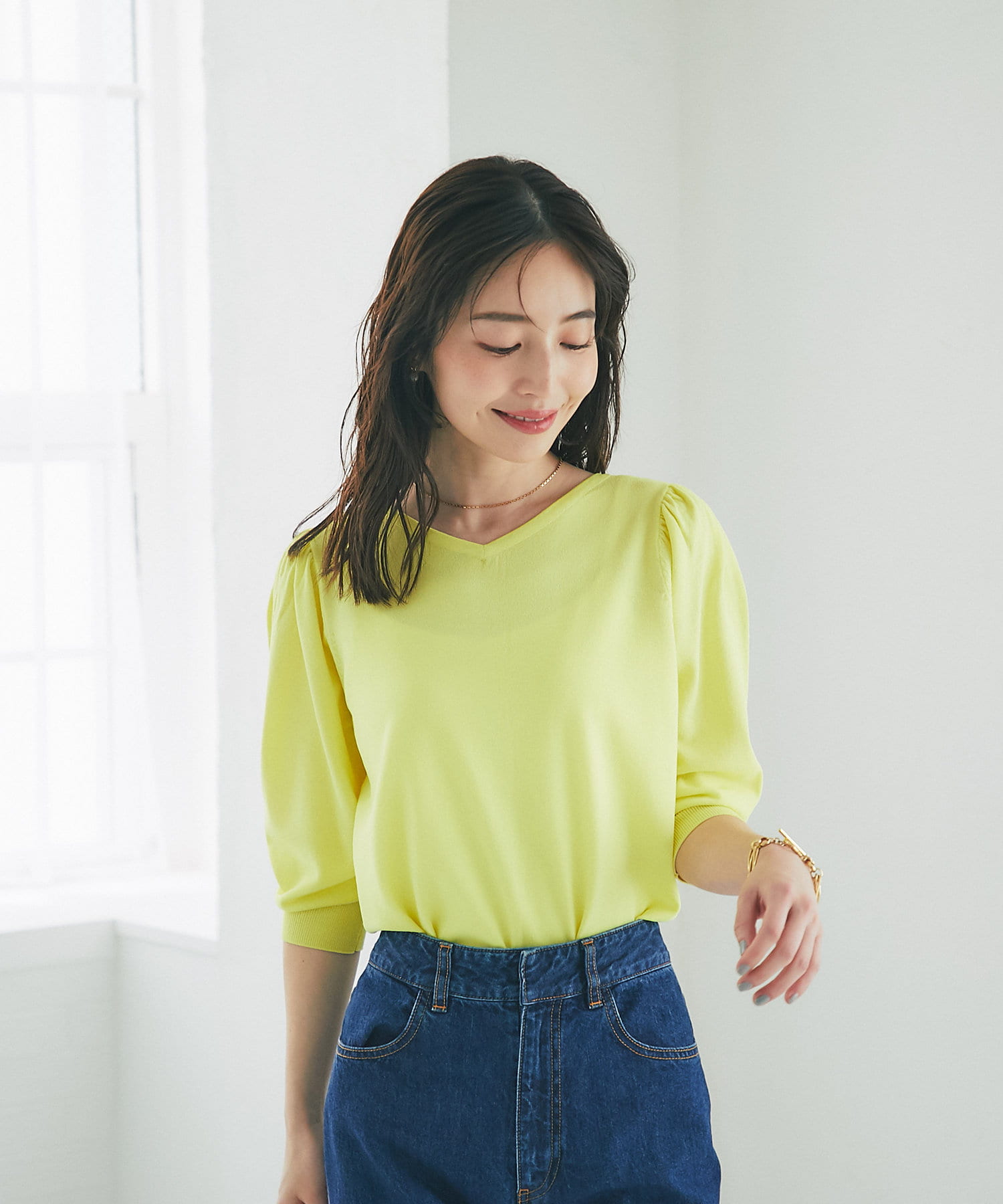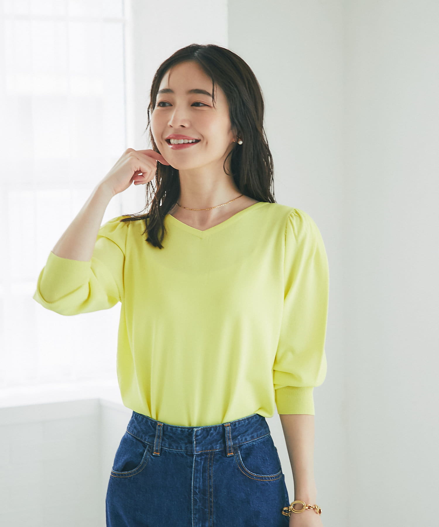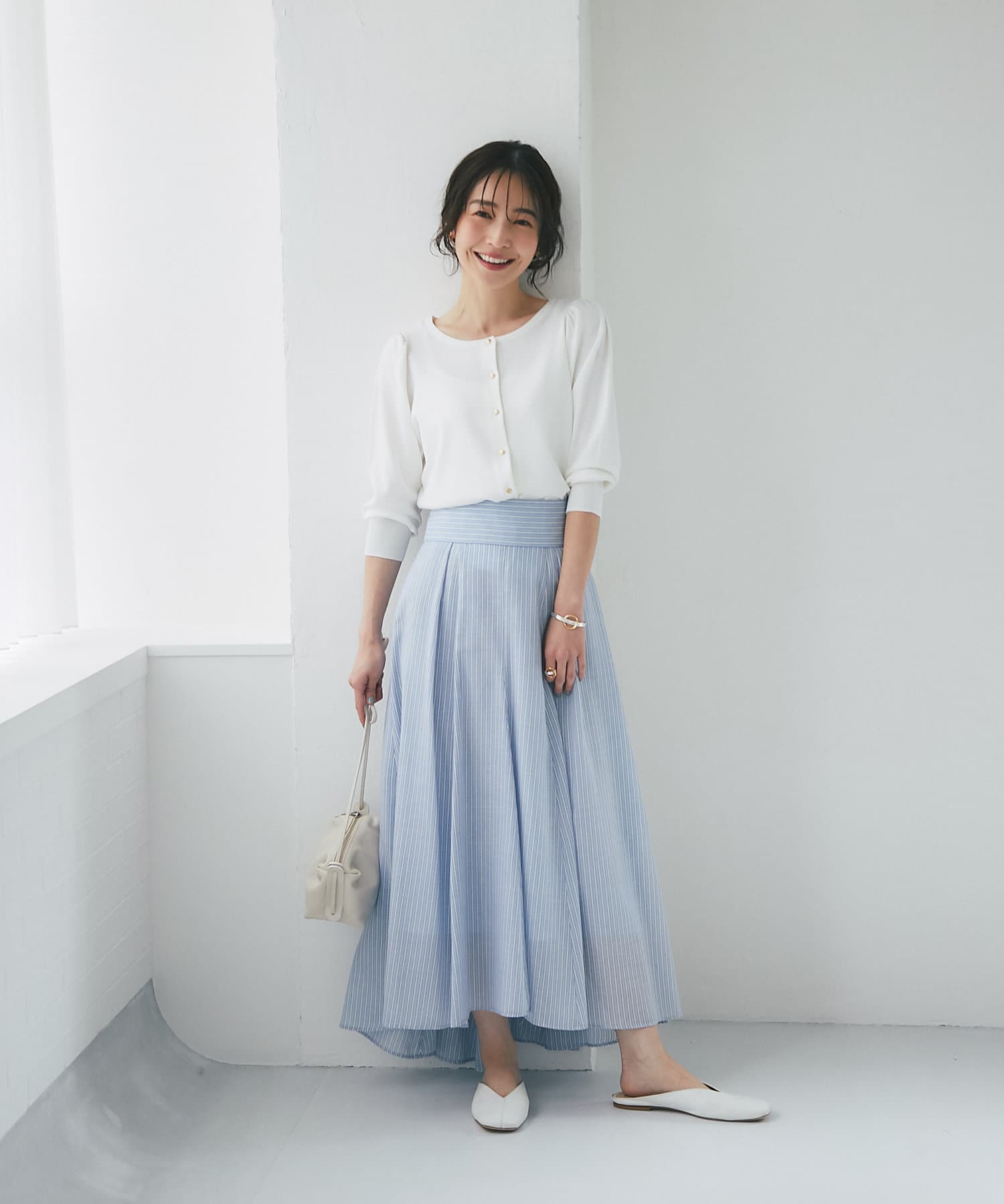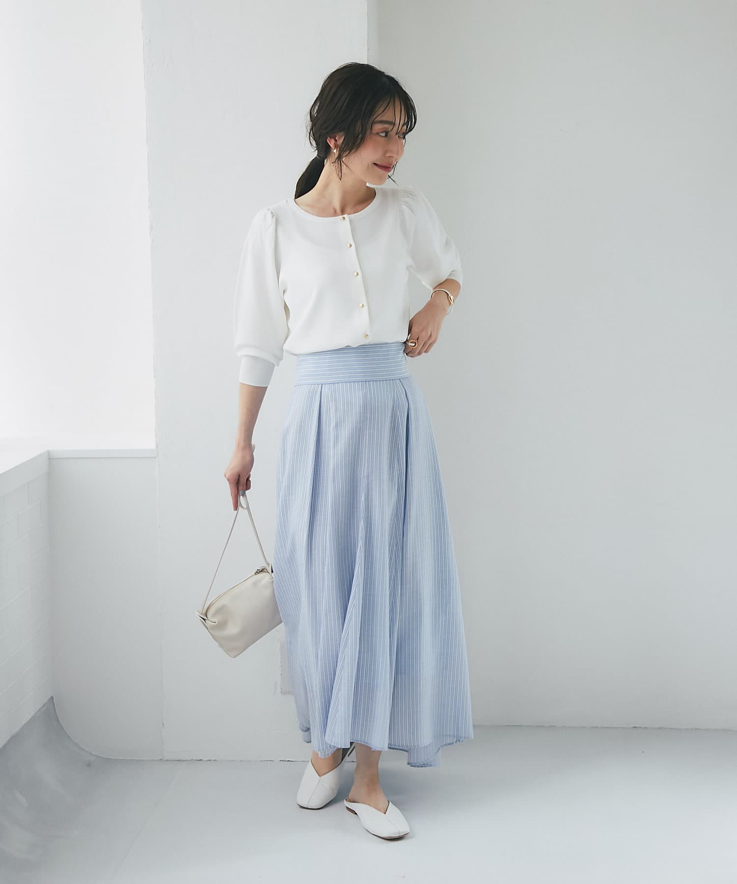 柄スカートなど華やかなボトムの合わせに使いやすいアイテムです。