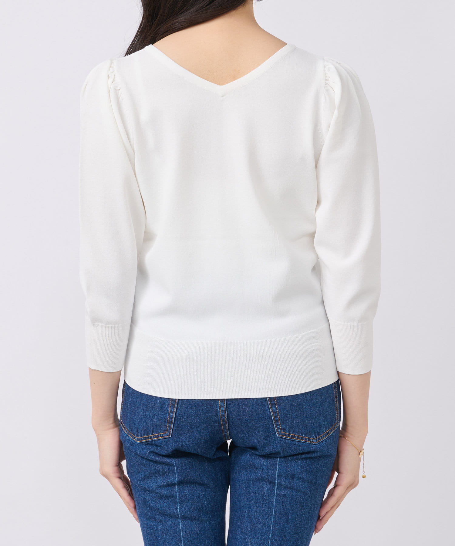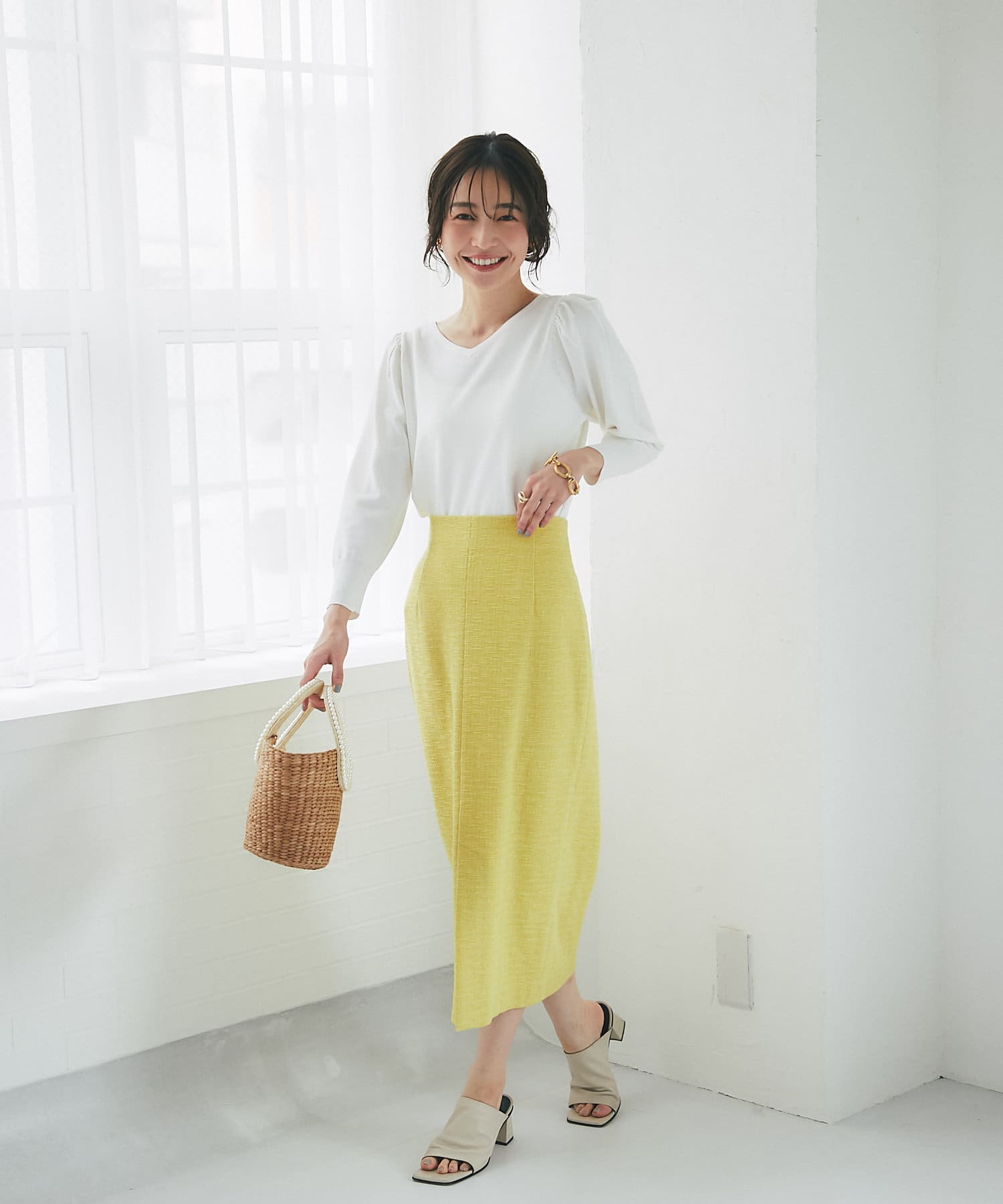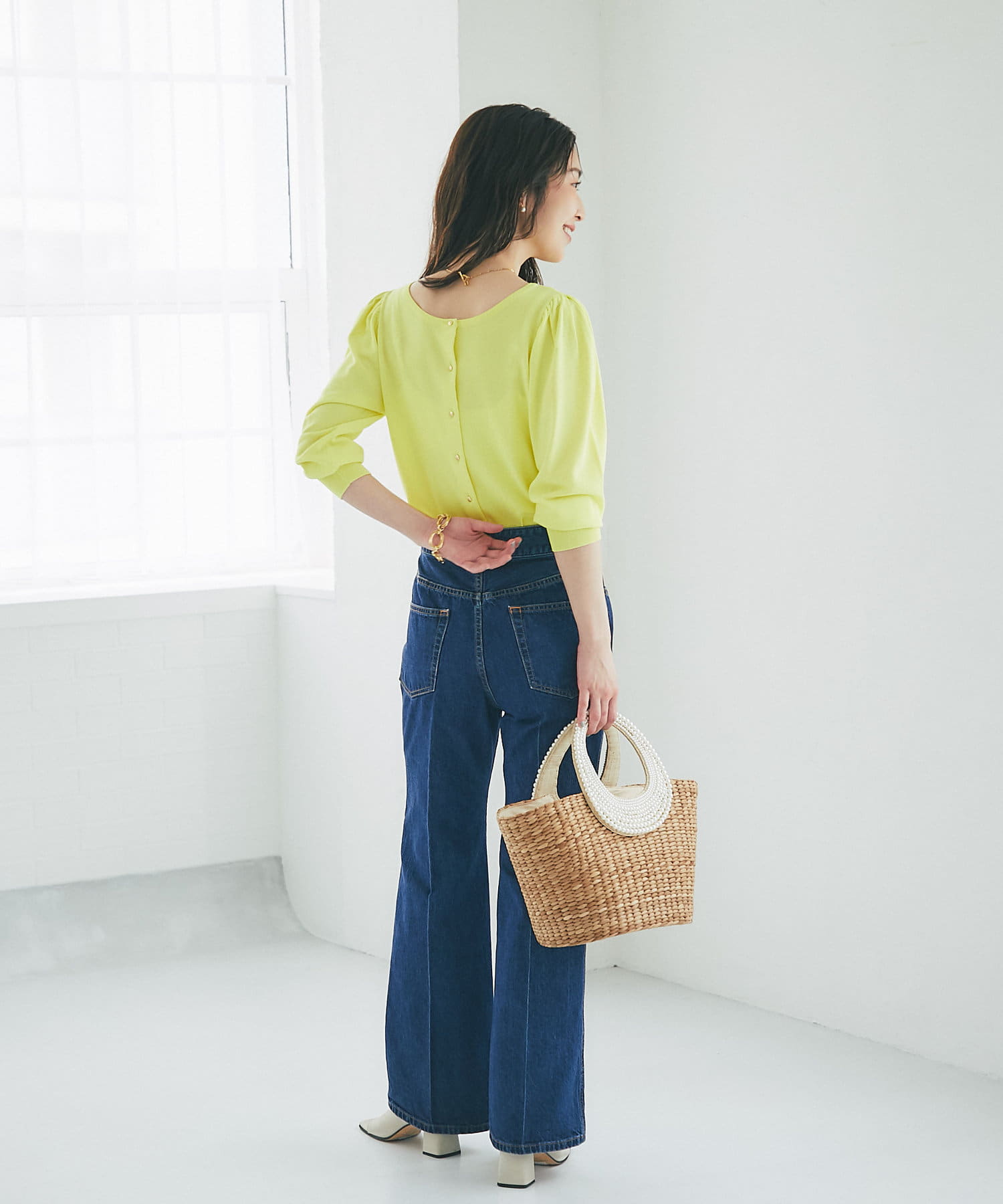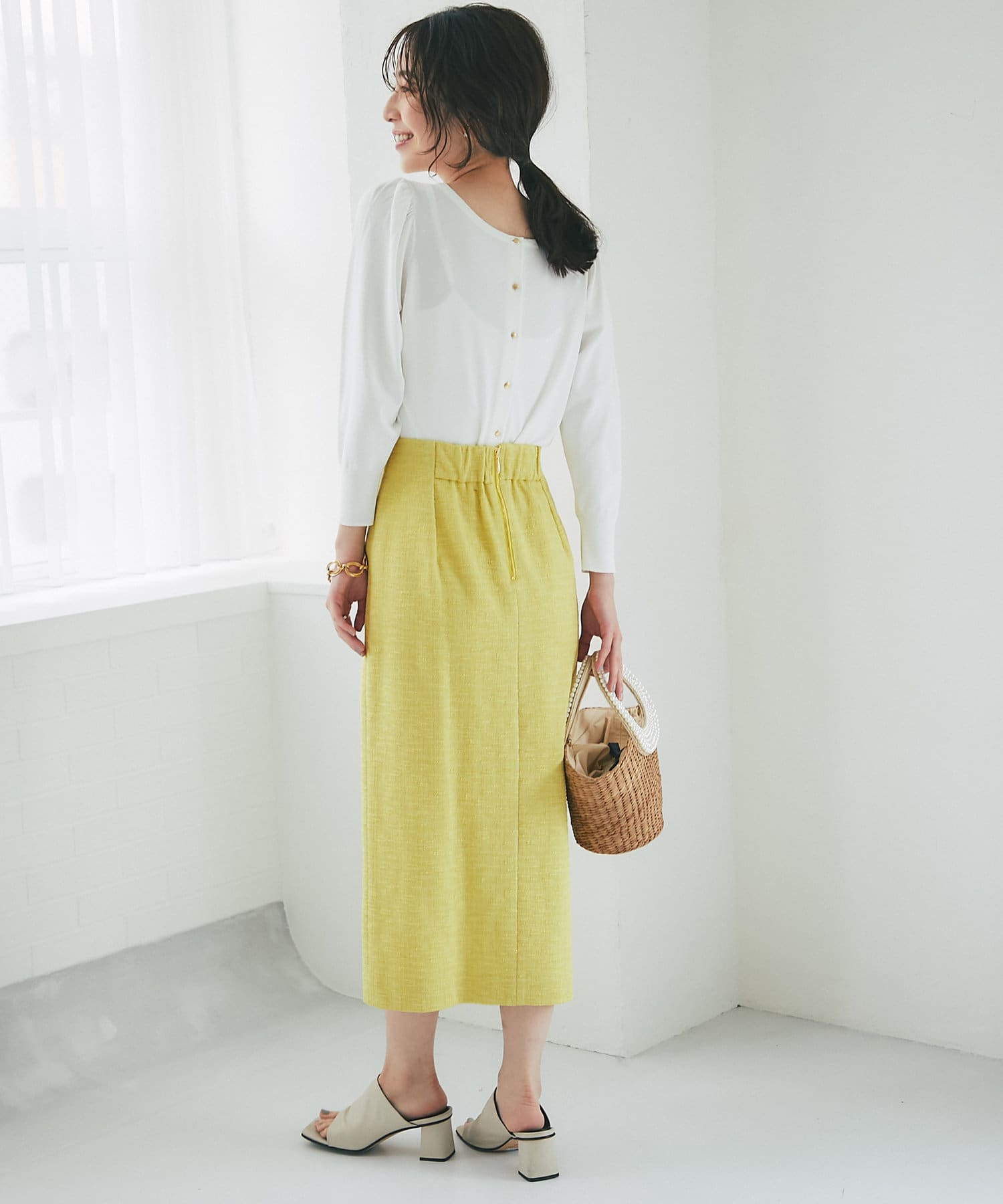 柄スカートなど華やかなボトムの合わせに使いやすいアイテムです。