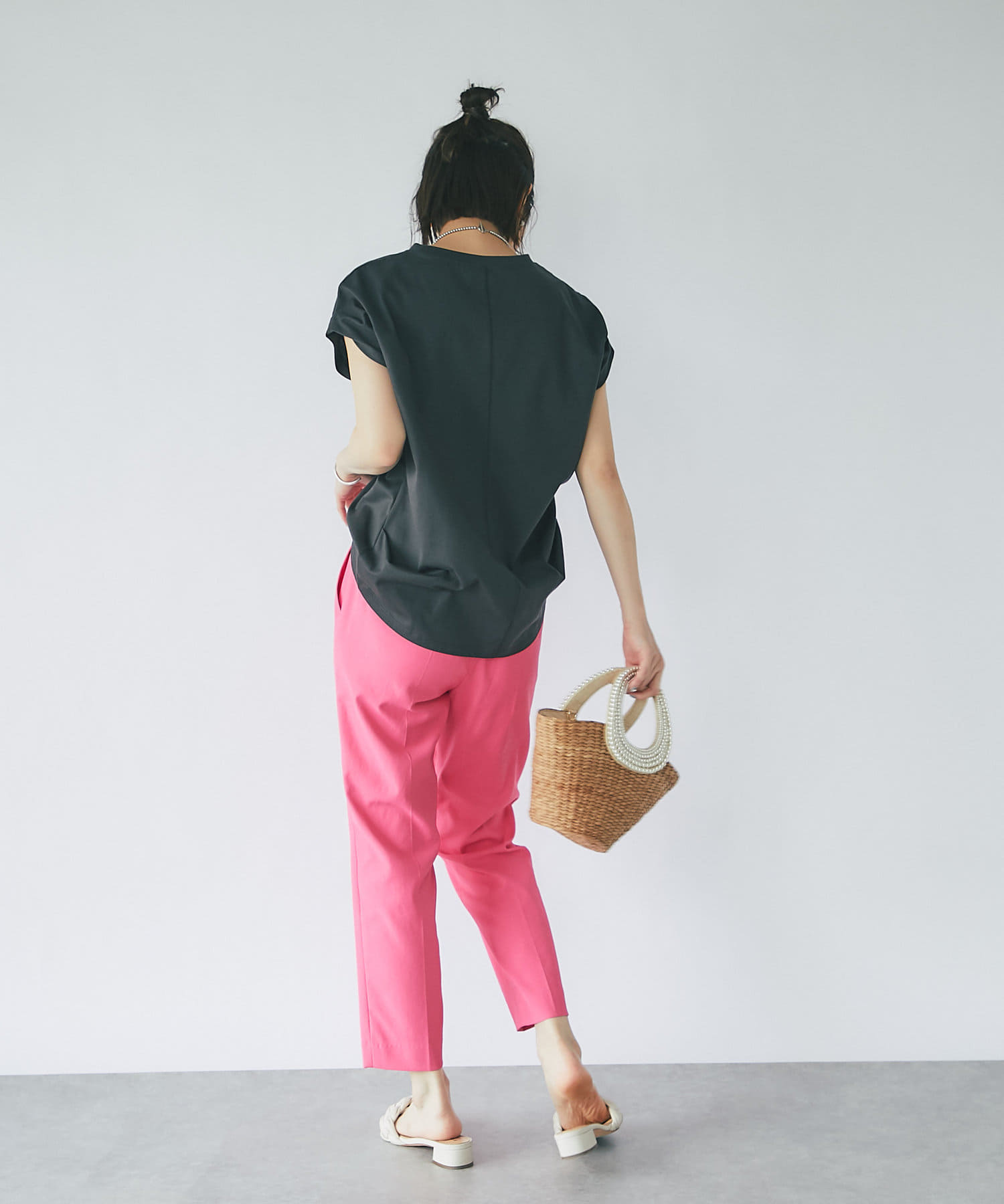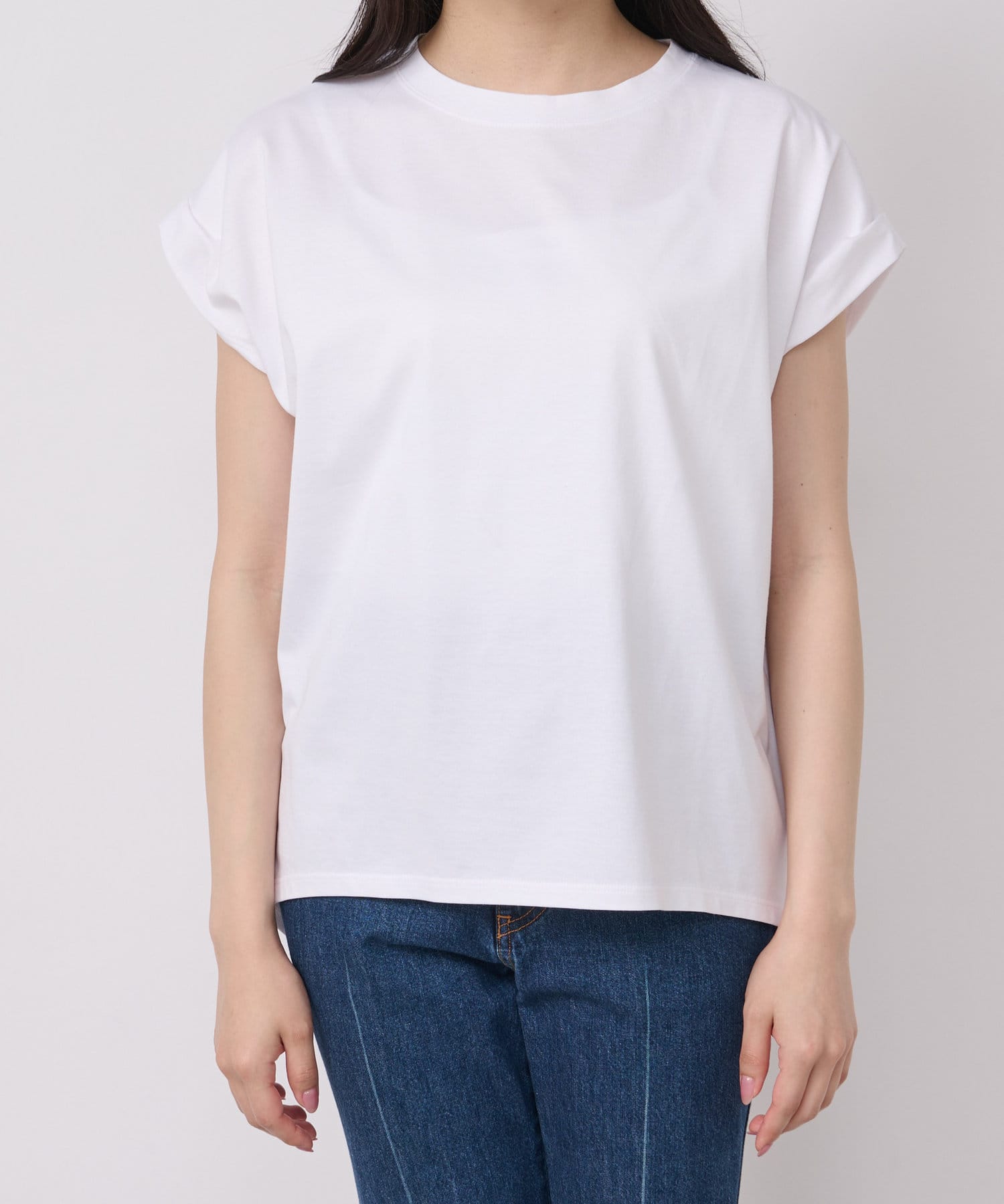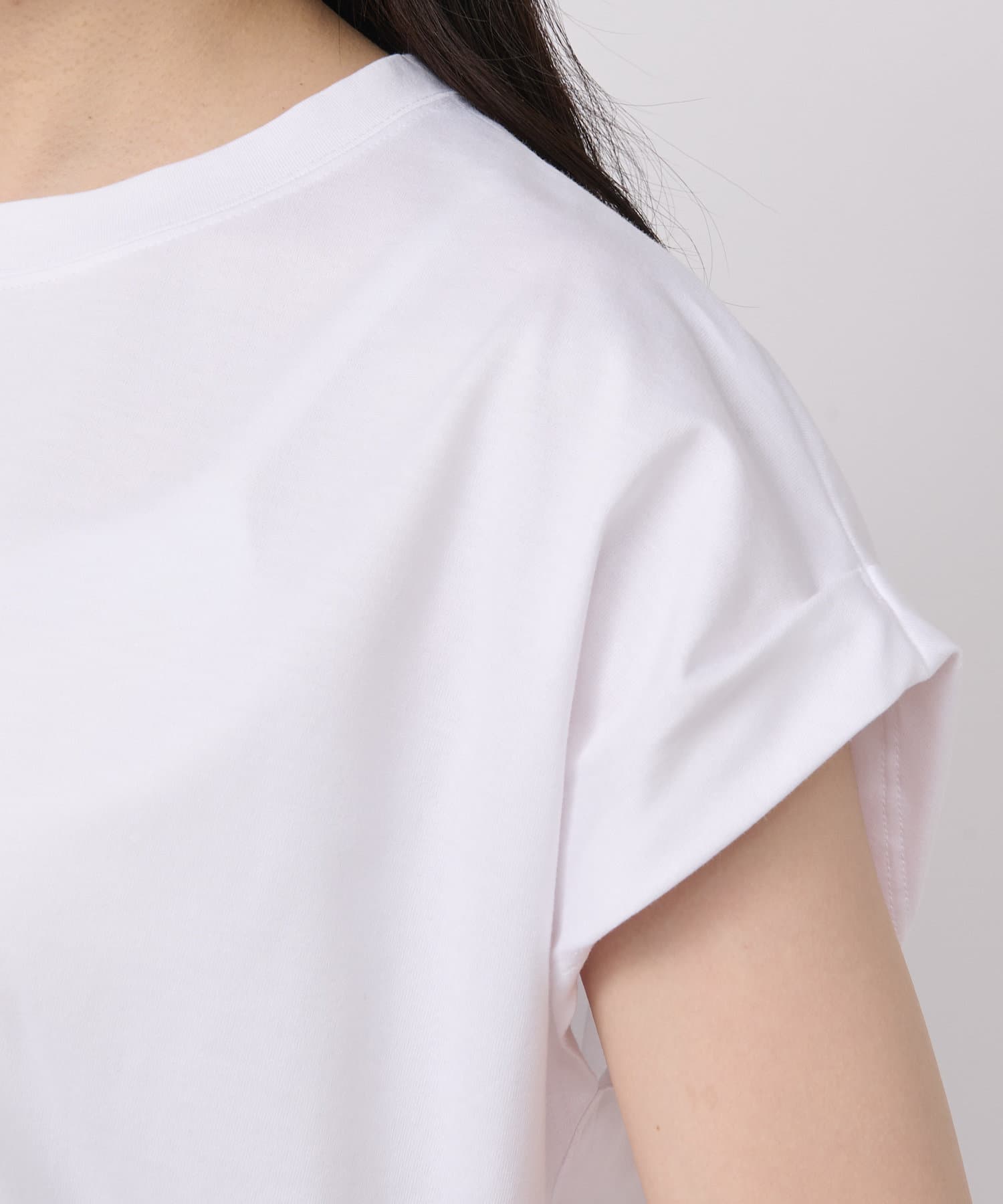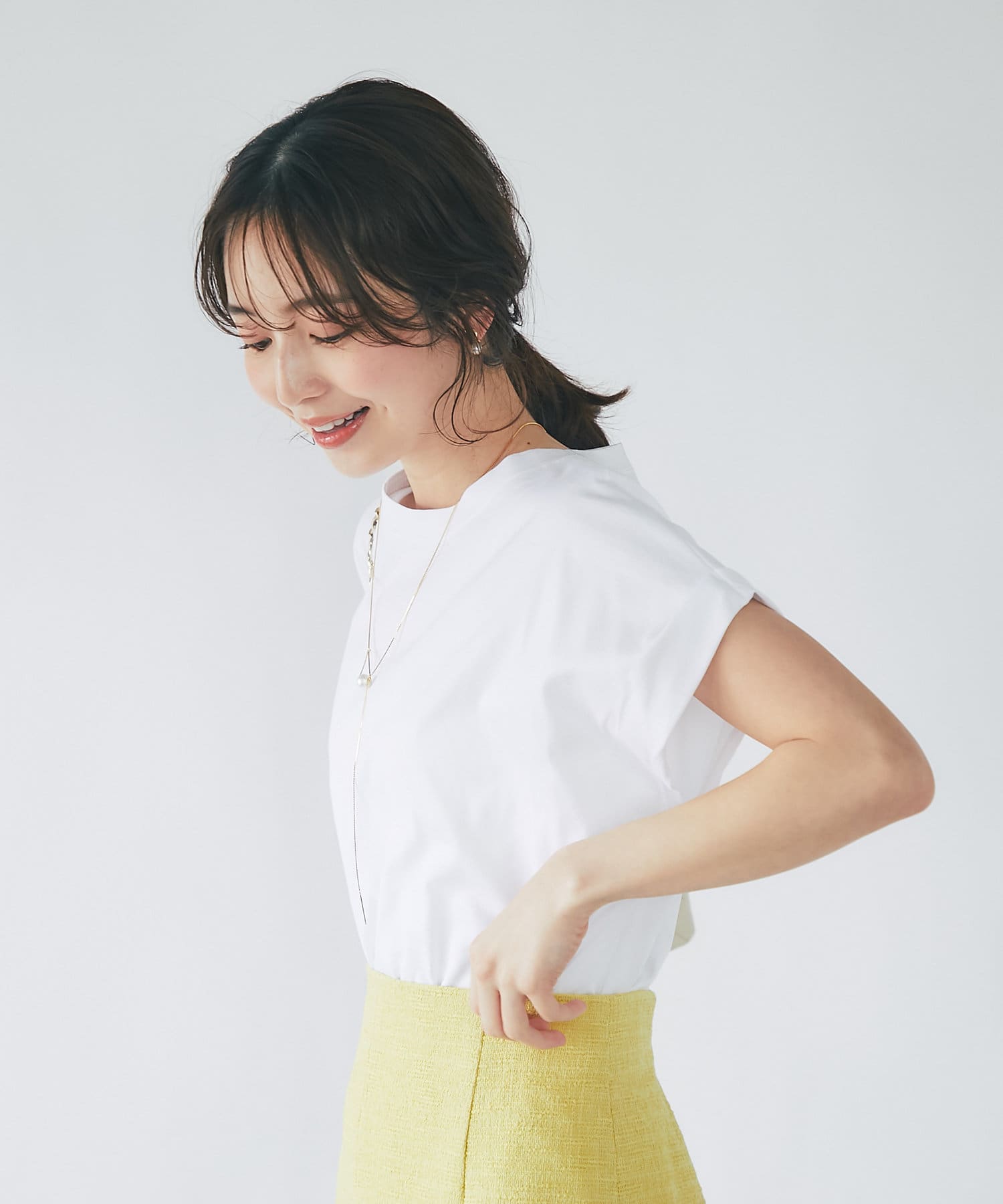 シンプルでベーシックなデザインながら、華奢見えするフレンチスリーブや