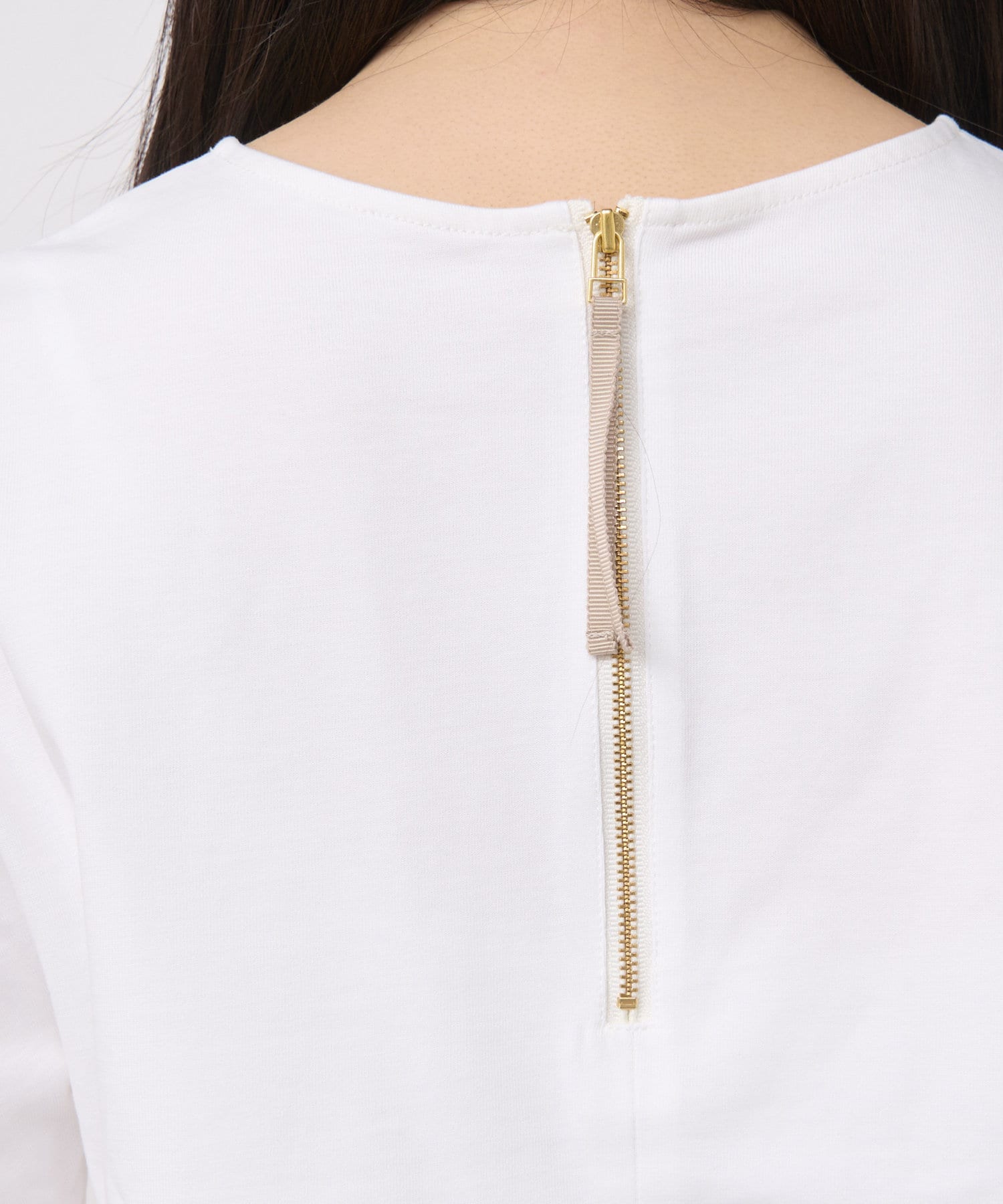 バックのファスナーはグログランリボンで着脱しやすく、上品な仕上がりに。