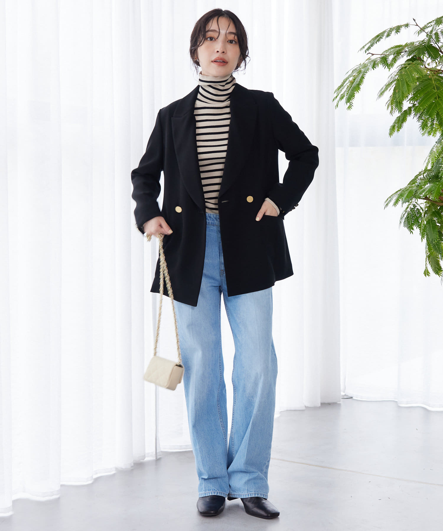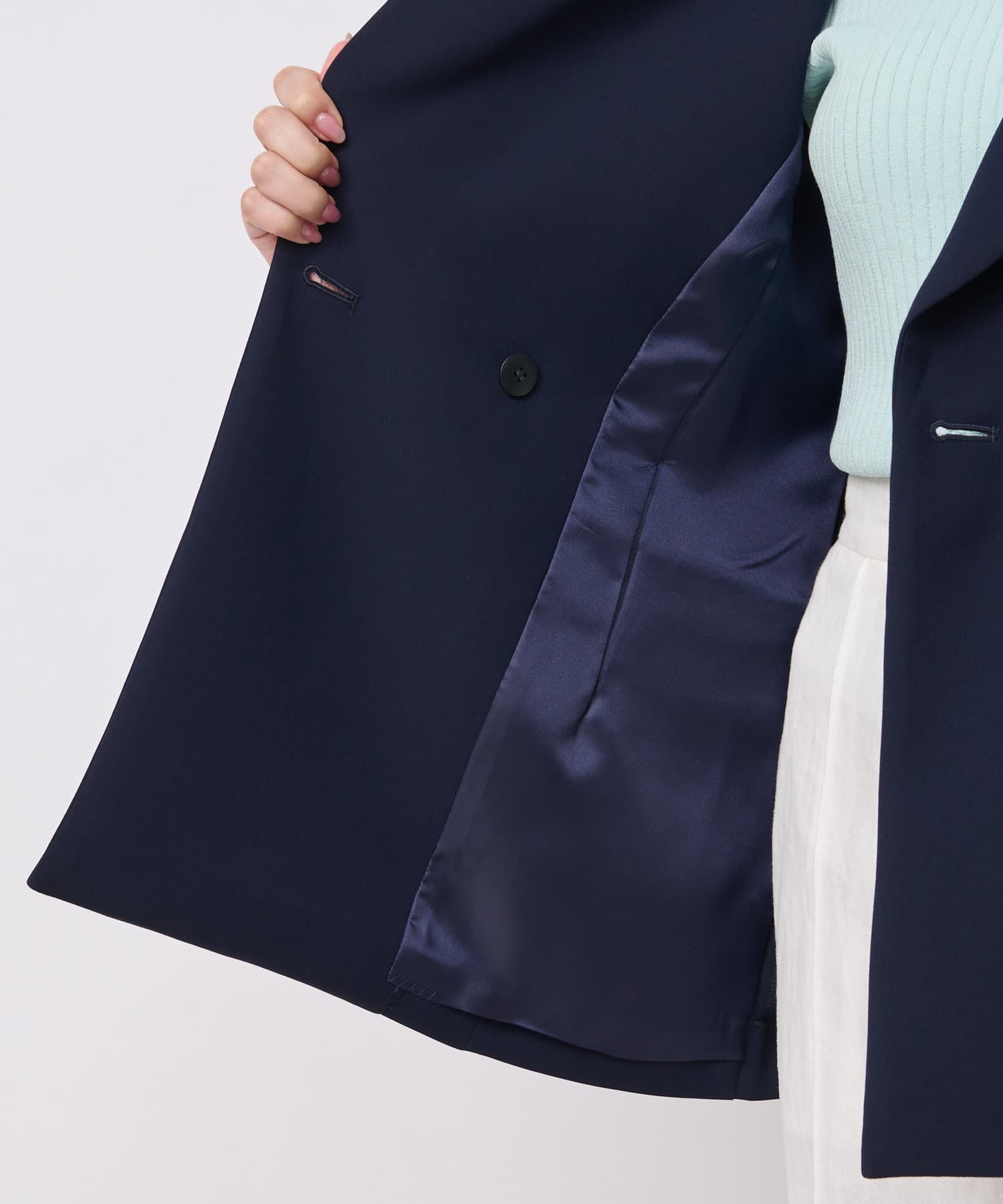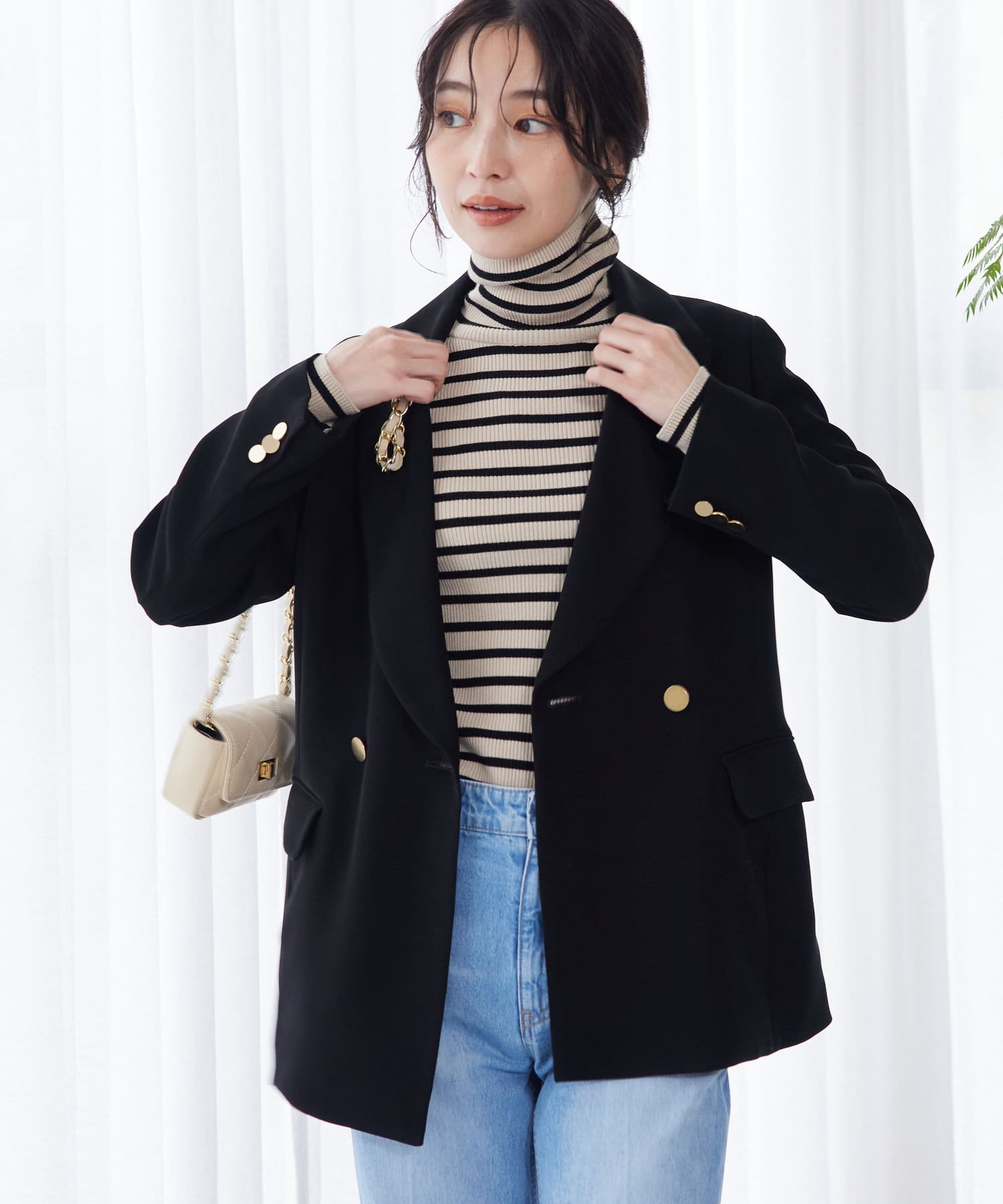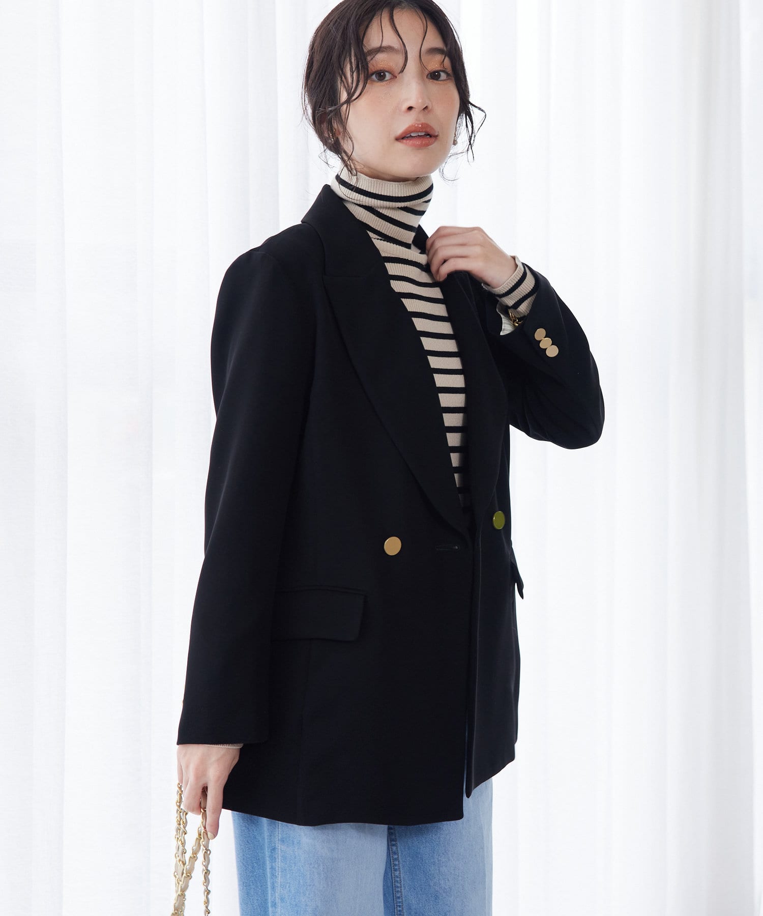 ☑やや上よりのゴールド釦で視線を上に誘導し、スタイルアップにも期待できます