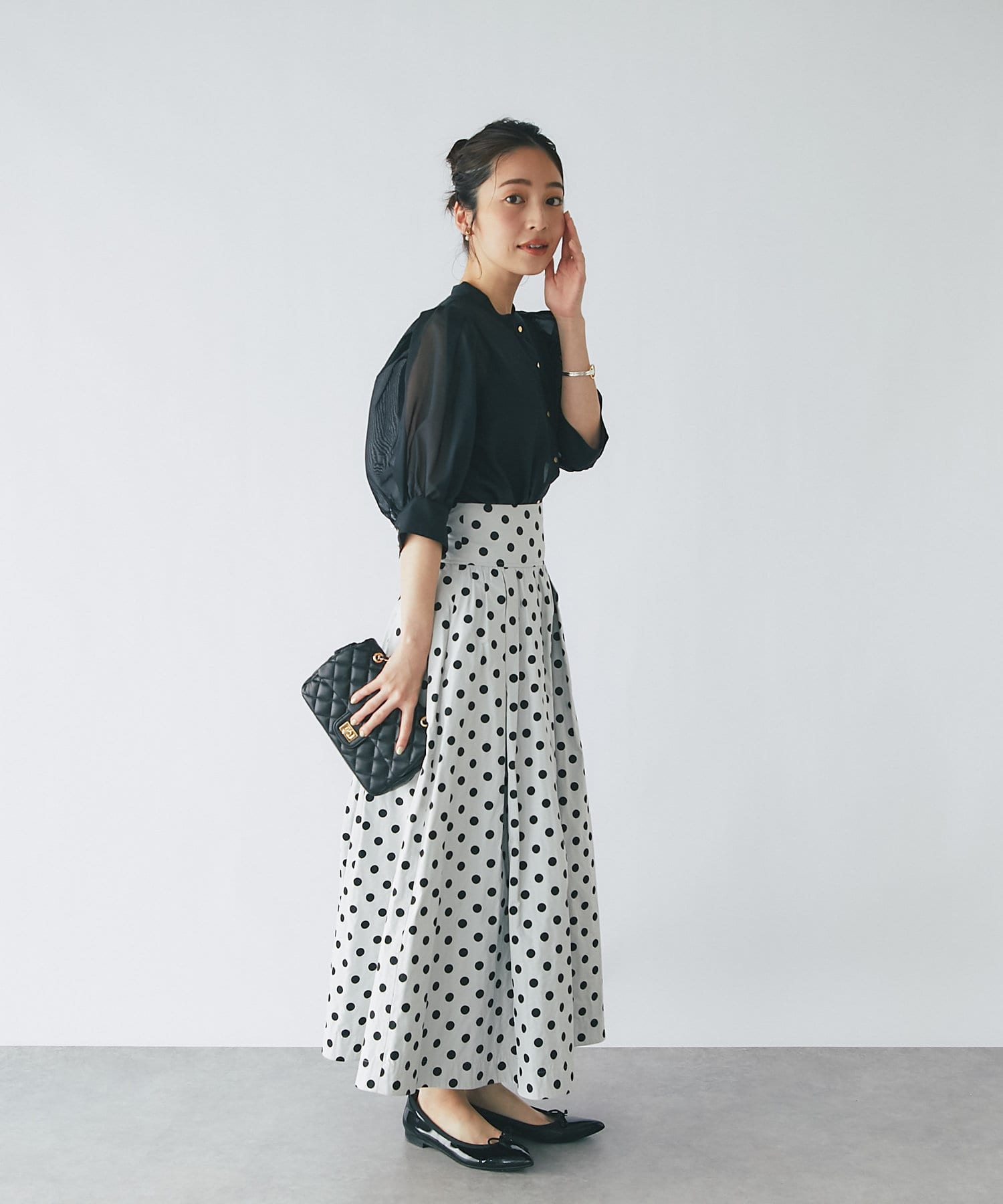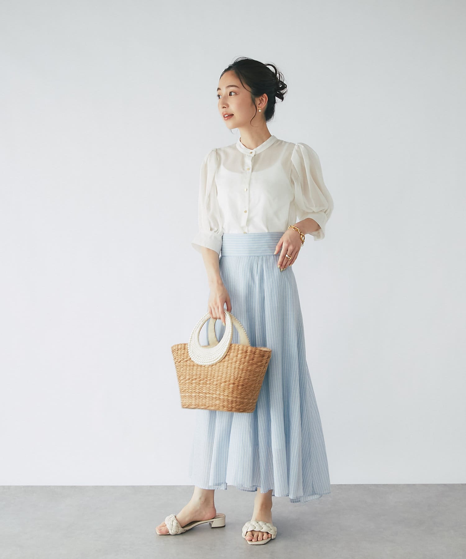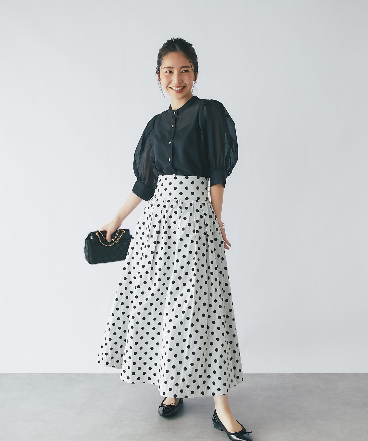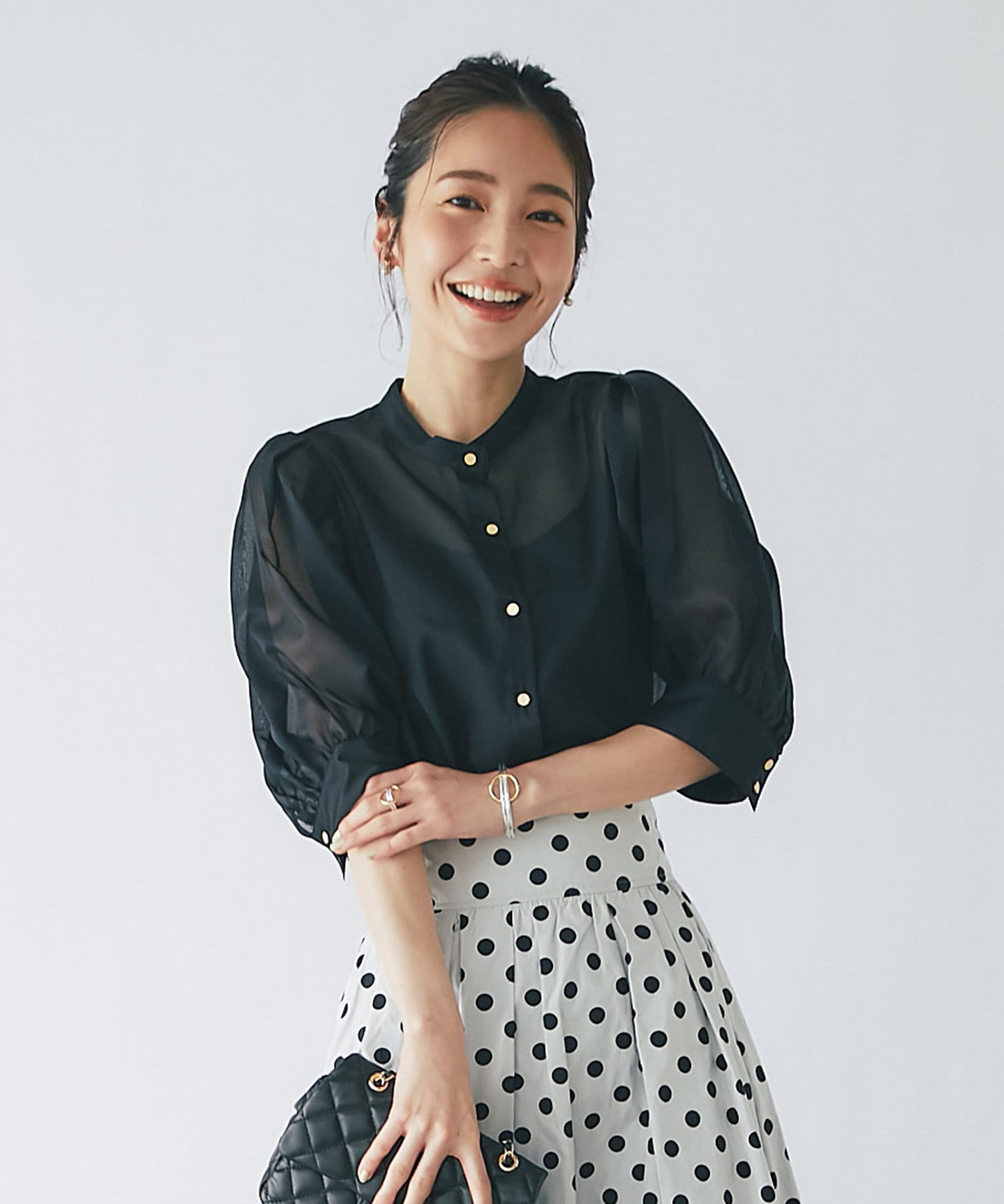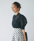 トレンドのシアーブラウスを、ボリュームスリーブデザインで大人可愛く仕上げました。