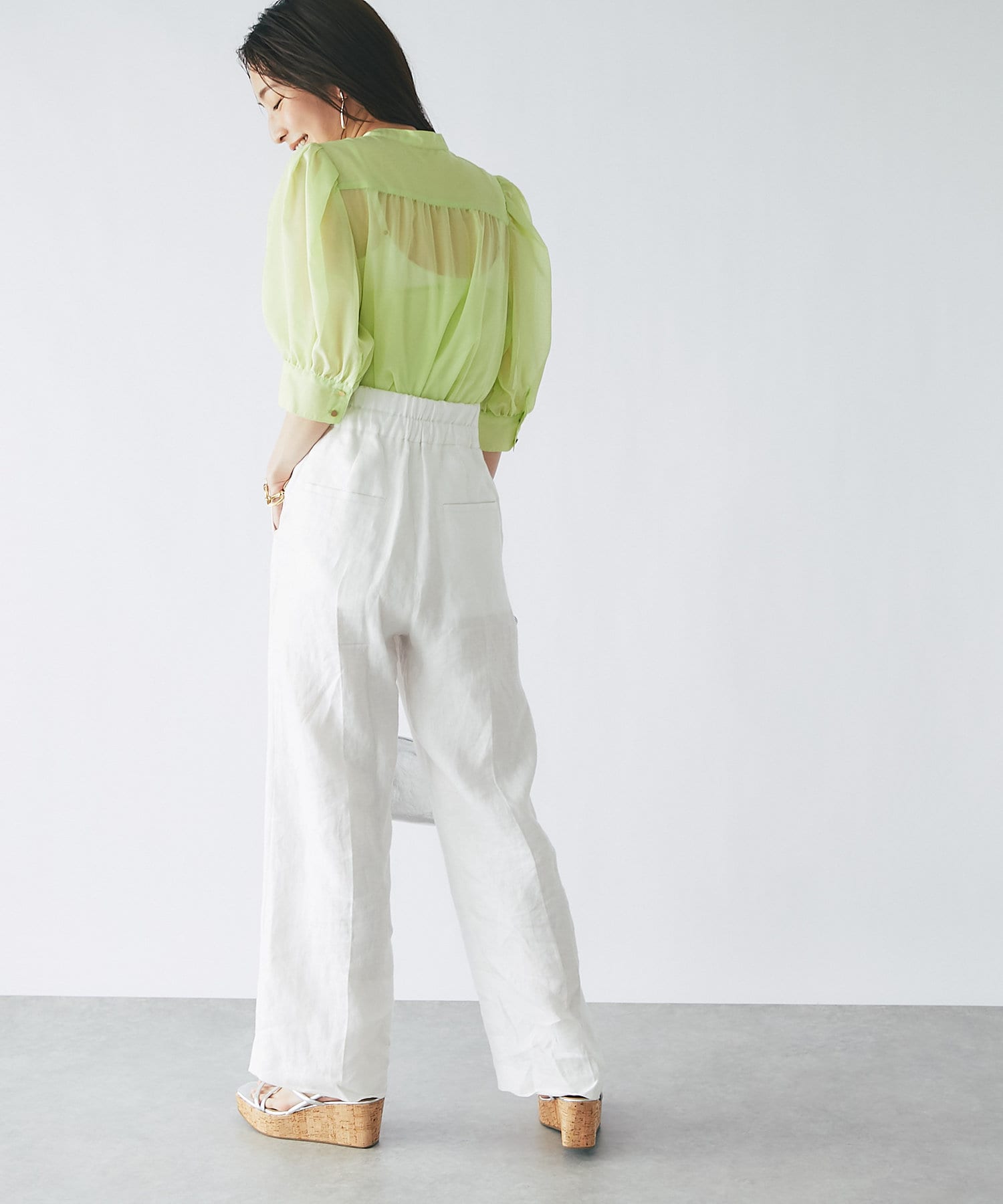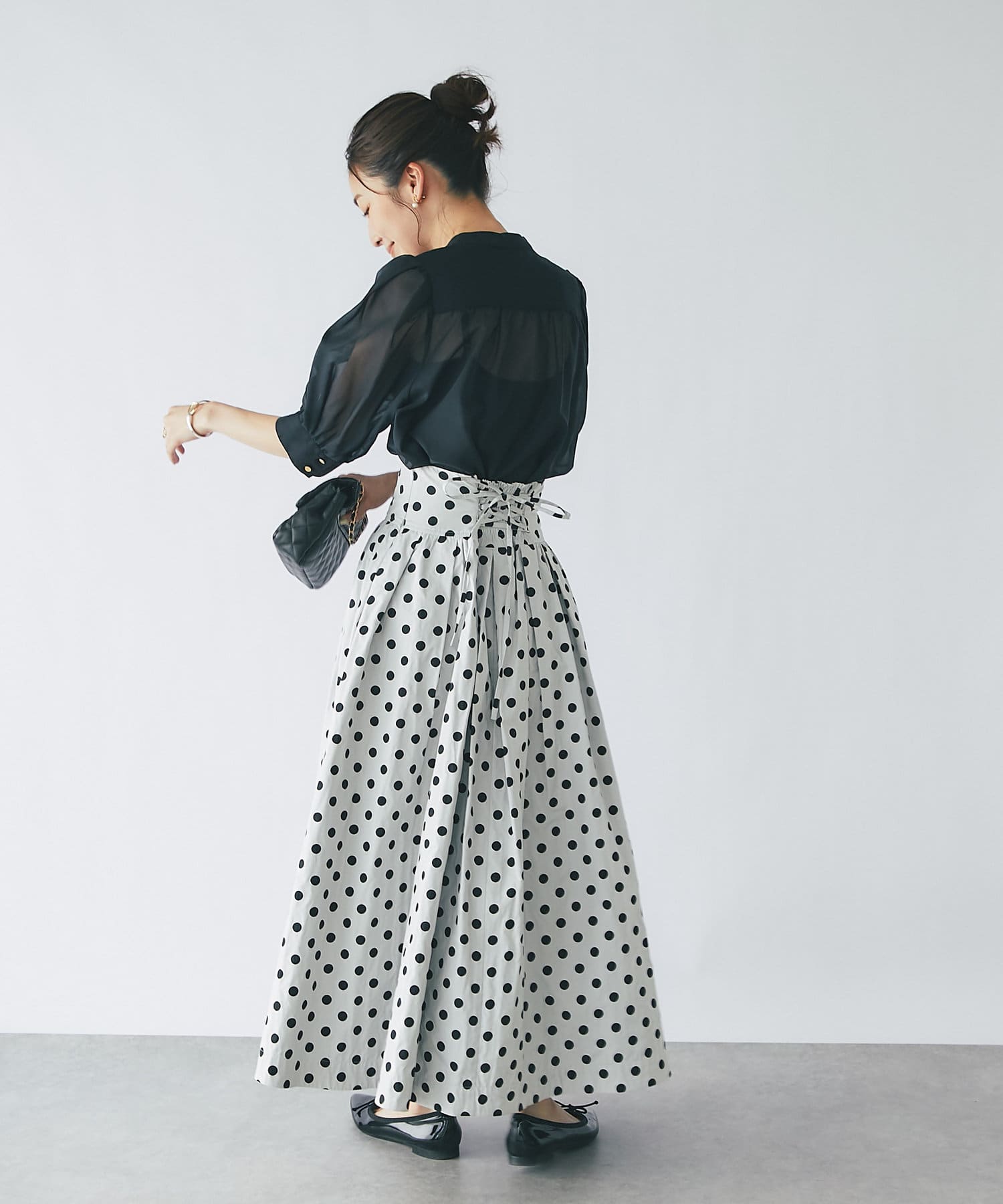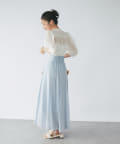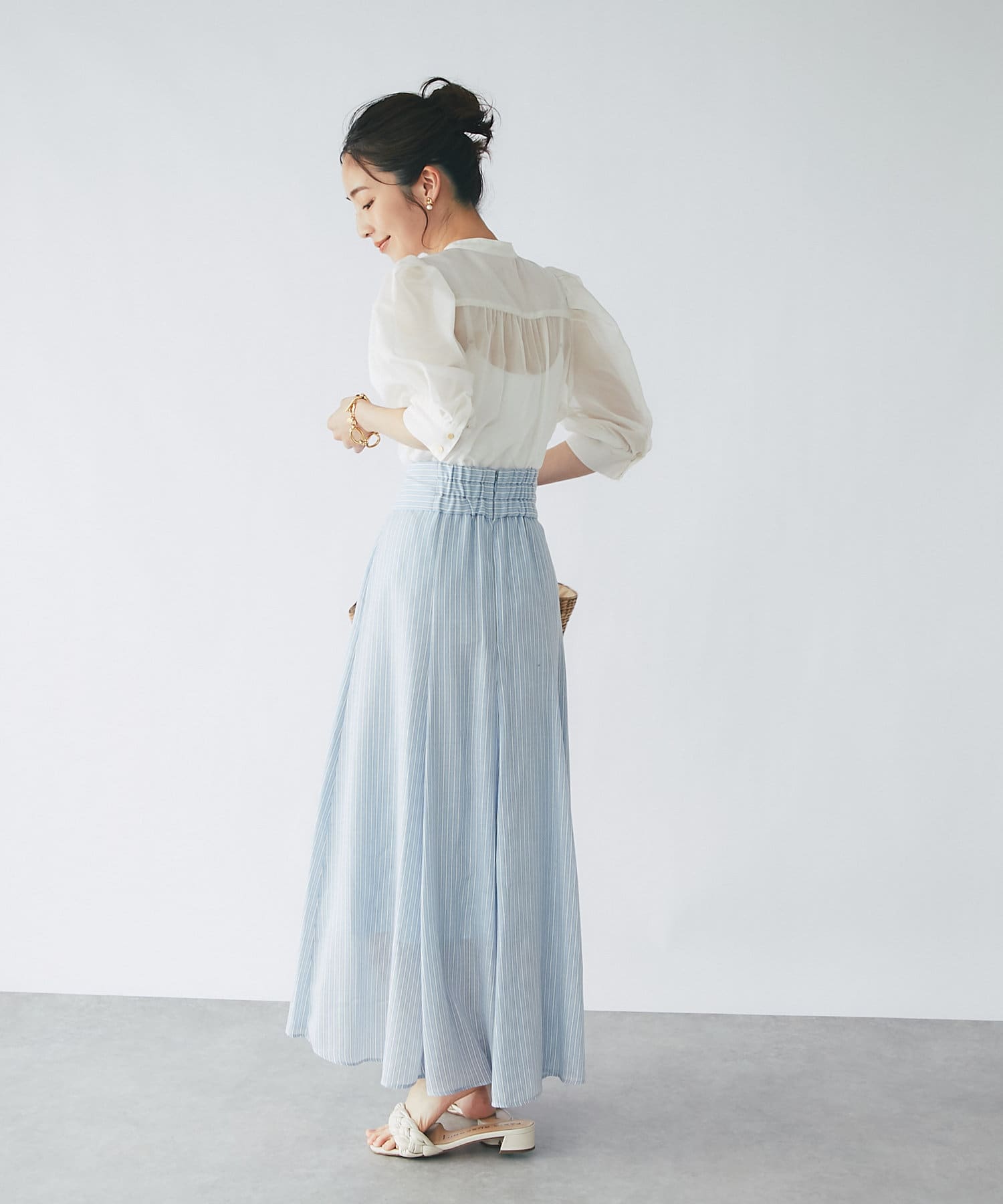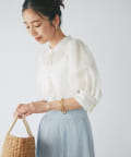 トレンドのシアーブラウスを、ボリュームスリーブデザインで大人可愛く仕上げました。