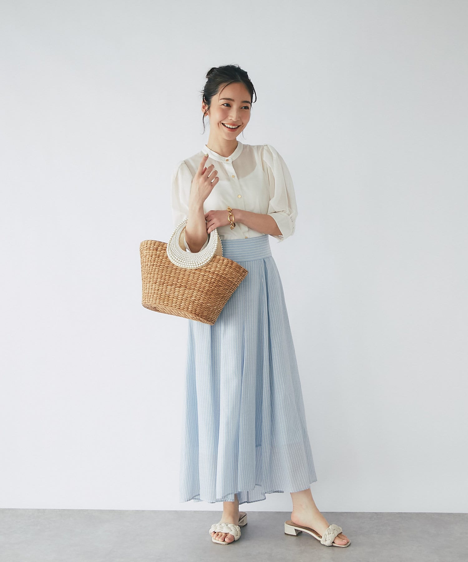 スカートに合わせてフェミニンコーデはもちろん、