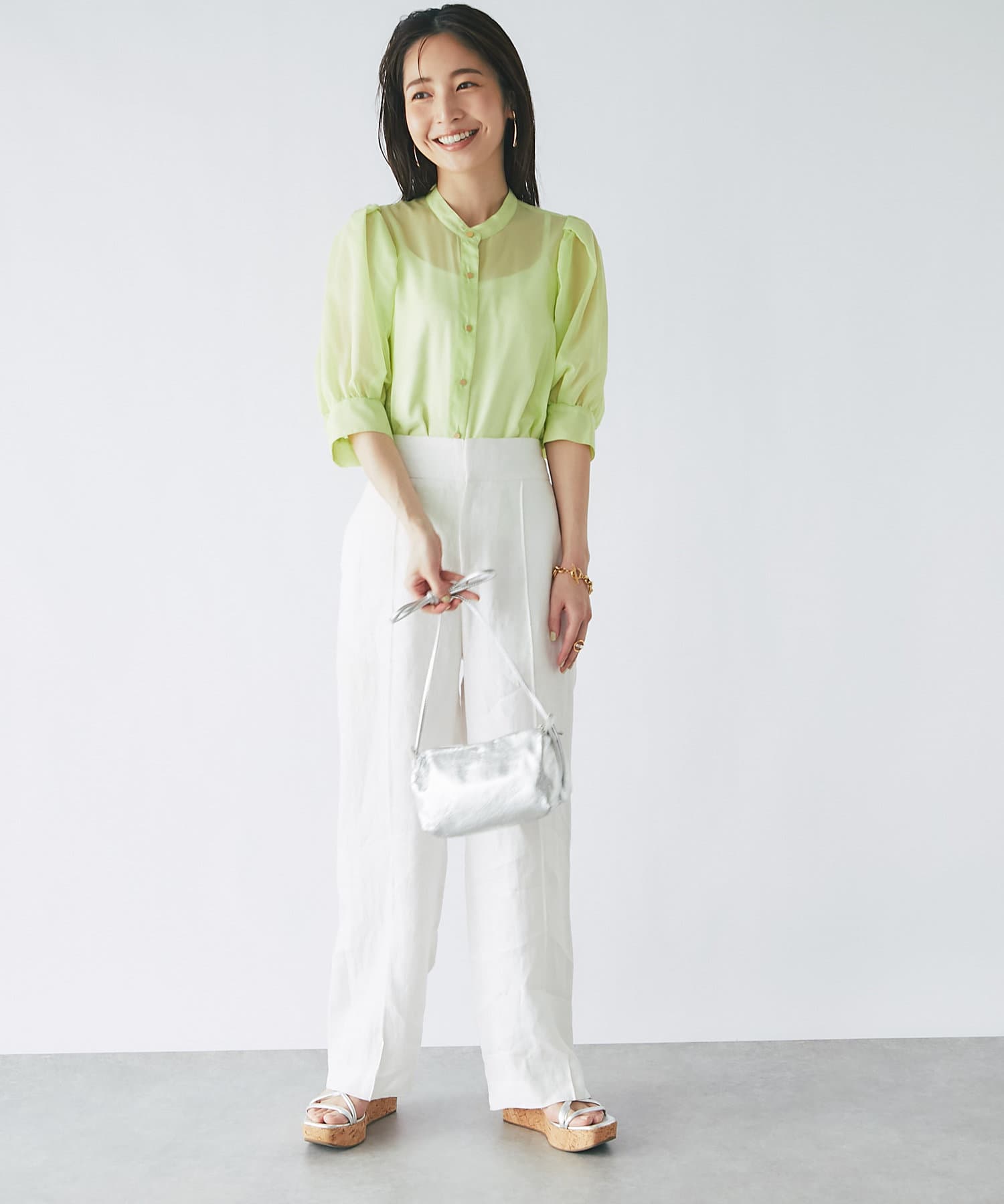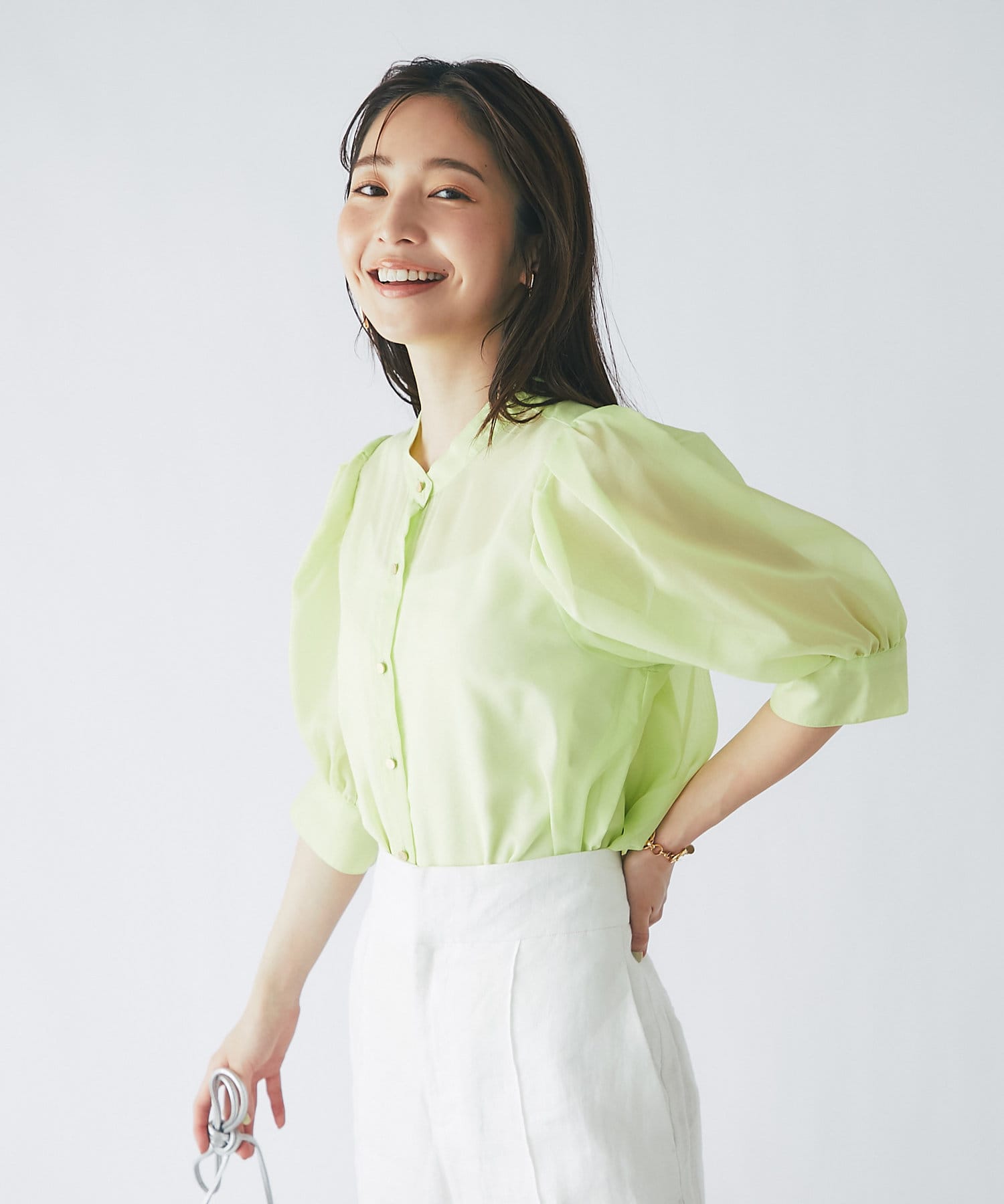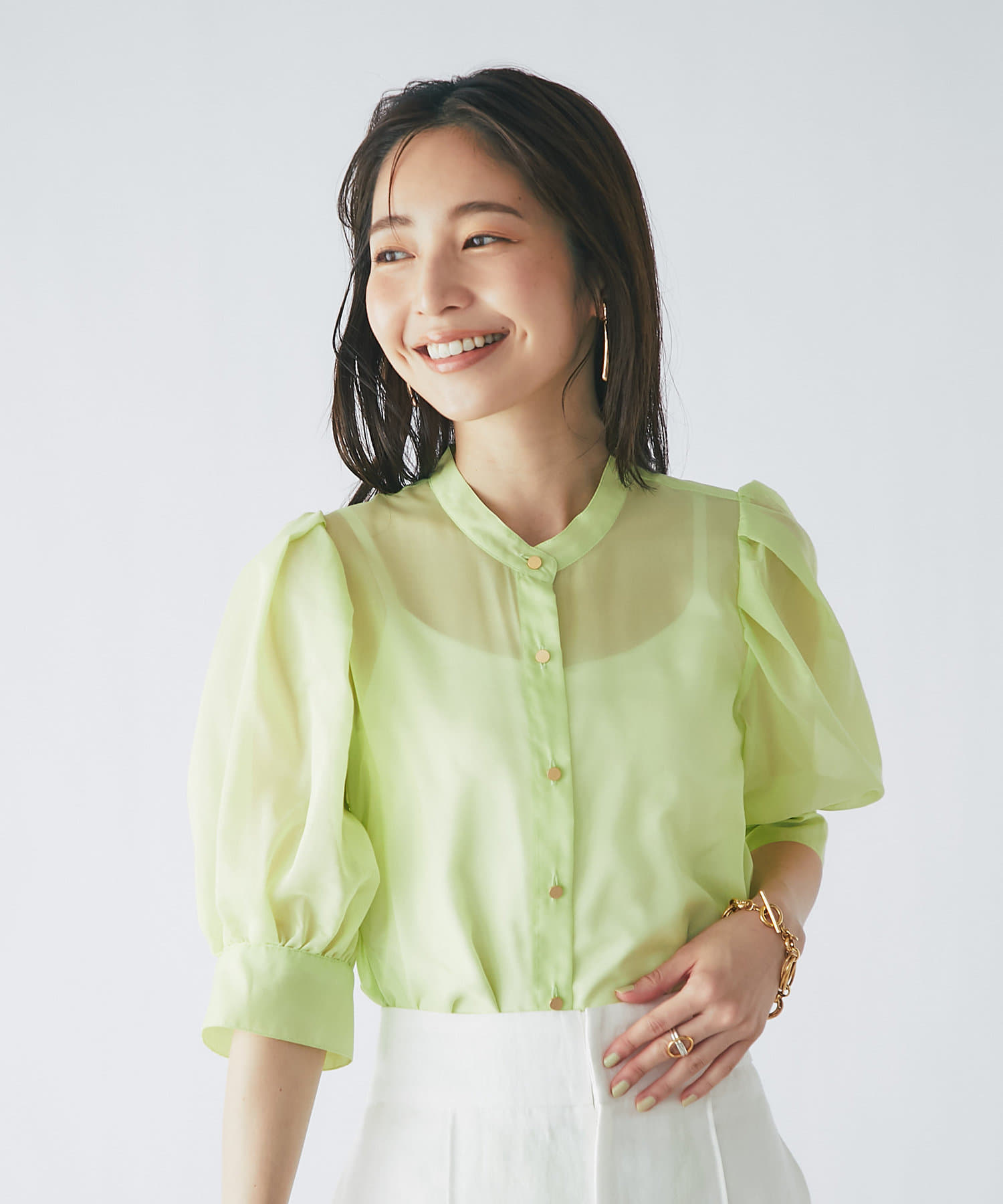 #大人可愛い #きれいめコーデ #上品カジュアル #上品 #ブラウス #無地 #シアー #シャツ #ボリュームスリーブ #パフスリーブ #トレンド #きちんと #抜け感 #金ボタン #モテ女子 #モテ服 #オフコーデ #清潔感 #清涼感 #イエロー #カラー
