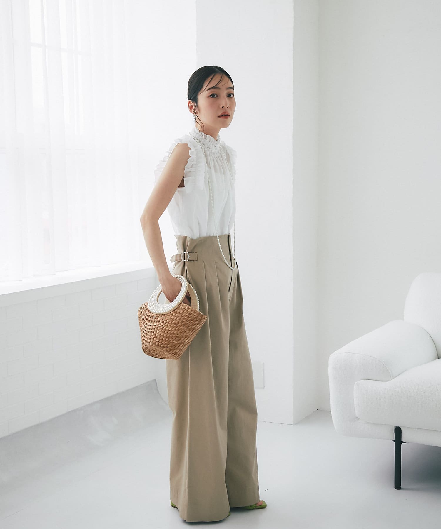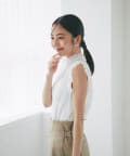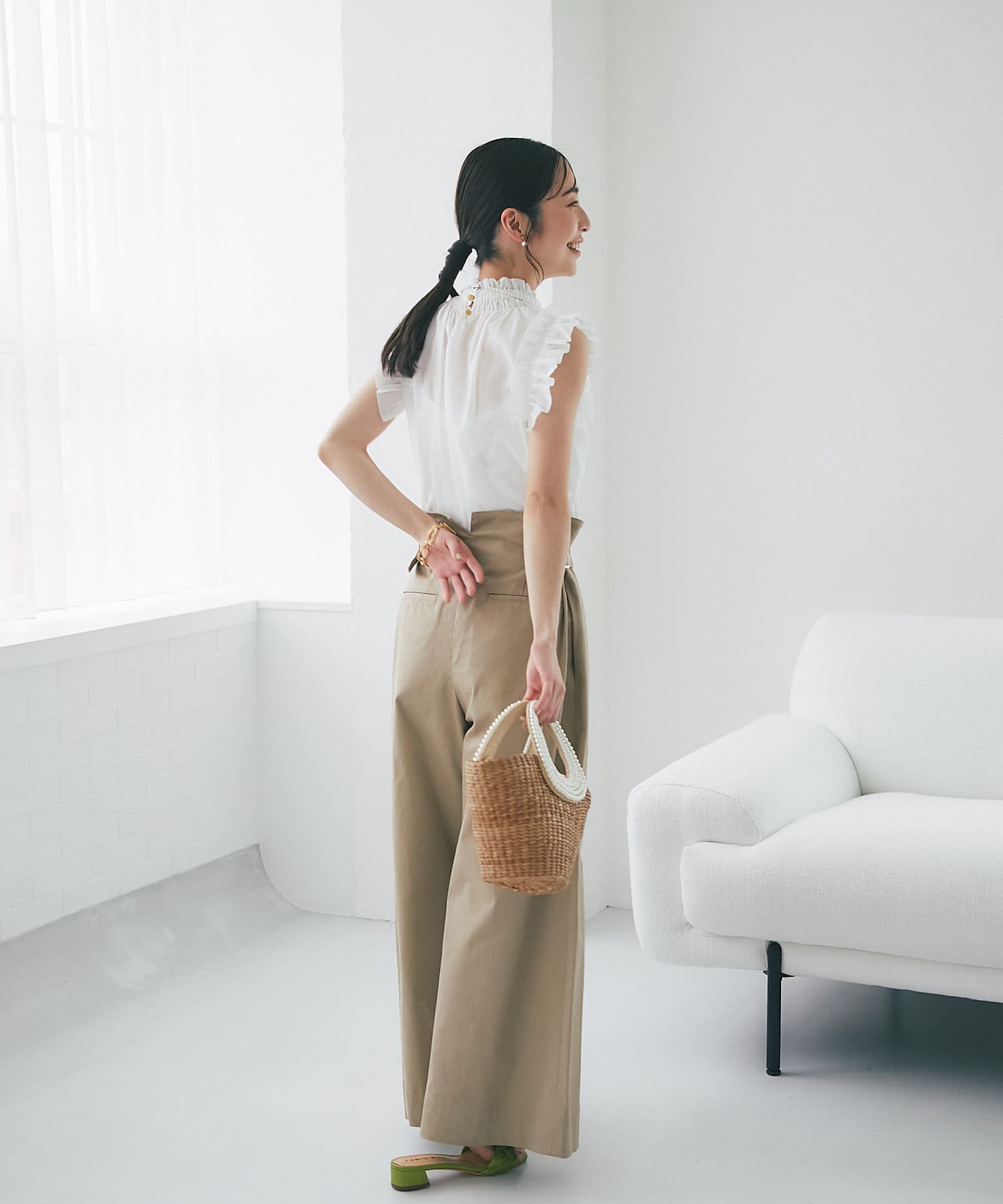 フリルをあしらったハイネックデザインがクラシカルな印象のノースリーブブラウスです。