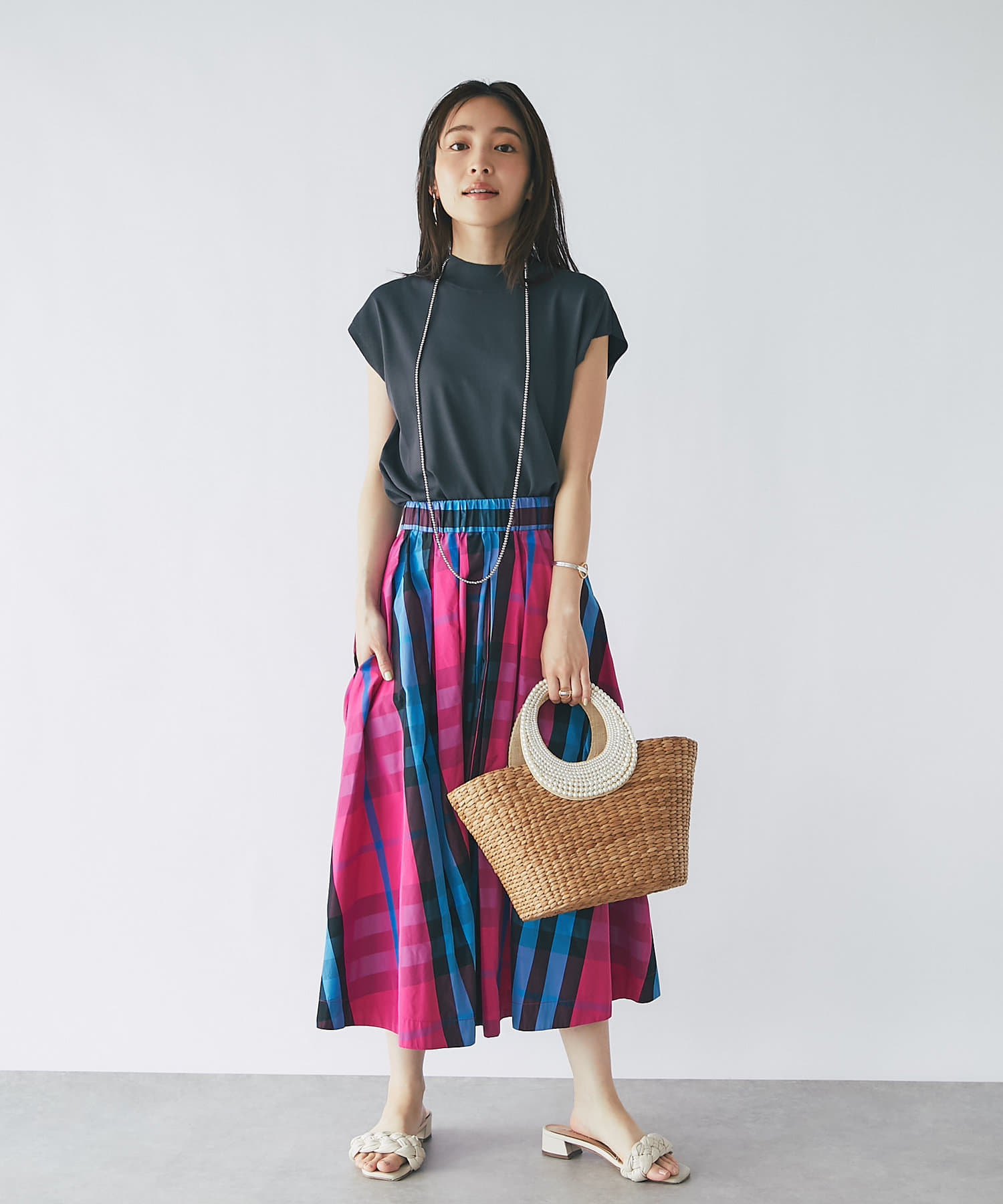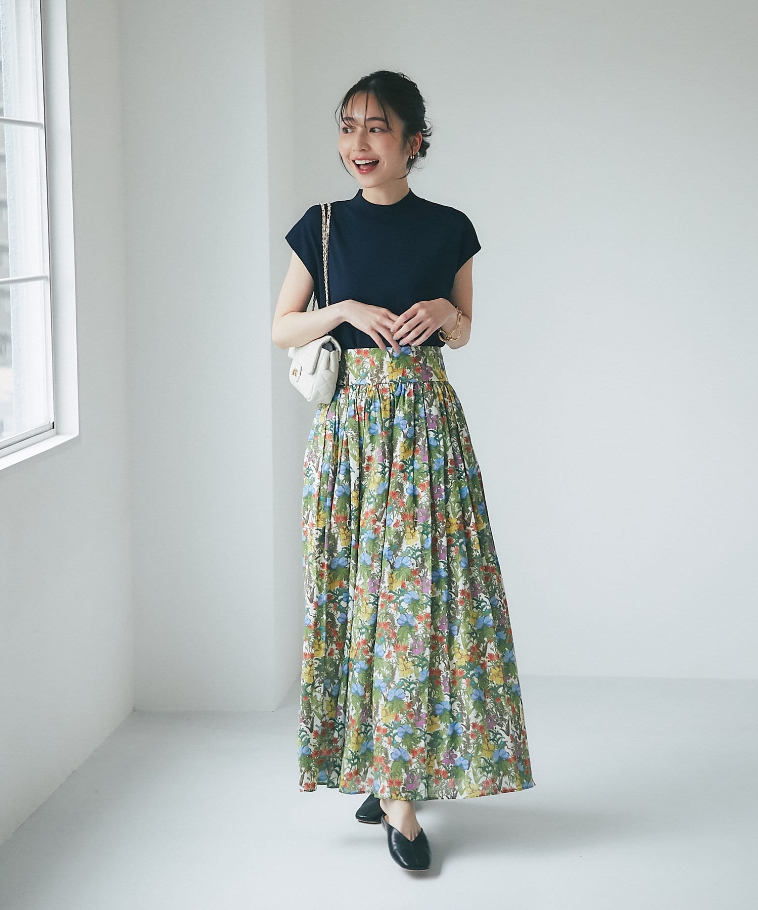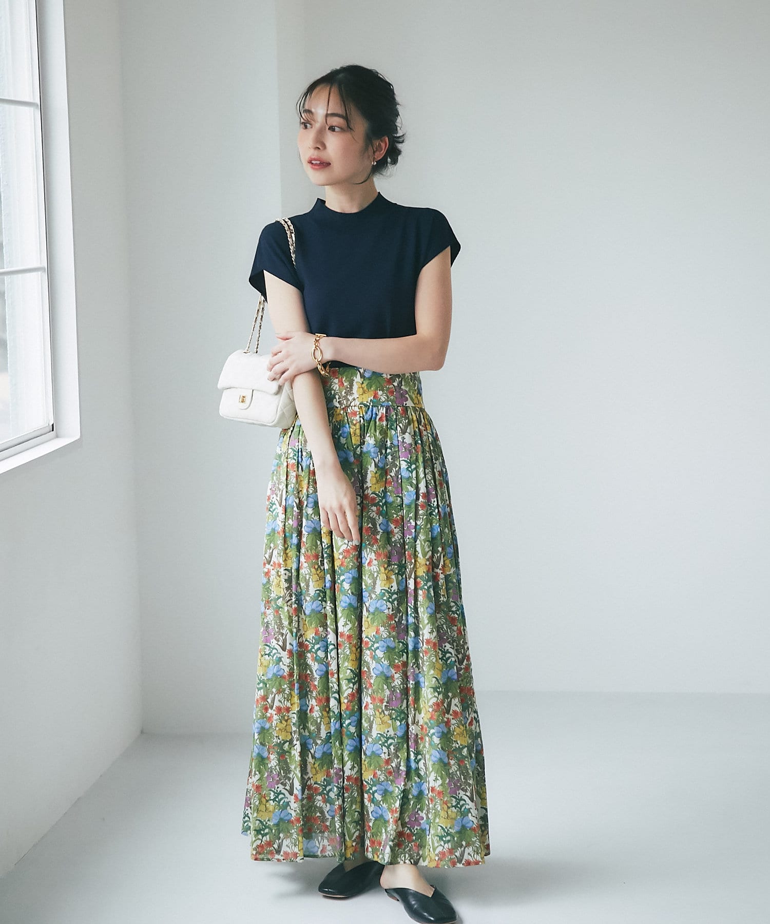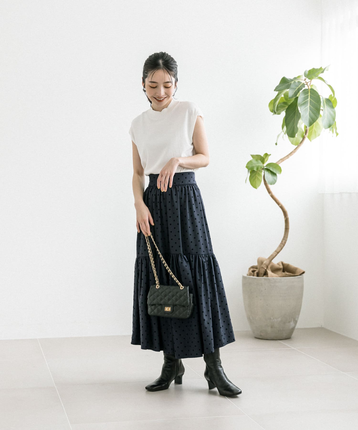 柄スカートなど華やかなボトムの合わせに使いやすいアイテムです。