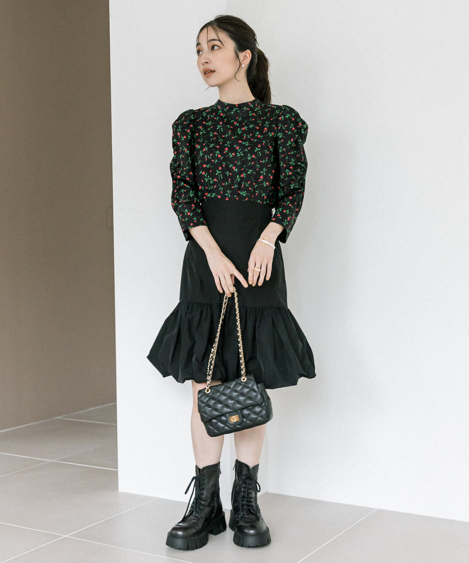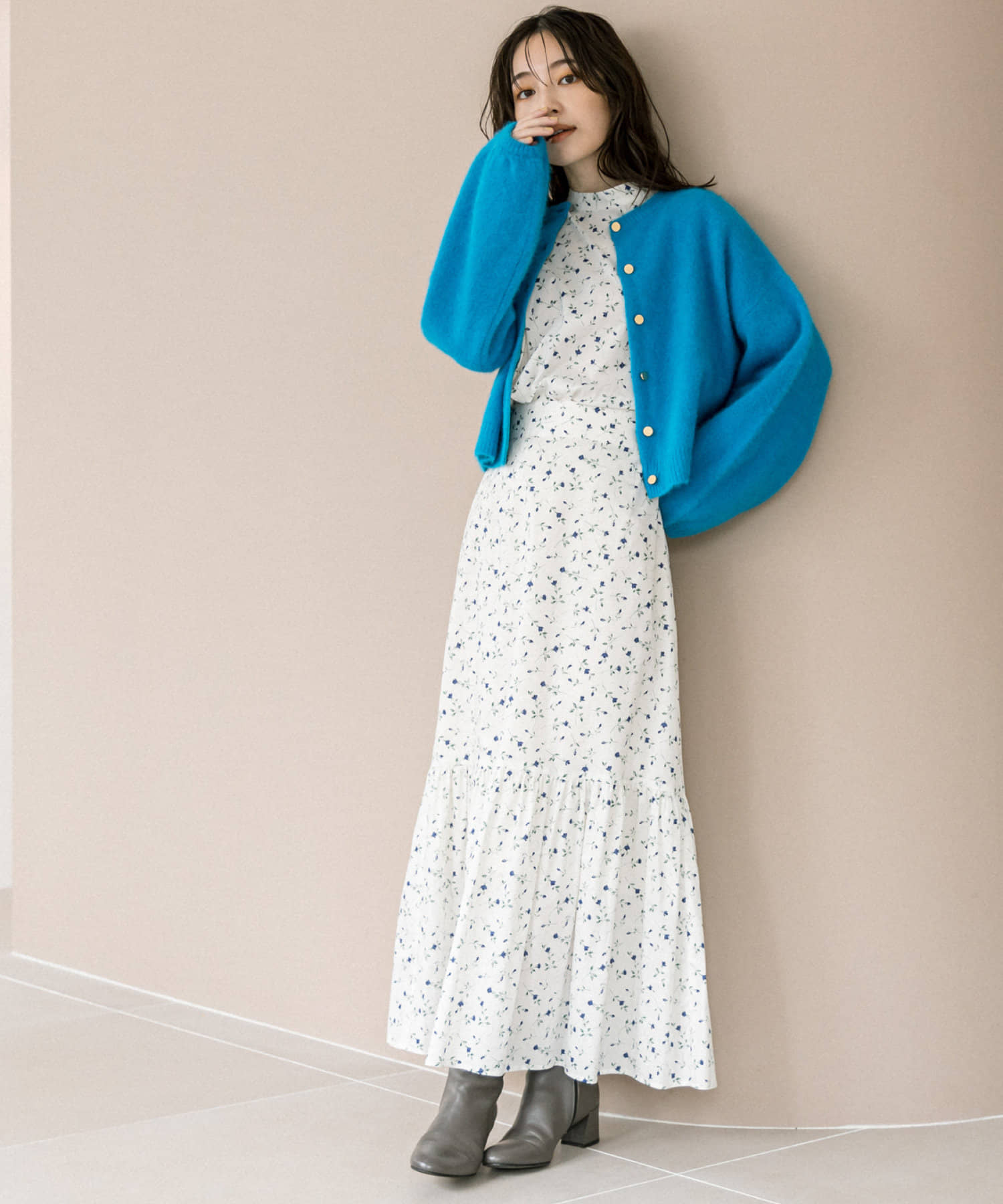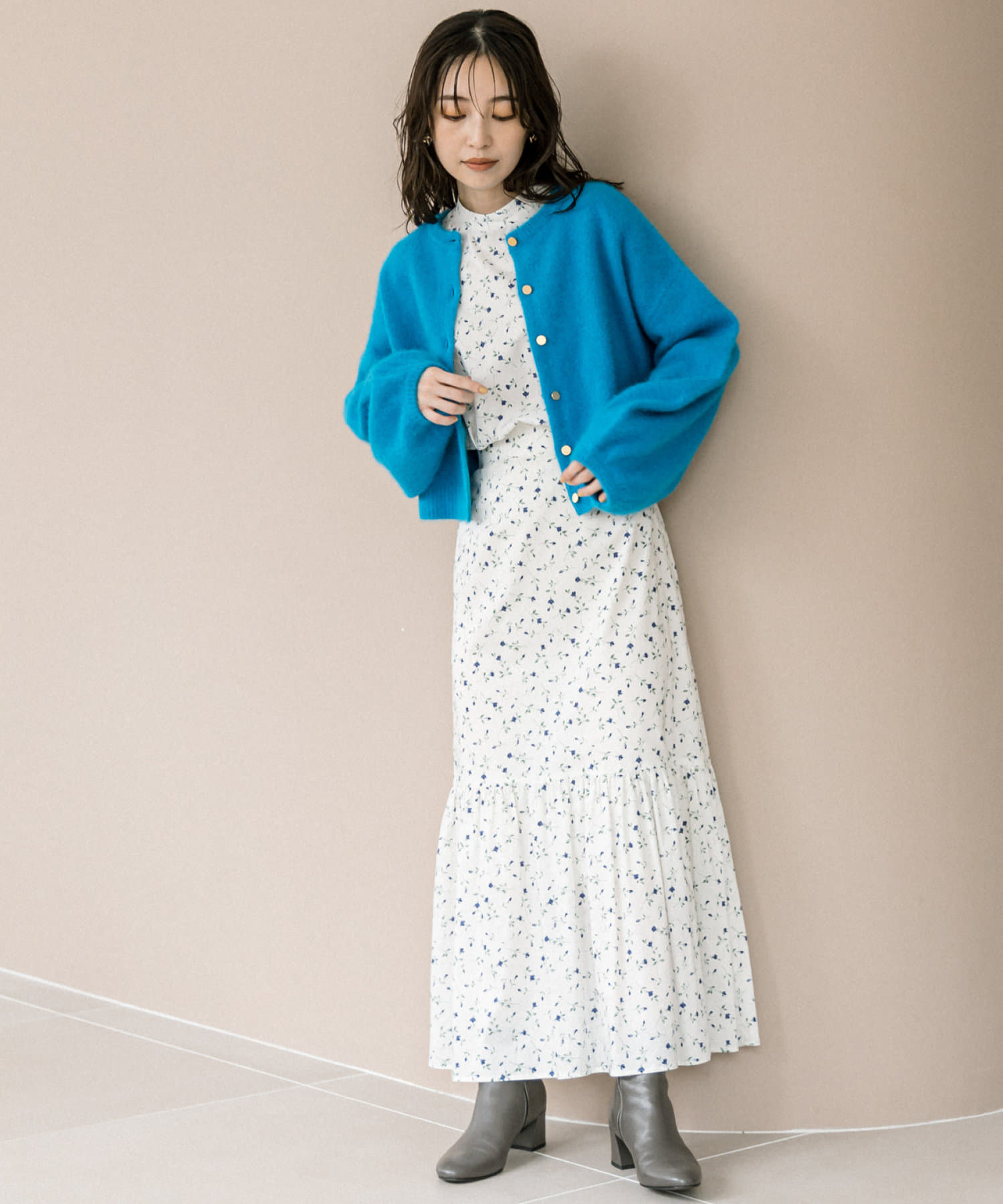 同素材のスカートとセットアップで着るとワンピースのような着こなしが楽しめます。