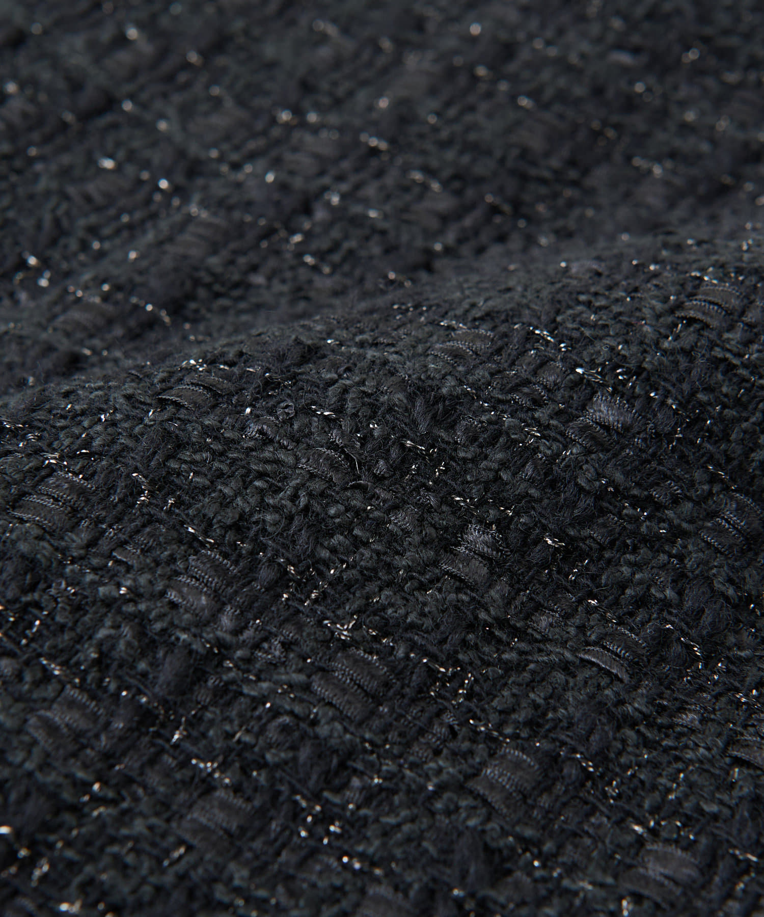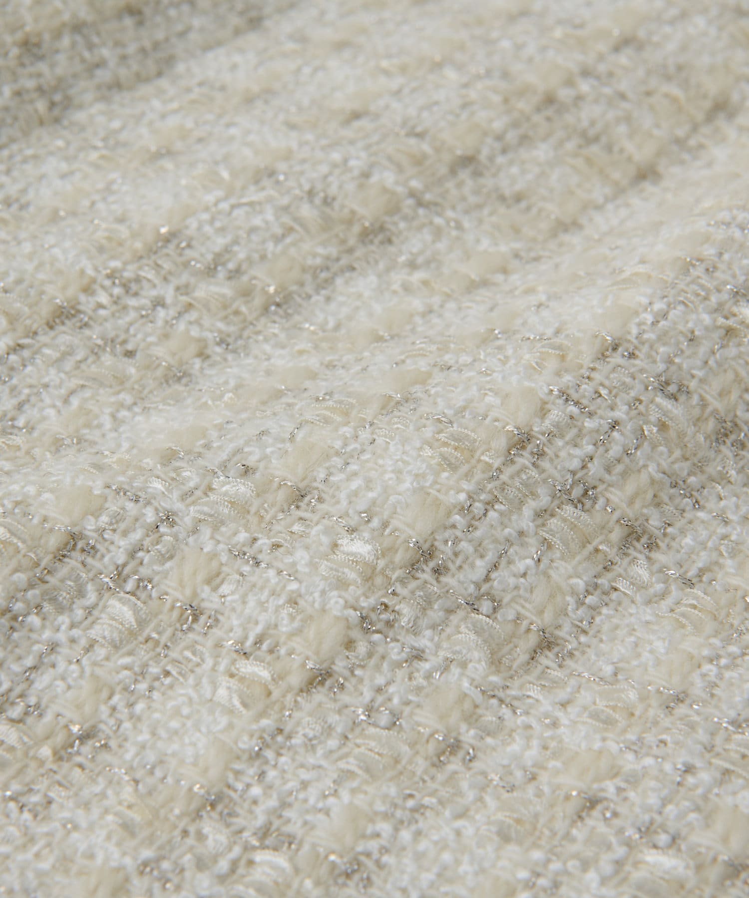 ラメとテープヤーンなど様々な意匠糸を使用したファンシーツイード素材が、