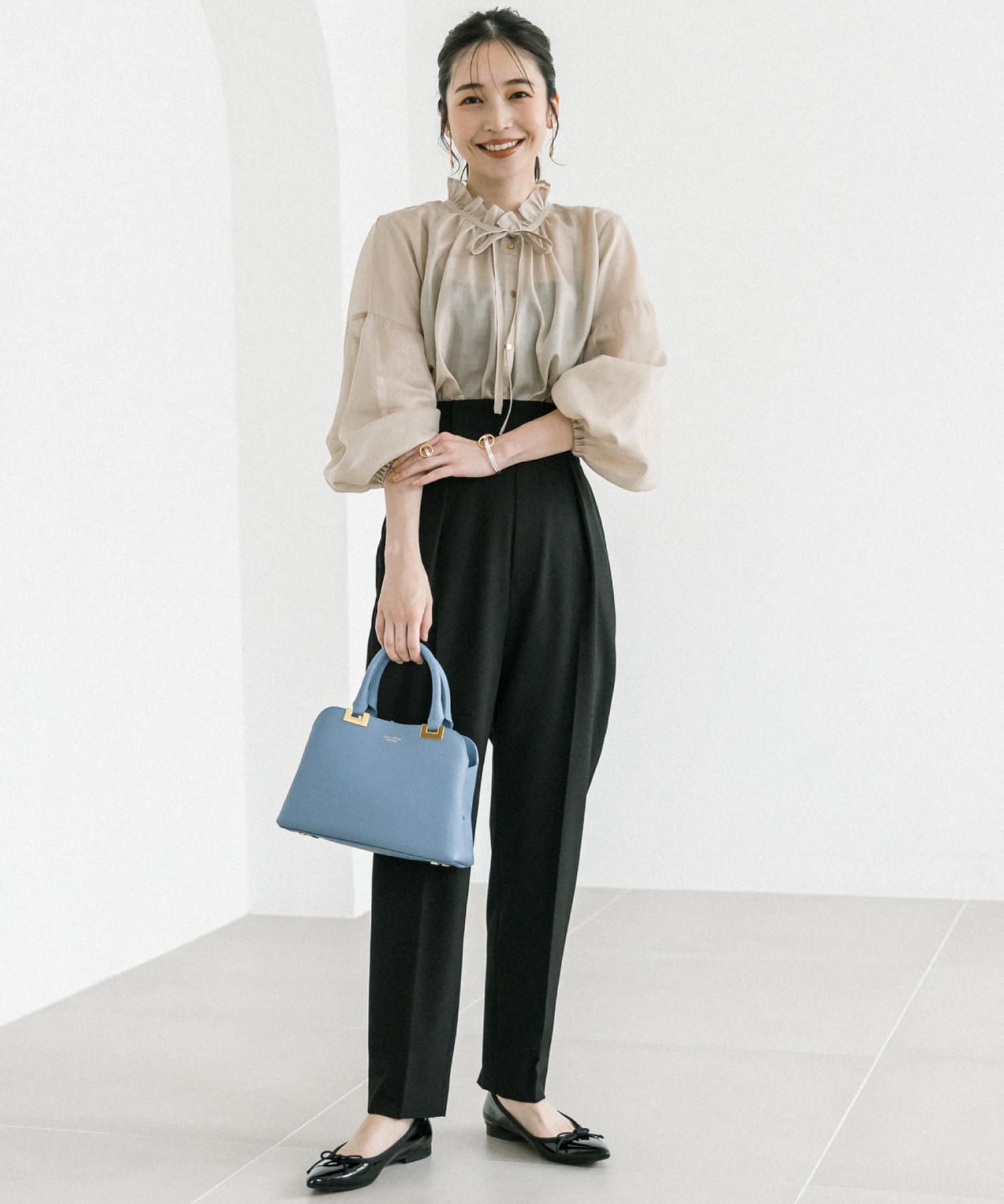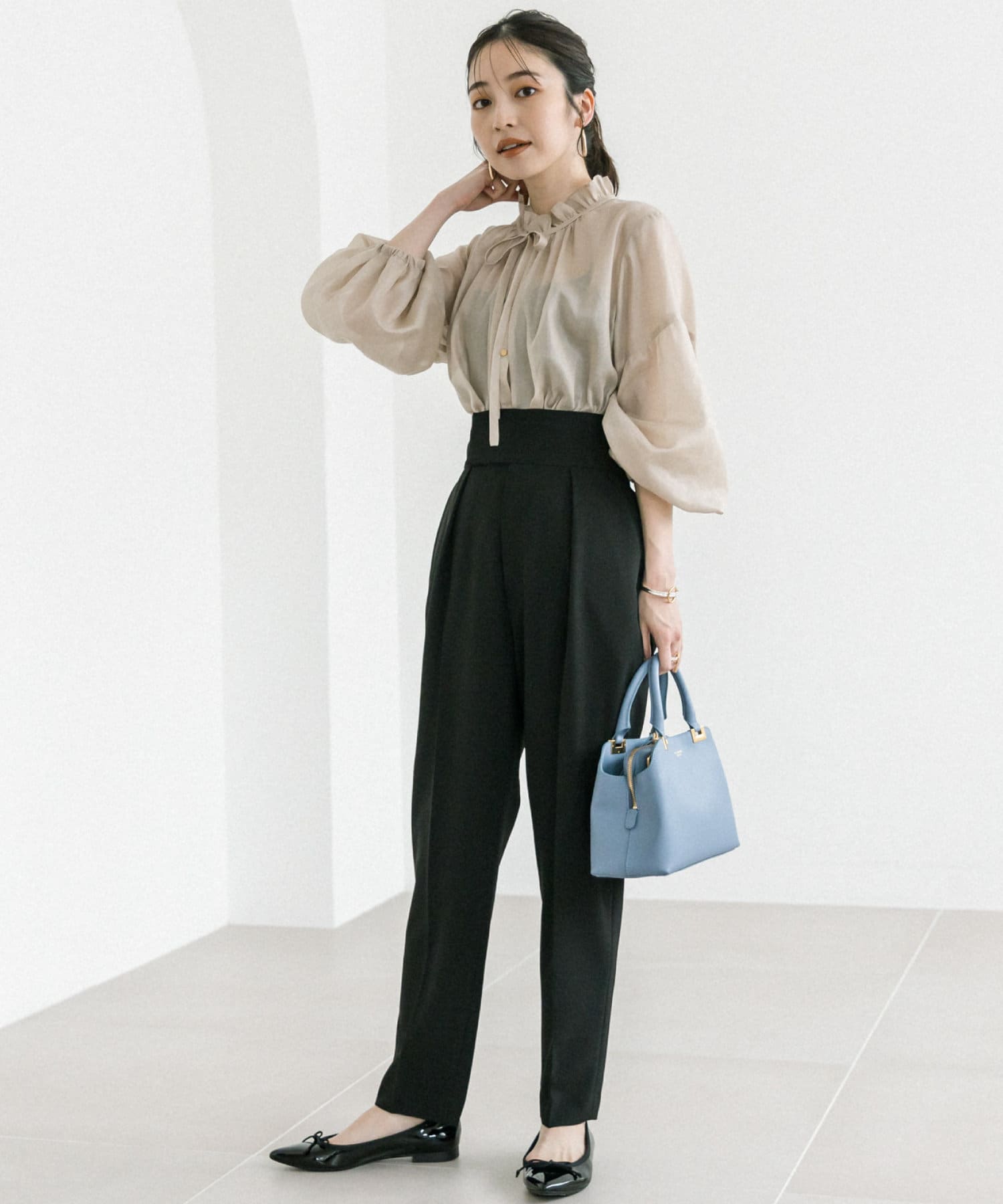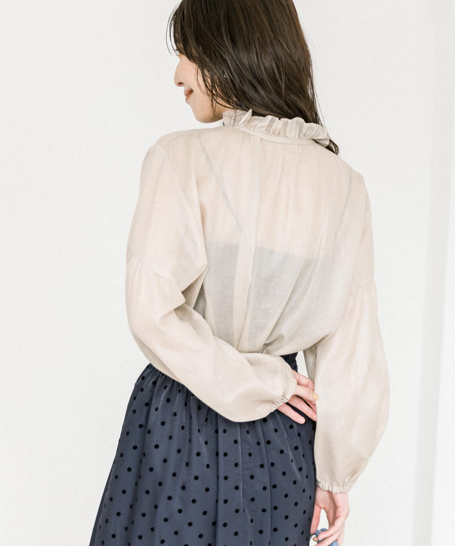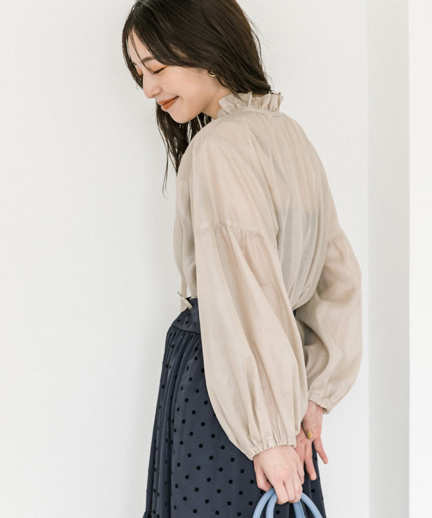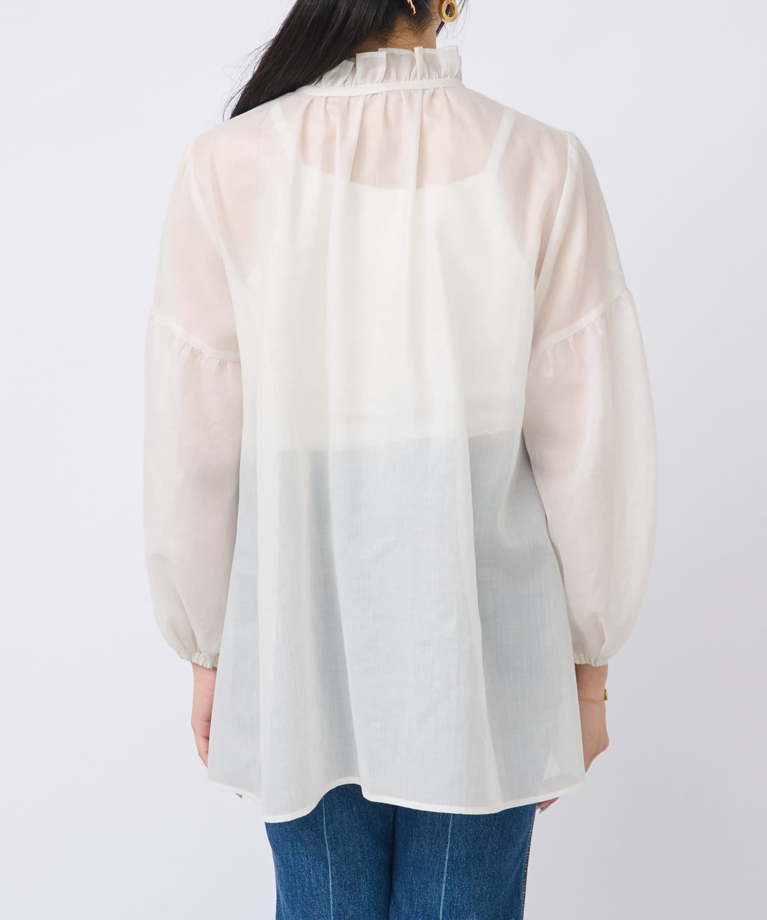 ゆったりフォルムとボリュームのあるバルーン袖は透け感があるので軽やかな印象。
