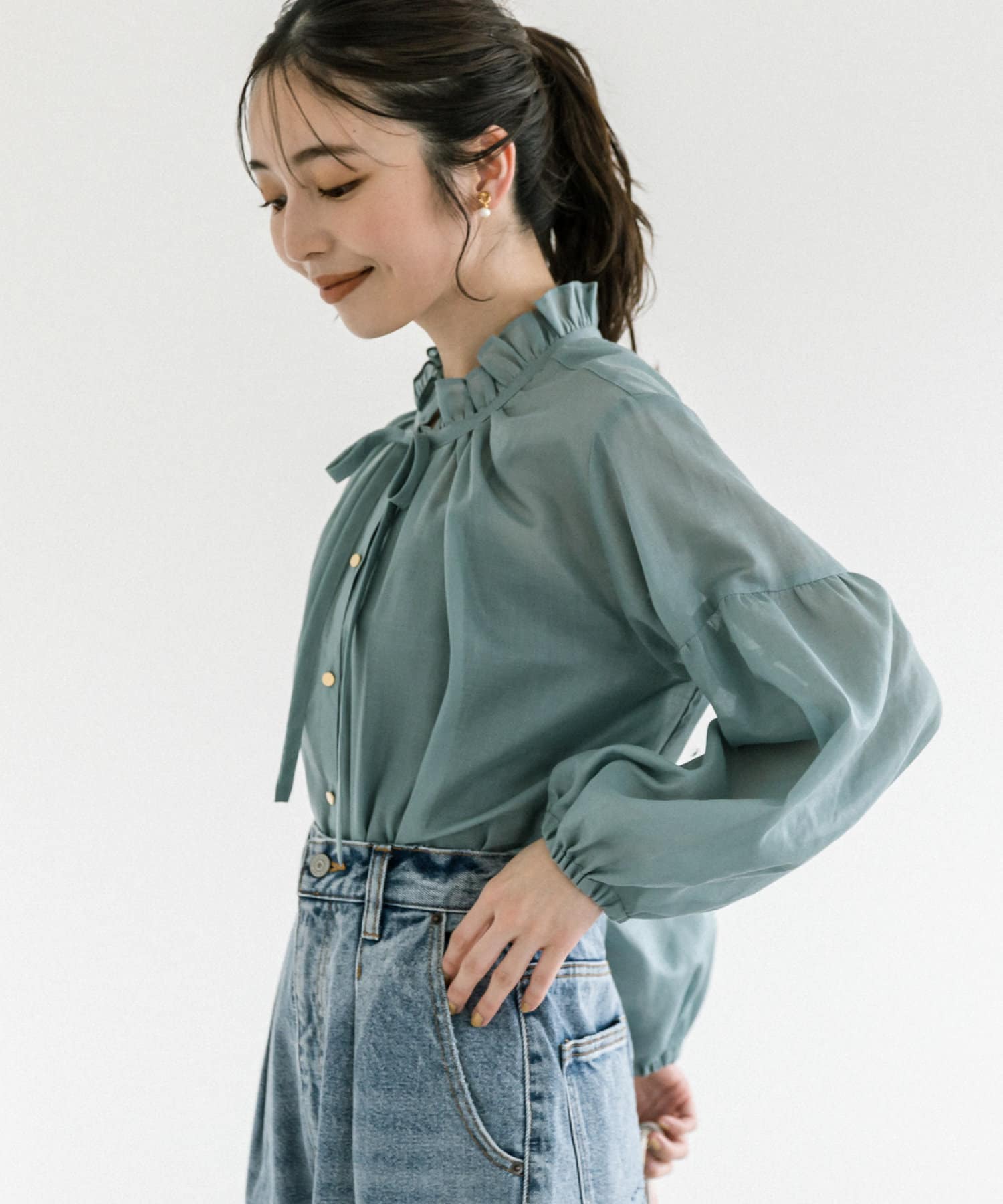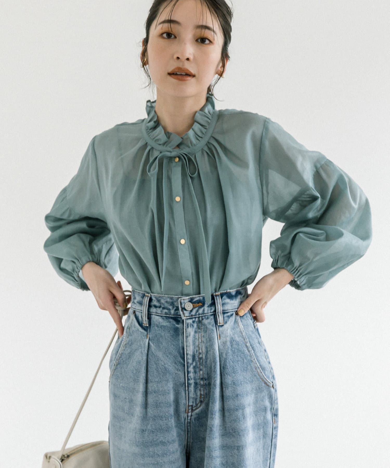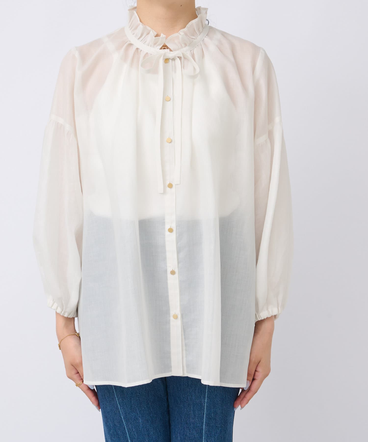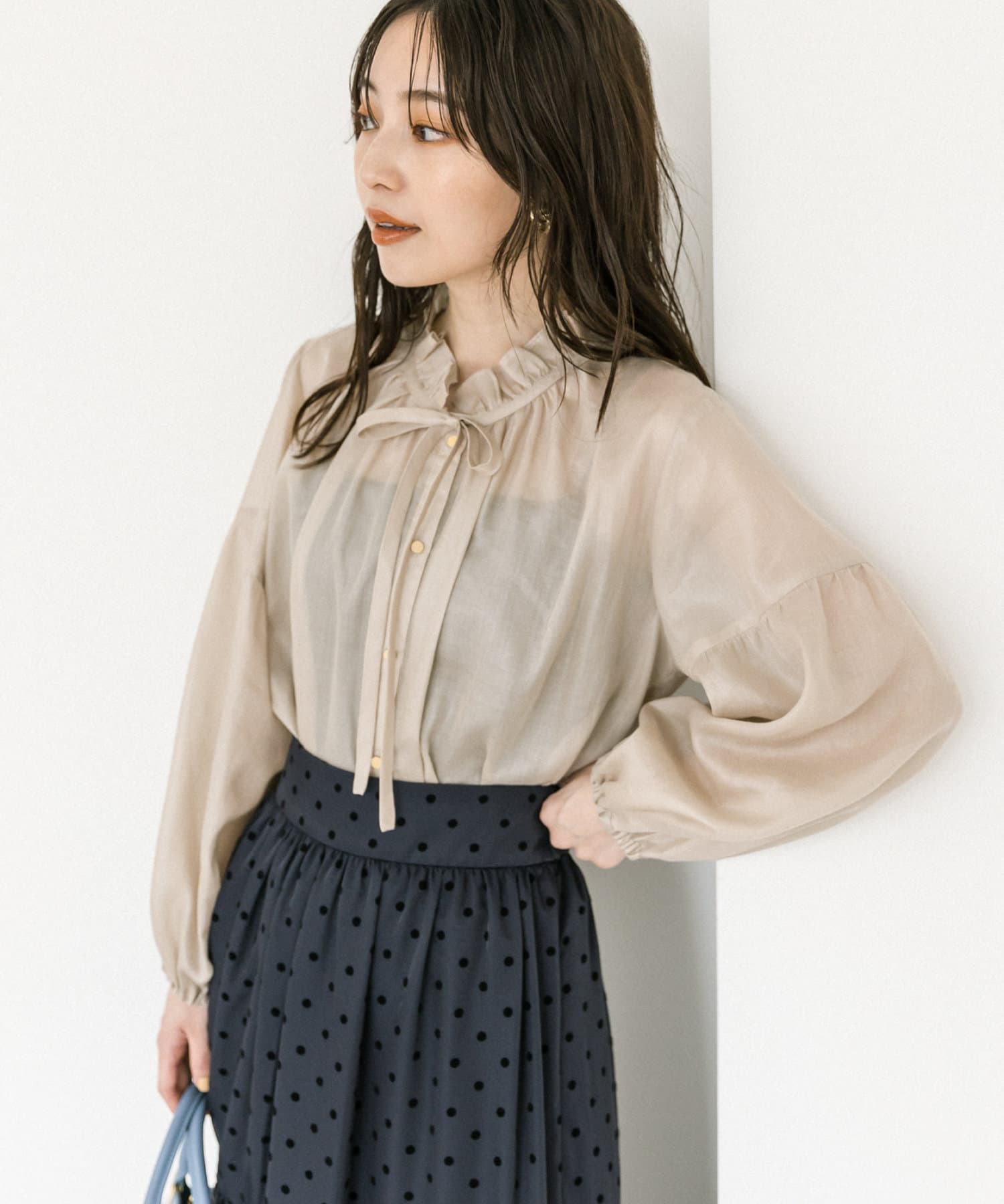 人気のフリルリボンブラウスをシアー素材にアップデート