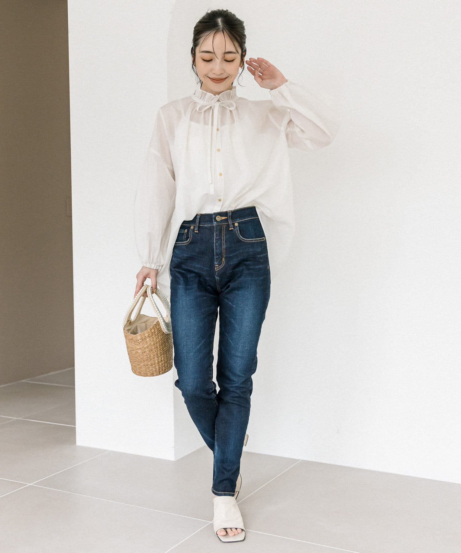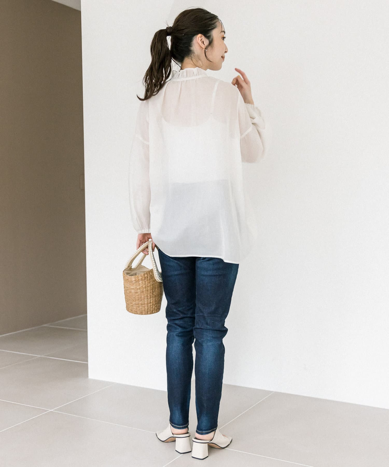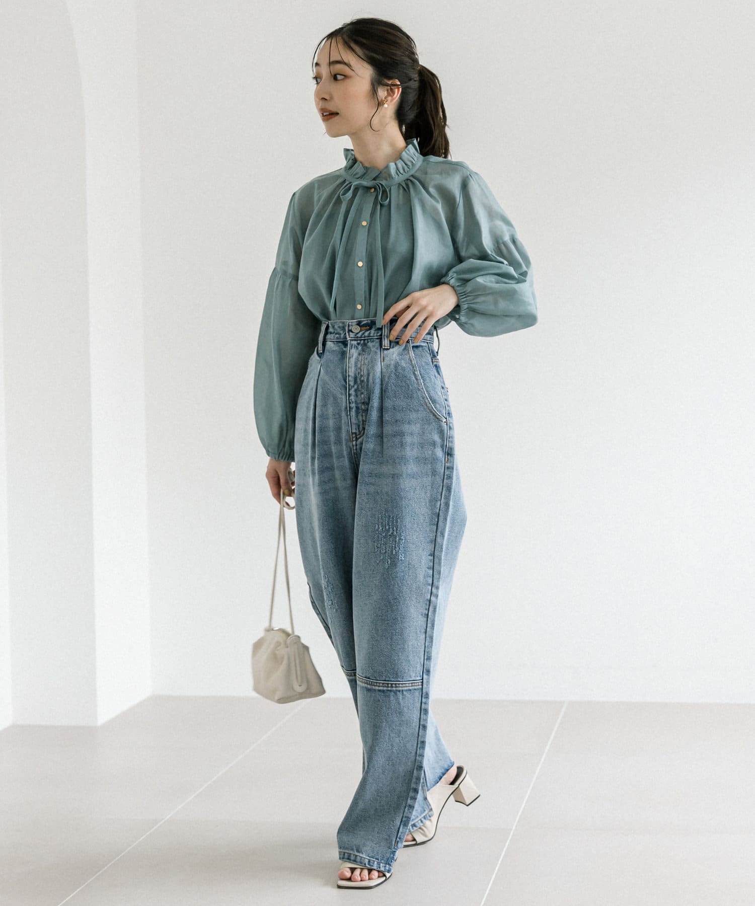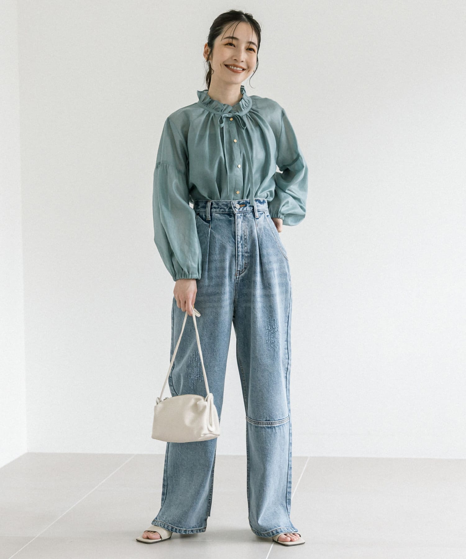 人気のフリルリボンブラウスをシアー素材にアップデート