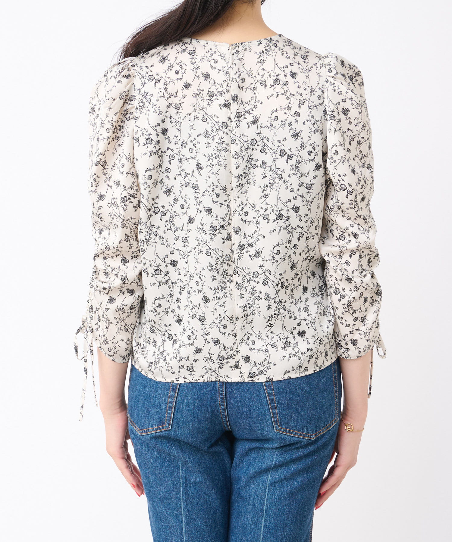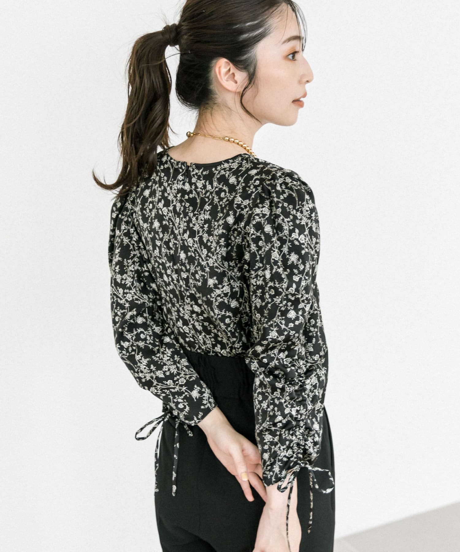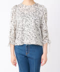 単色花柄プリントドロストスリーブブラウス
