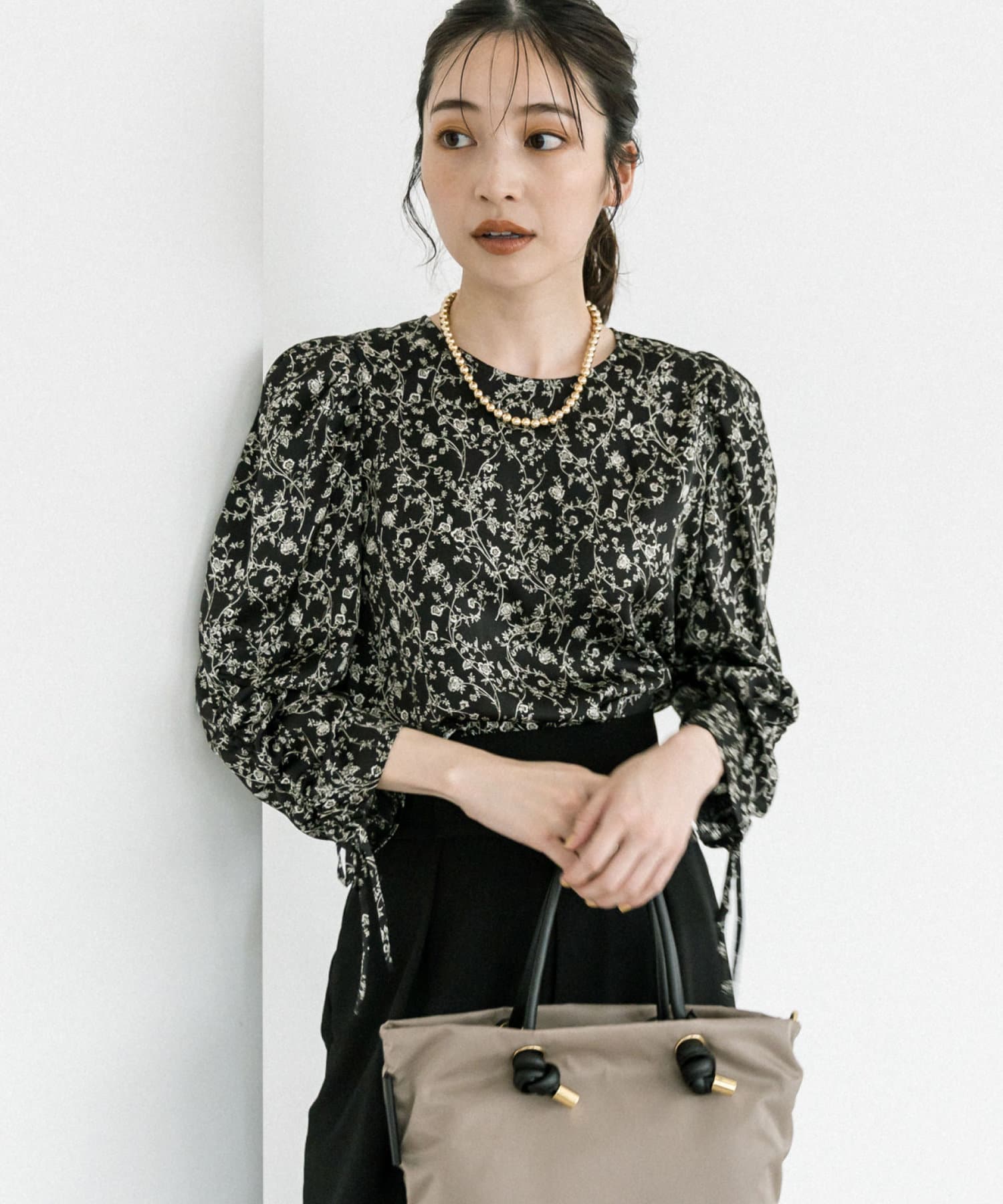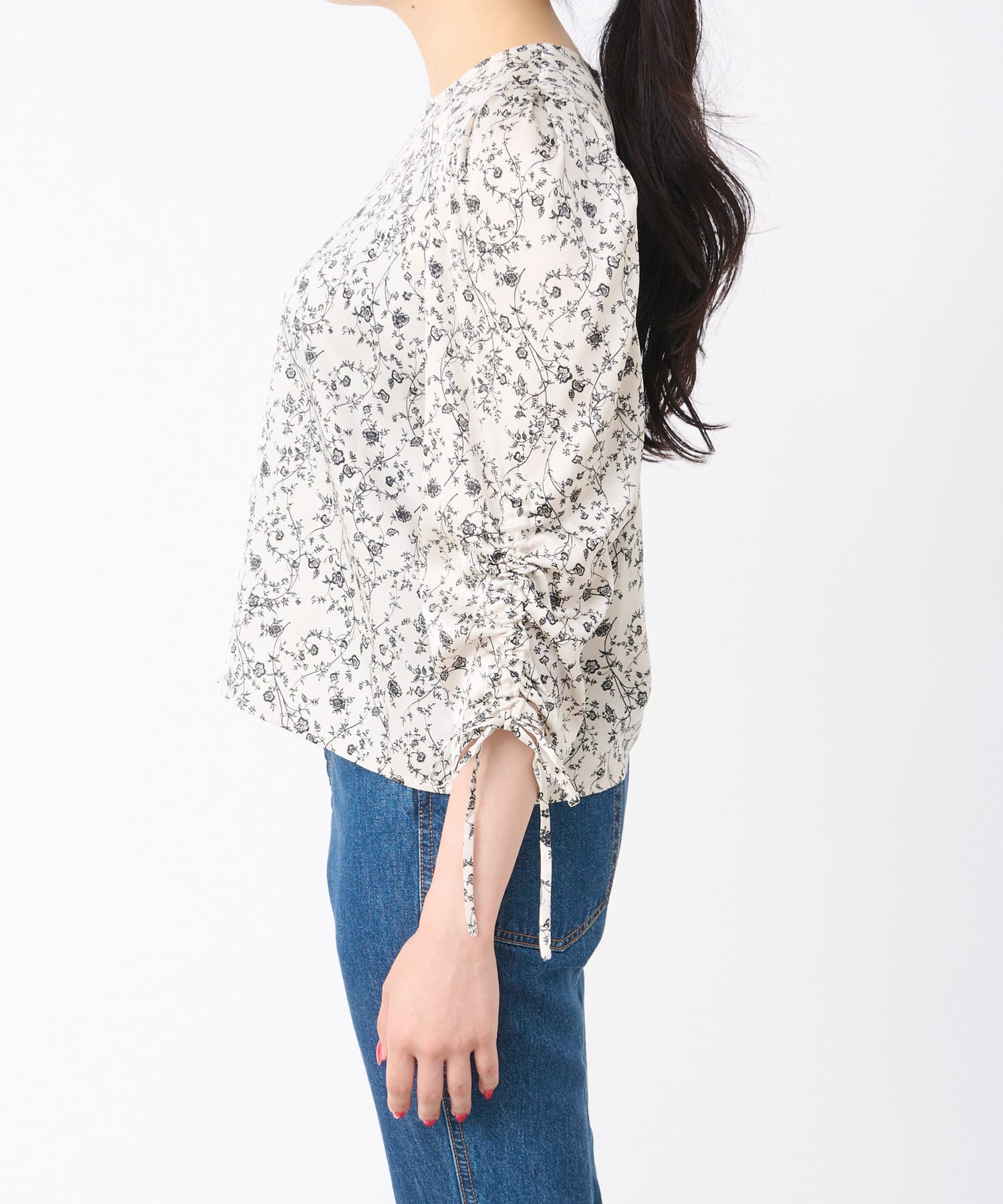 セットインのコンパクトな肩に袖にドロストディテールを施したブラウス。