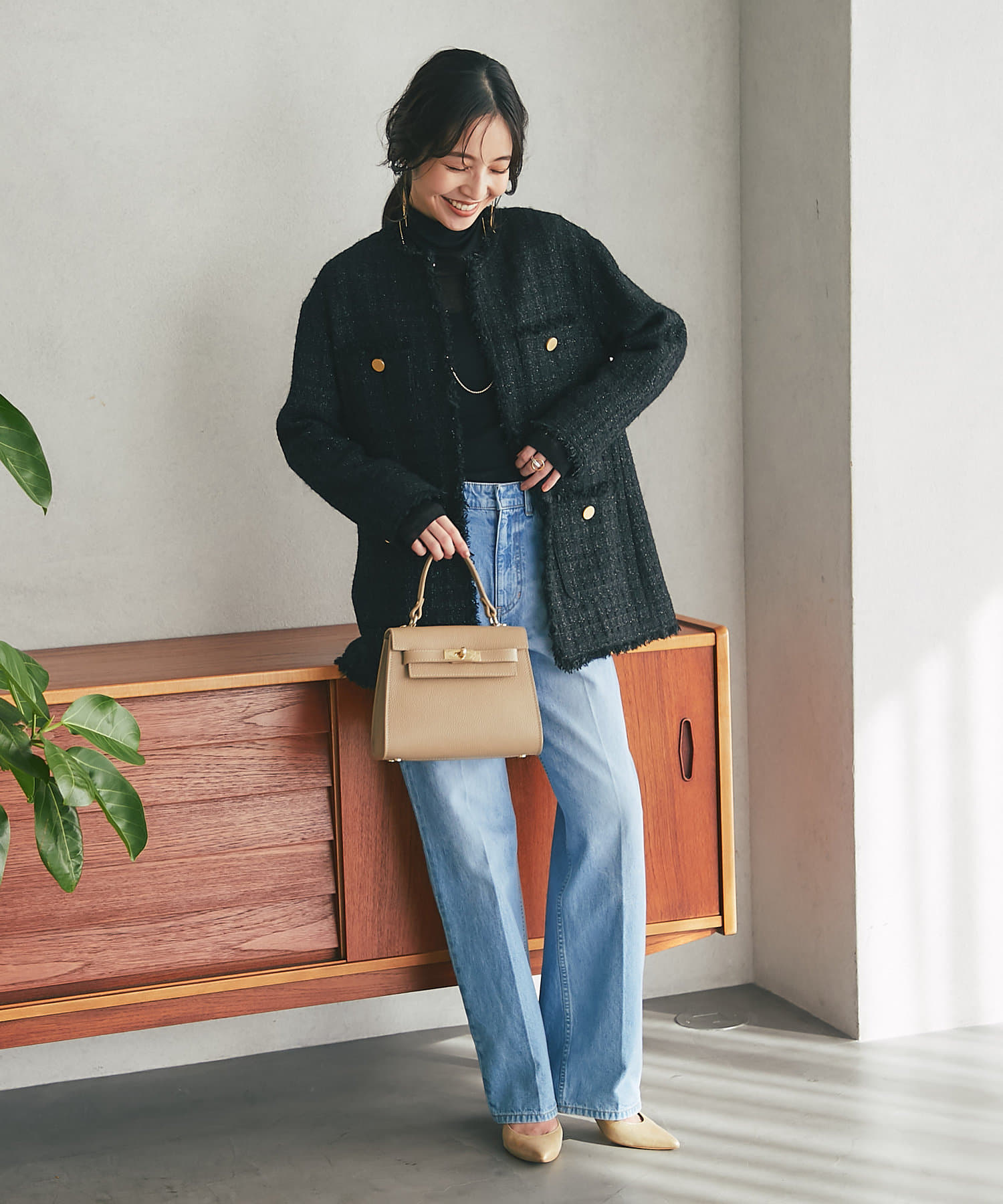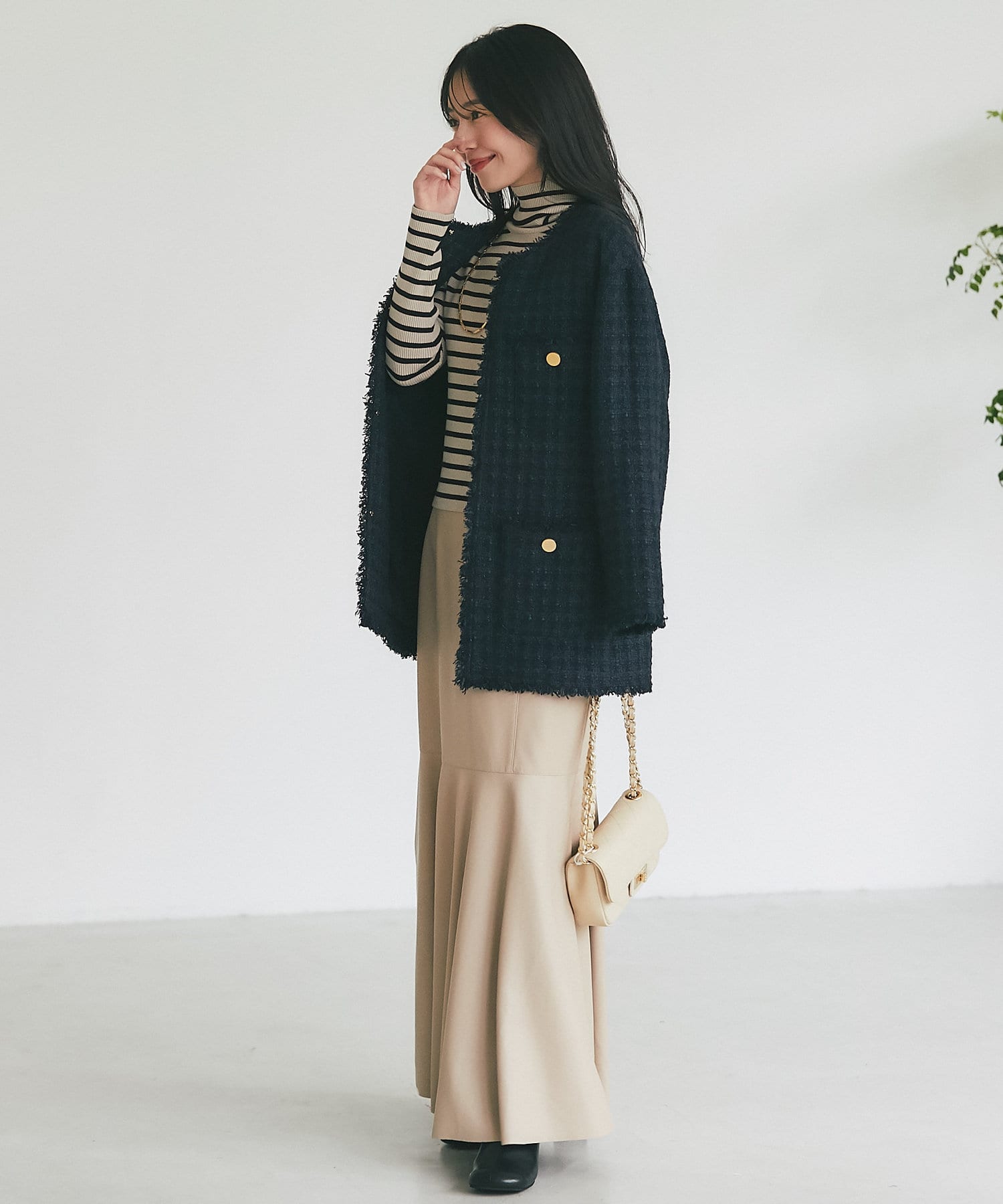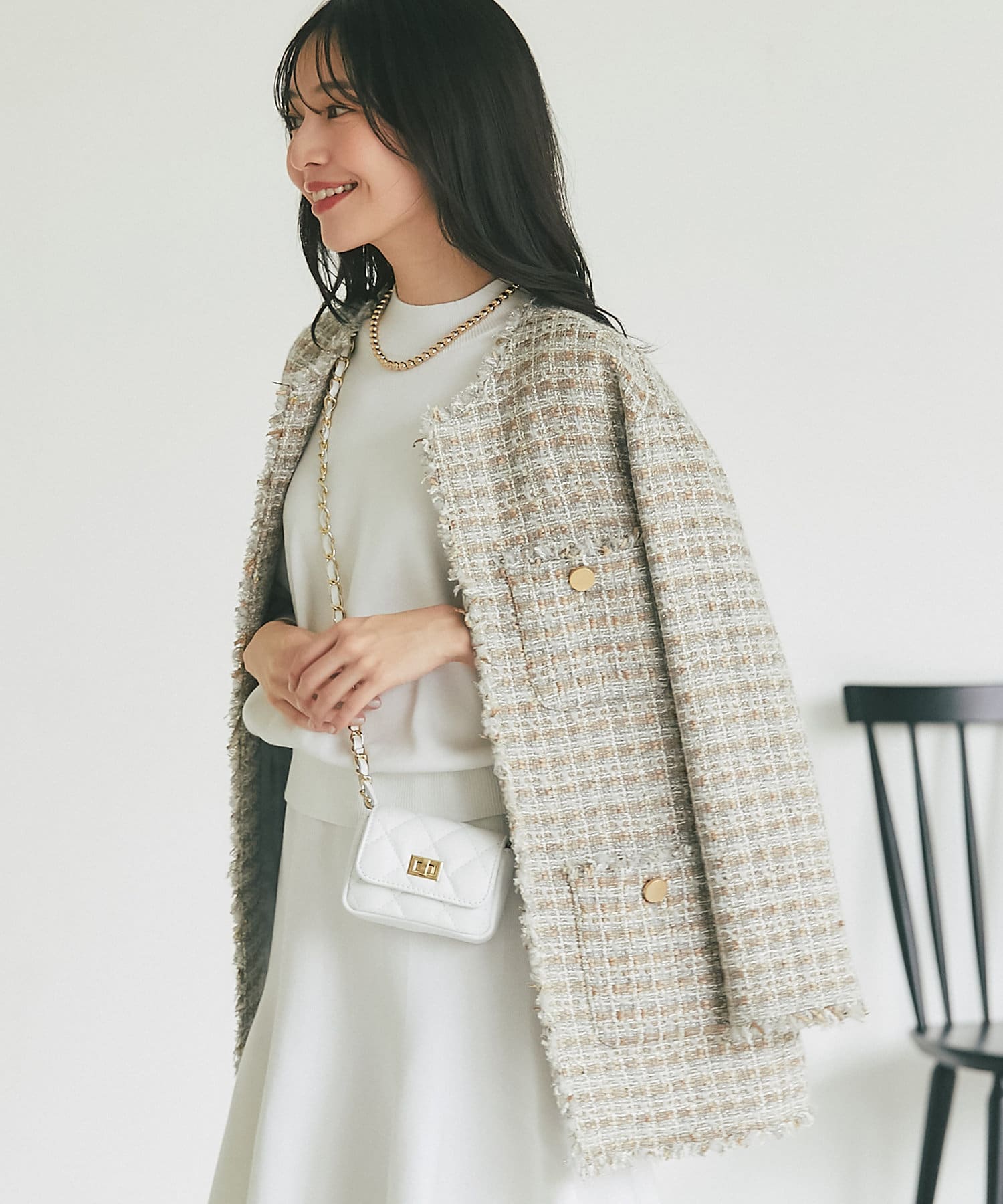 存在感のあるファンシーツイードで、スタイリングがパッと華やぐアイテム。