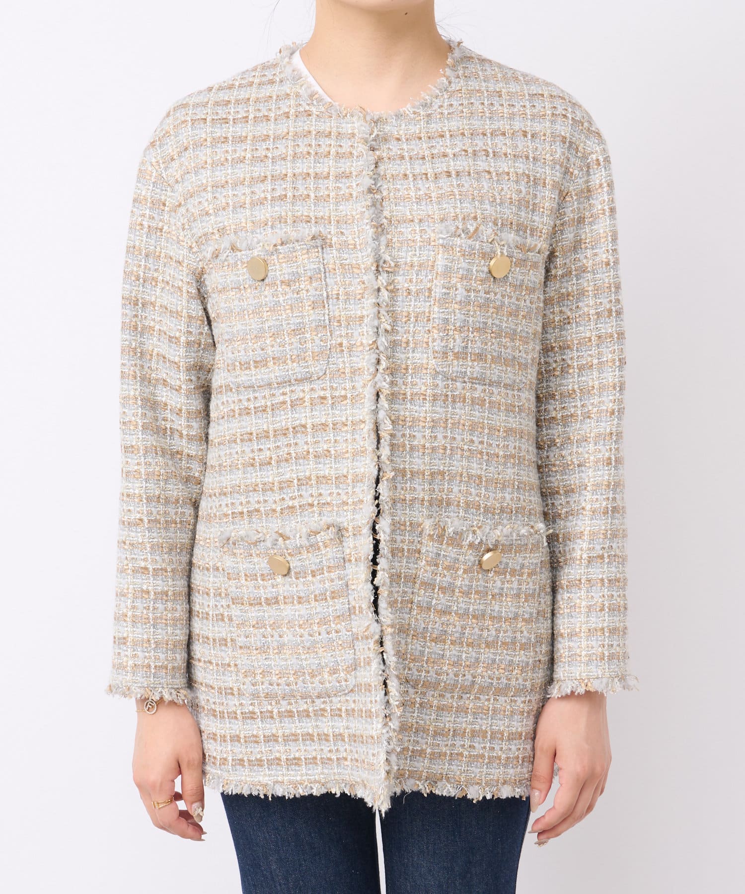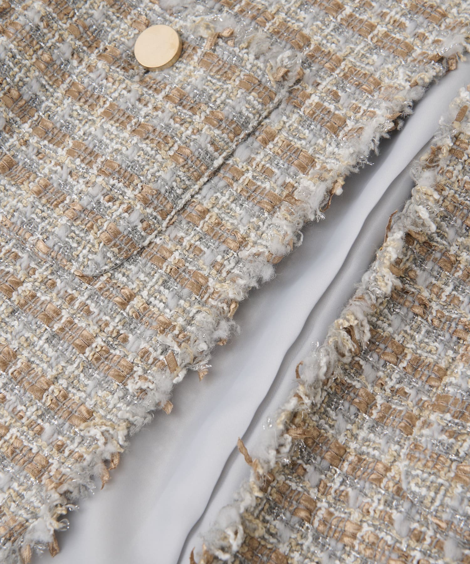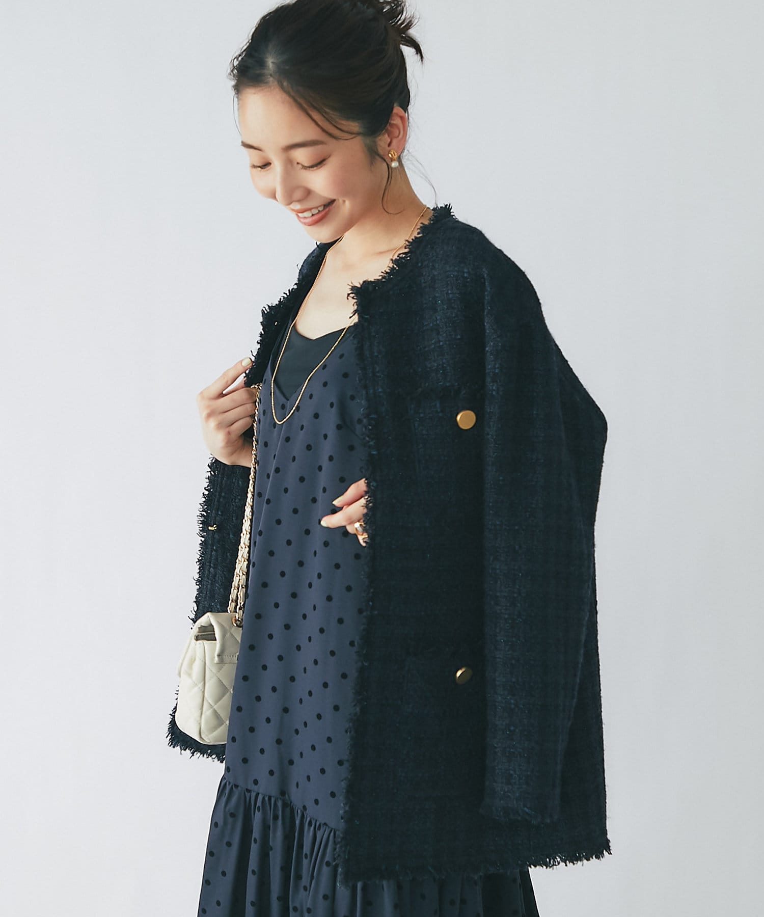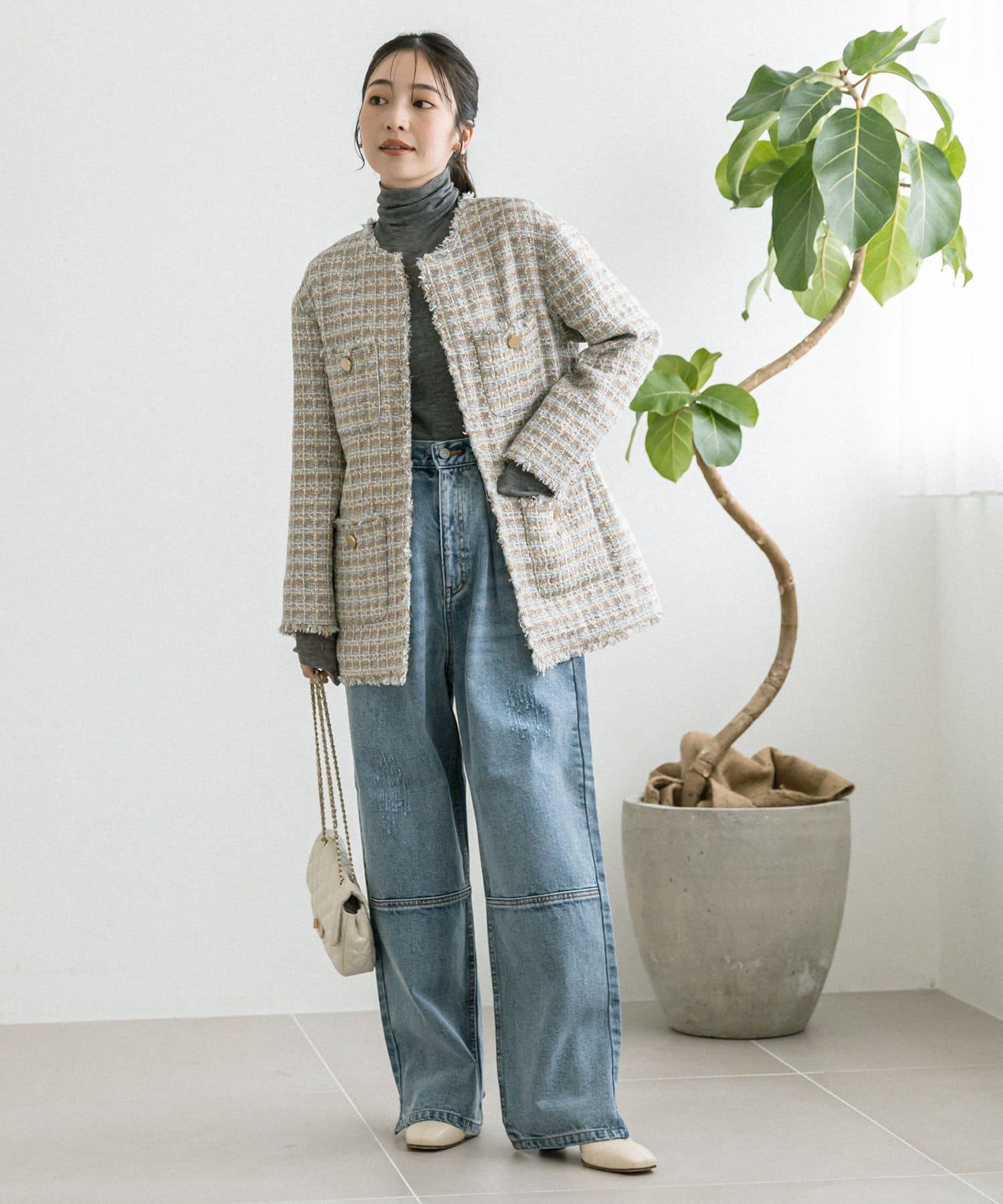 存在感のあるファンシーツイードで、スタイリングがパッと華やぐアイテム。
