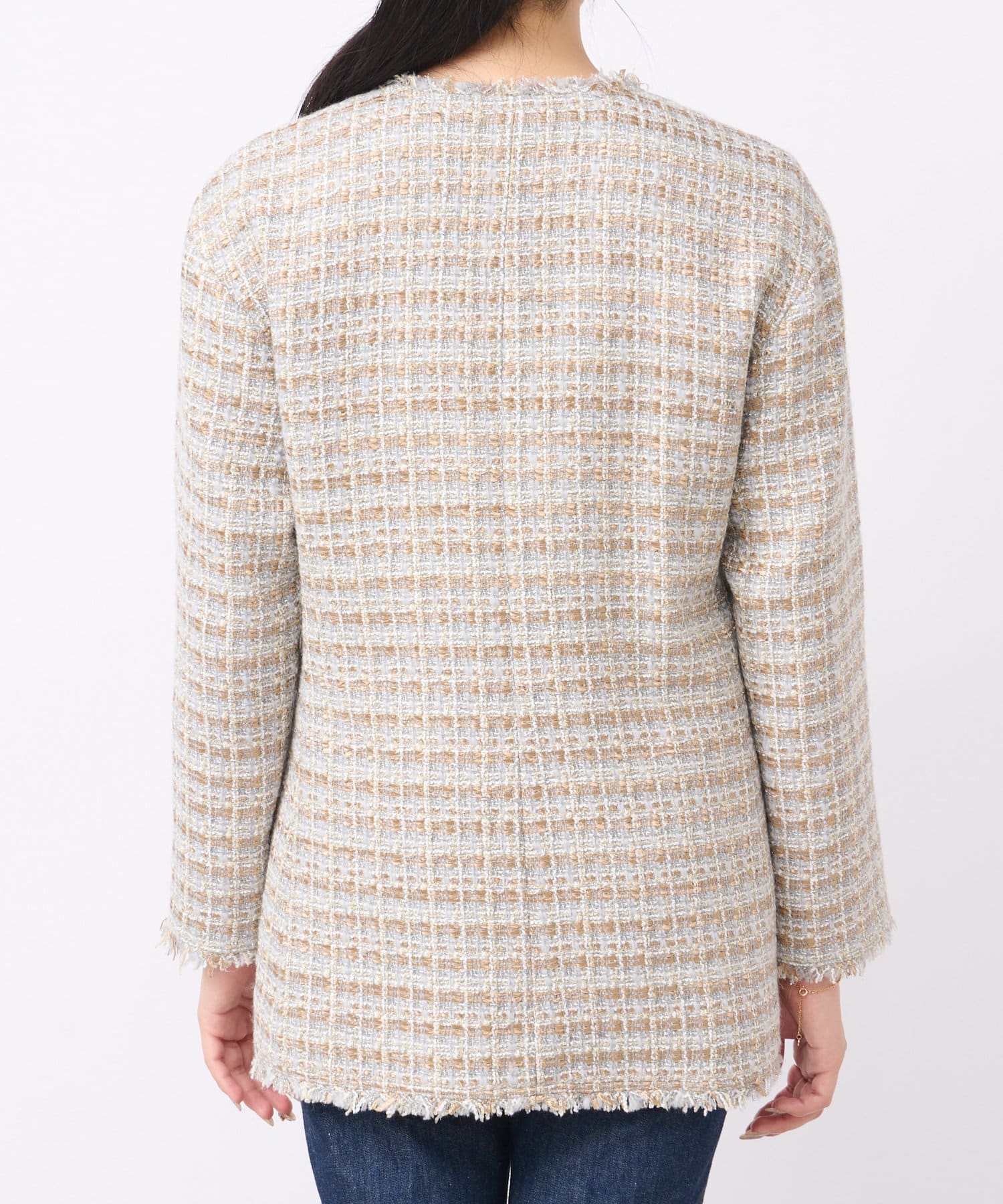 ノーカラーとフリンジデザインがこなれ感を演出し、カジュアルにも着やすい一枚。