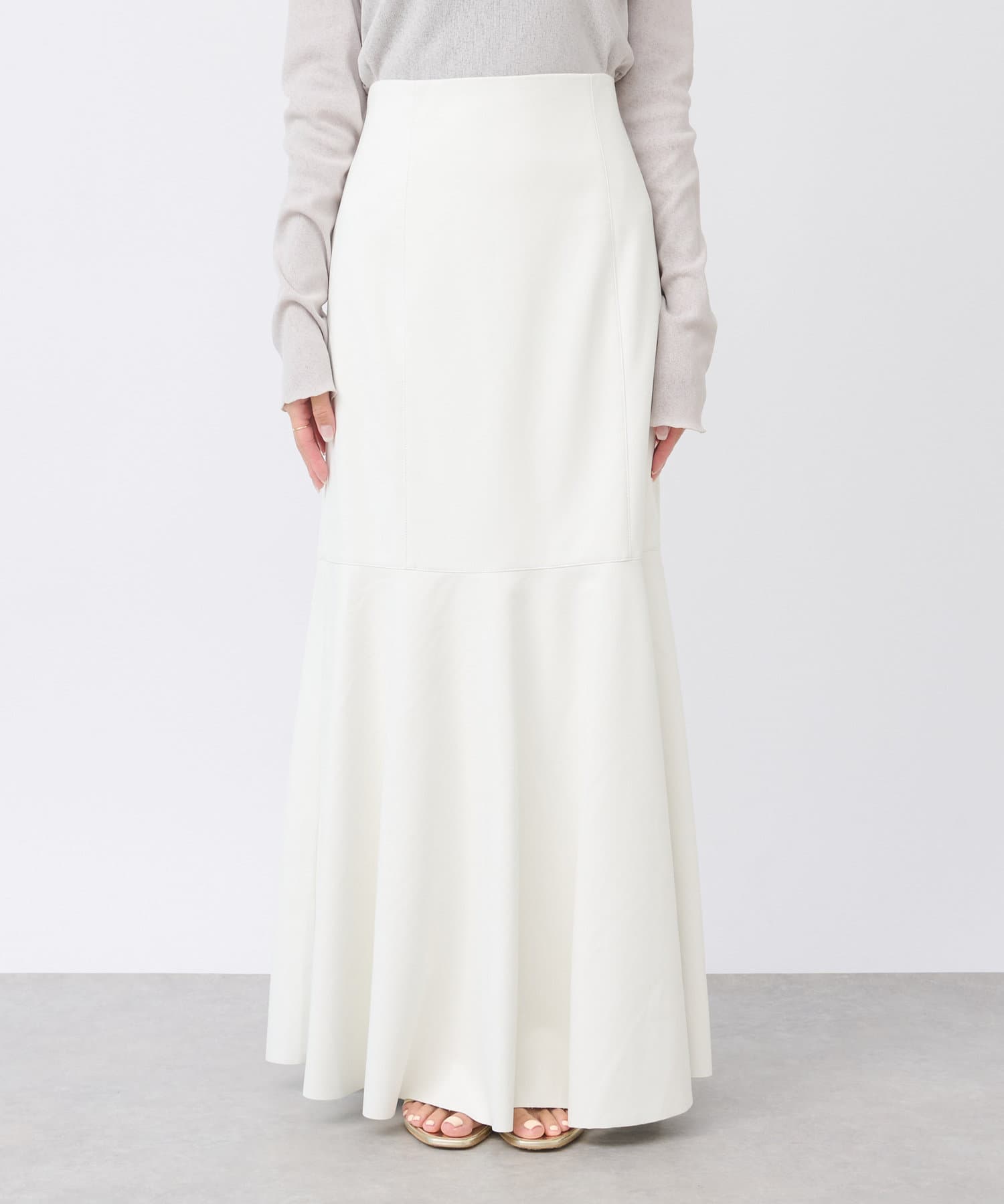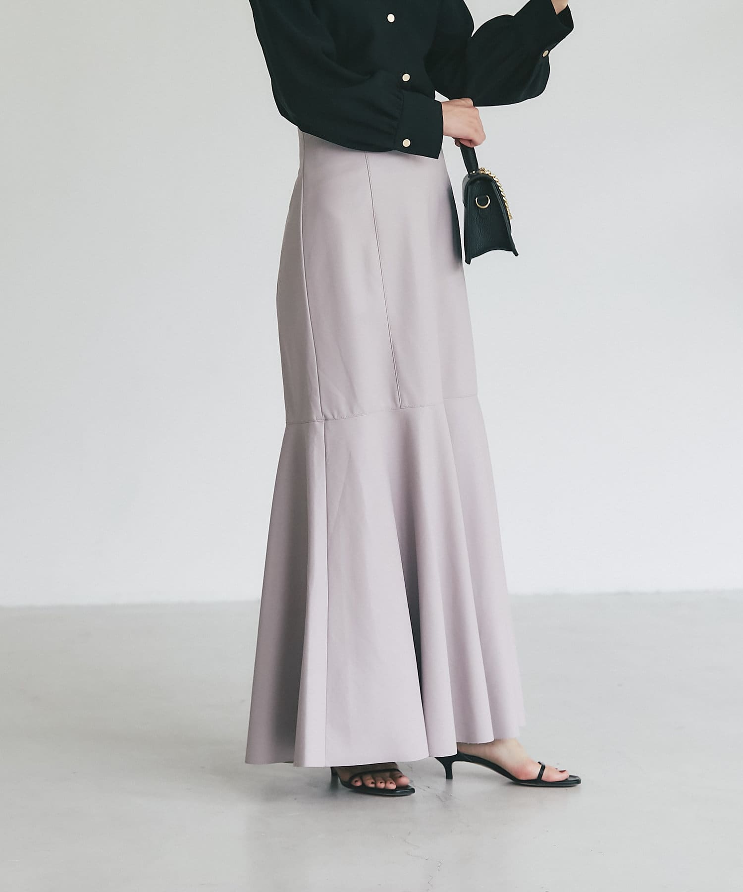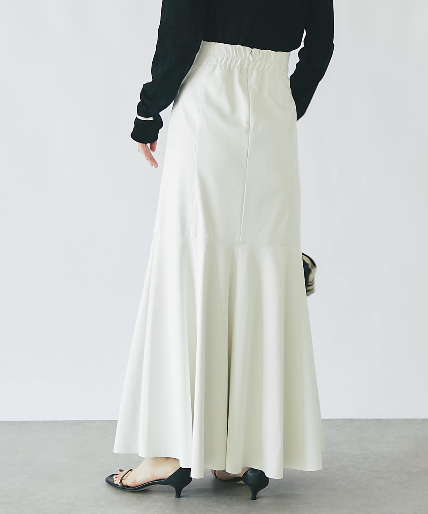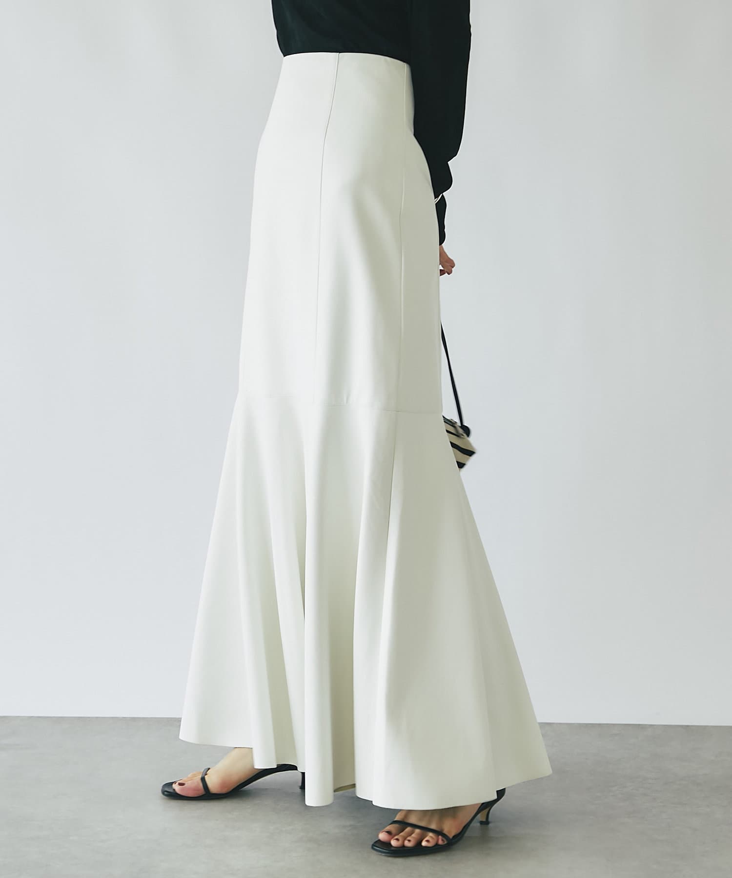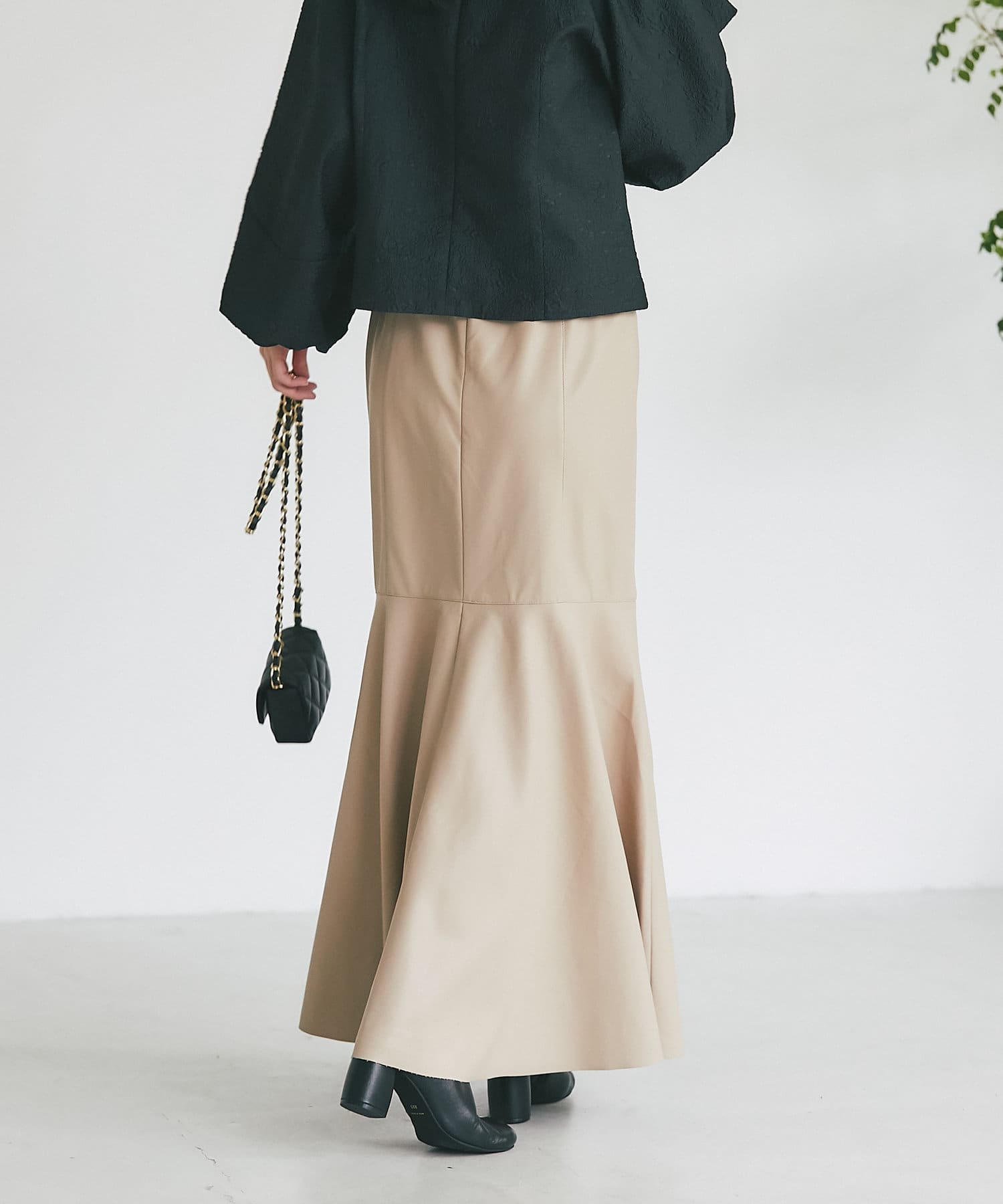 腰回りはすっきりとタイトに、高めの位置からフレアで広がる大人のマーメイドスカート。