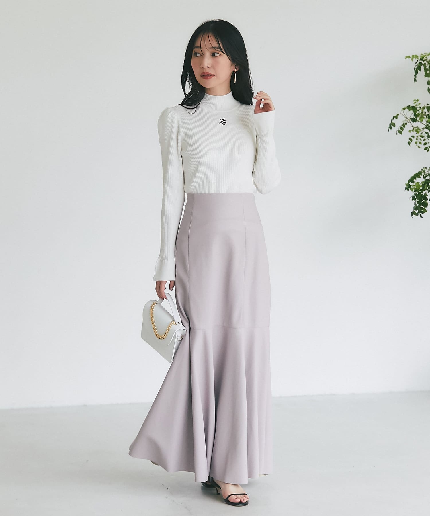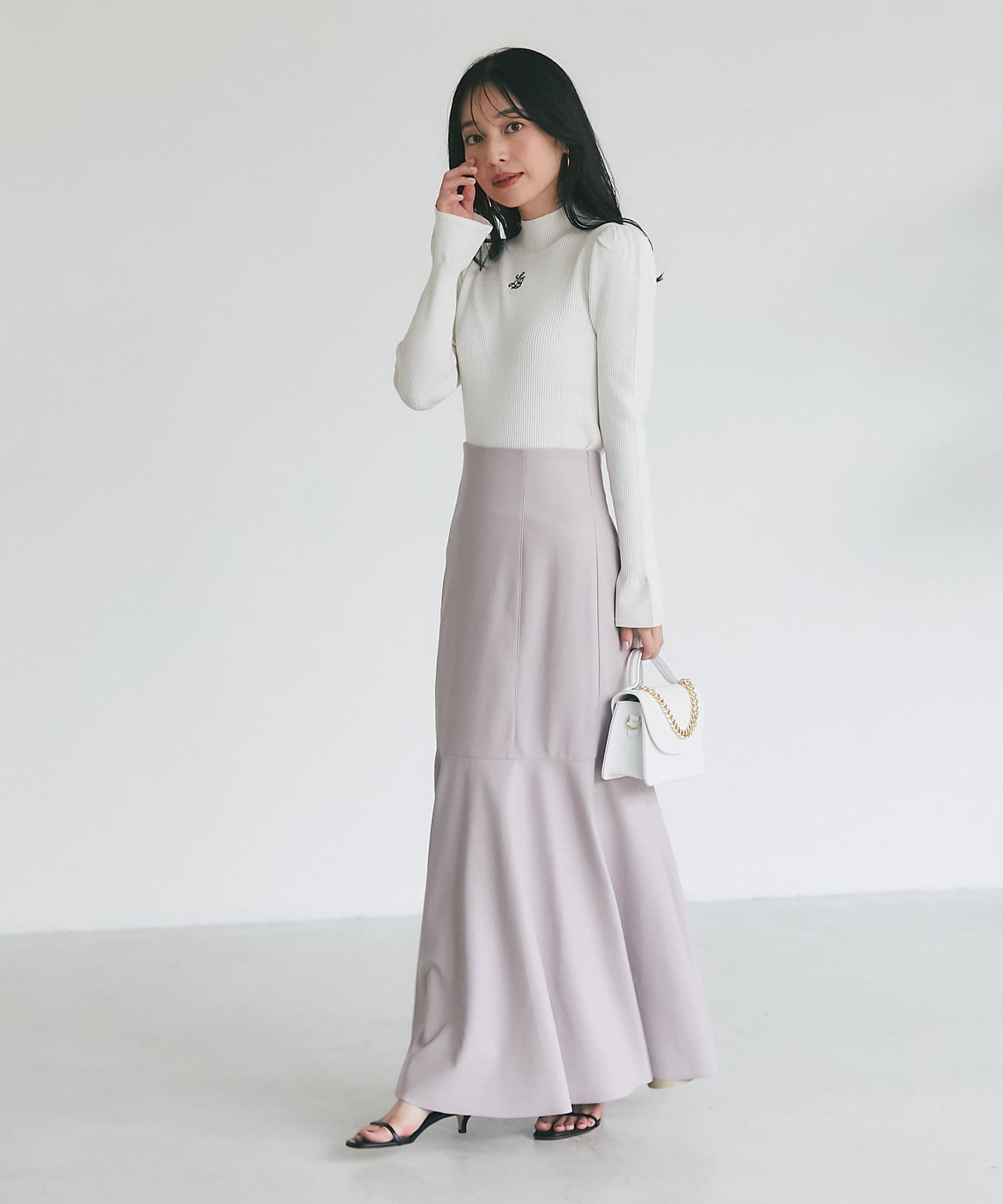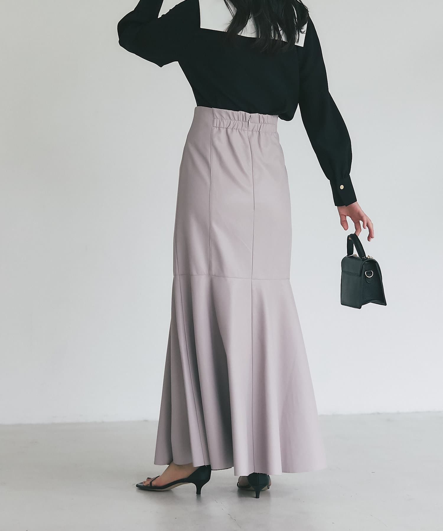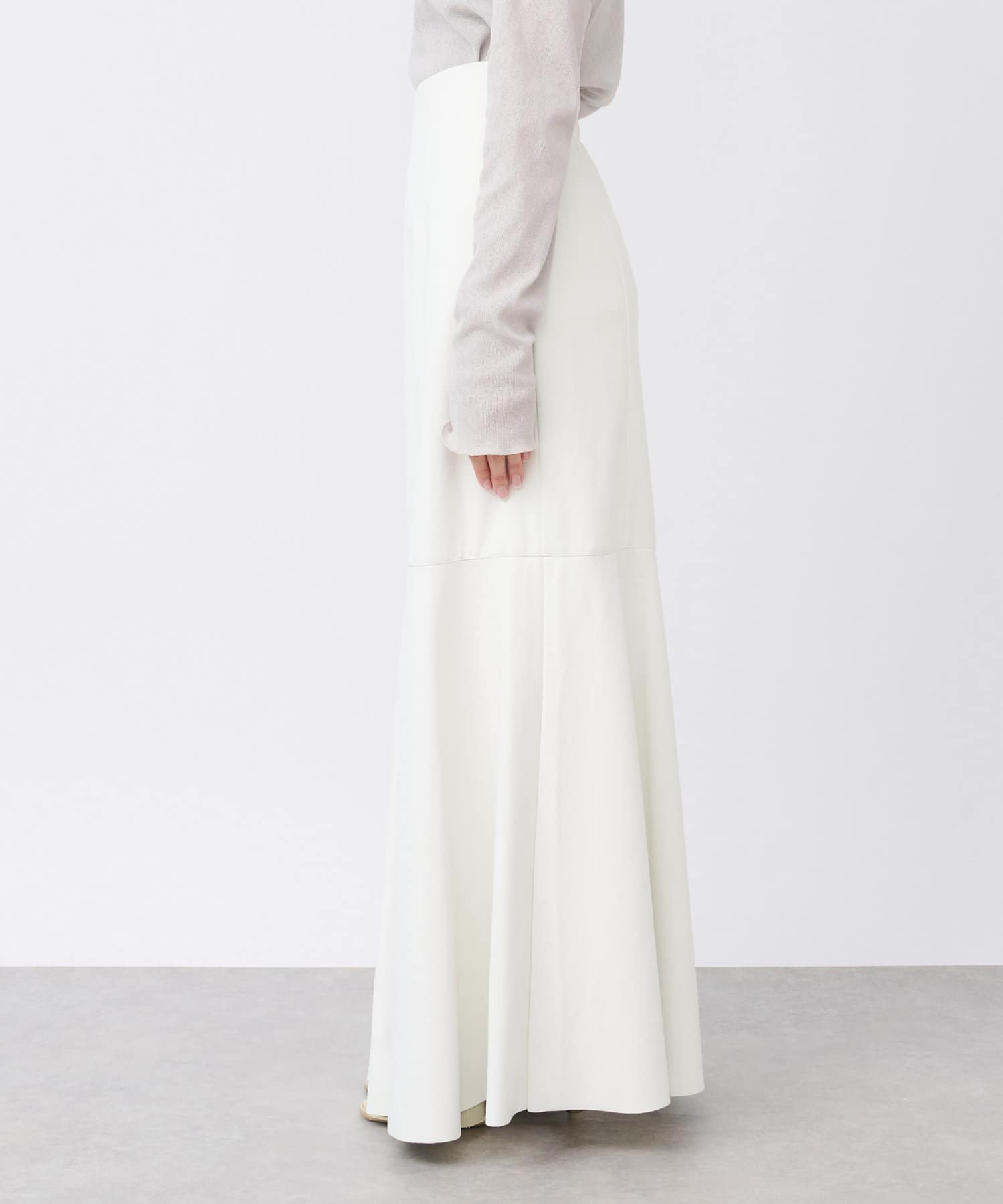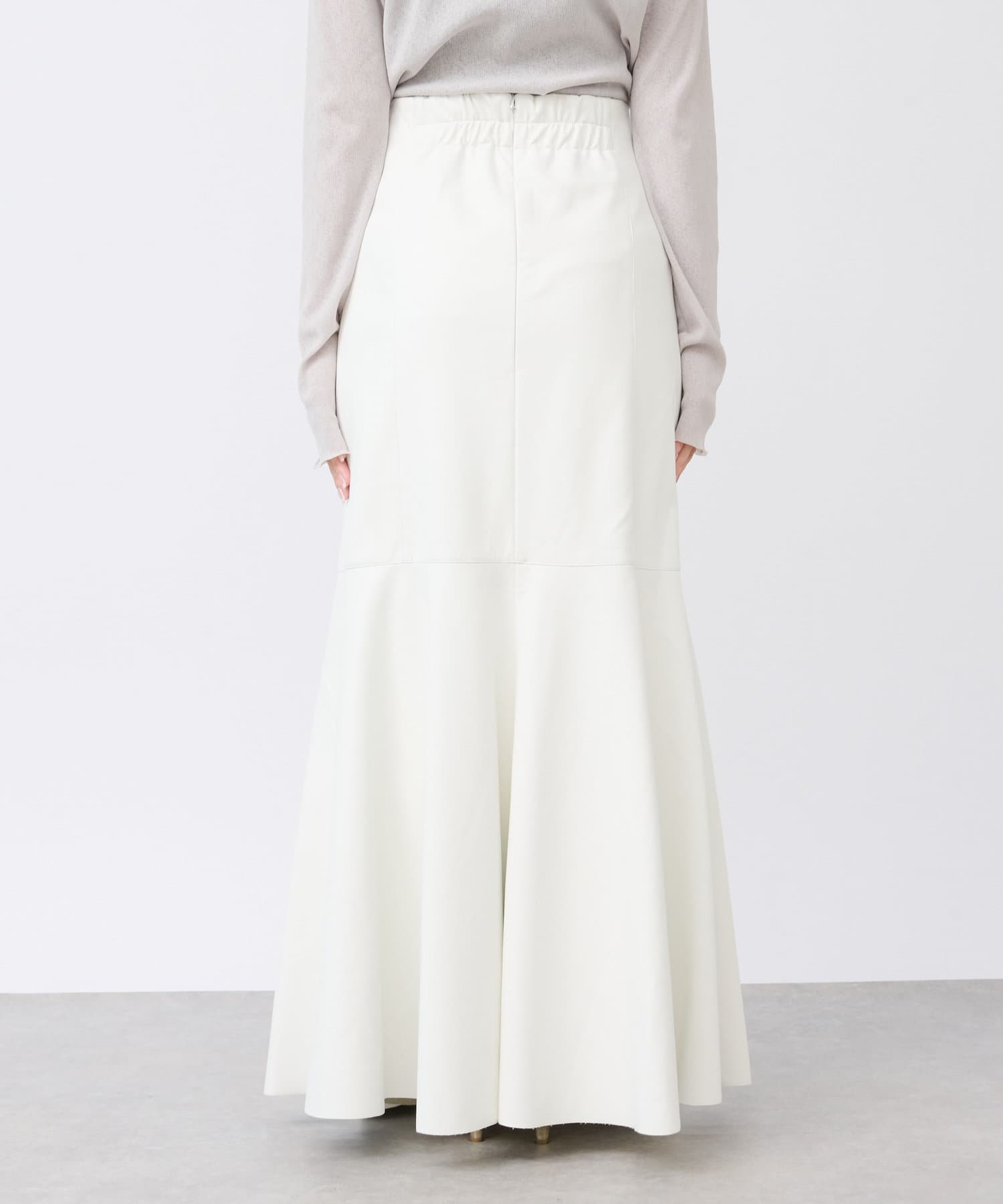 腰回りはすっきりとタイトに、高めの位置からフレアで広がる大人のマーメイドスカート。