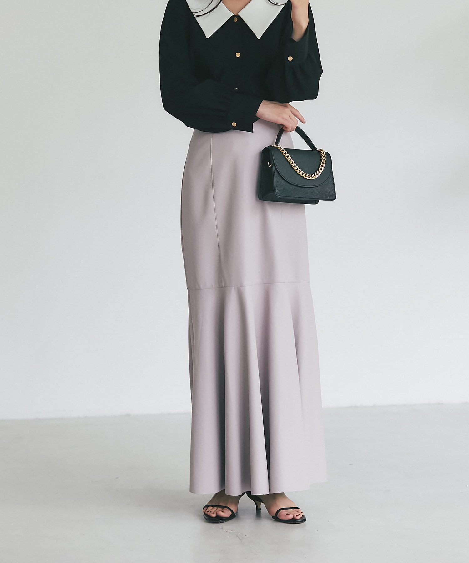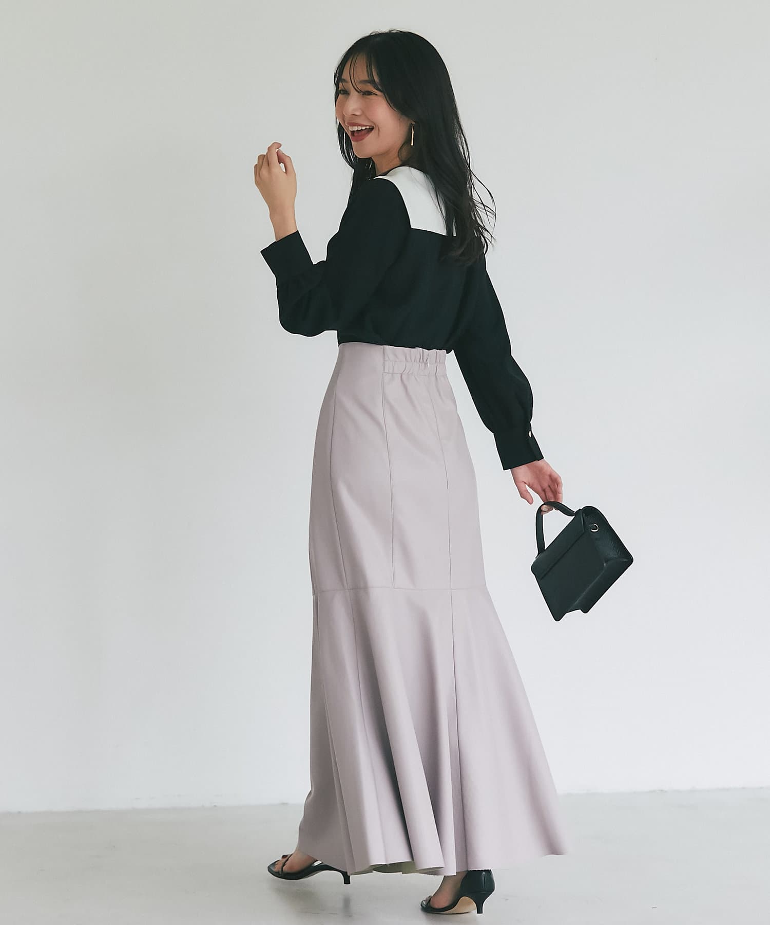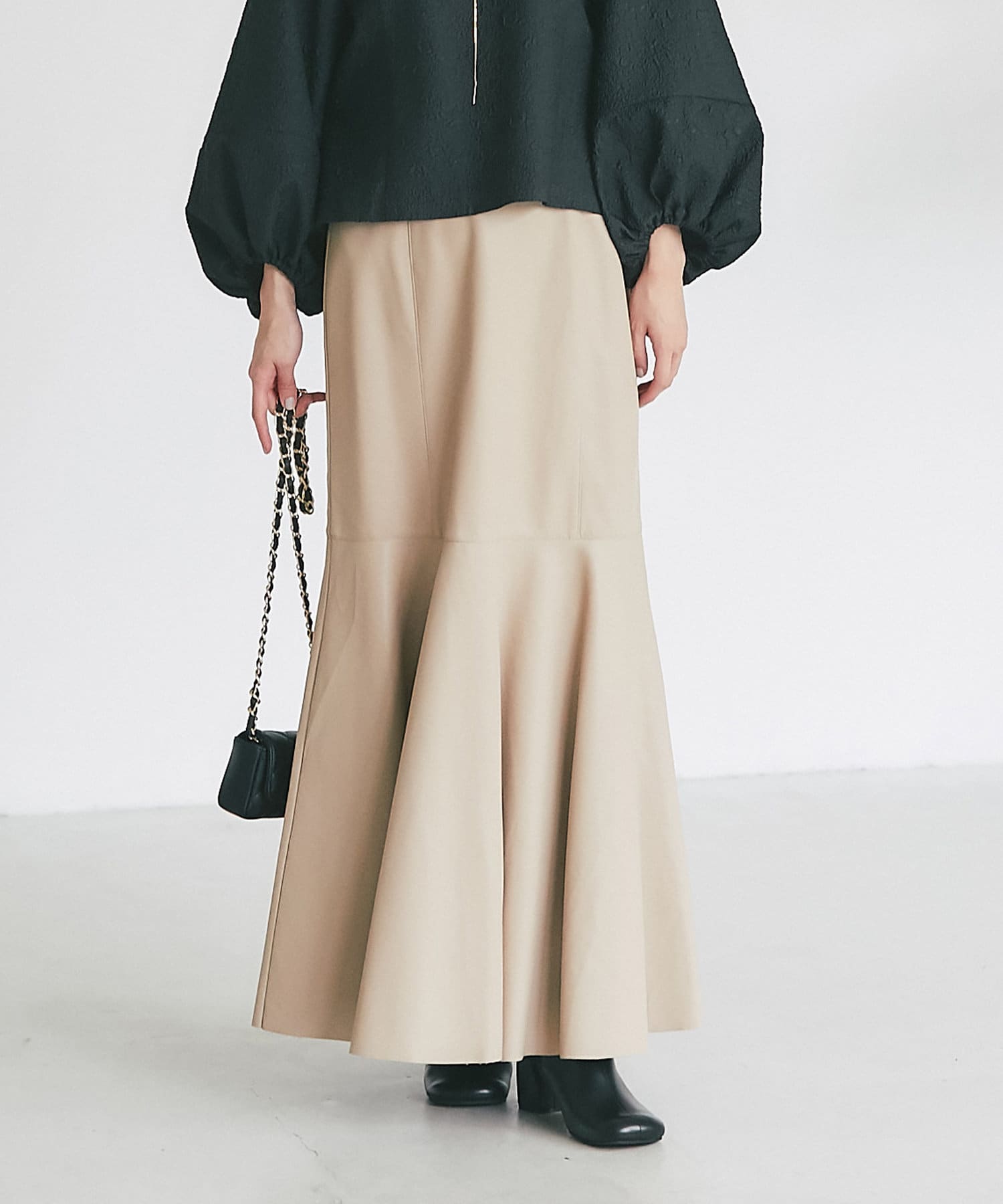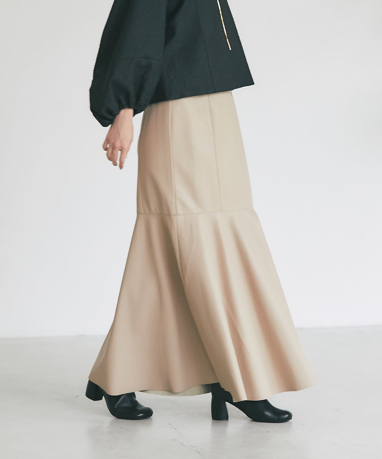 腰回りはすっきりとタイトに、高めの位置からフレアで広がる大人のマーメイドスカート。