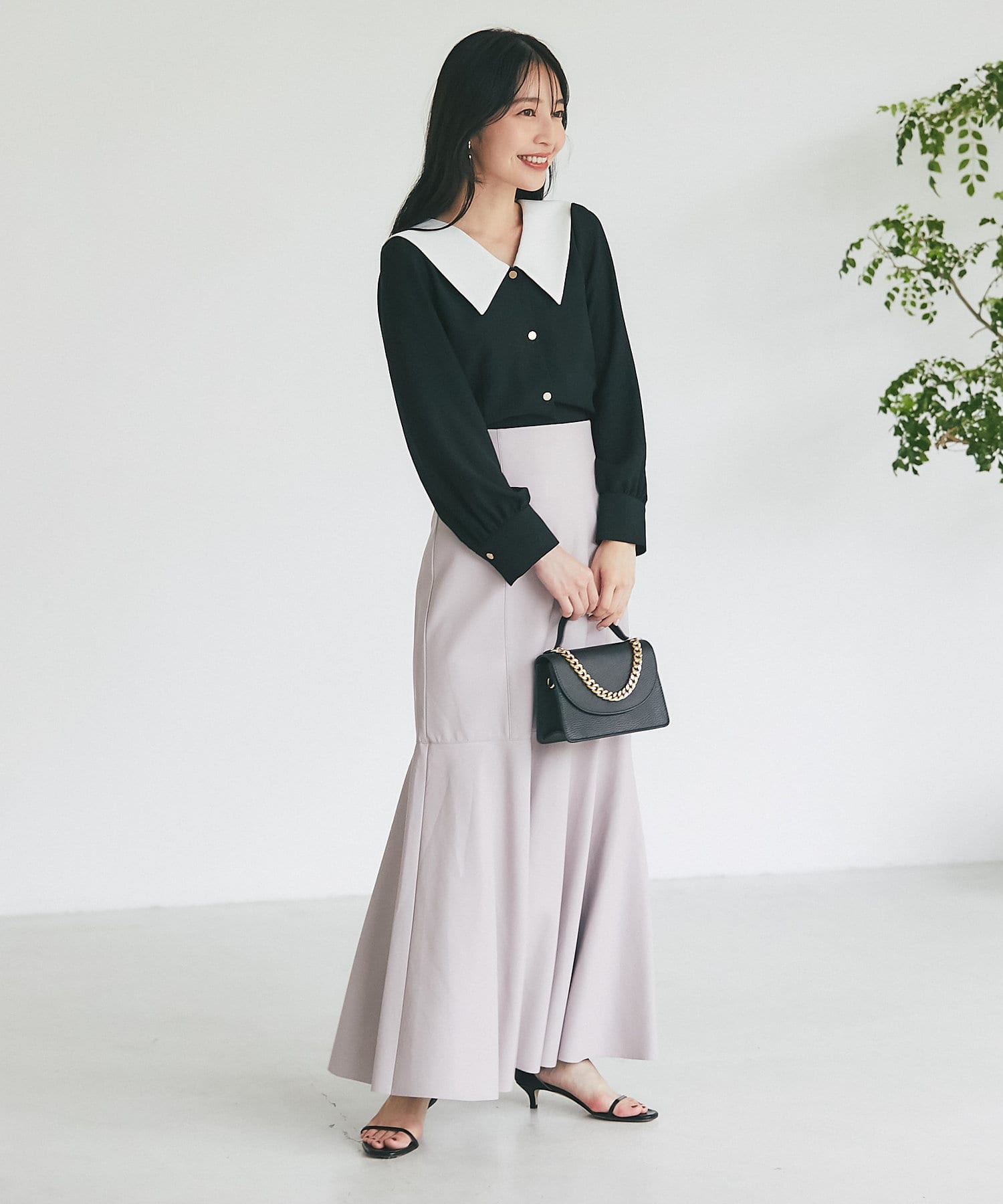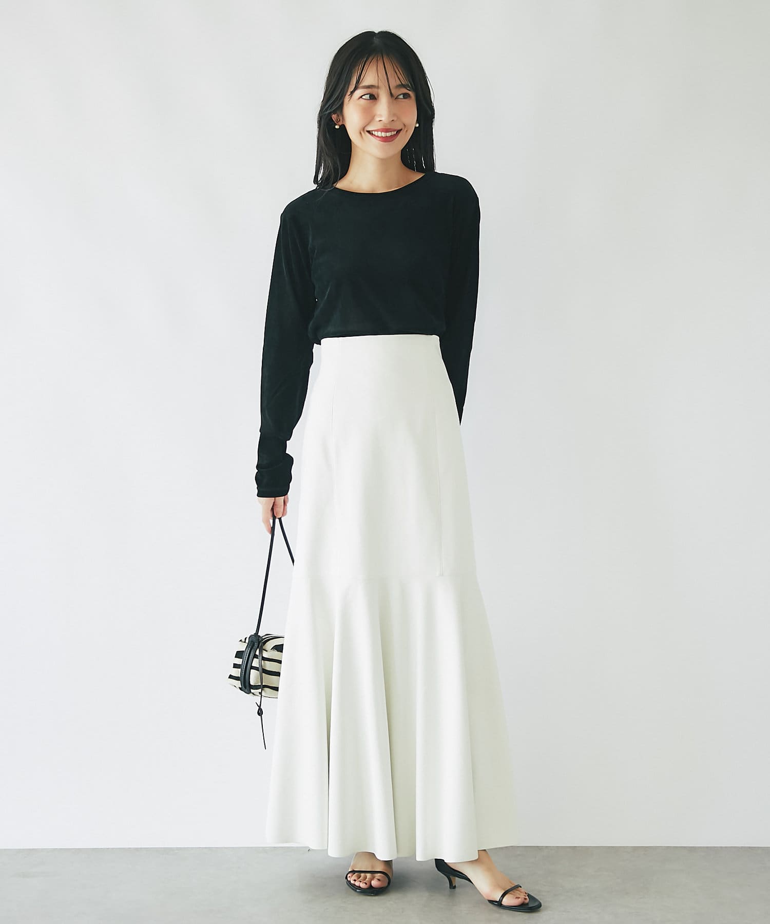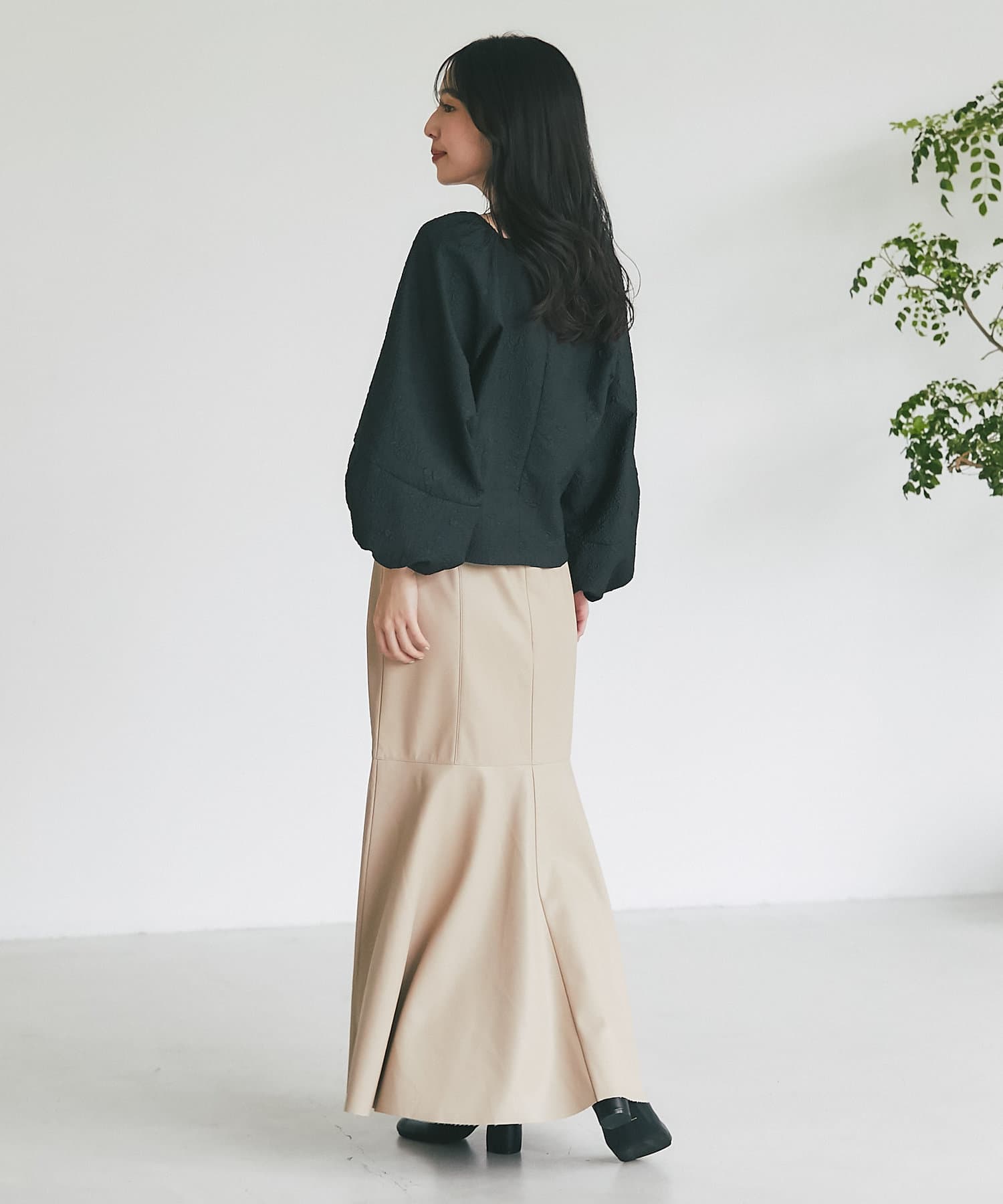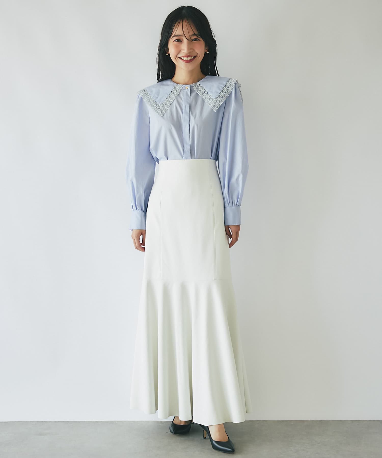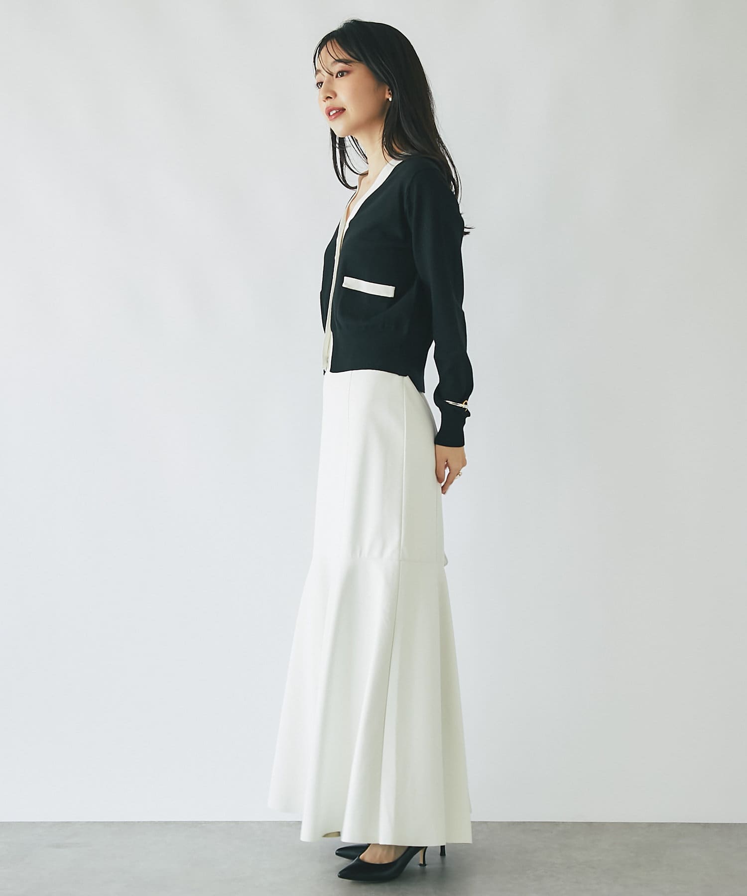 腰回りはすっきりとタイトに、高めの位置からフレアで広がる大人のマーメイドスカート。