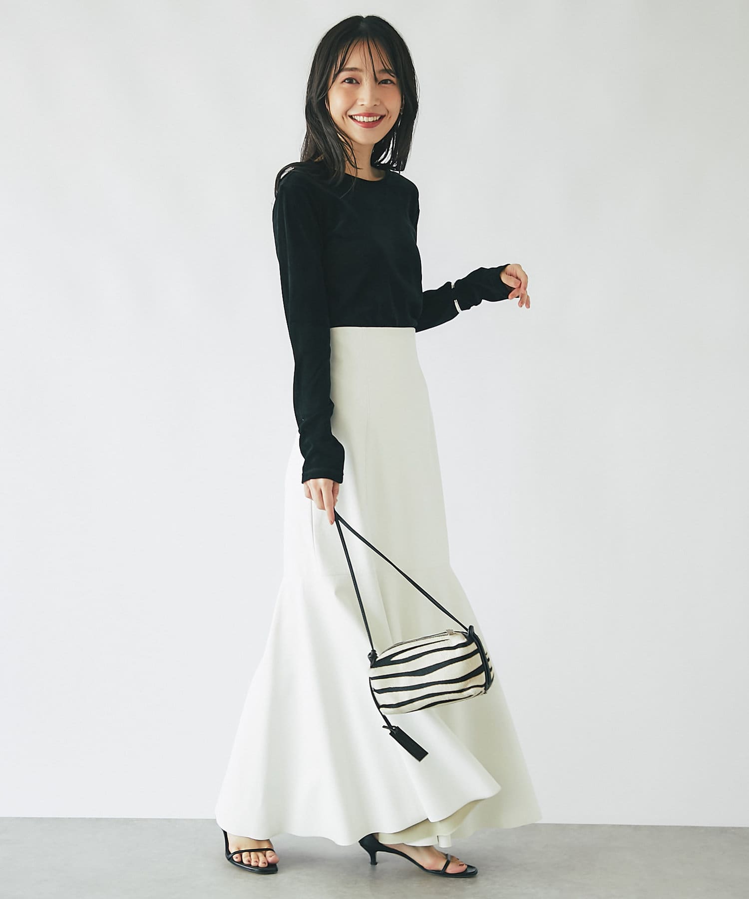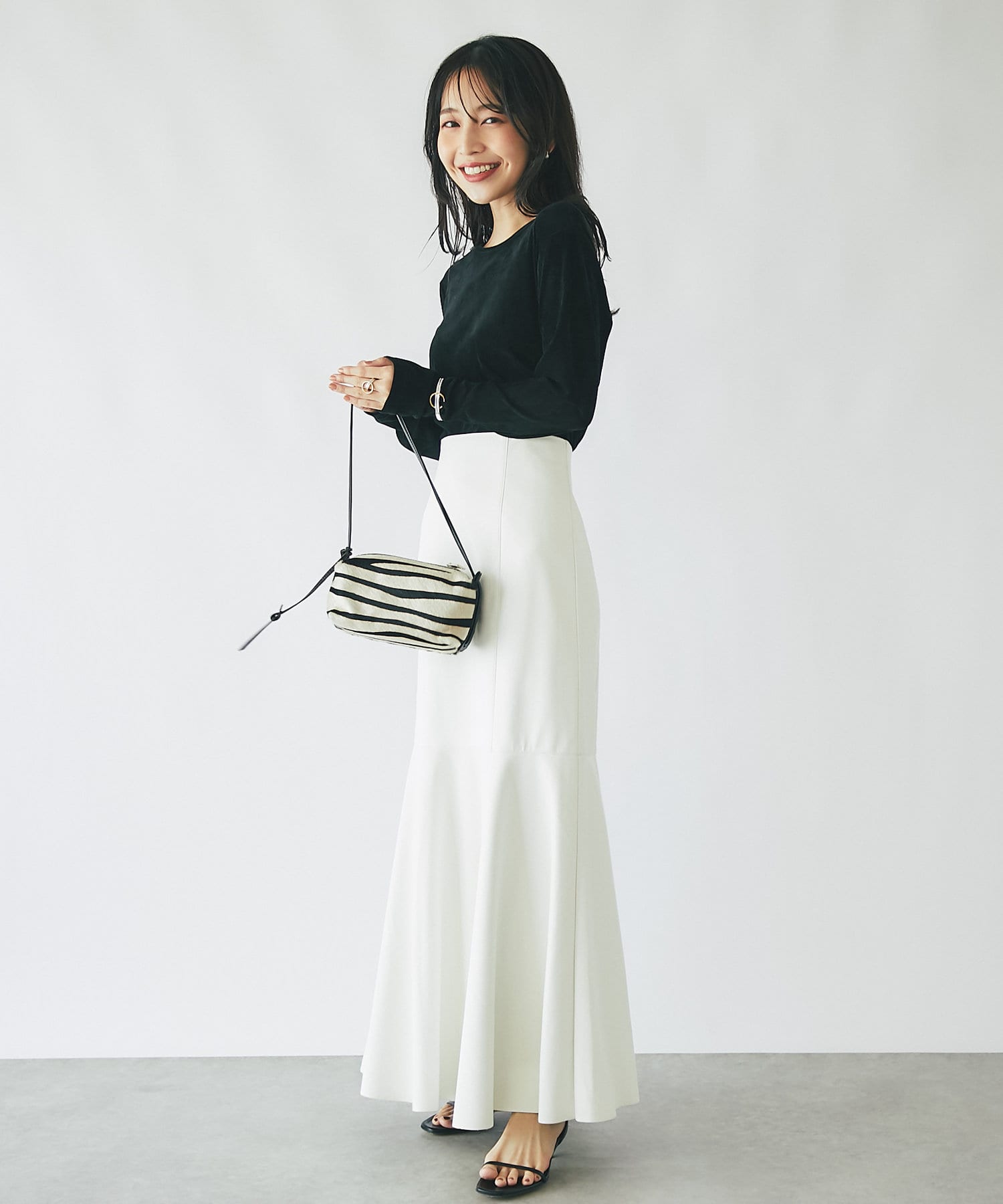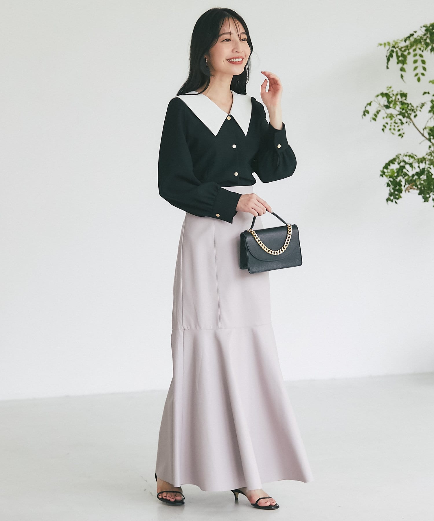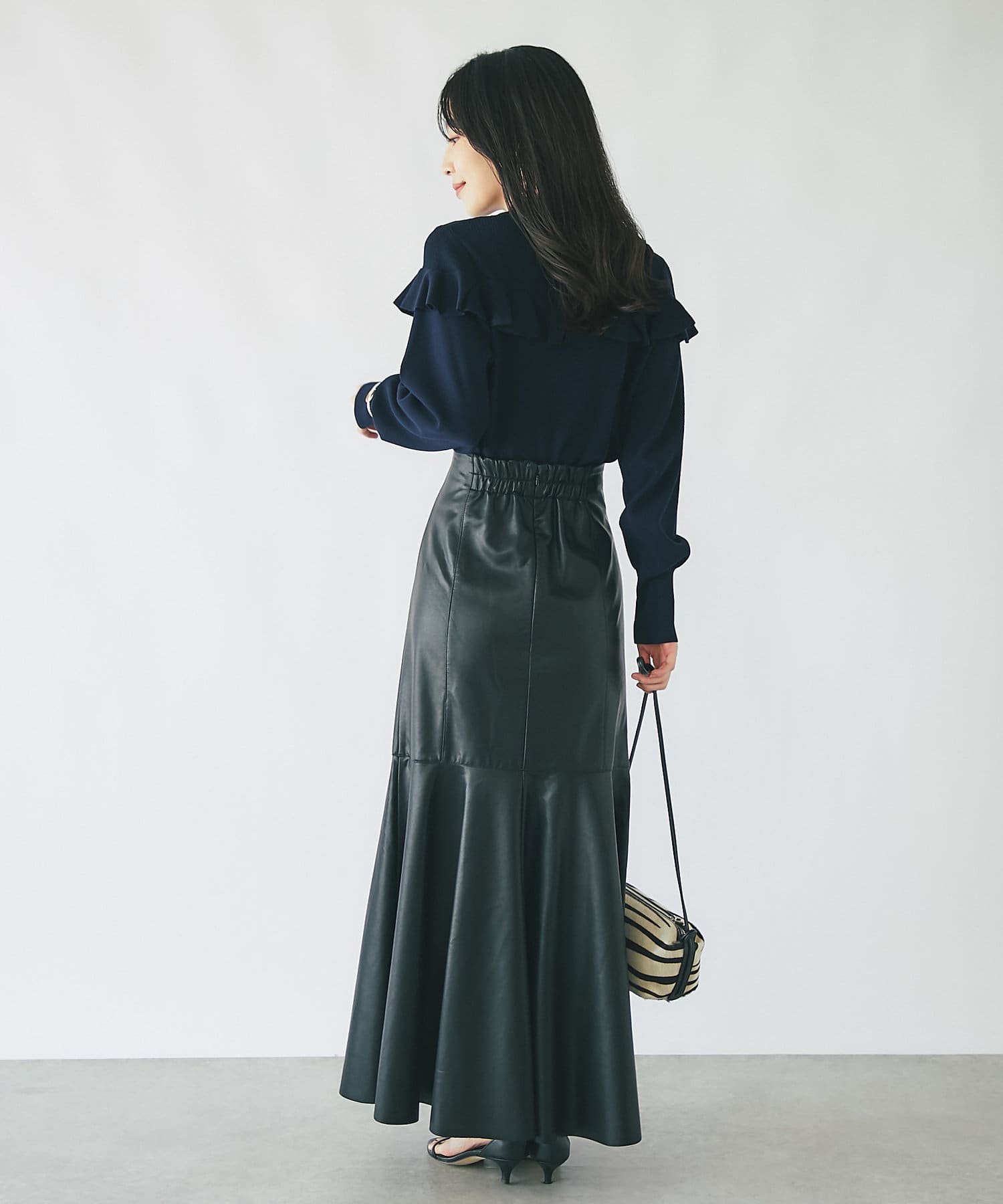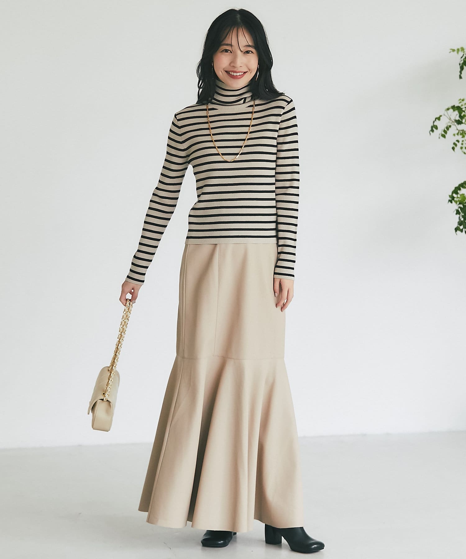 腰回りはすっきりとタイトに、高めの位置からフレアで広がる大人のマーメイドスカート。