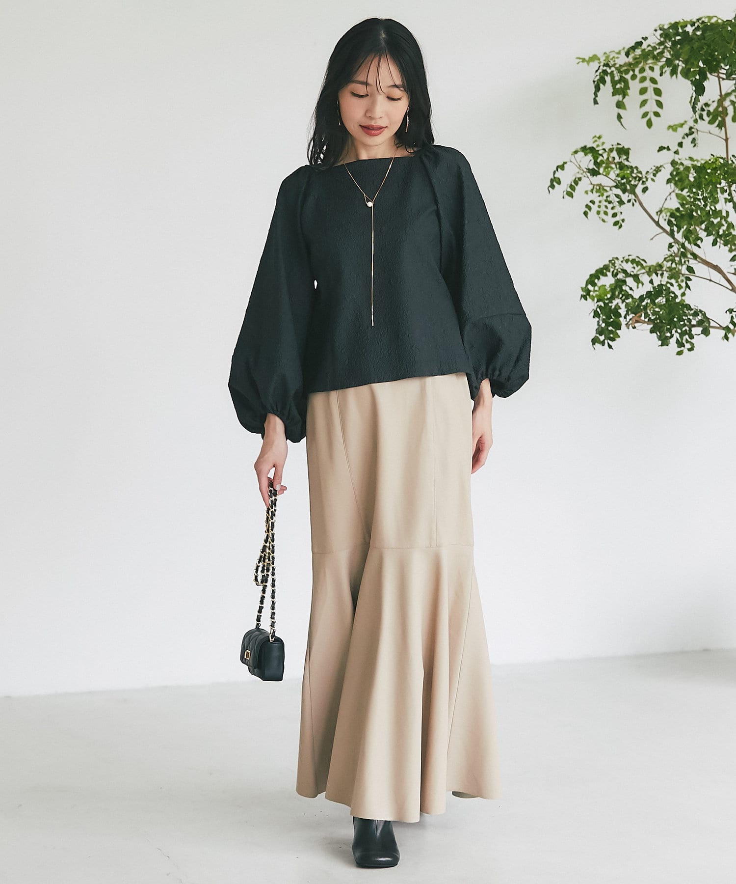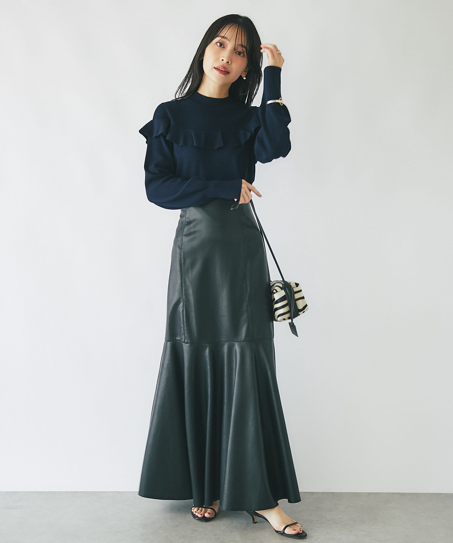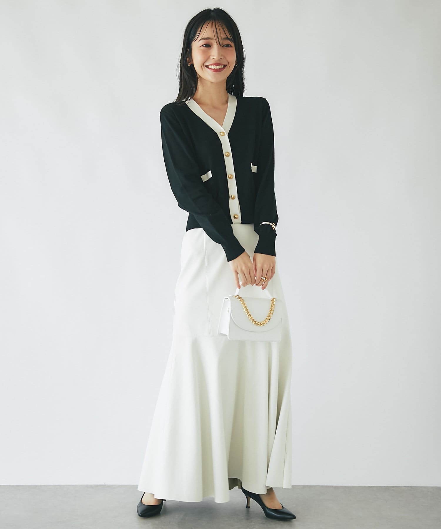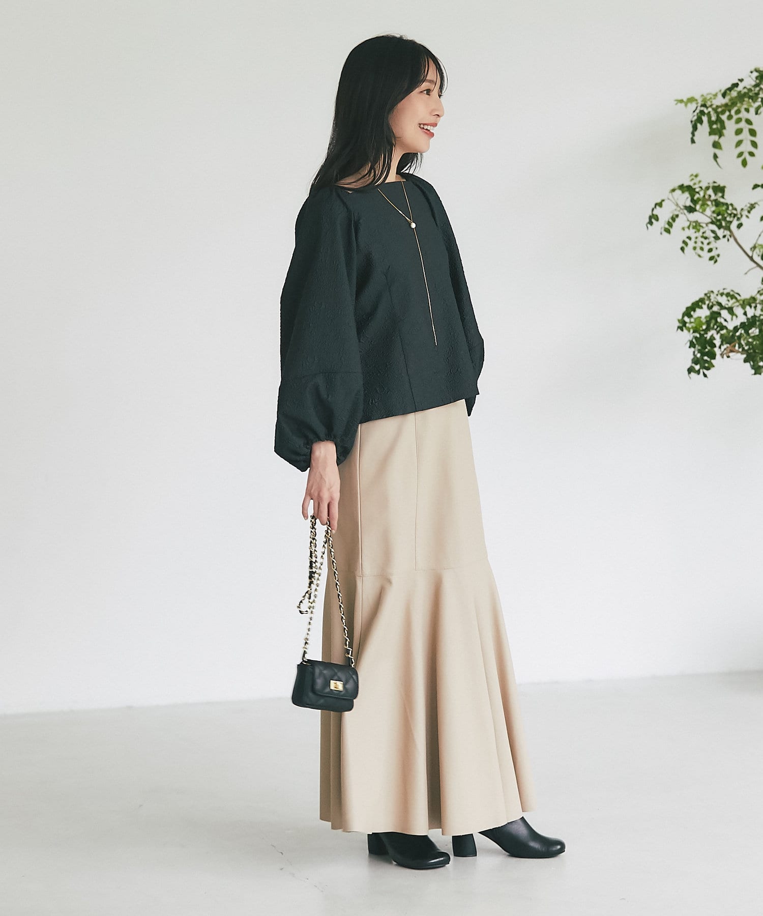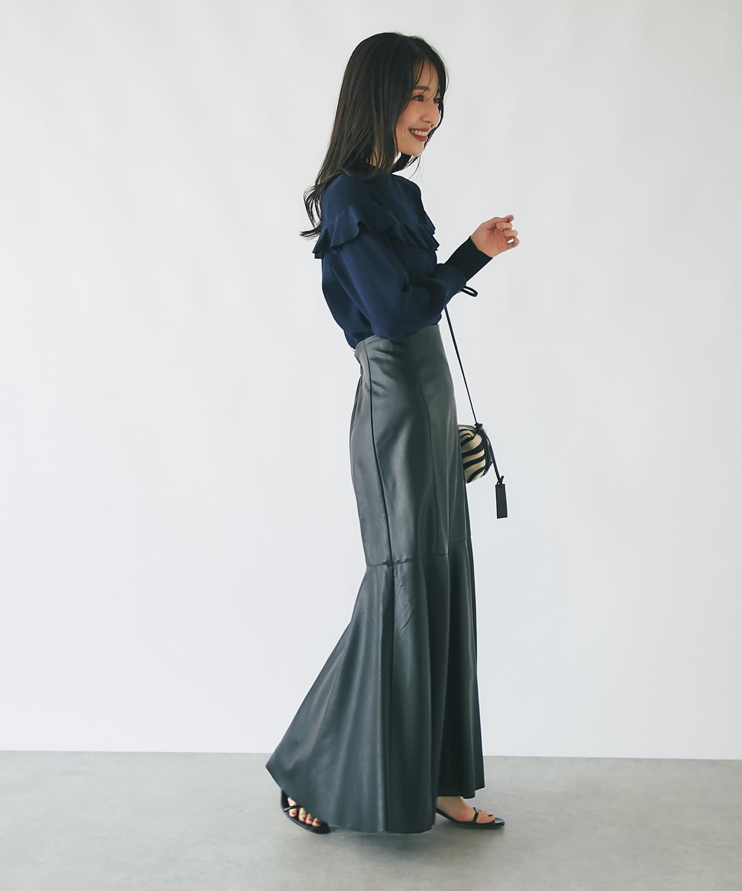 腰回りはすっきりとタイトに、高めの位置からフレアで広がる大人のマーメイドスカート。