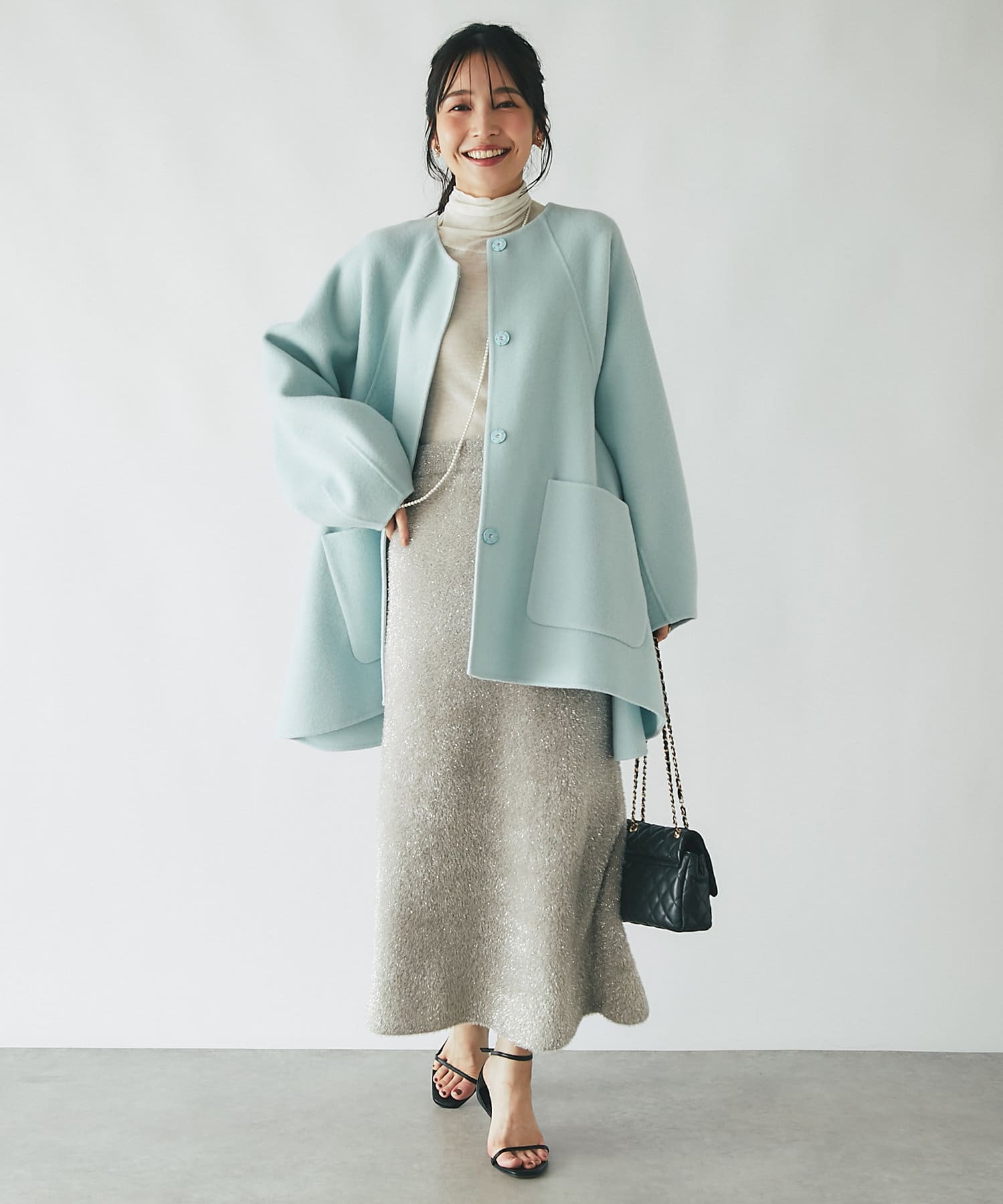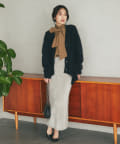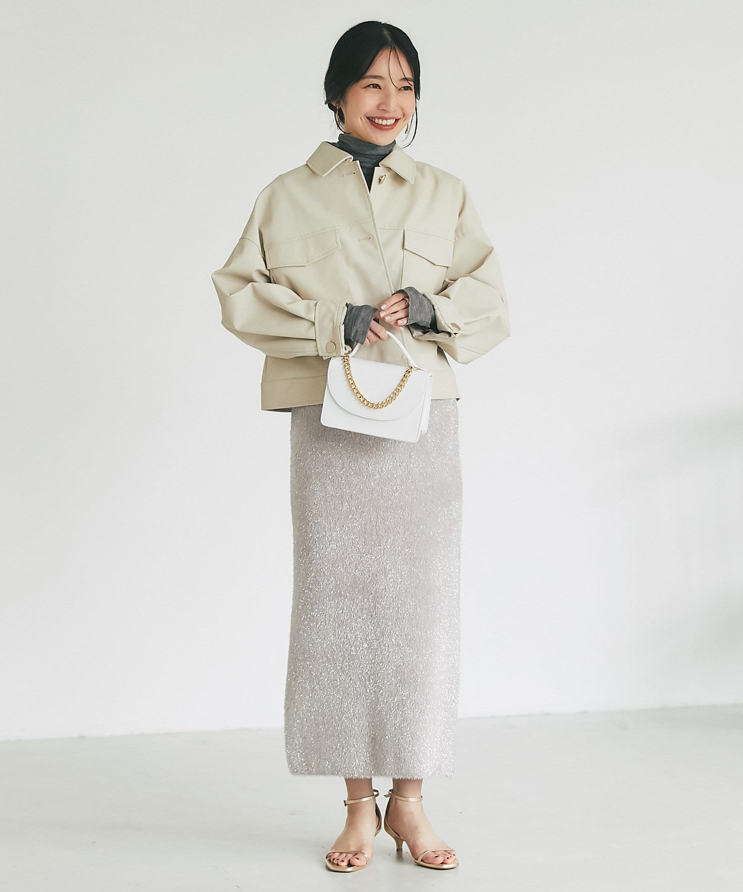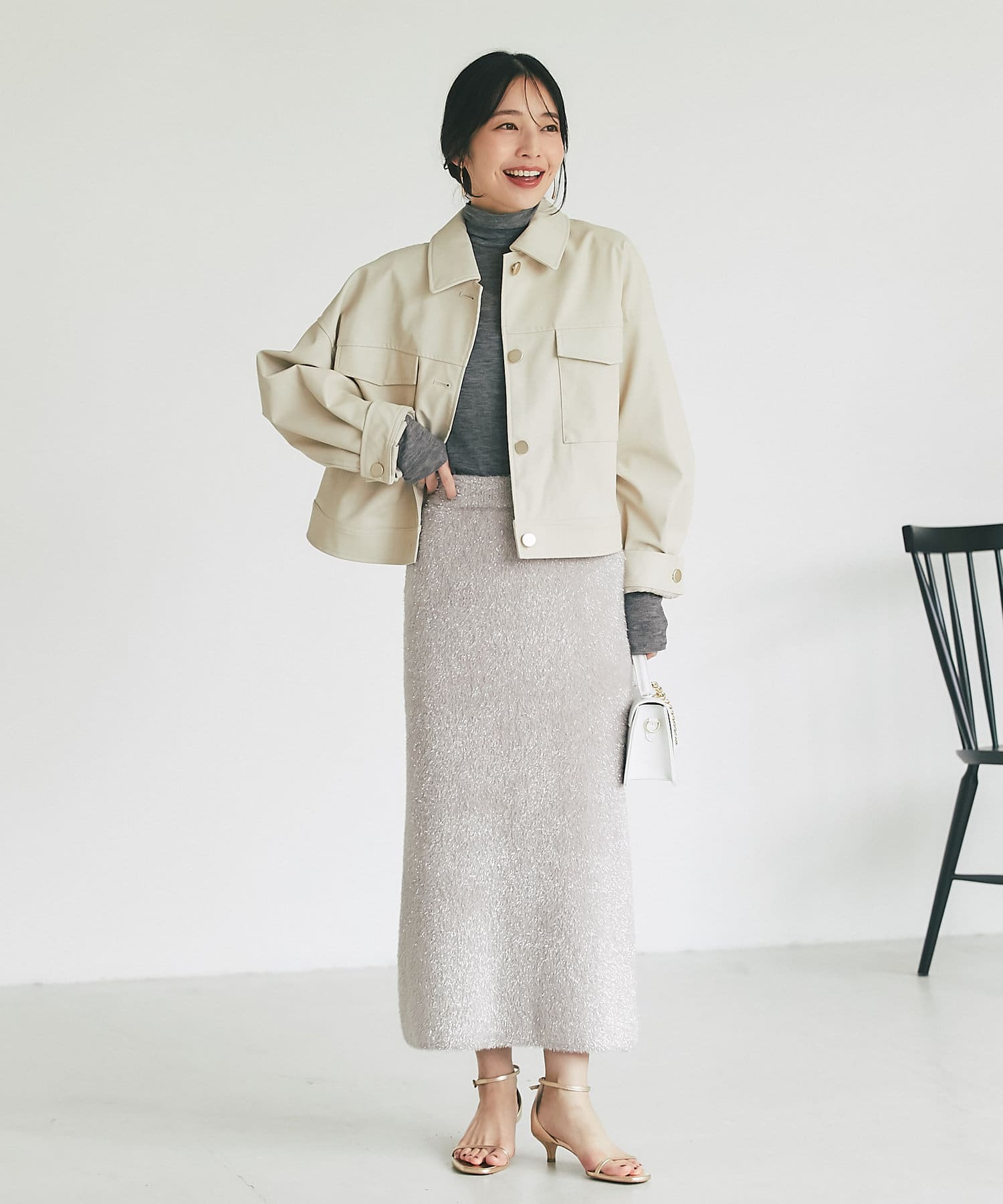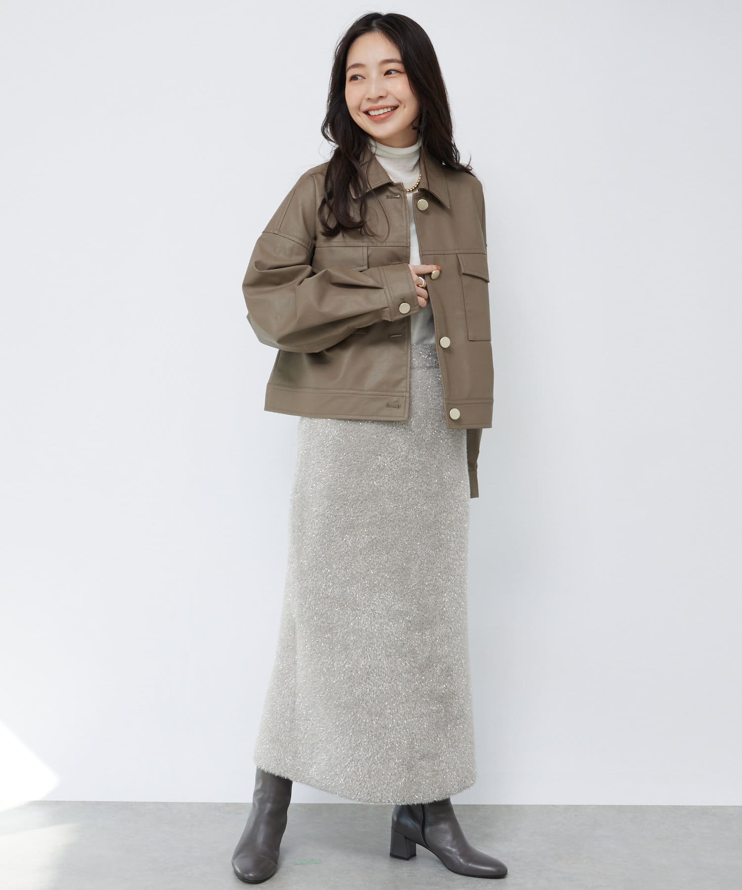 同素材のトップス以外のニットとの相性も抜群ですが、フェイクレザーのジャケットなど異素材合わせもおしゃれ。