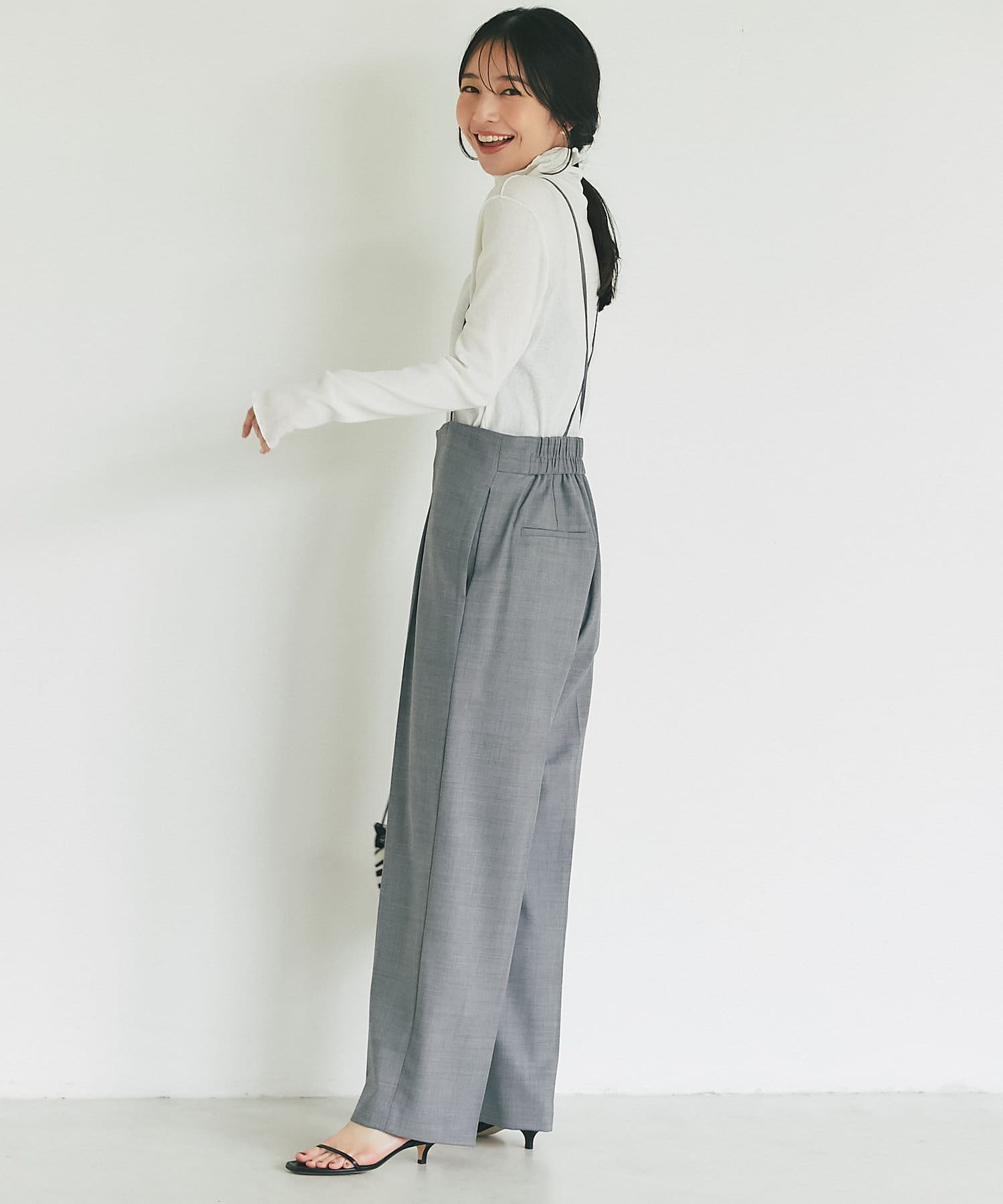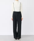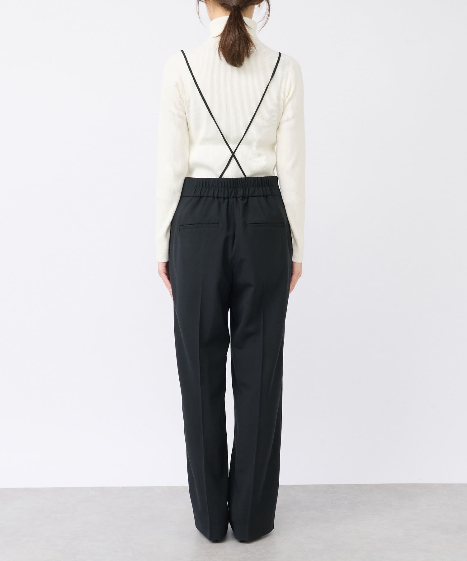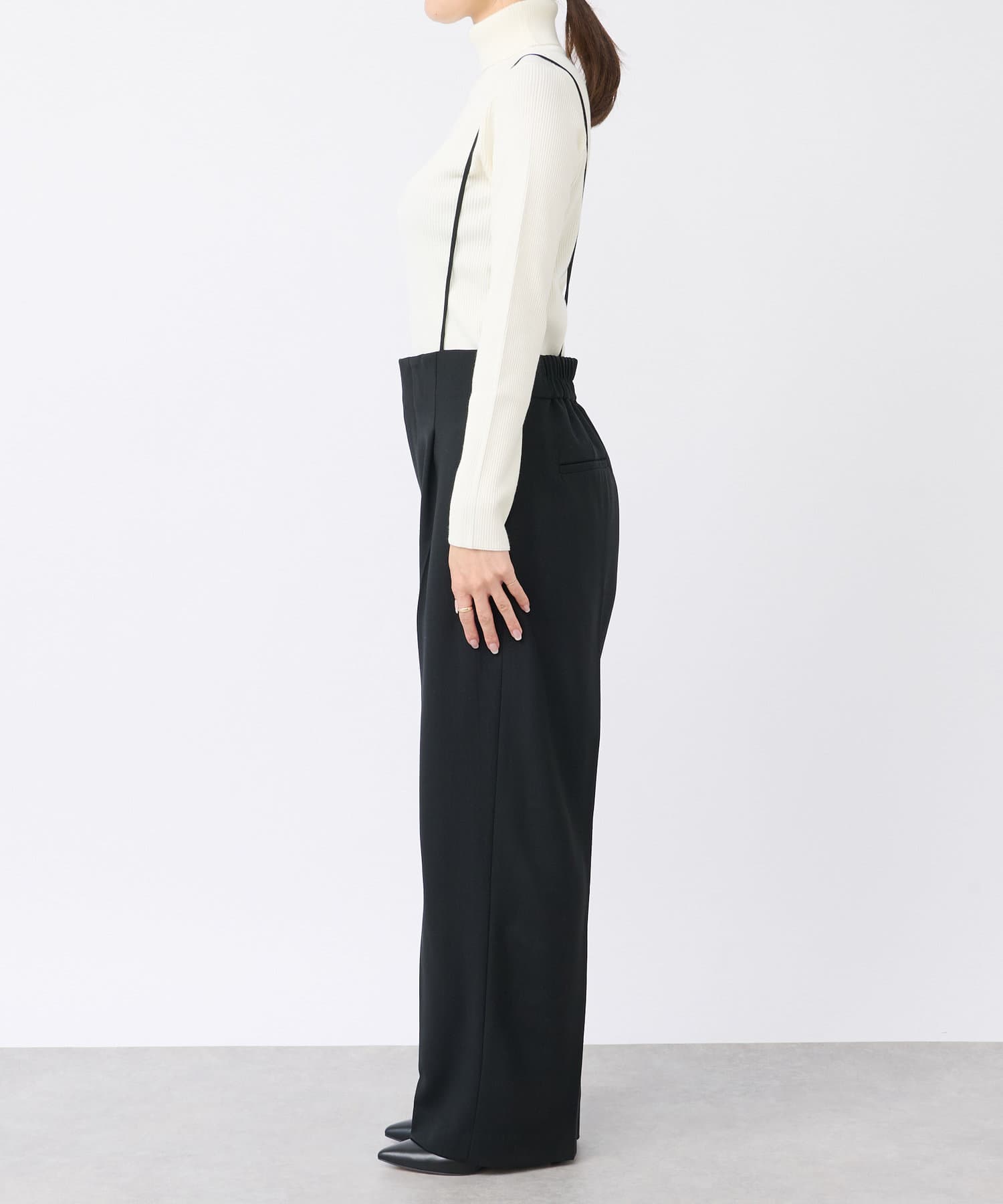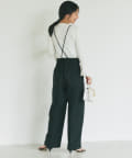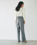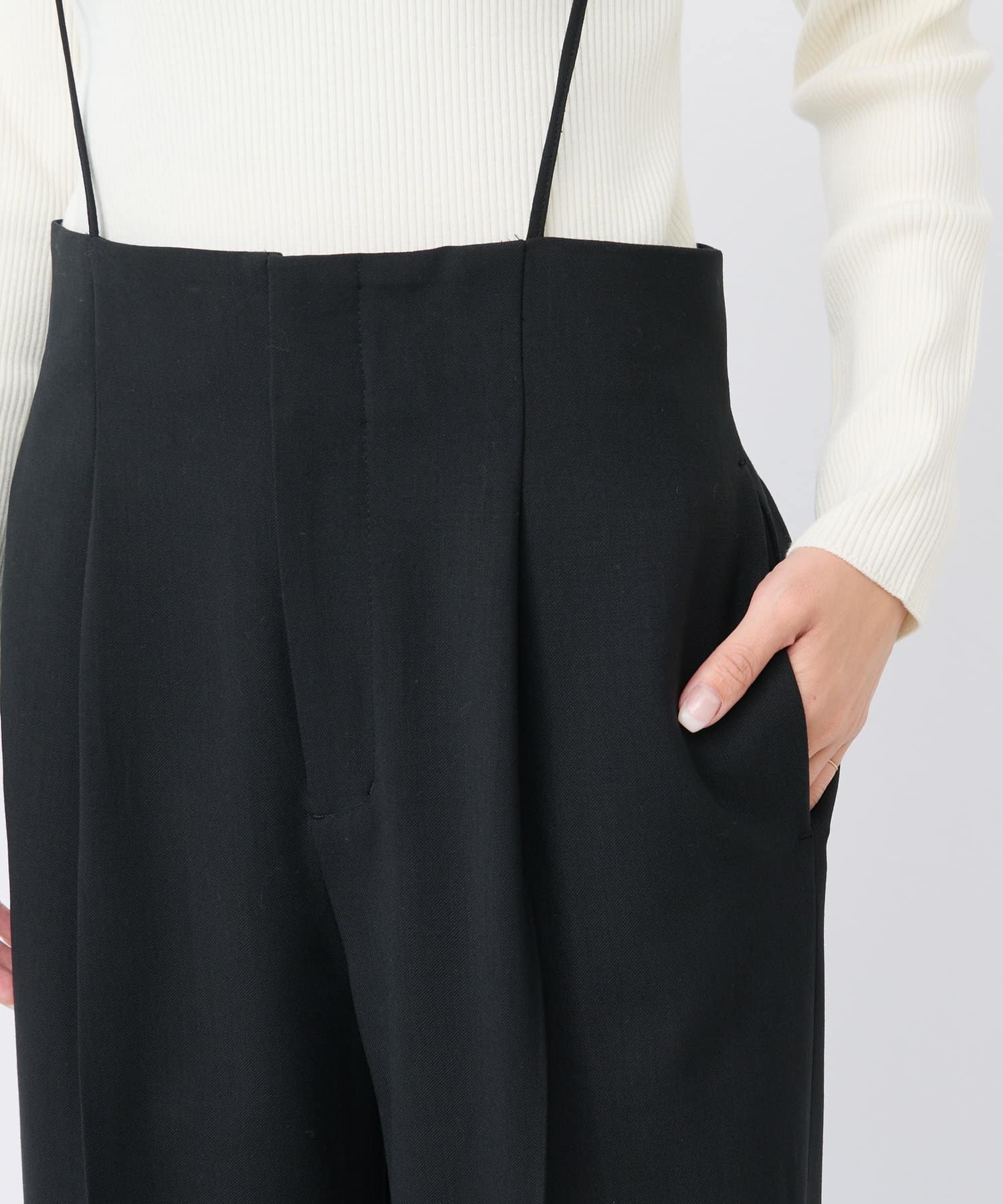 ストラップ付のセンタープレス入りサスペンダーパンツ。