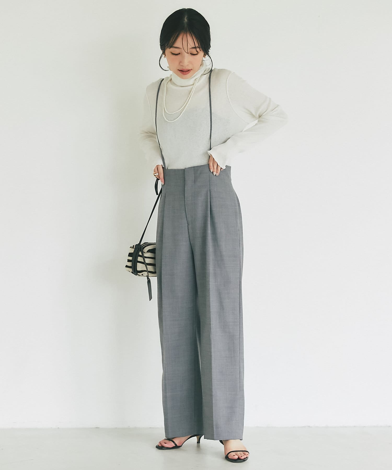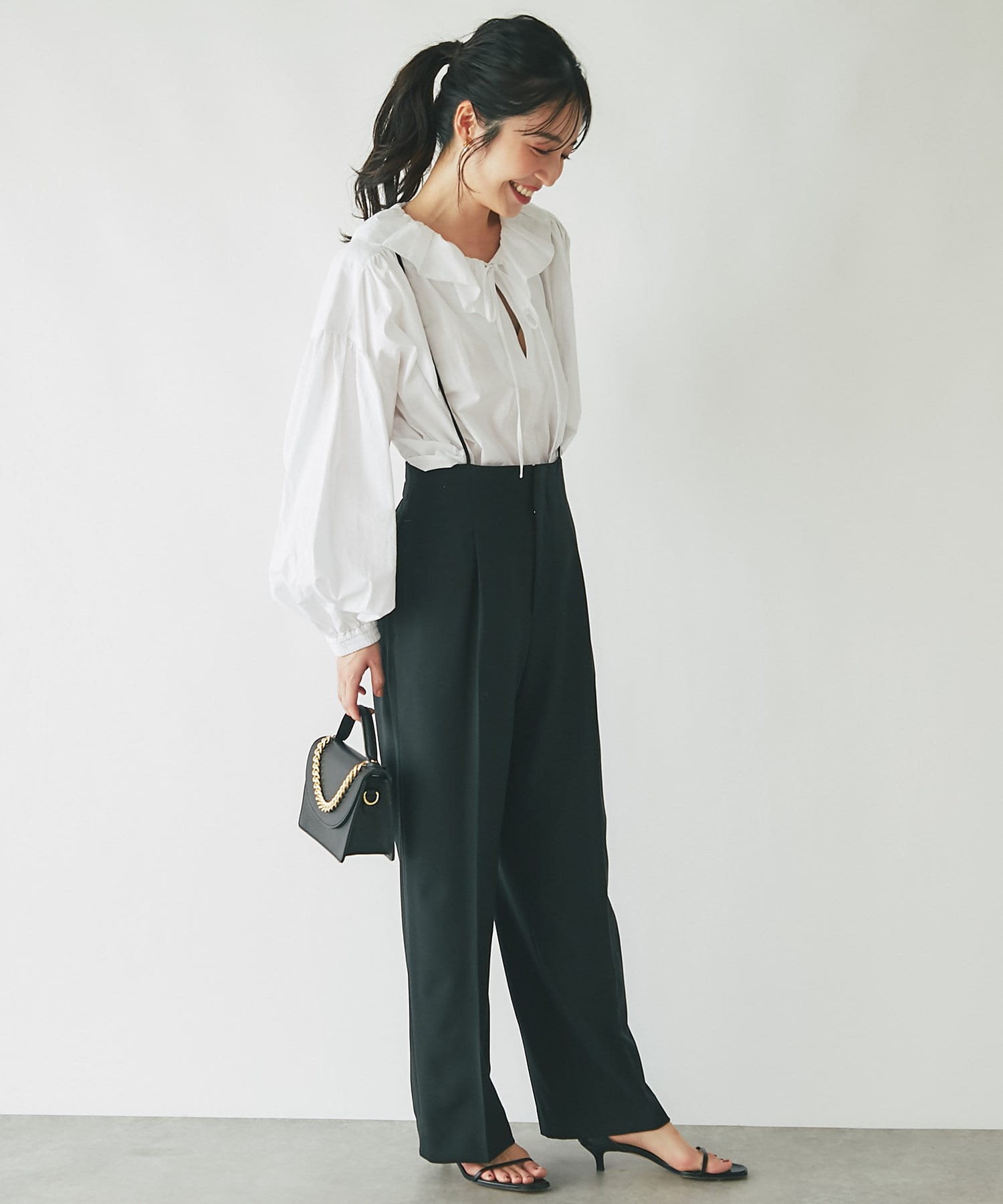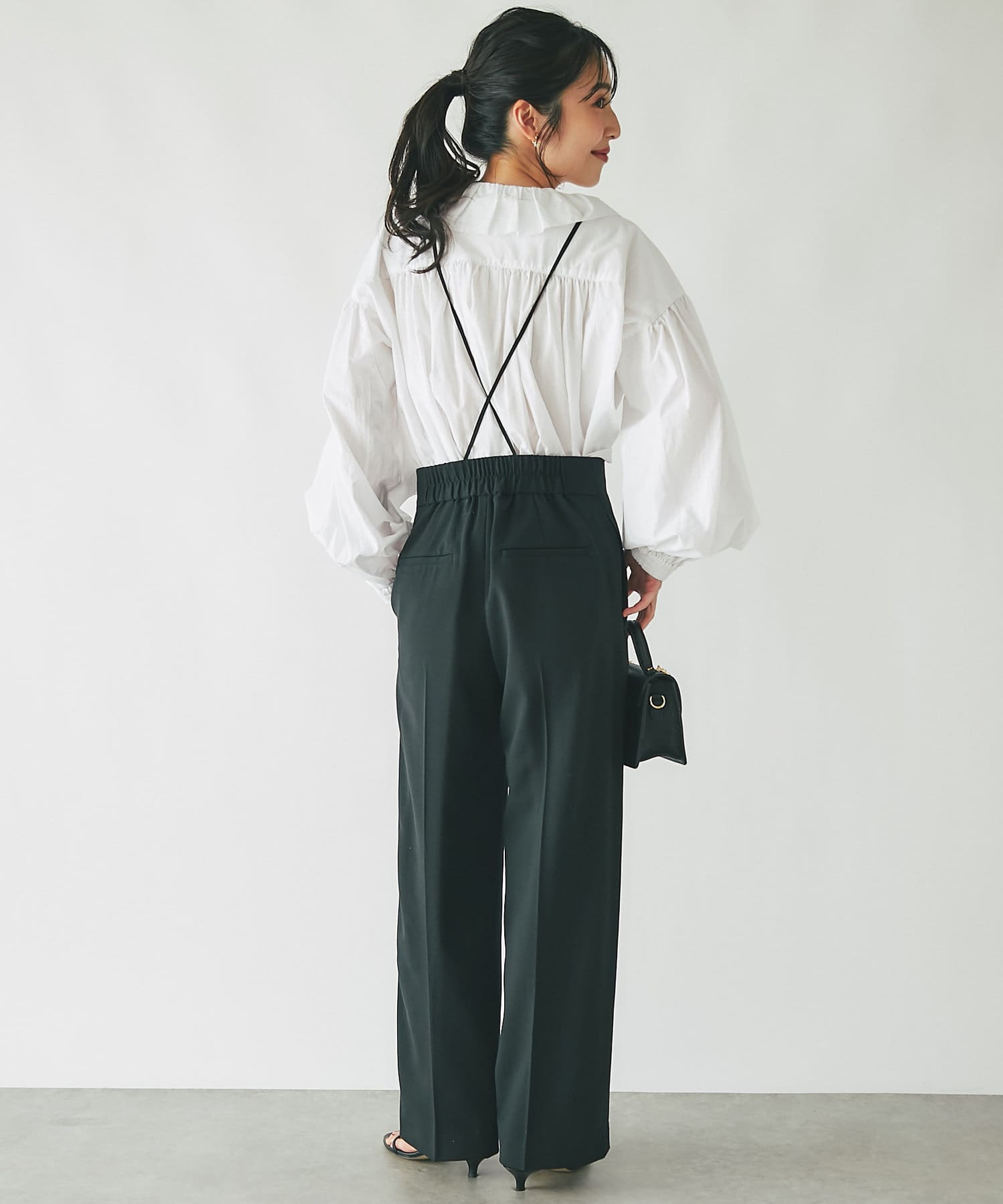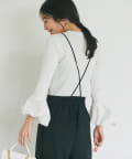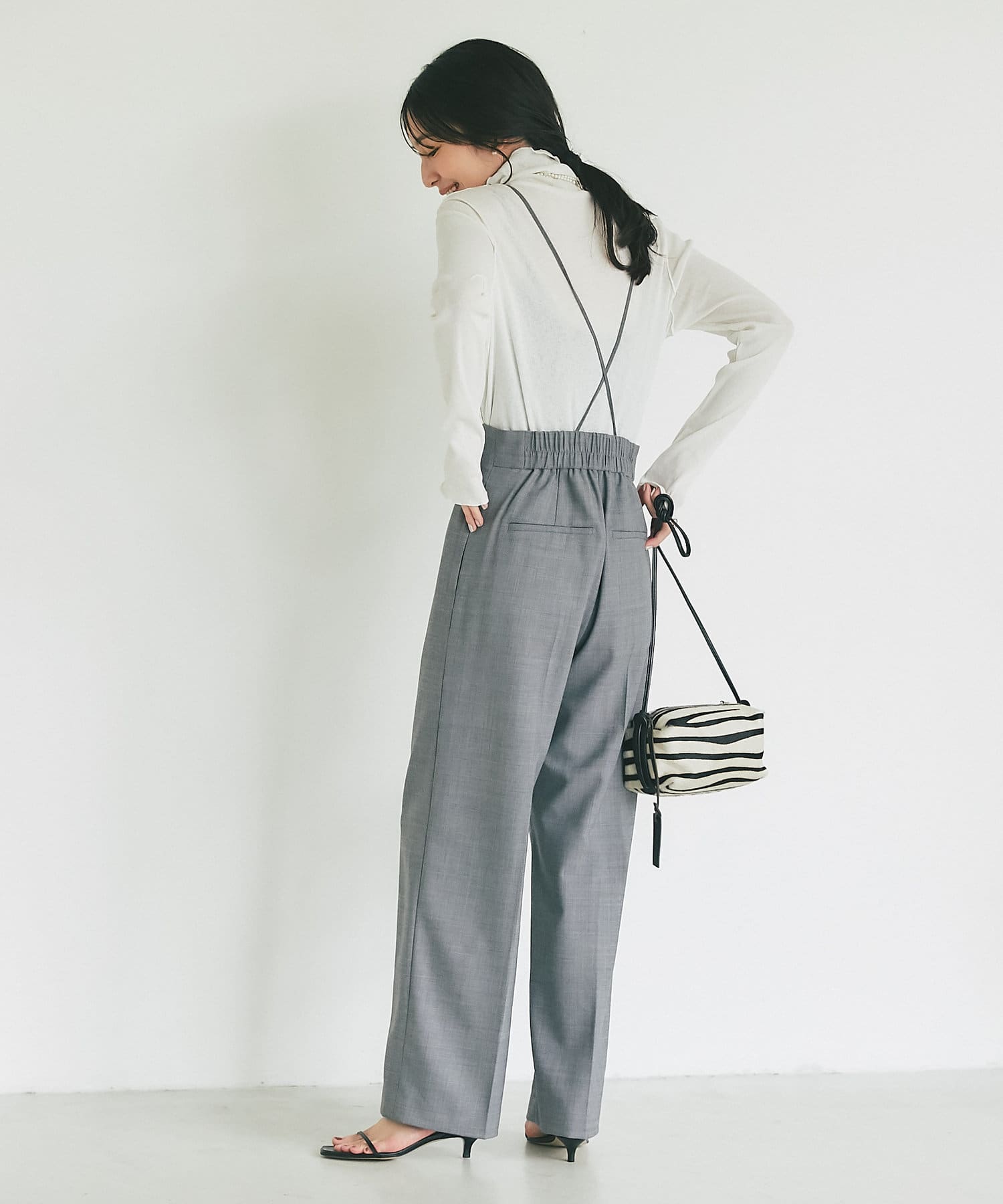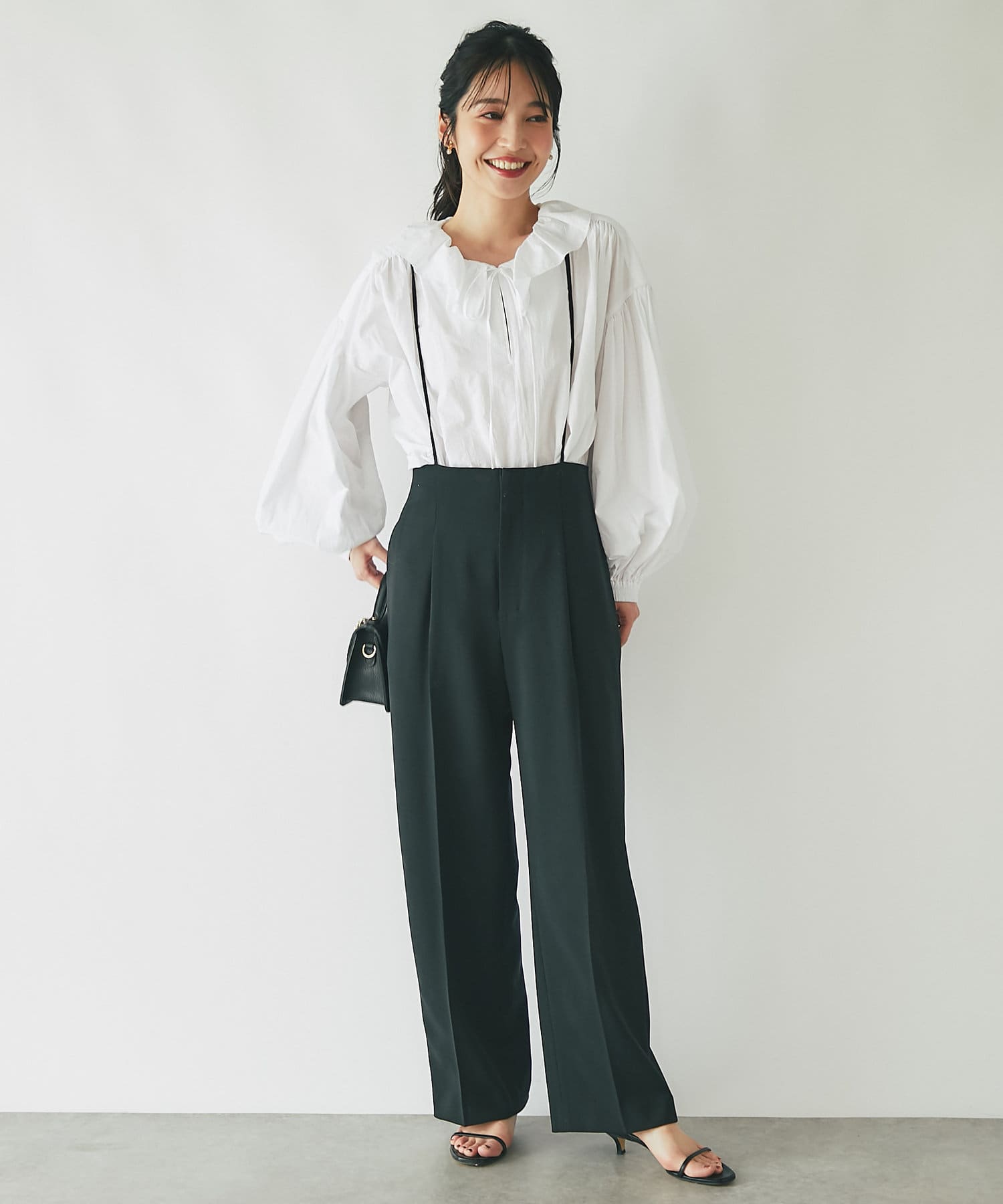 ストラップ付のセンタープレス入りサスペンダーパンツ。