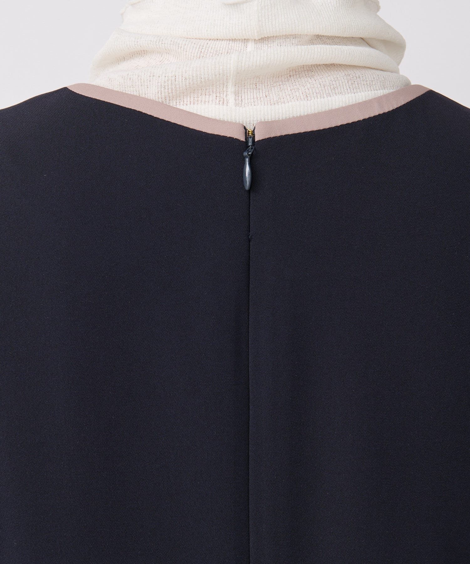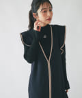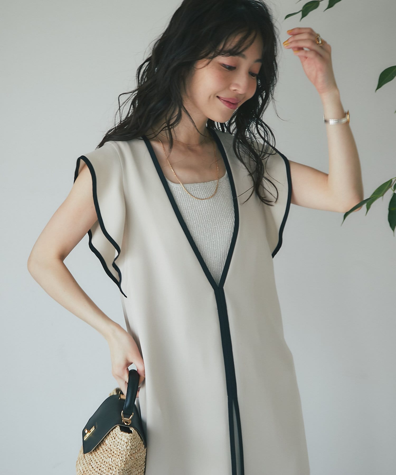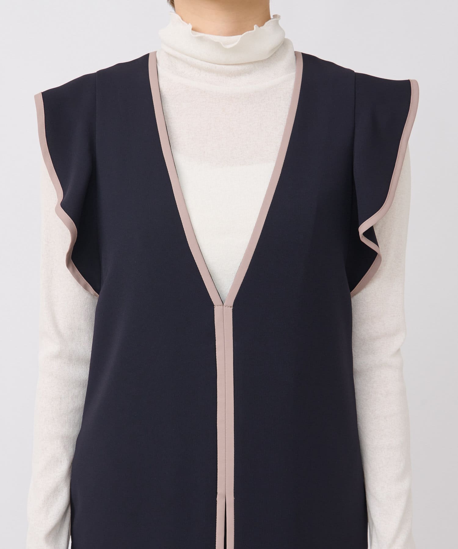 女性らしい深めのVネックとラッフル袖にバイカラーのパイピングをプラス。