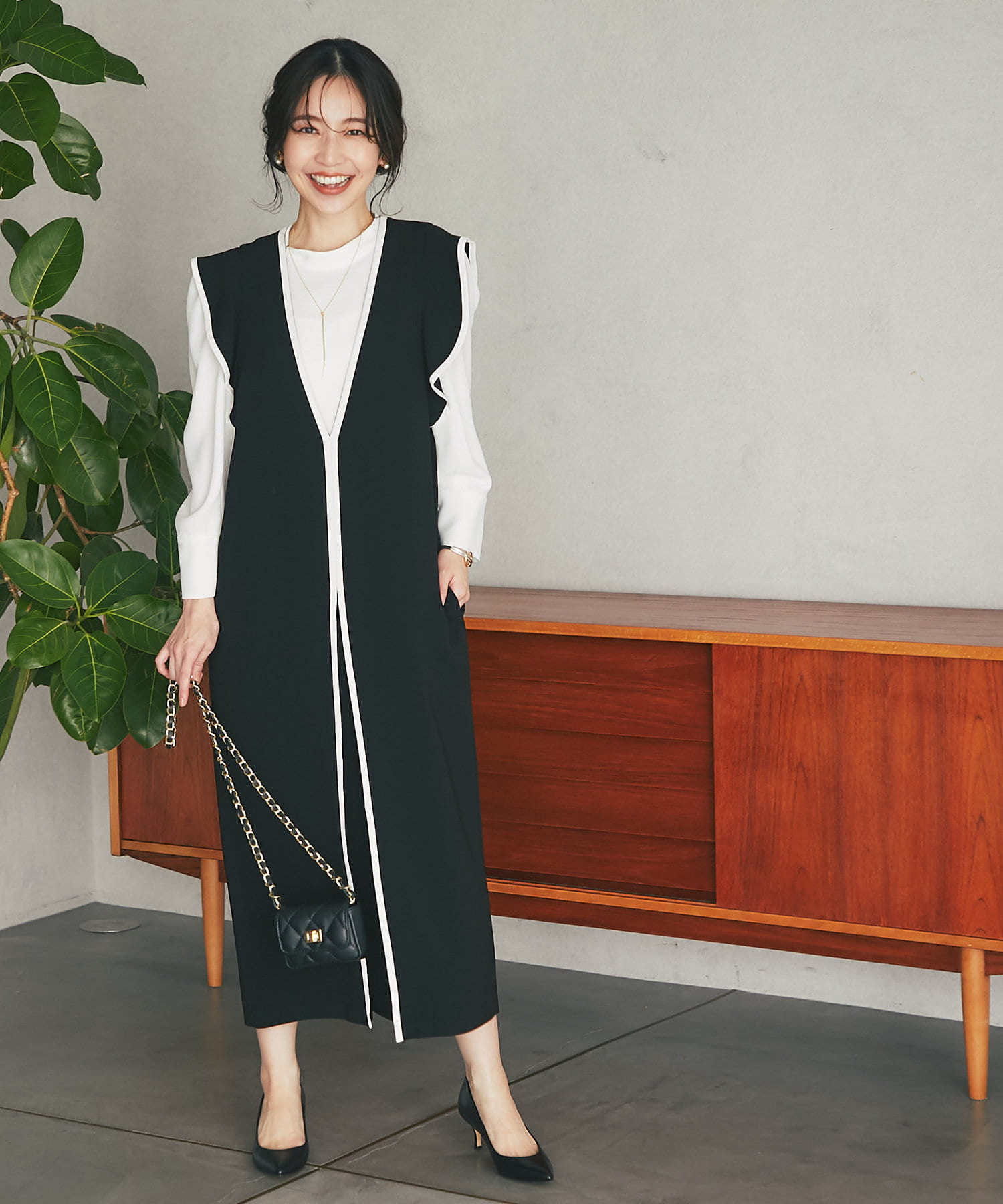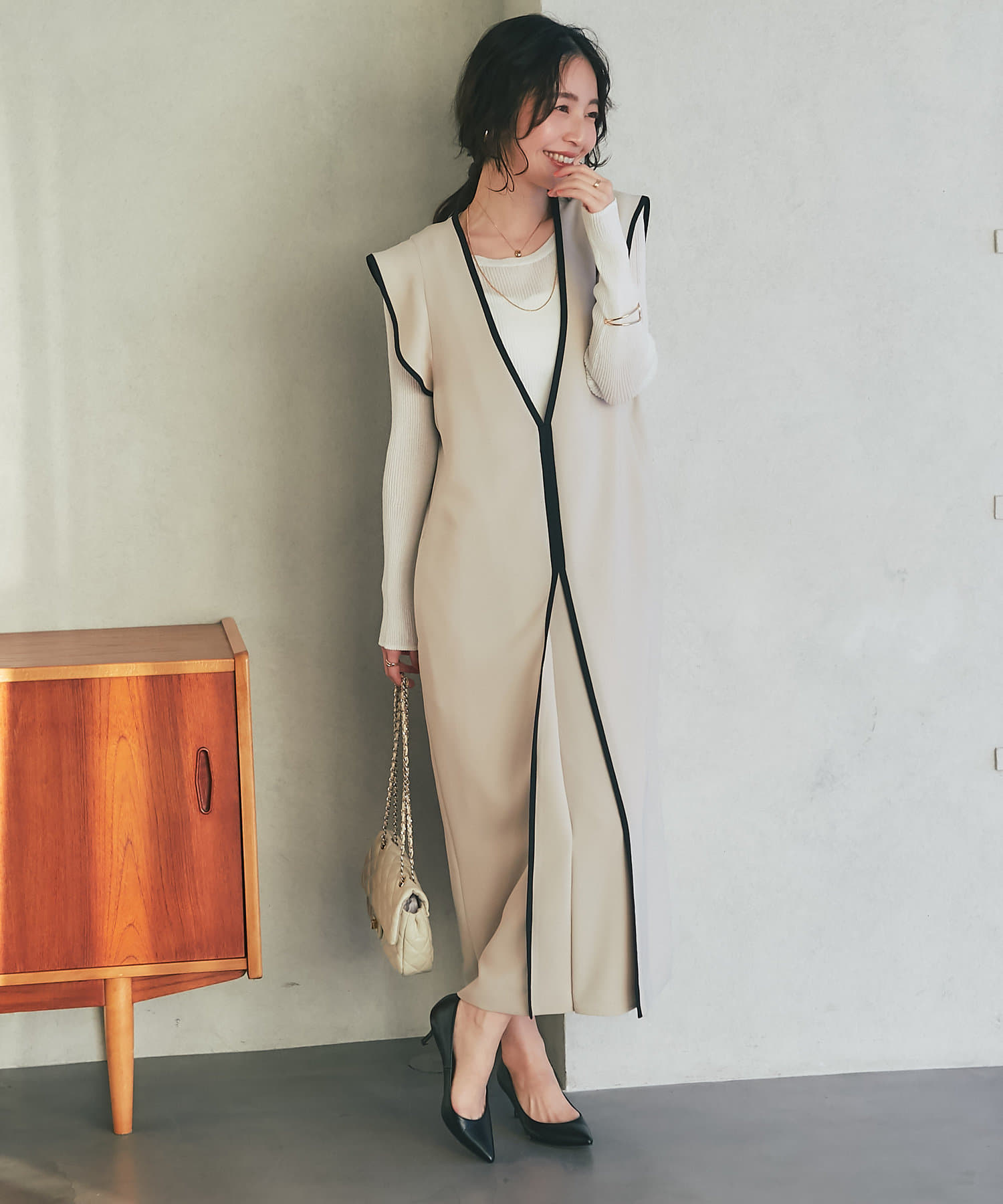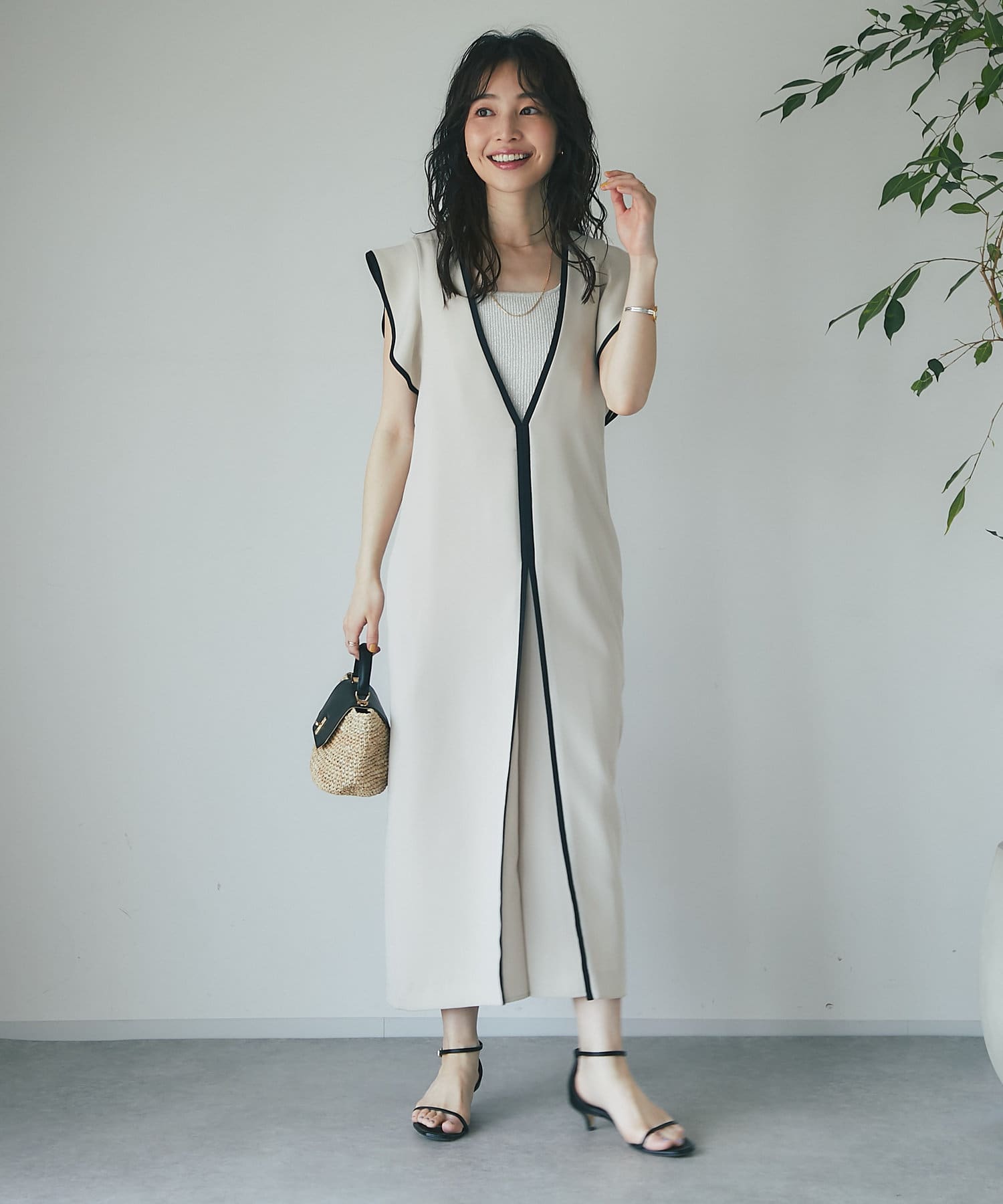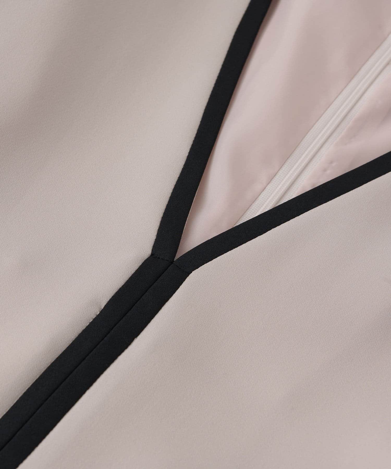 ☑深めのVネックとパイピングデザインですっきり見えが叶う。