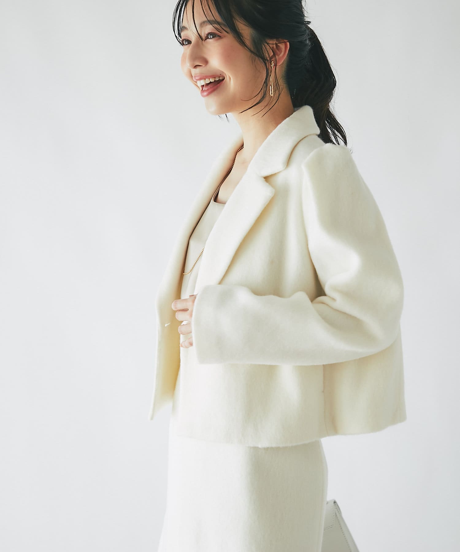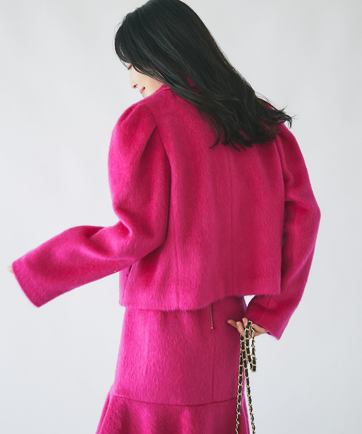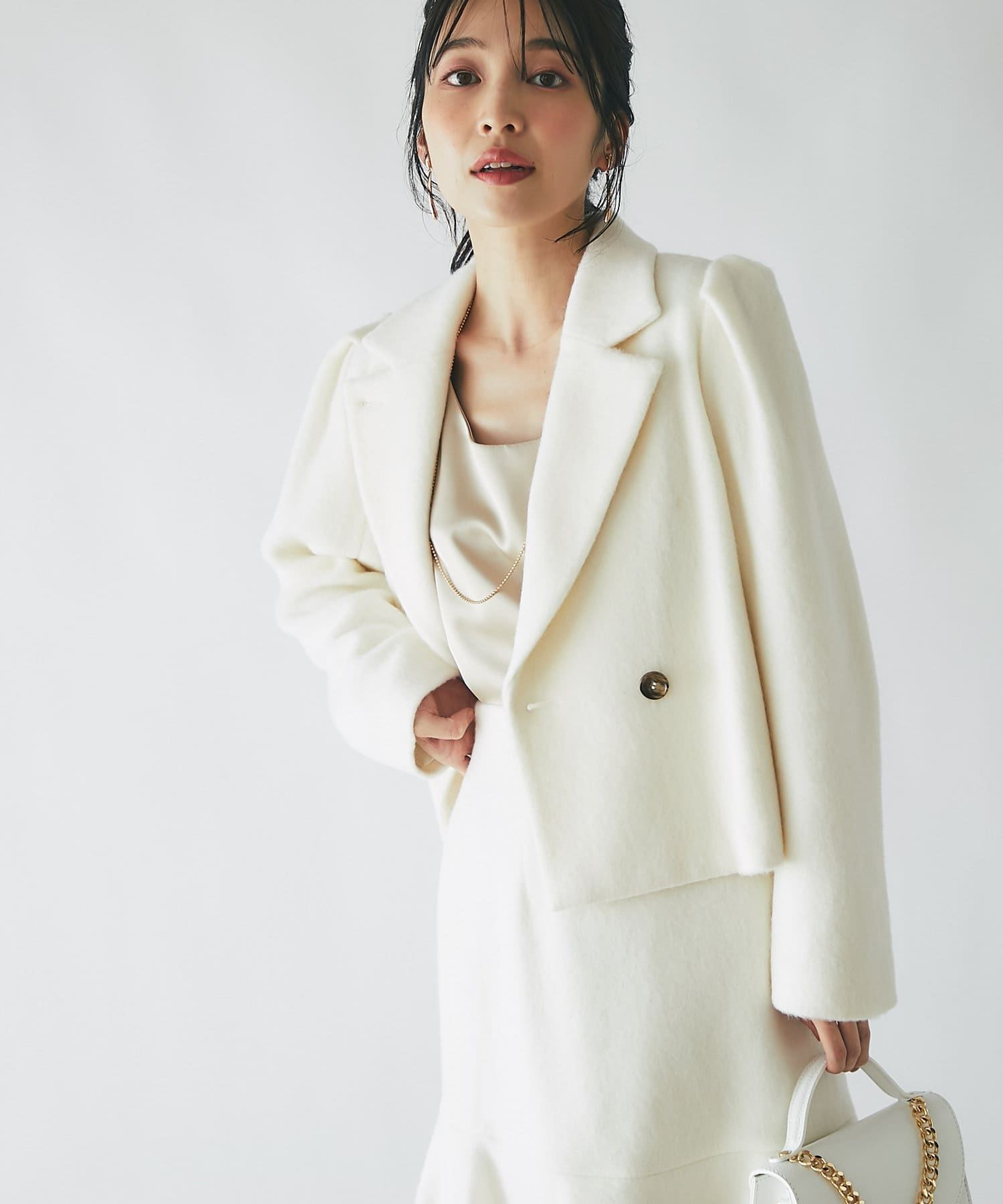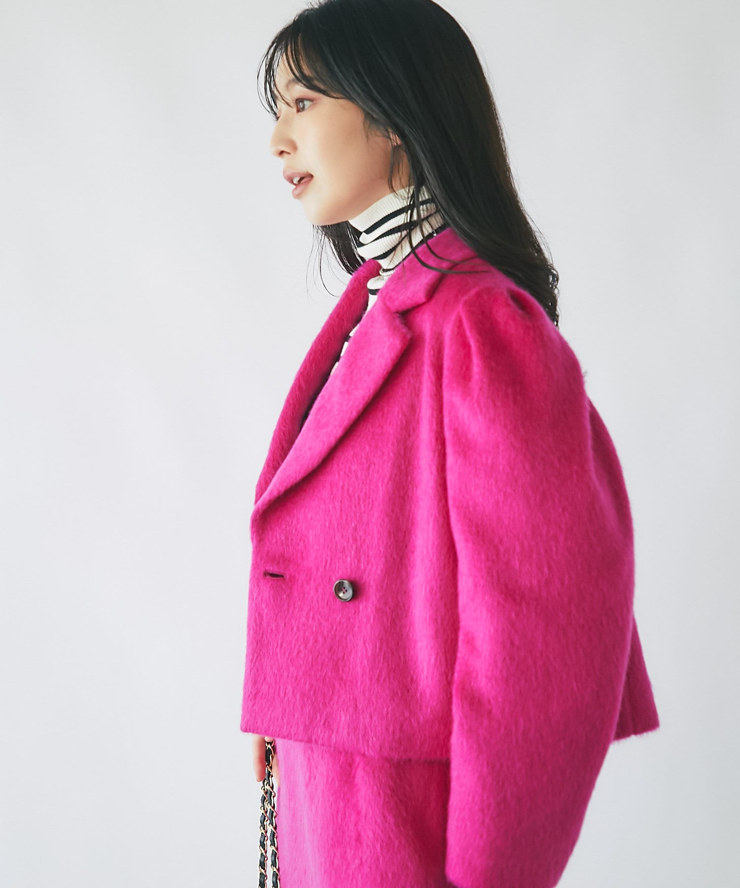 ふわふわしたシャギー素材とクロップド丈がトレンド感のあるジャケット。