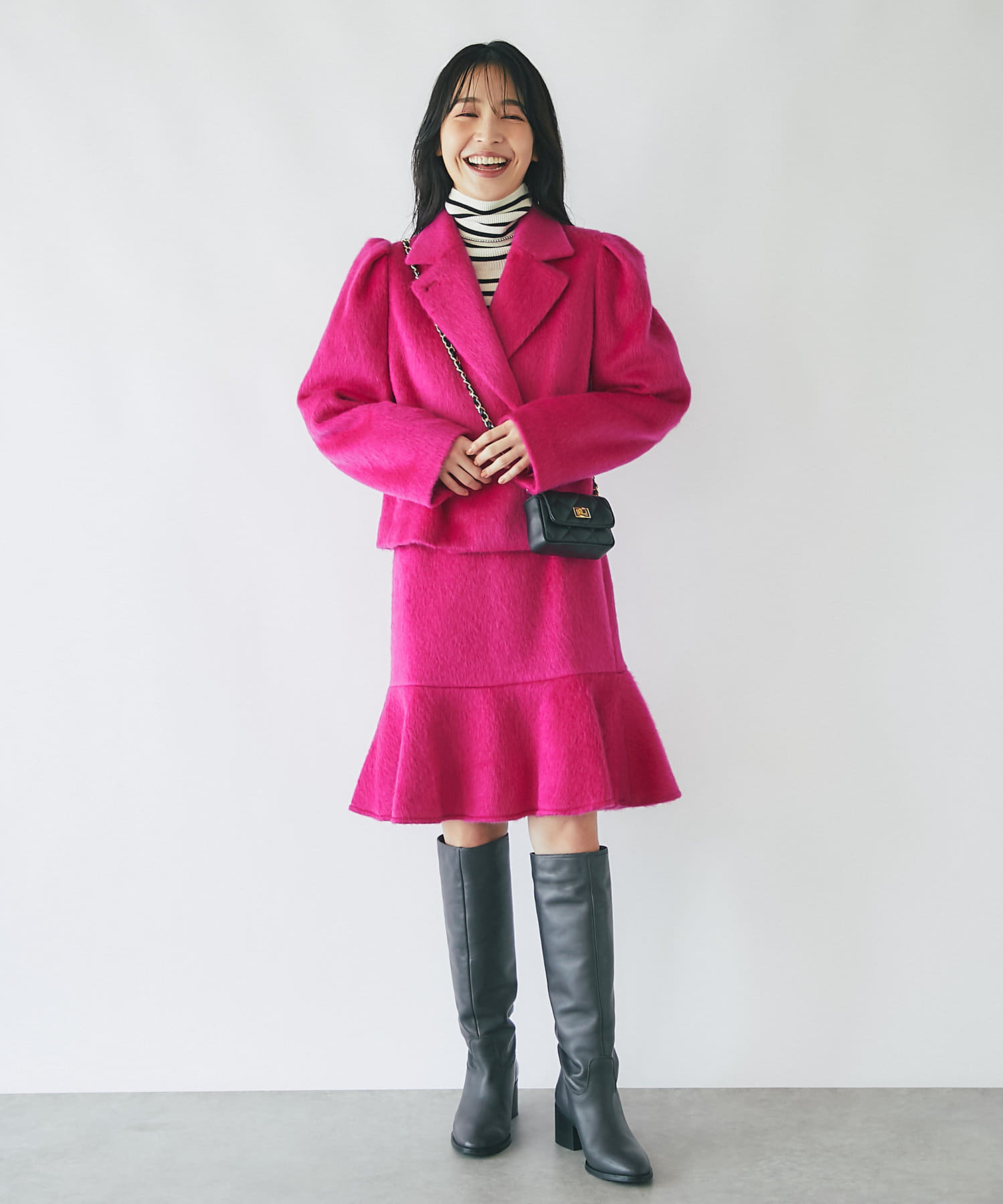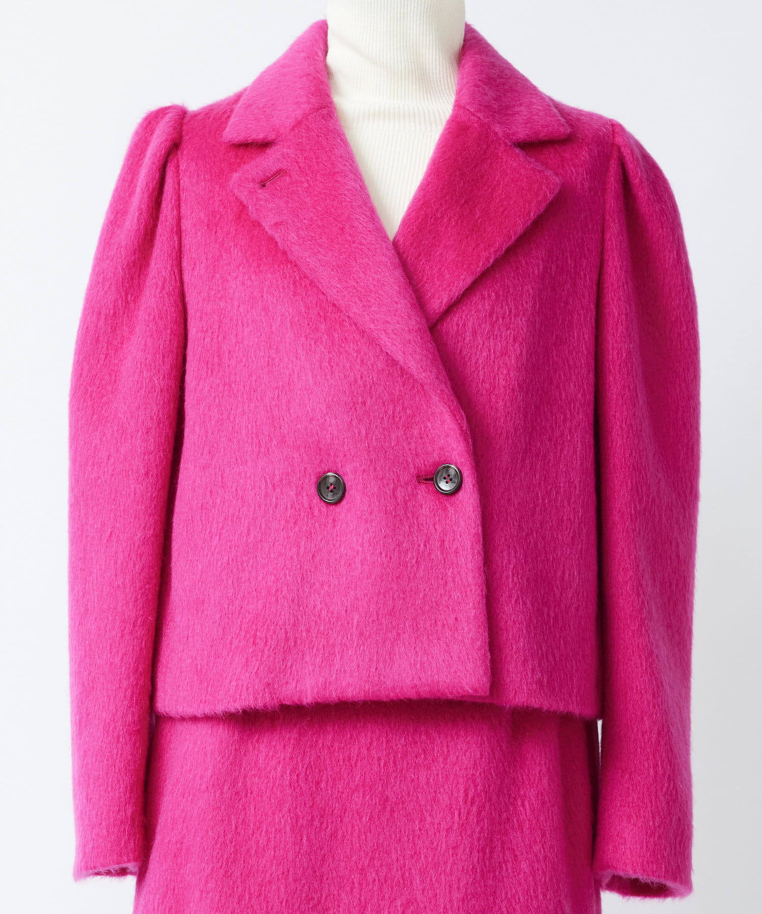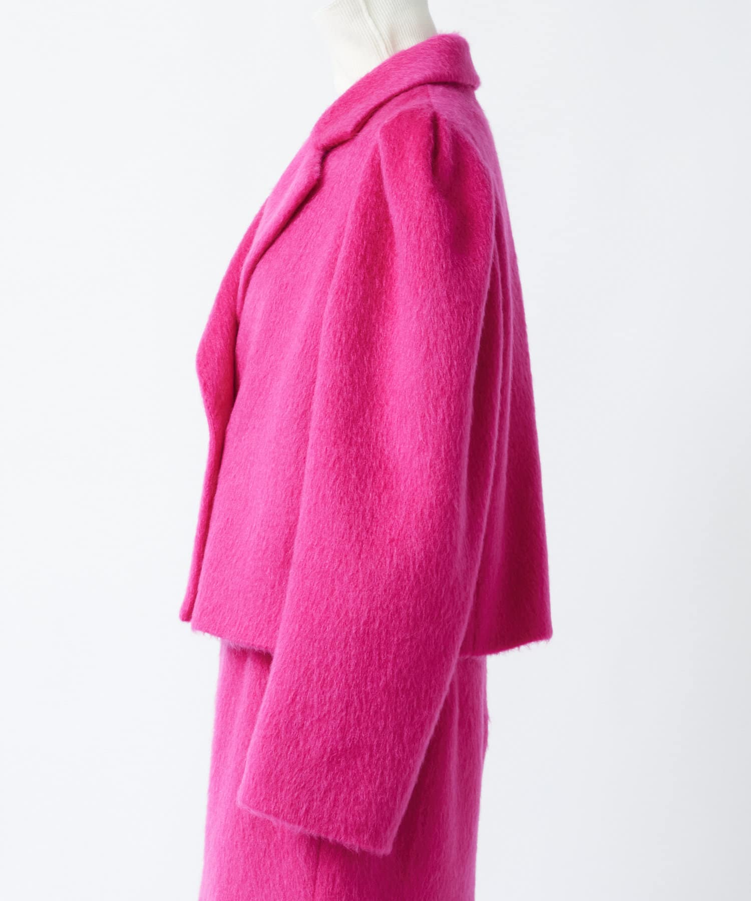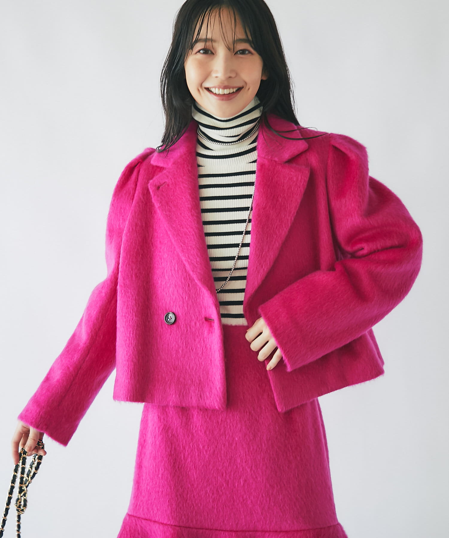ふわふわしたシャギー素材とクロップド丈がトレンド感のあるジャケット。