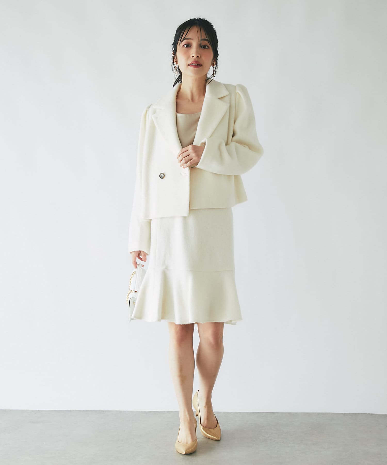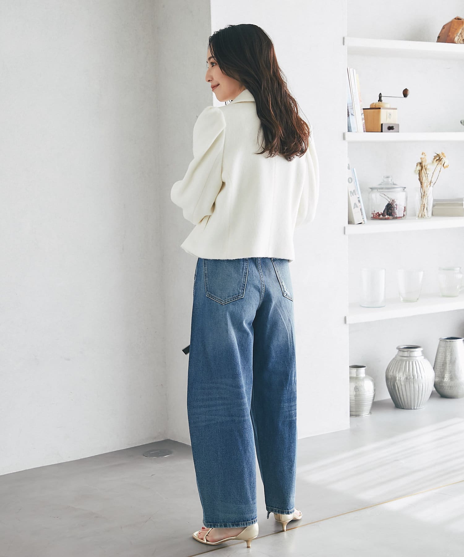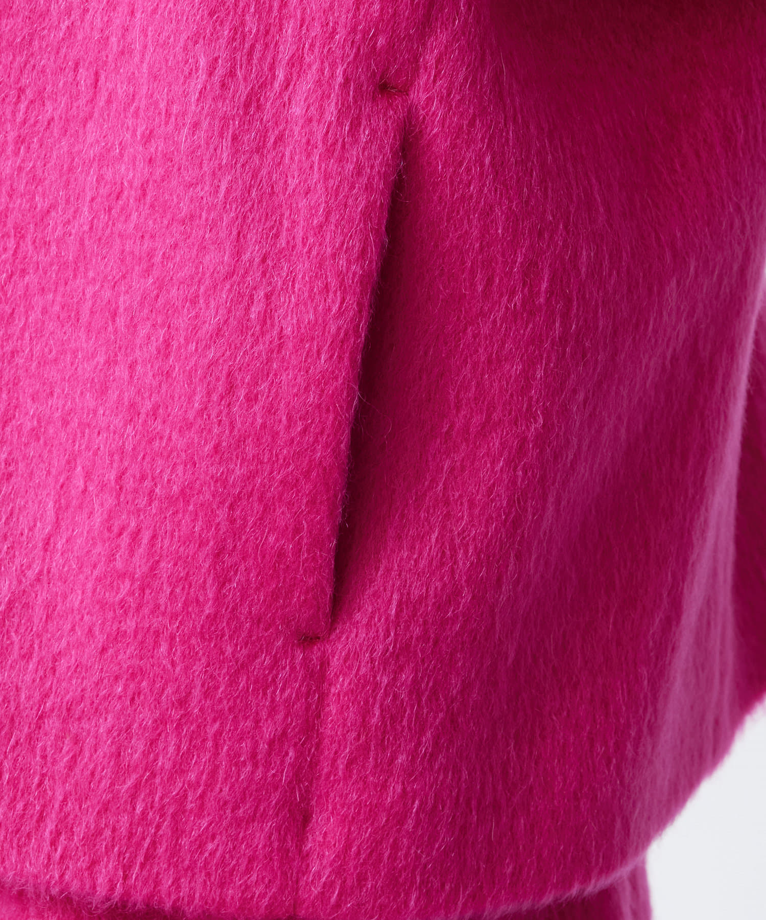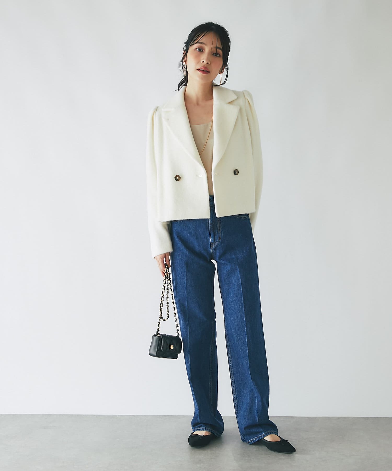 ふわふわしたシャギー素材とクロップド丈がトレンド感のあるジャケット。