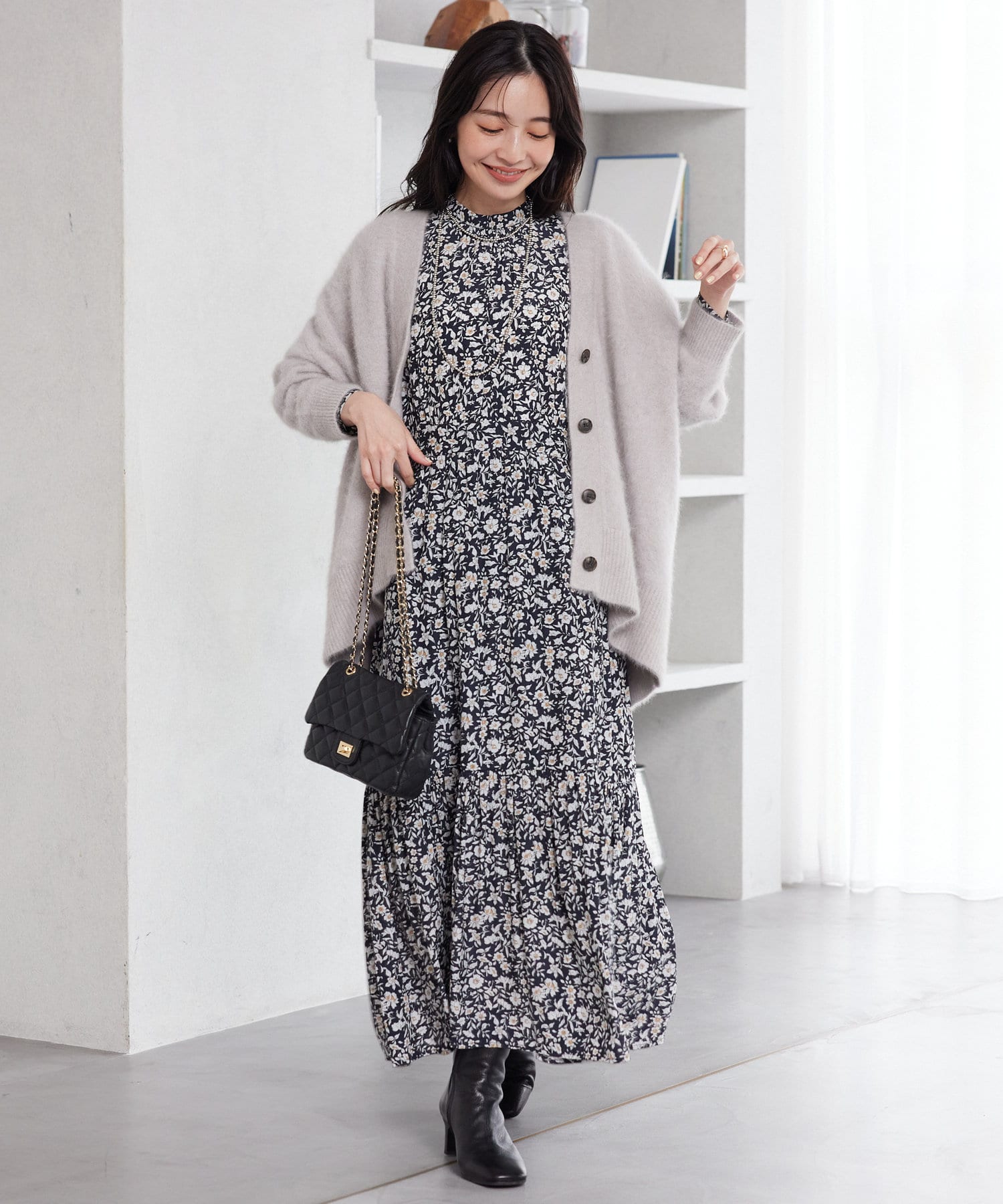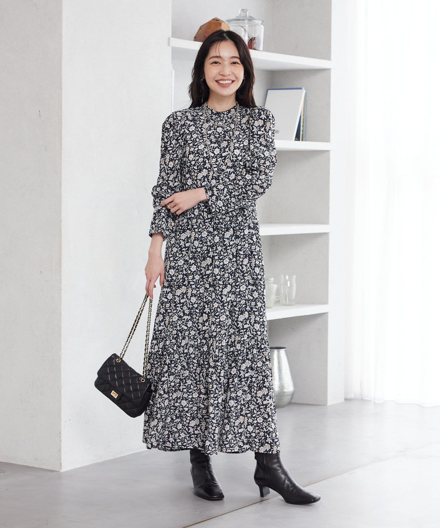 ナローシルエットで甘すぎない大人の花柄ワンピース