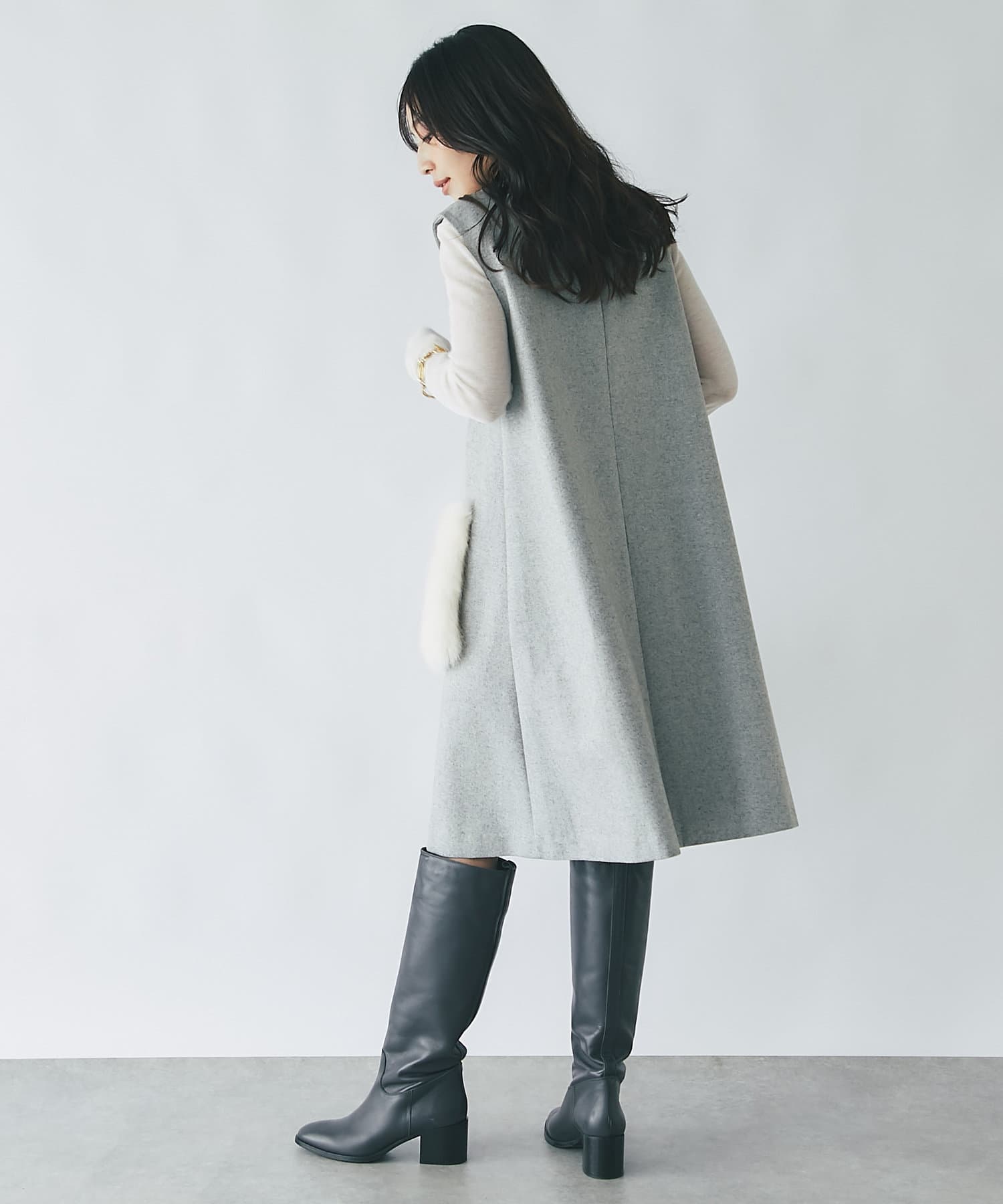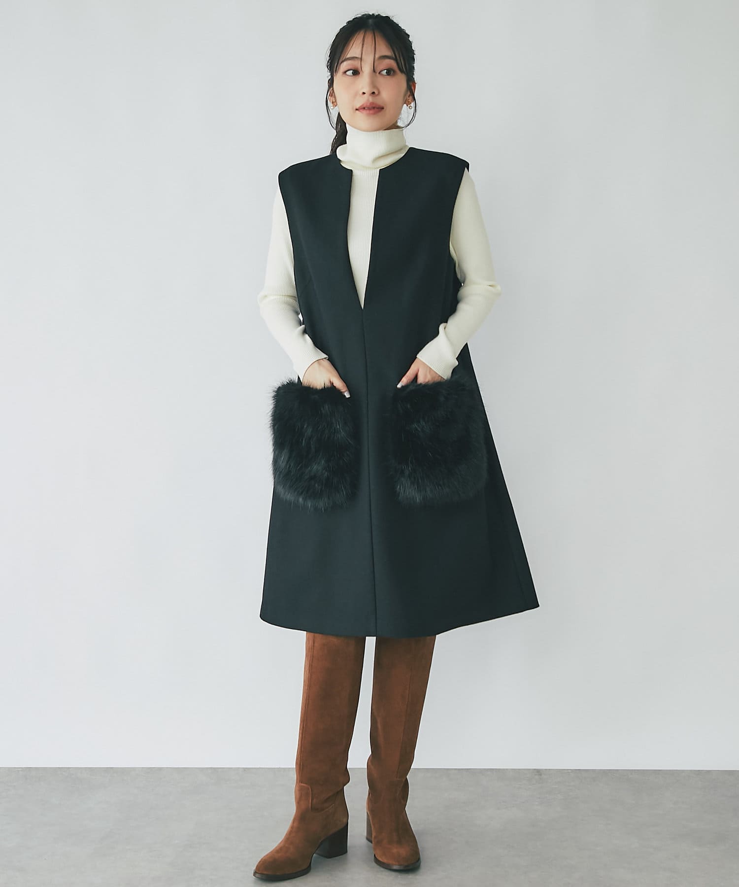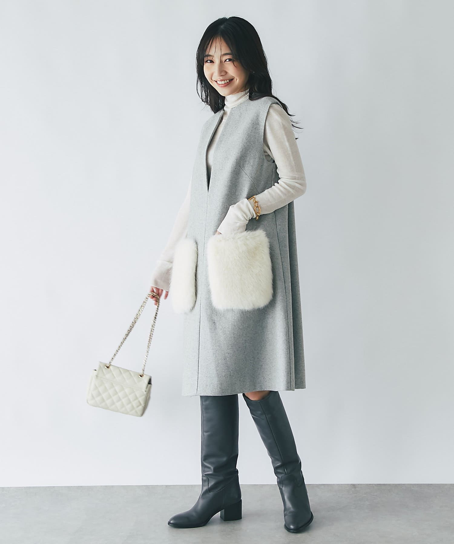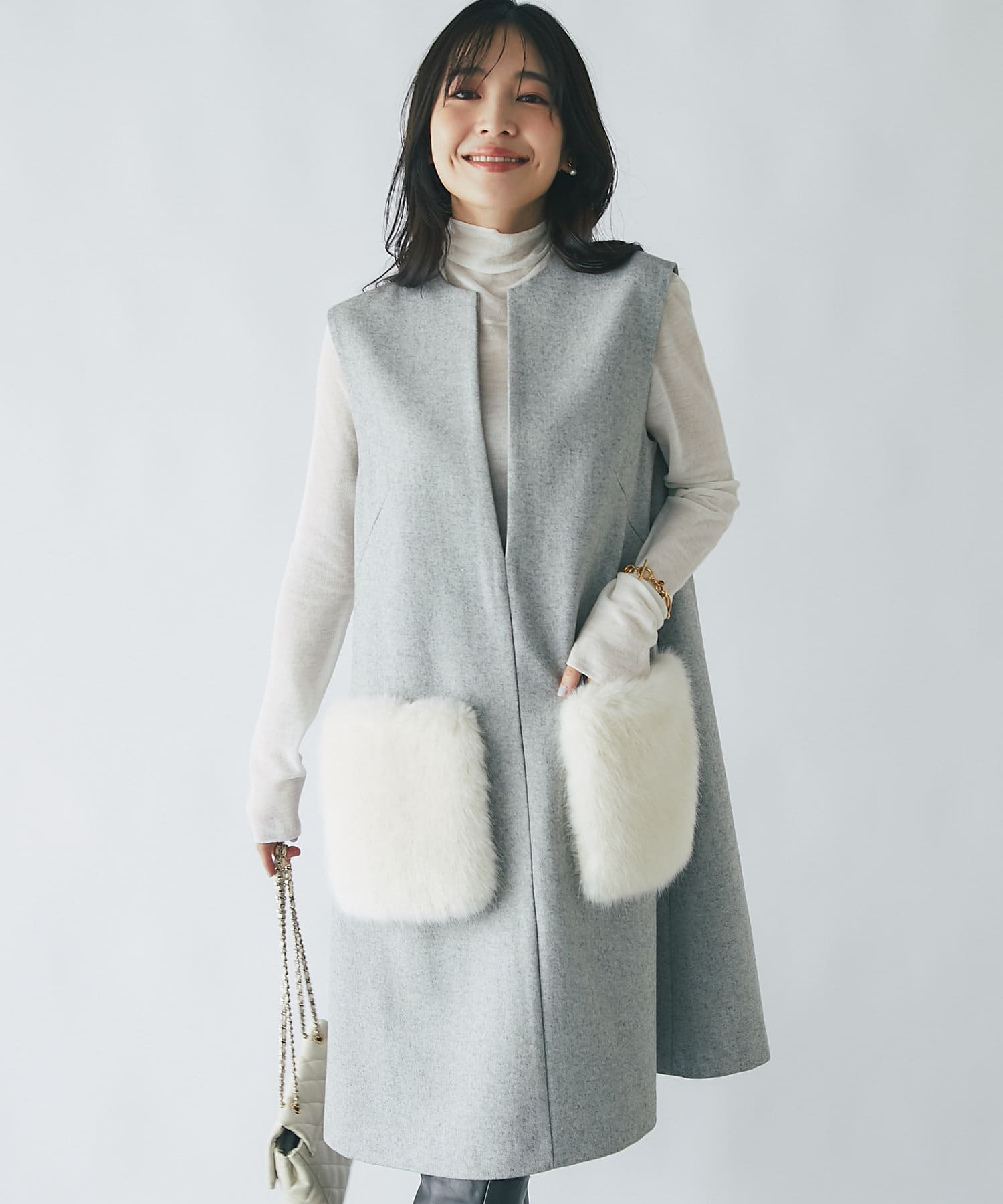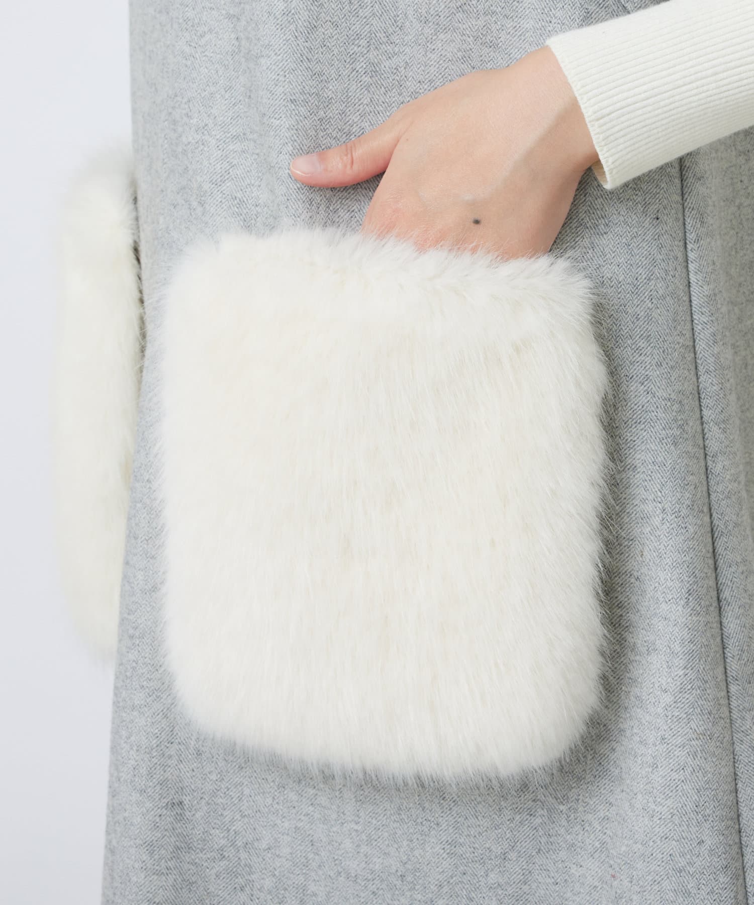 ウール混ツイード素材に高級感あるファーポケットが冬のスタイルを華やかにしてくれます。