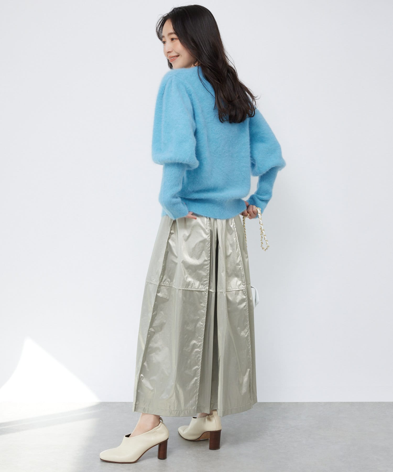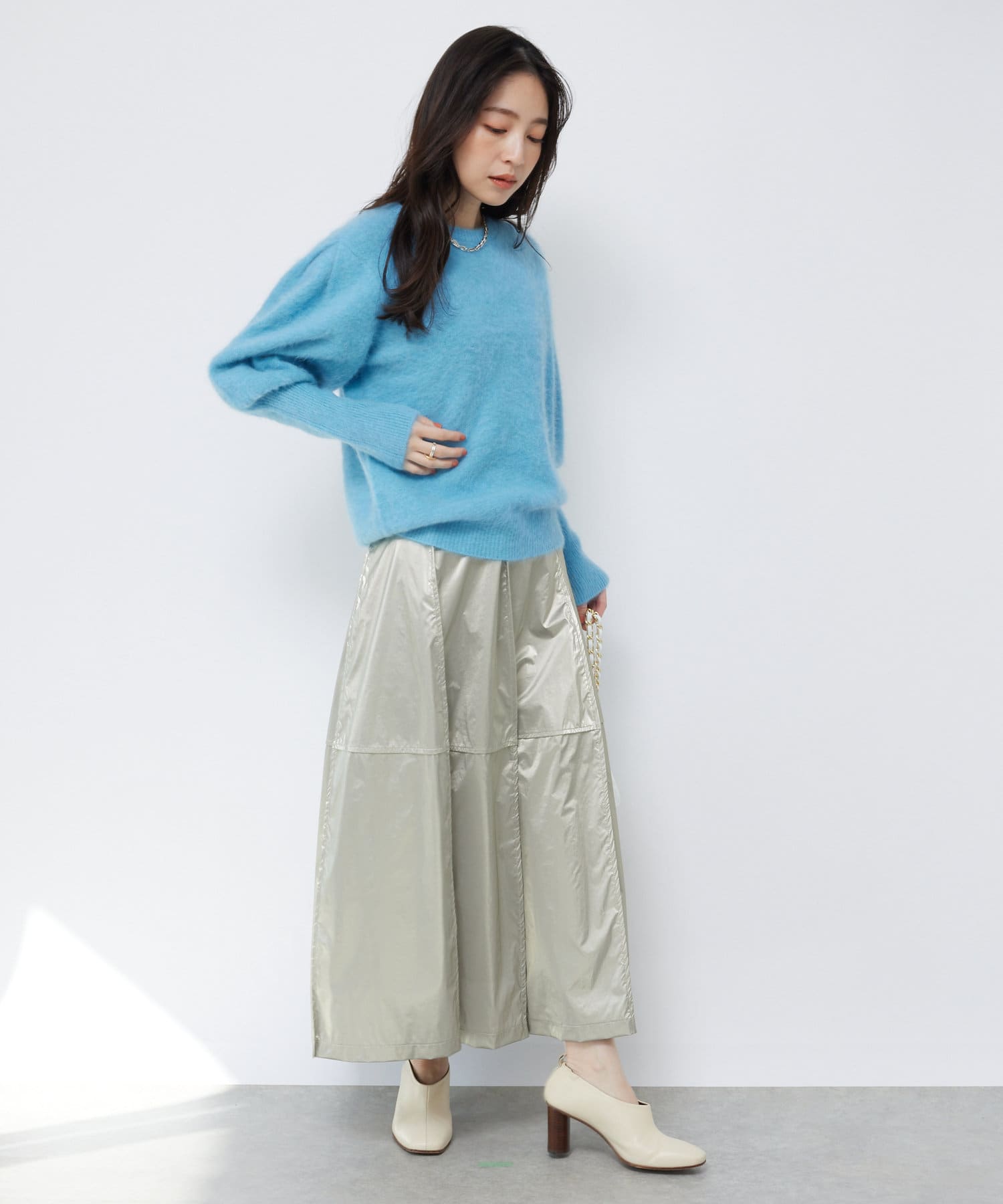 華やかなパテント素材なので重たくなりがちなニットとのスタイリングにおすすめです。
