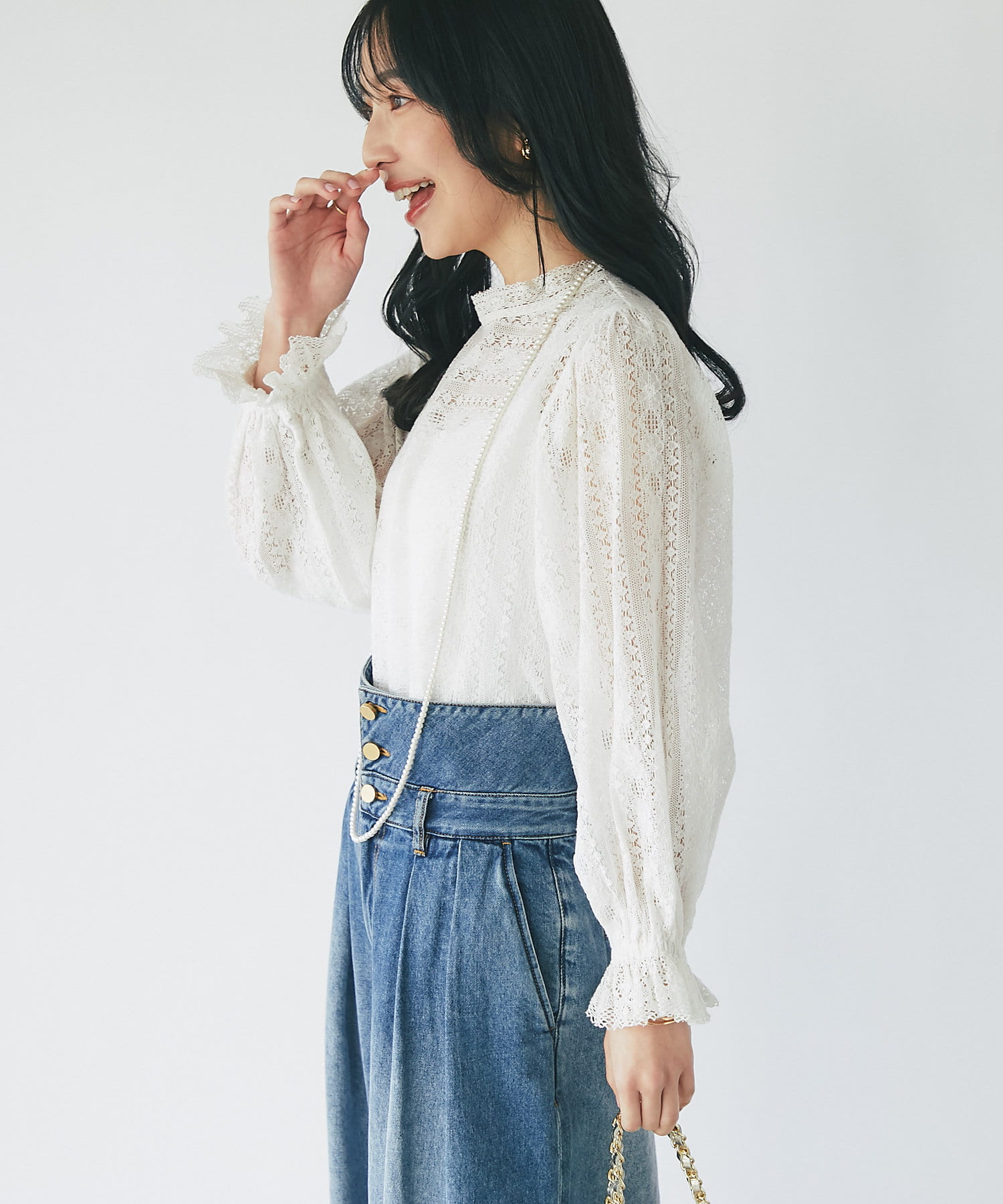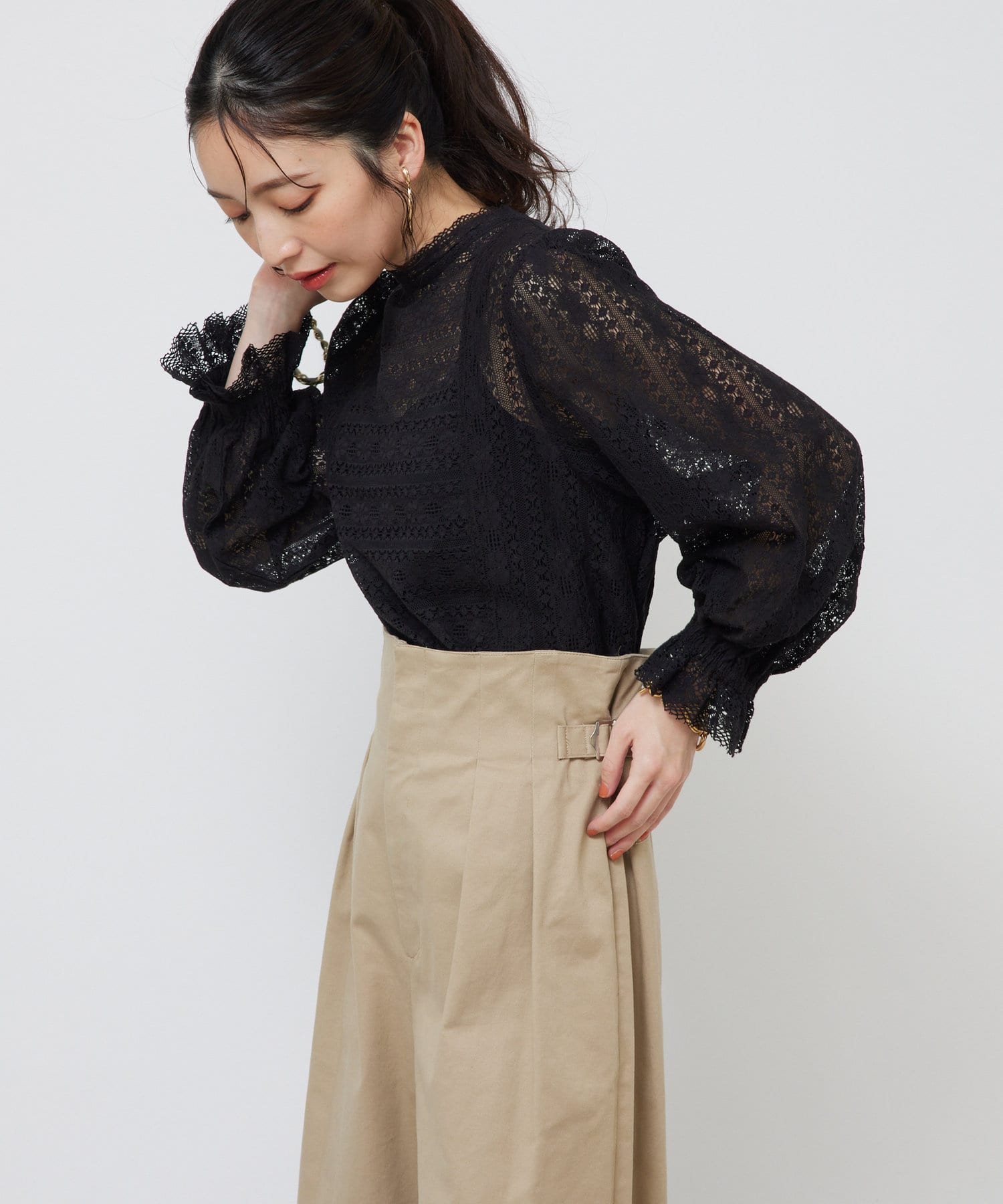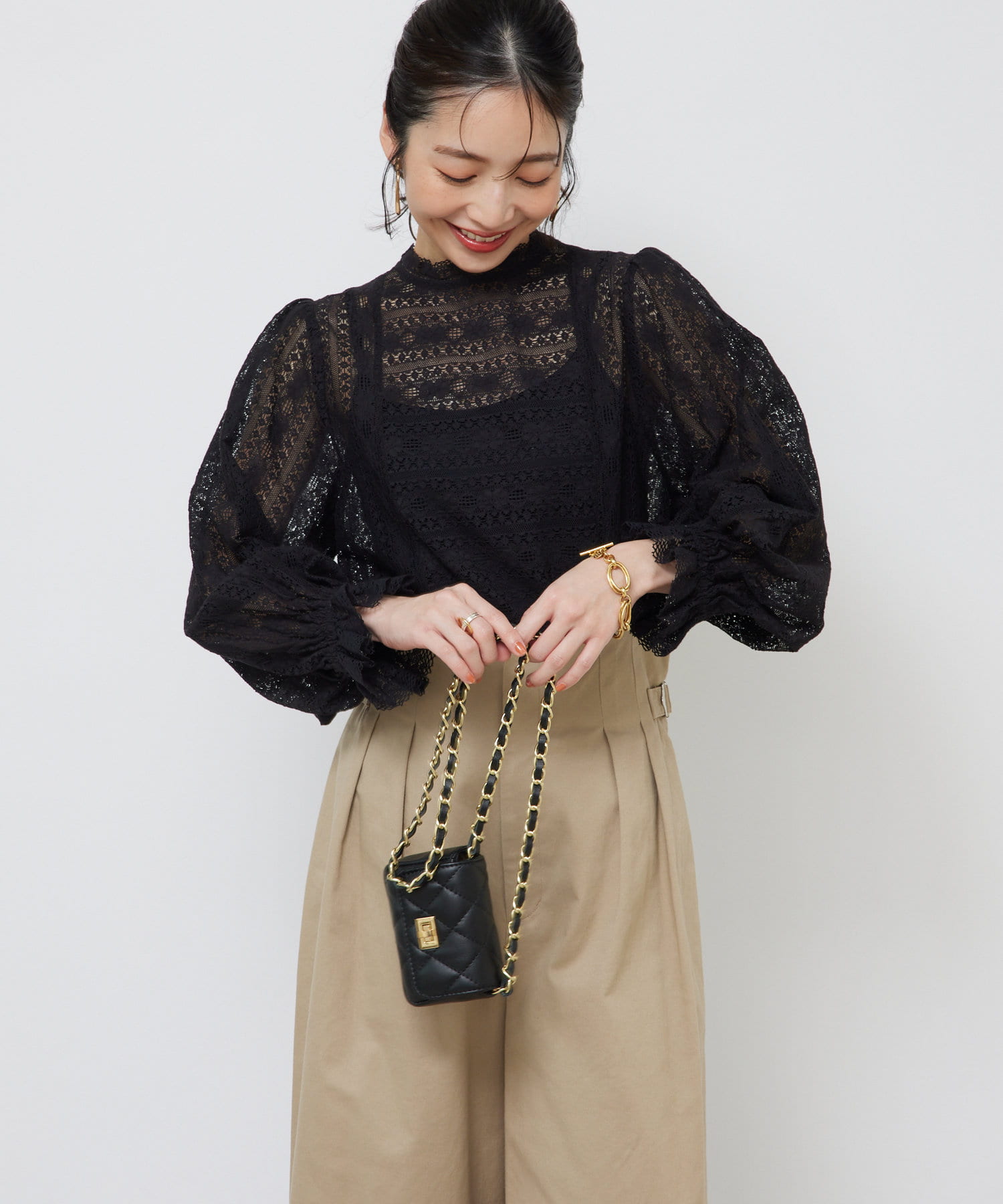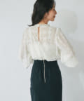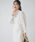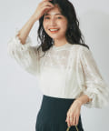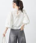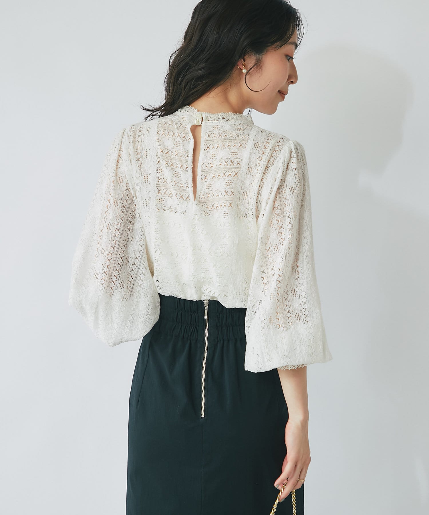 顔周りをすっきり見せるナロースタンドネックラインにボリューム感のある袖がクラシカルな印象に。