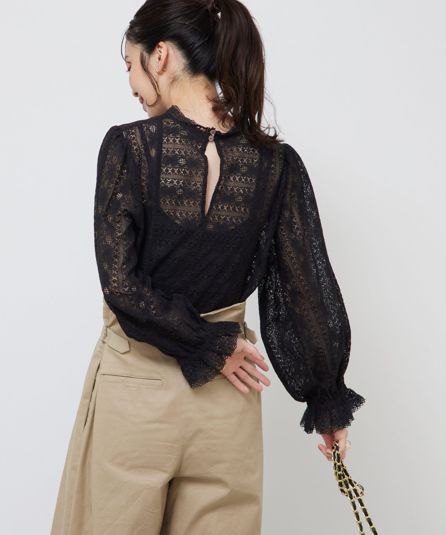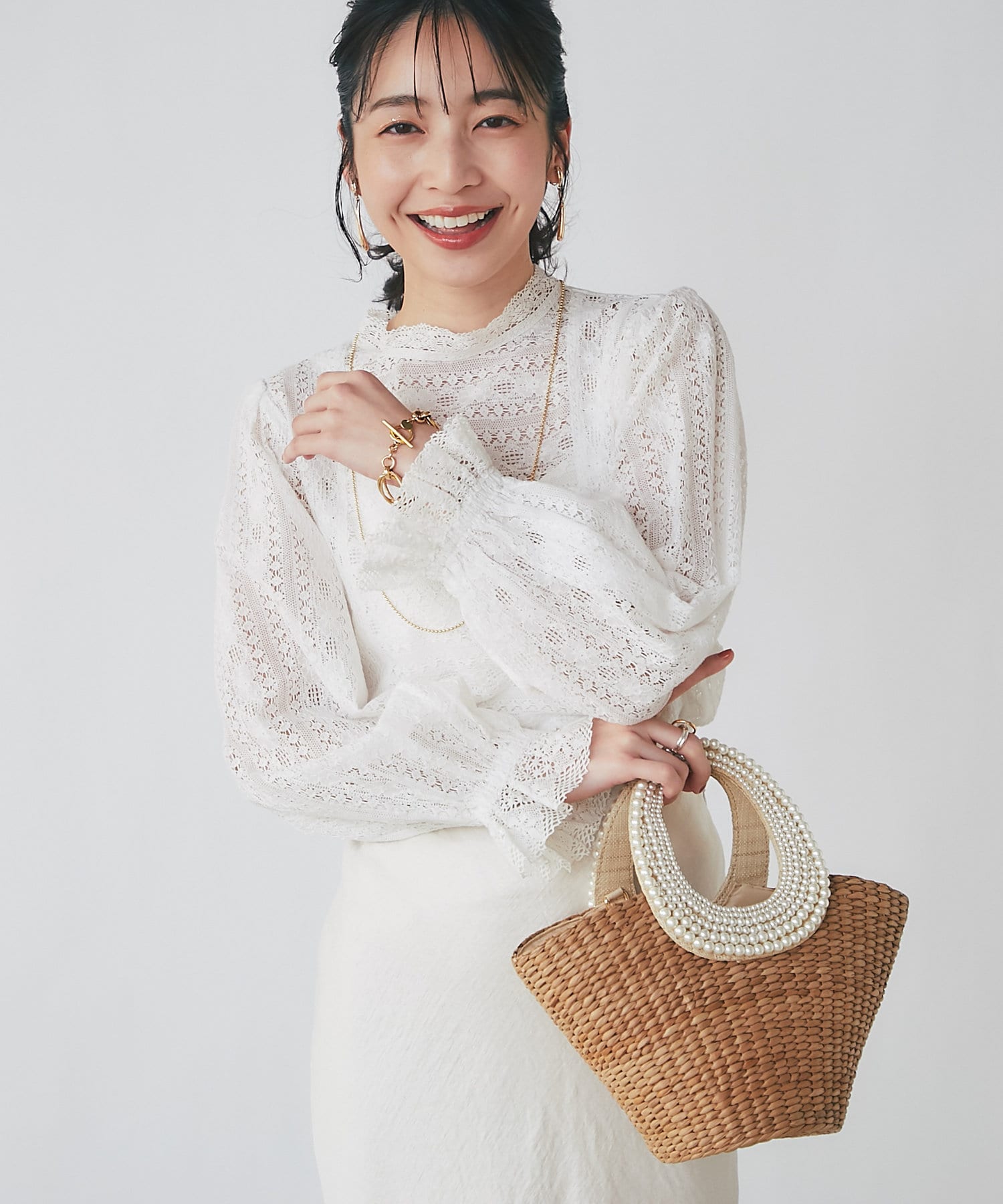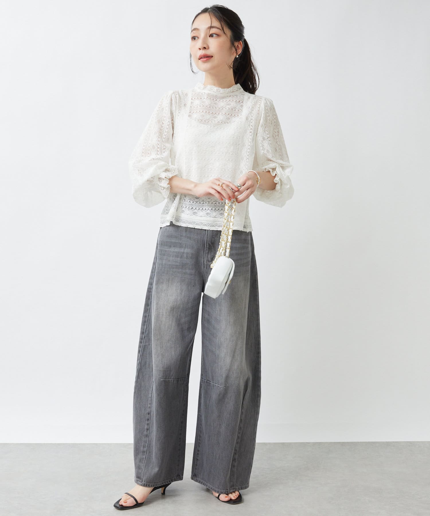 顔周りをすっきり見せるナロースタンドネックラインにボリューム感のある袖がクラシカルな印象に。