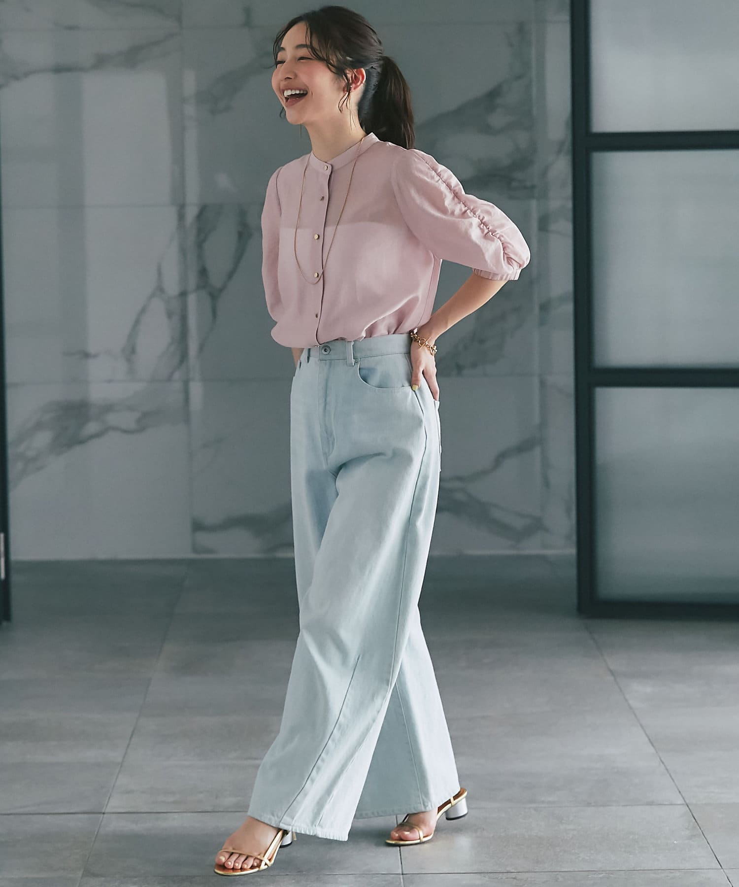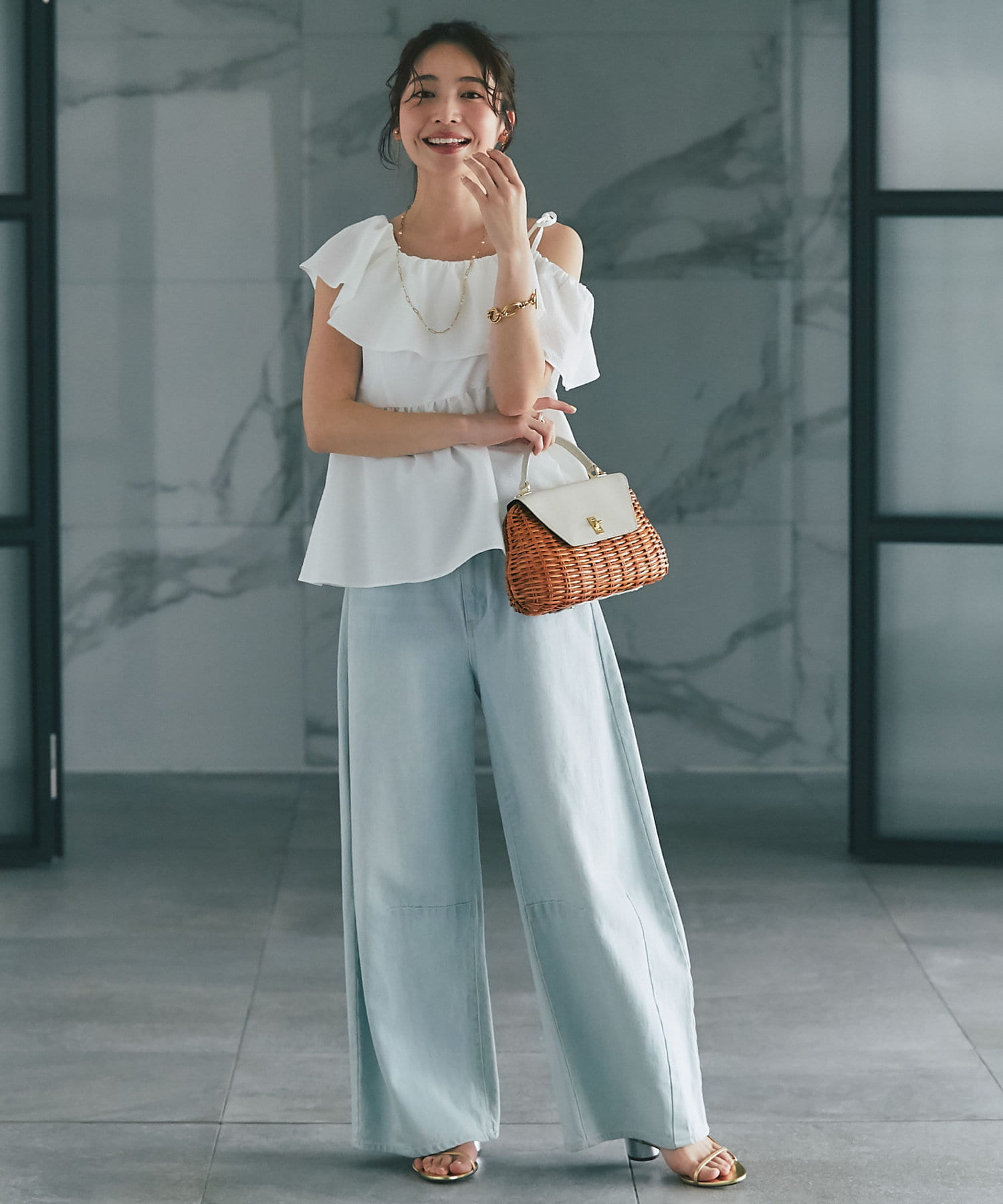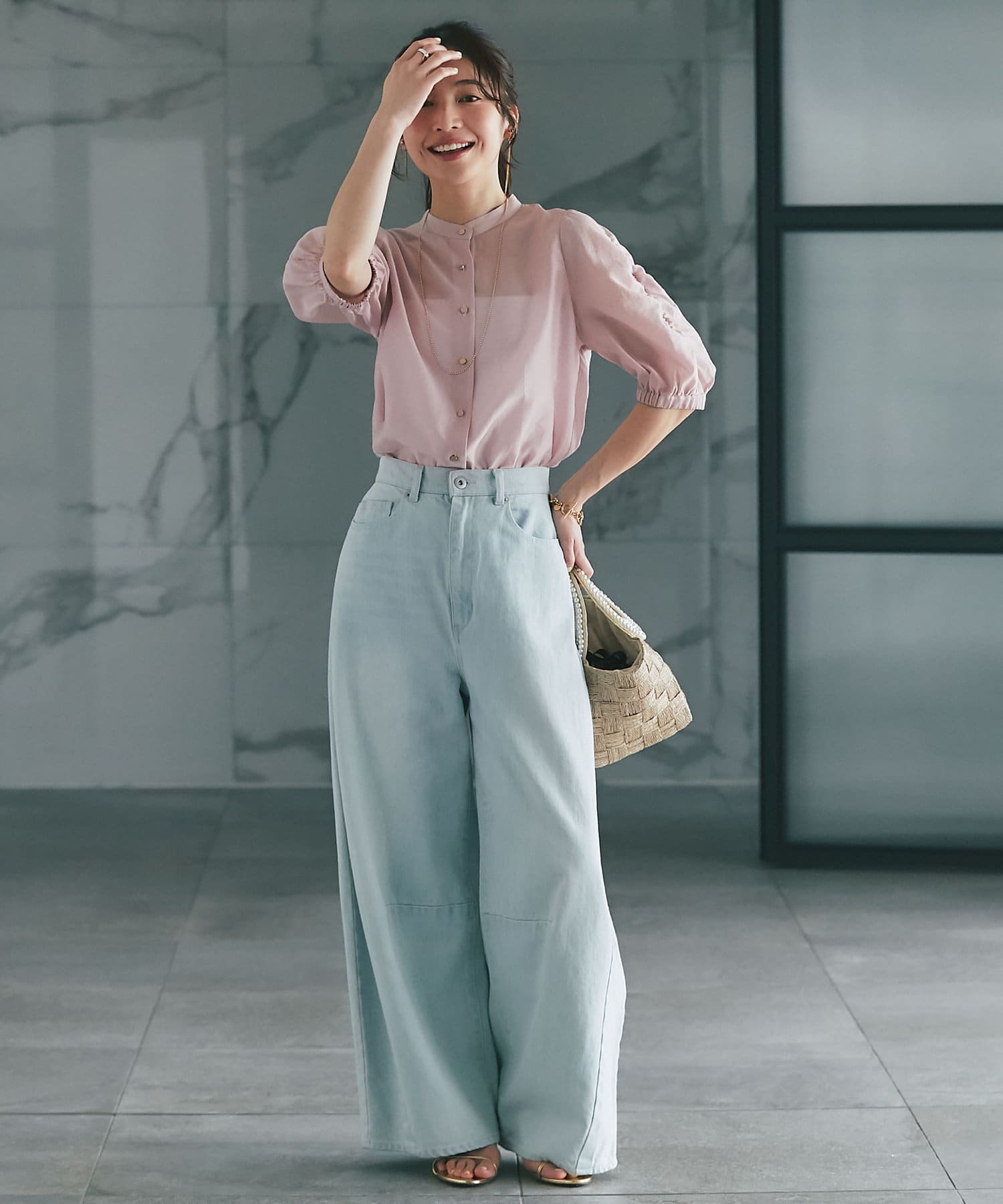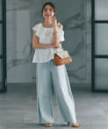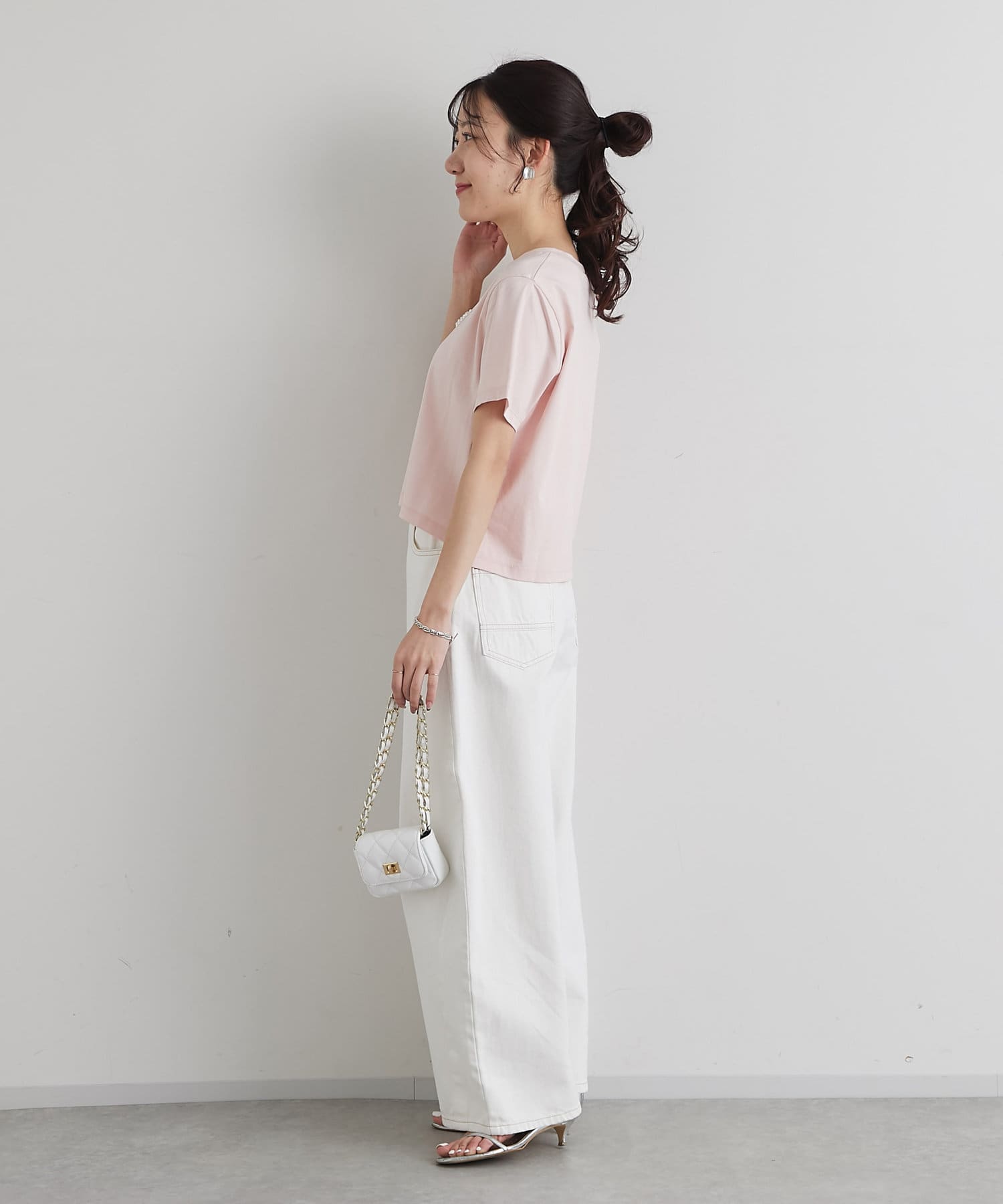 トレンドのクロップド丈トップスに合わせたスタイリングがおすすめです。