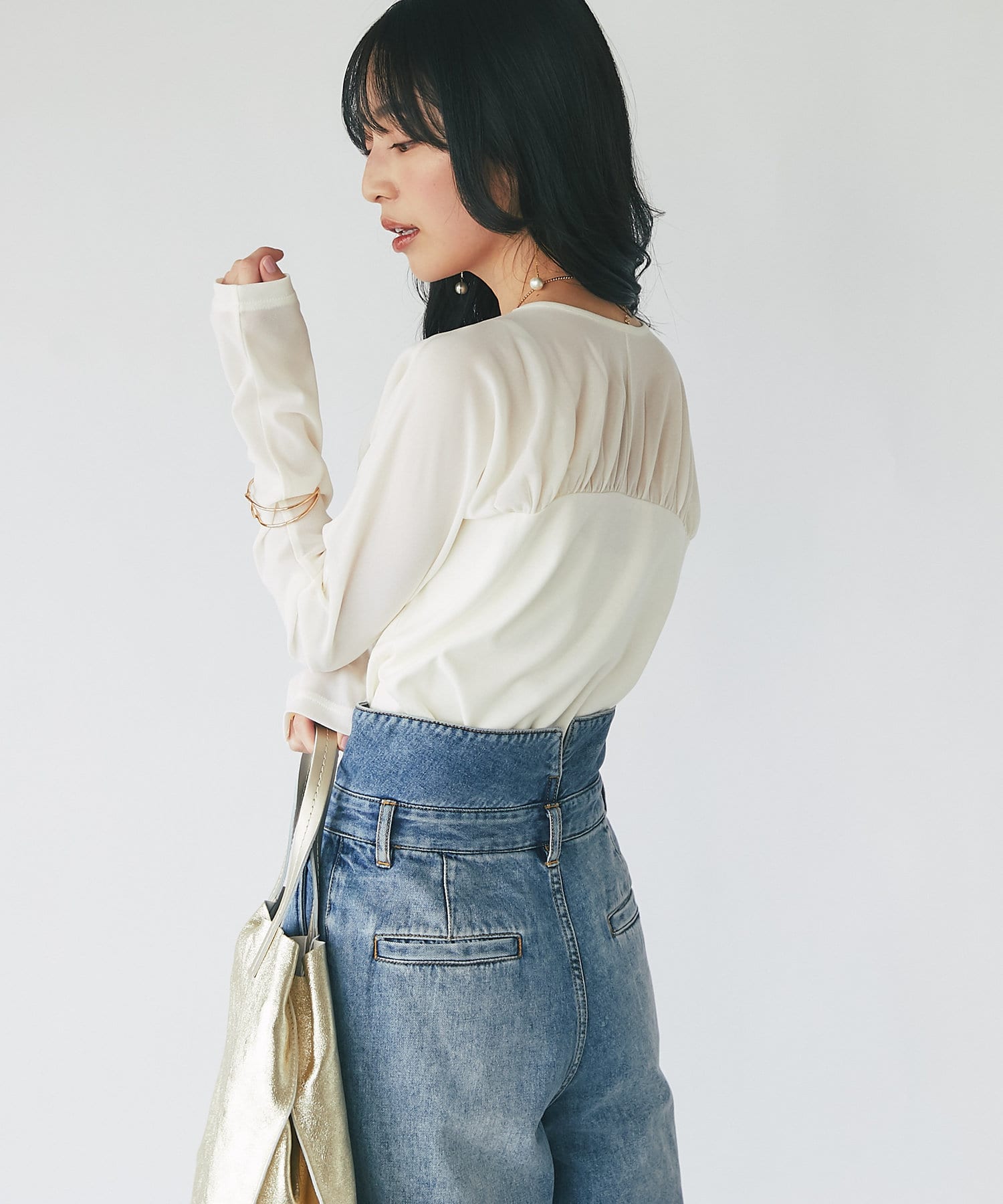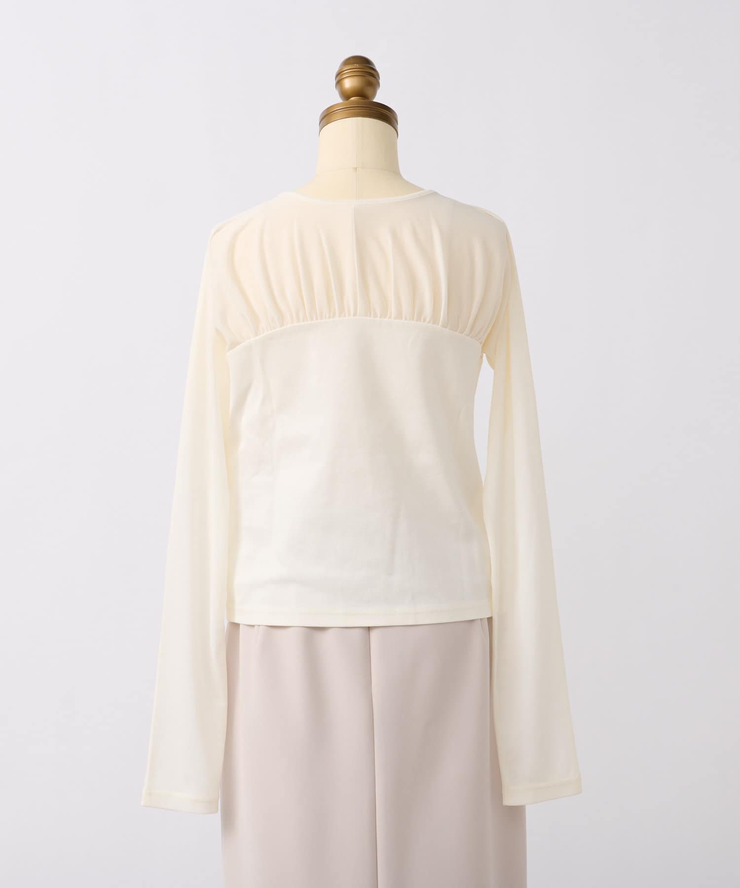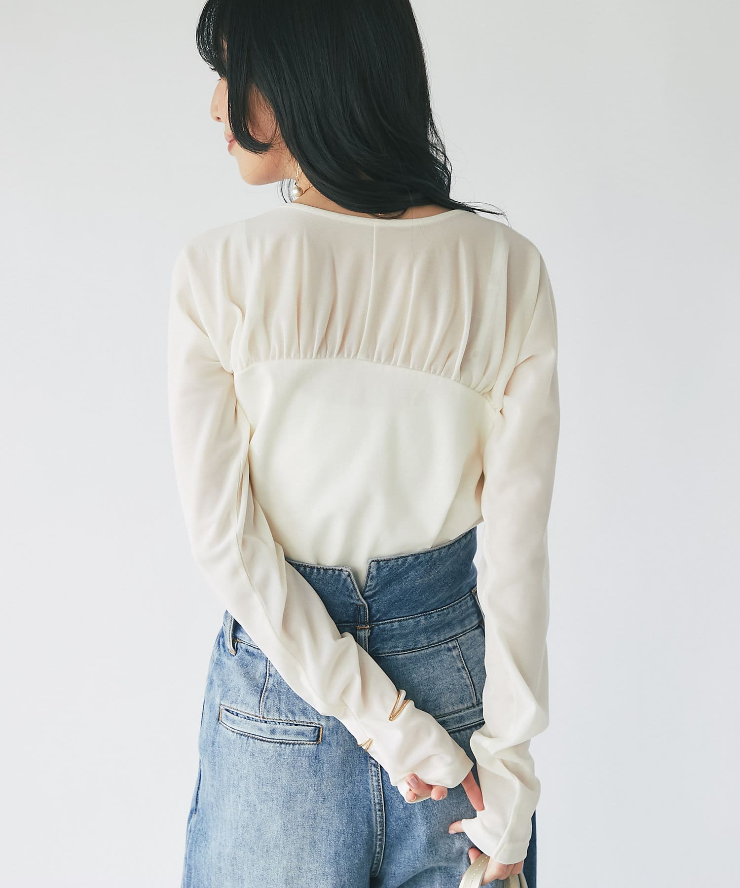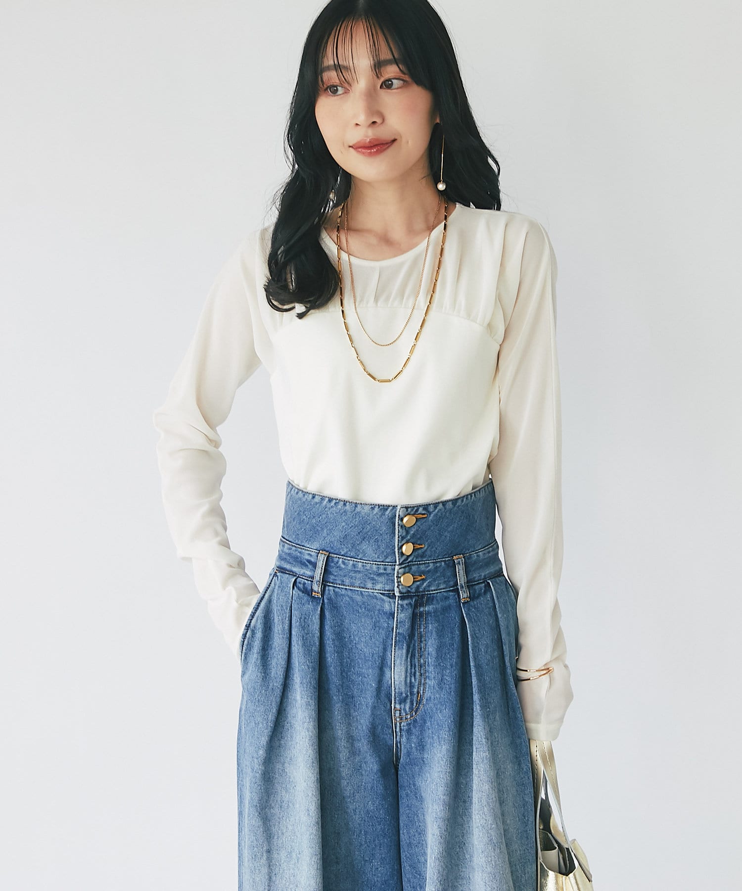 肩から袖はシアー素材でトレンド感もあり、ワードローブに取り入れやすい一枚。