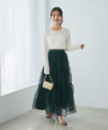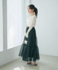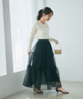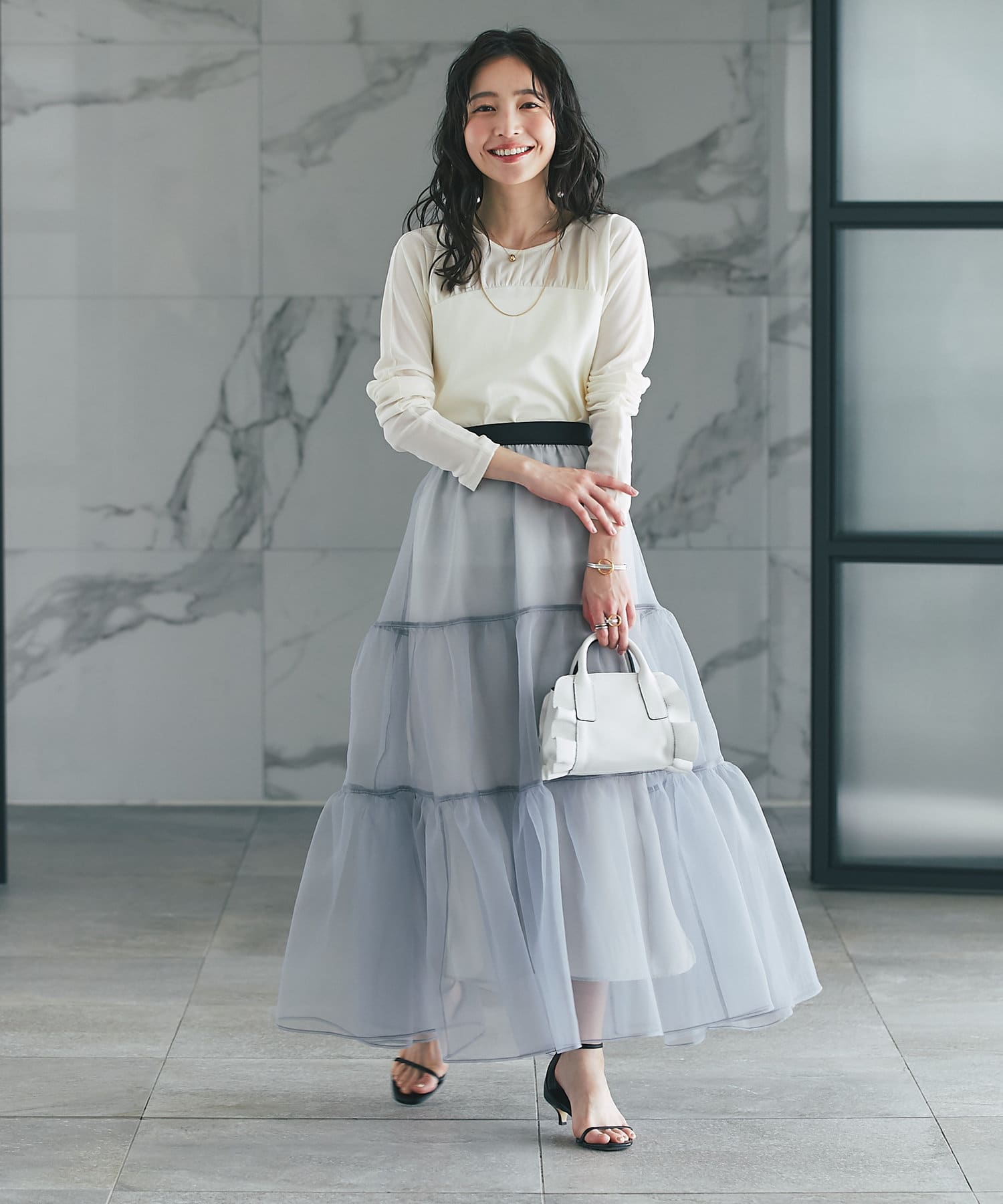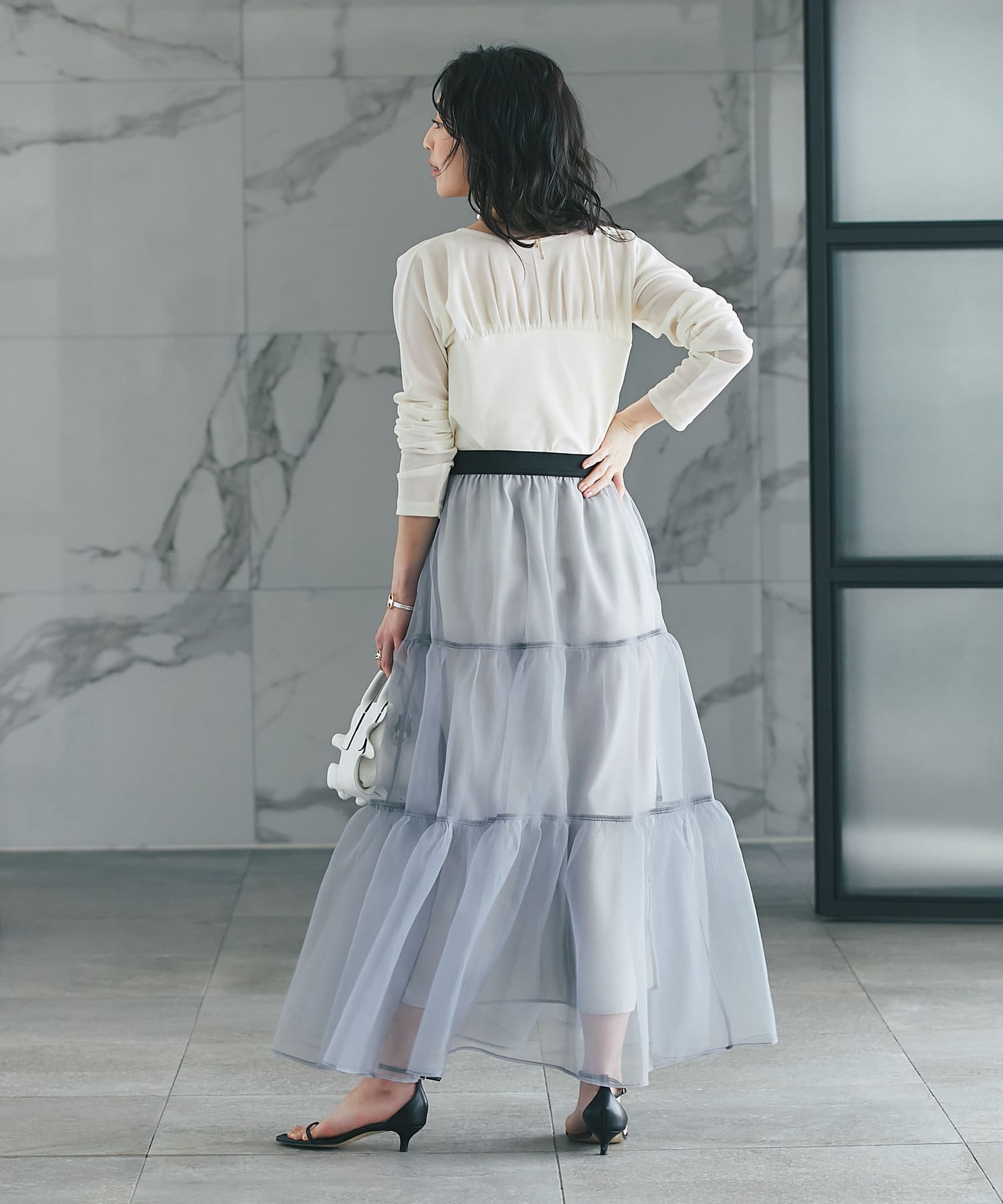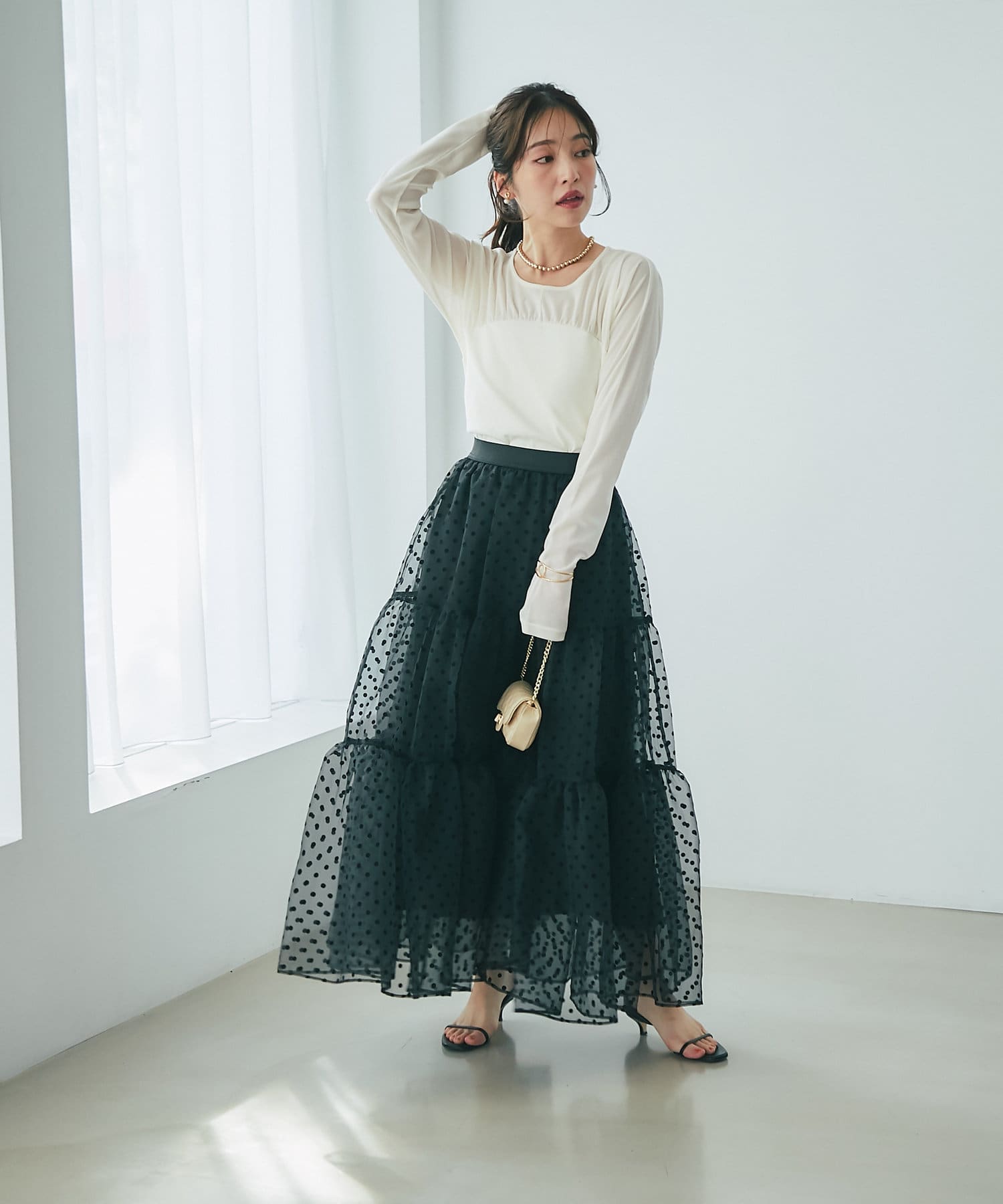肩から袖はシアー素材でトレンド感もあり、ワードローブに取り入れやすい一枚。